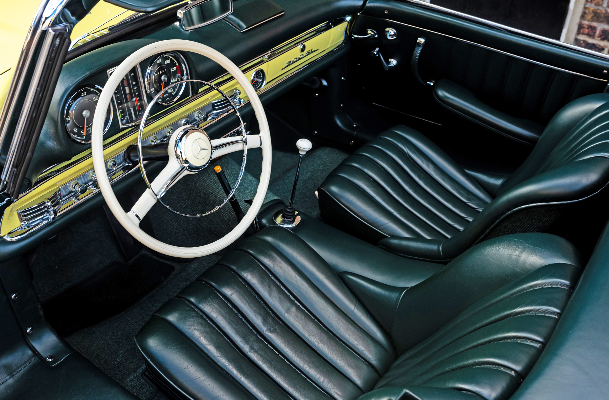 The striking ‘Fantasiegelb’ Fantasy Yellow coachwork and sumptuous Pine Green leather interior of this early production ‘Super Leicht’ provide the eye candy whilst a full, money-no-object nut and bolt restoration makes this splendid Mercedes-Benz grand tourer truly desirable in all respects.