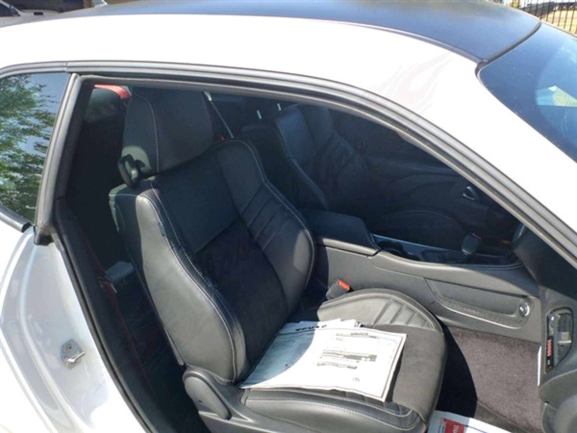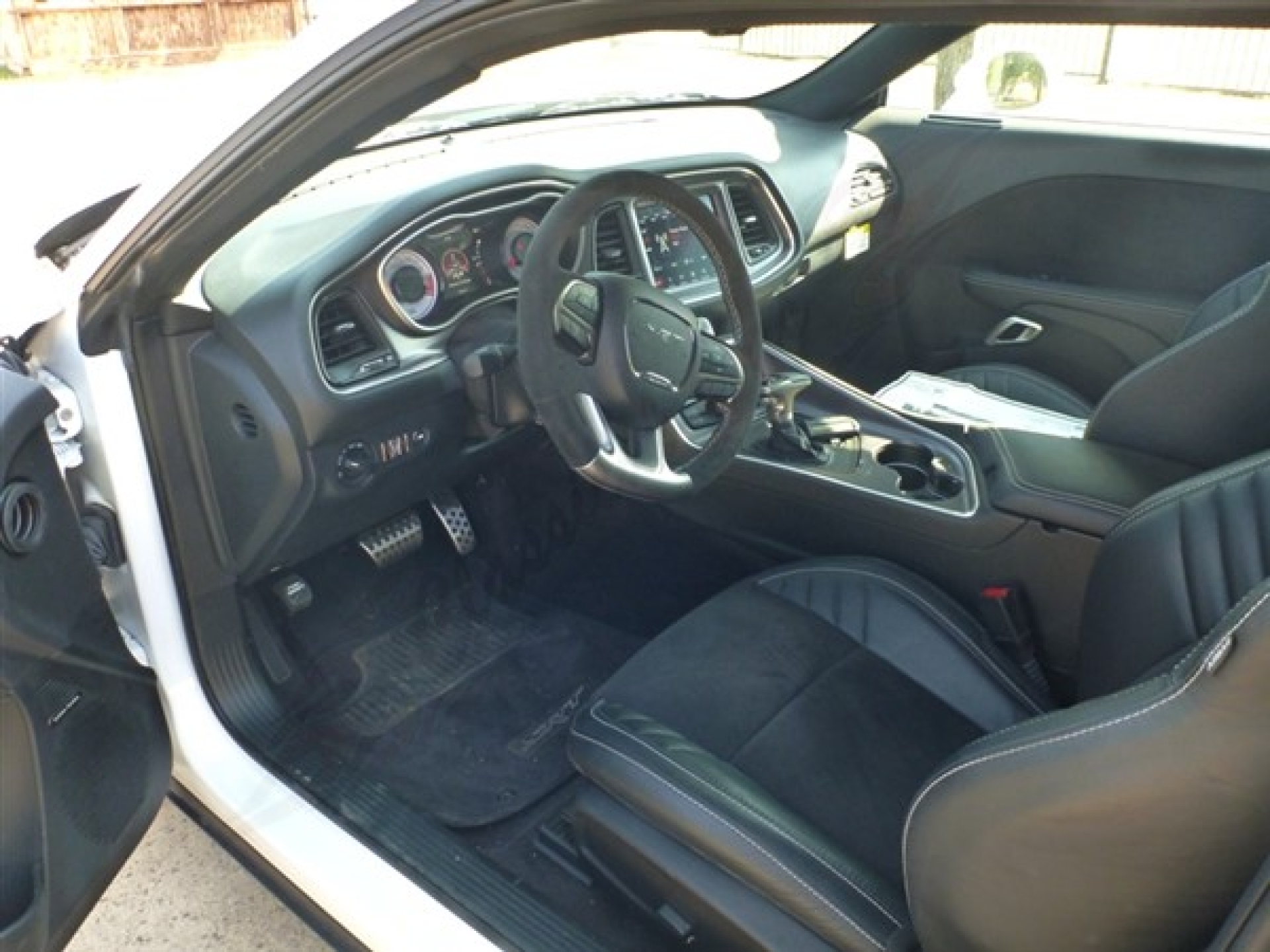 The exterior of the car takes the retro styled Challenger lines and takes it to the next level. This one was ordered in White Knuckle paint with a wide Black full body center stripe, Black spoilers, a Black taillight panel, and lower body accents. The car wears its SRT badging and the custom Demon exclusive emblems as well. The SRT 5 spoke Black wheels look great and peaking through them are the large Brembo disc brakes.