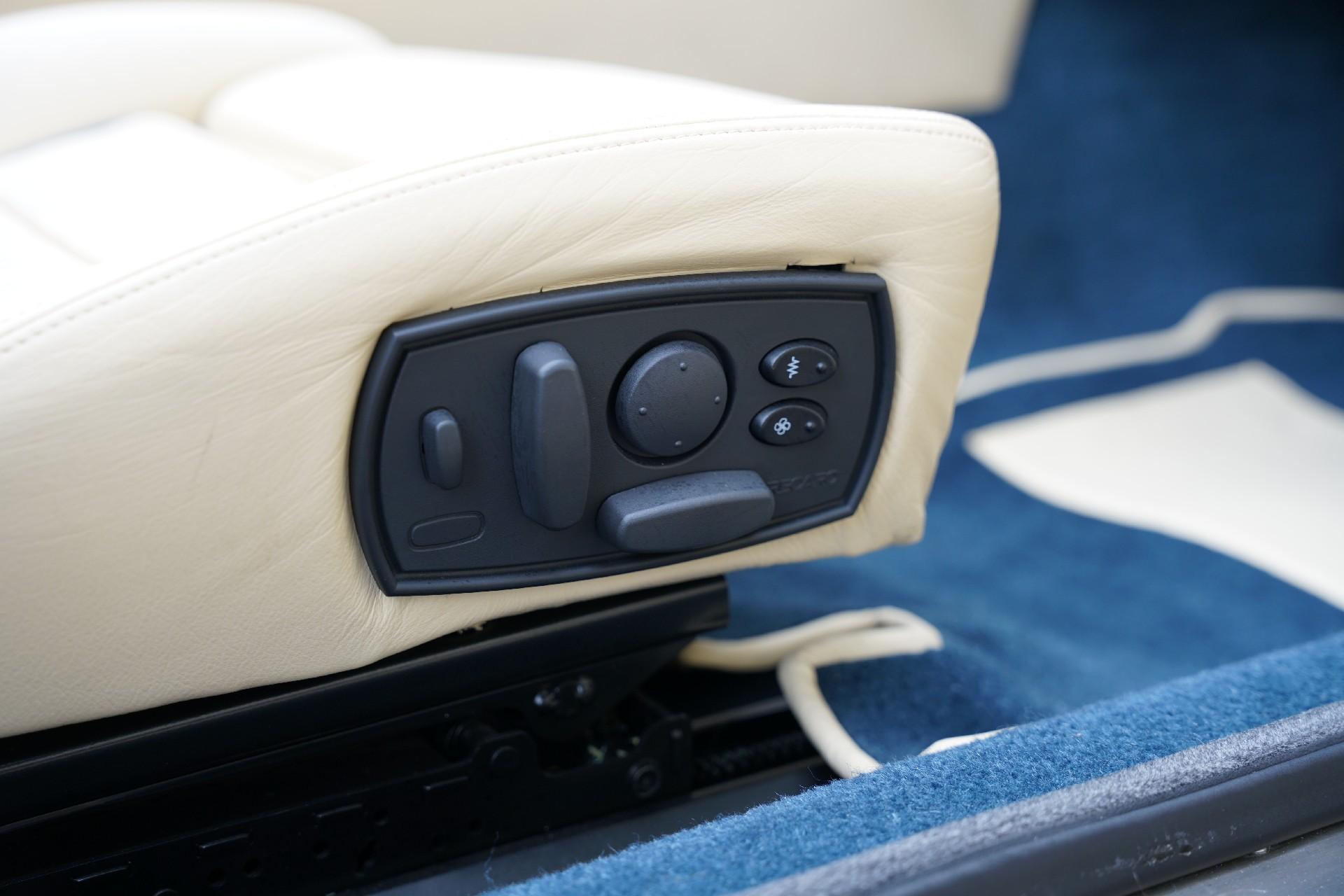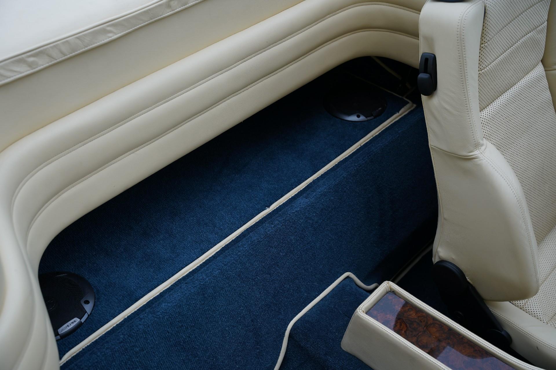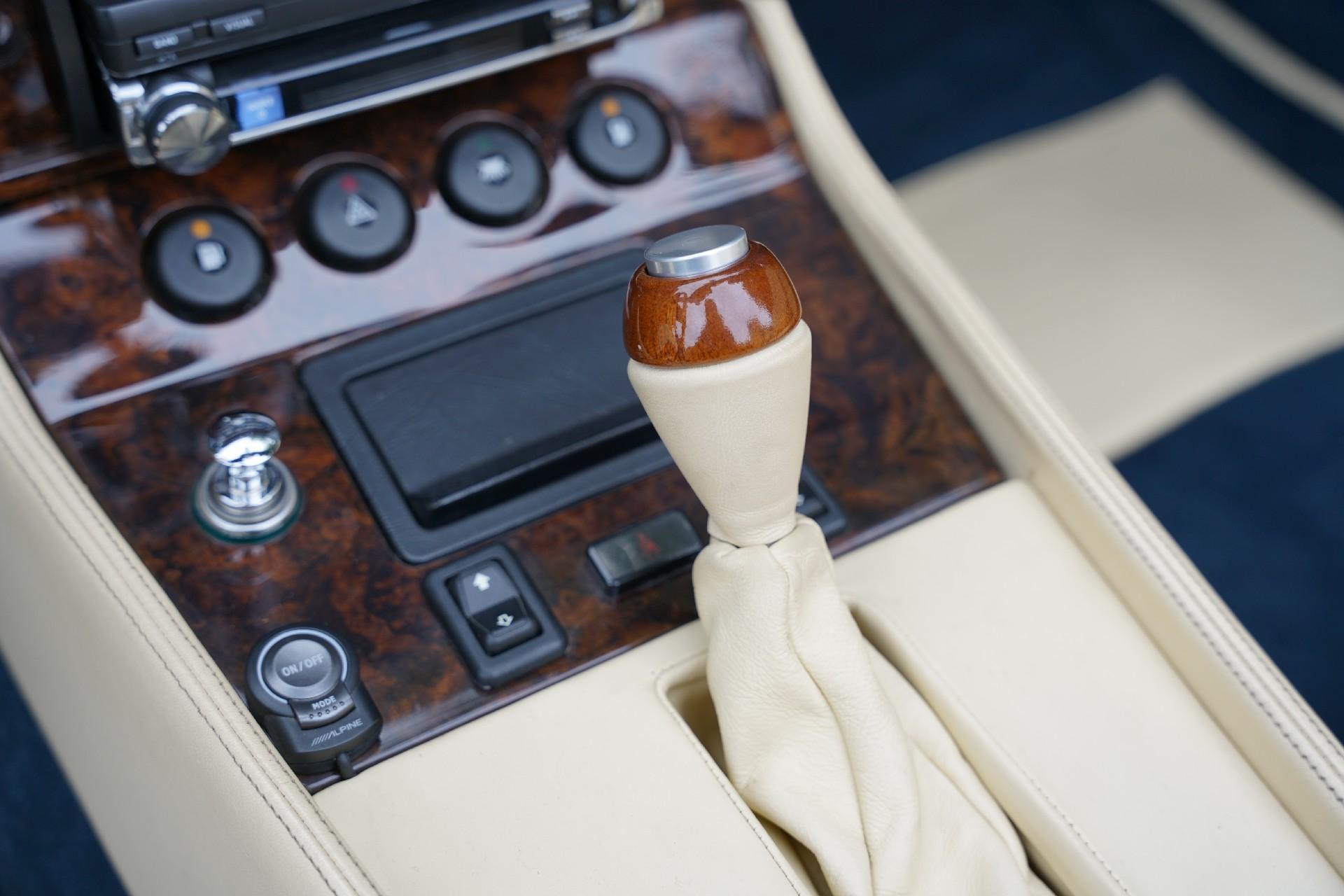 In 2011 sheikh Nasser Sabah El-Ahmad bought the car. Before being collected the car went to Aston Martin Works where it was fully restored and given many upgrades. And as the Brits tend to say Aston Martin Works fully went to town! It was a no holds bar operation. Although still in delivery miles it was decided to take the bodywork back to bare metal and respray it in a new colour; the off-white Bentley Magnolia. The steering was changed from RHD to LHD and the mileometer changed to a kilometre gauge with the correct mileage now set in kilometres. Not only was there a new odometer, but all other gauges were also changed to have white dials and chrome surrounds. The middle oil pressure meter was exchanged for a gear indicator suiting the new transmission, which we will come back to later on. Inside new colour coded 8-step electric adjustable Recaro bucket seats were installed. The steering wheel was reupholstered in blue leather together with new massive aluminium and wooden gear knob. Completing the external look are multi-piece Ronal rims bespoke made for Aston Martin. The total cost for the aforementioned restoration was a staggering £ 239.000,-