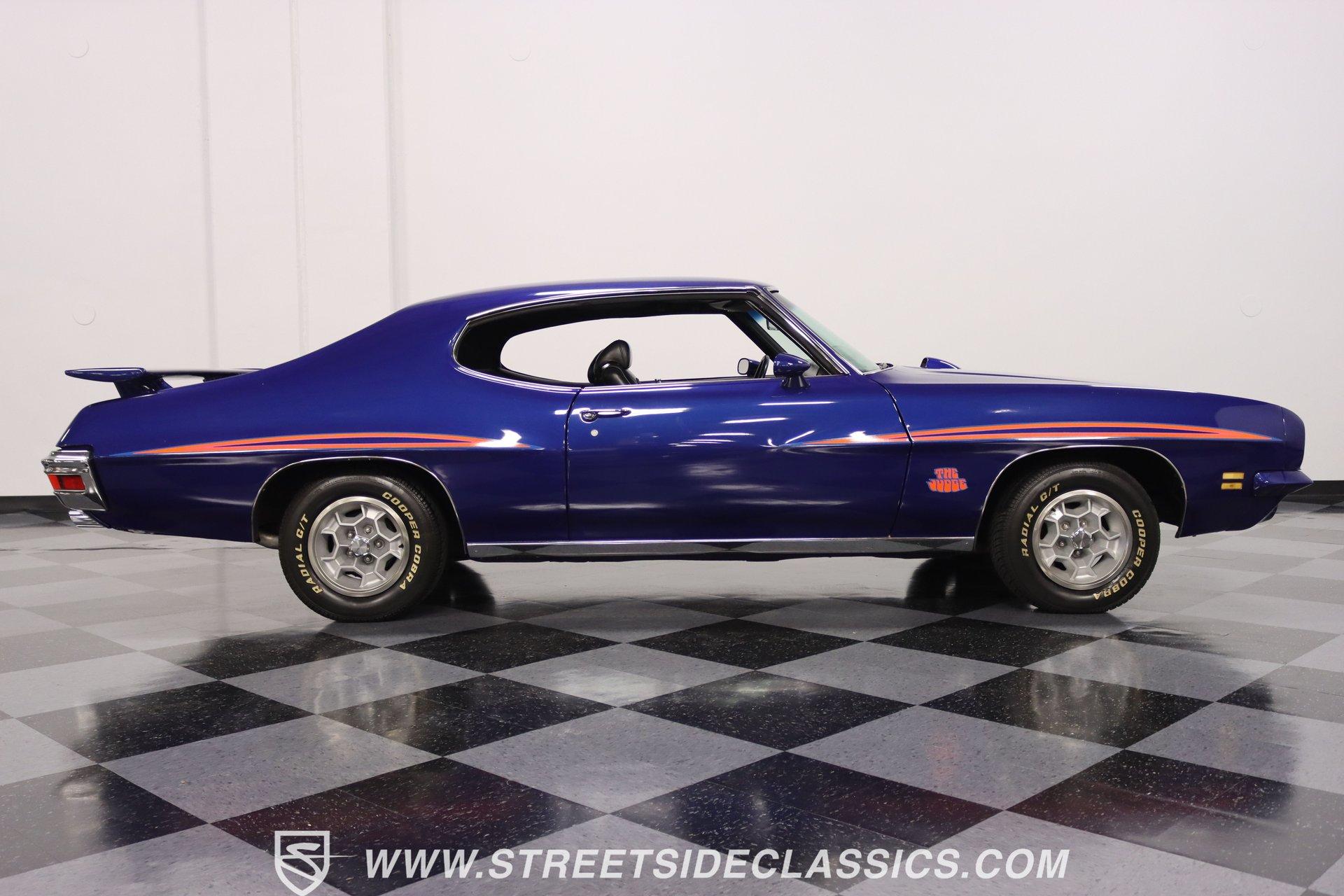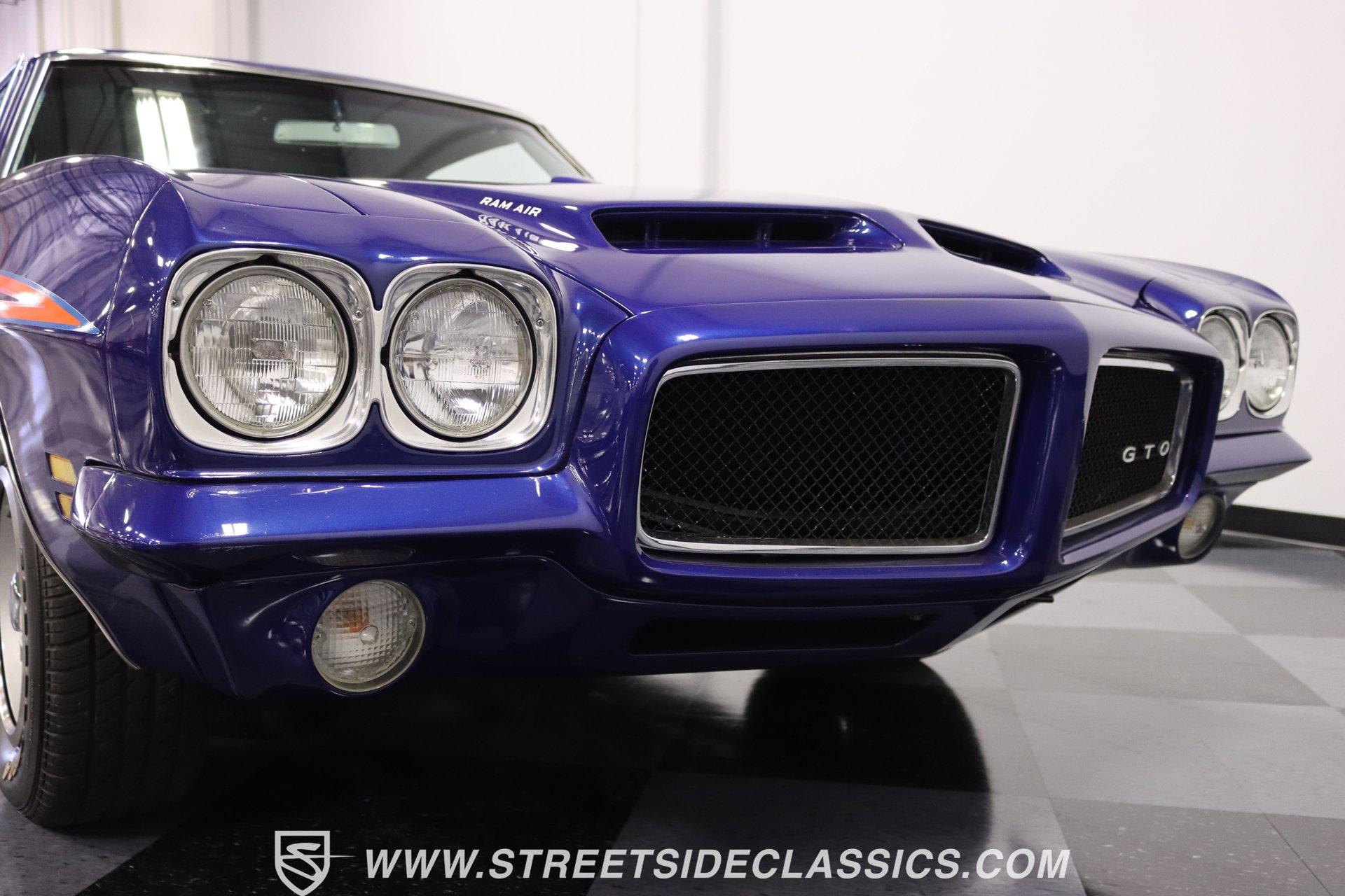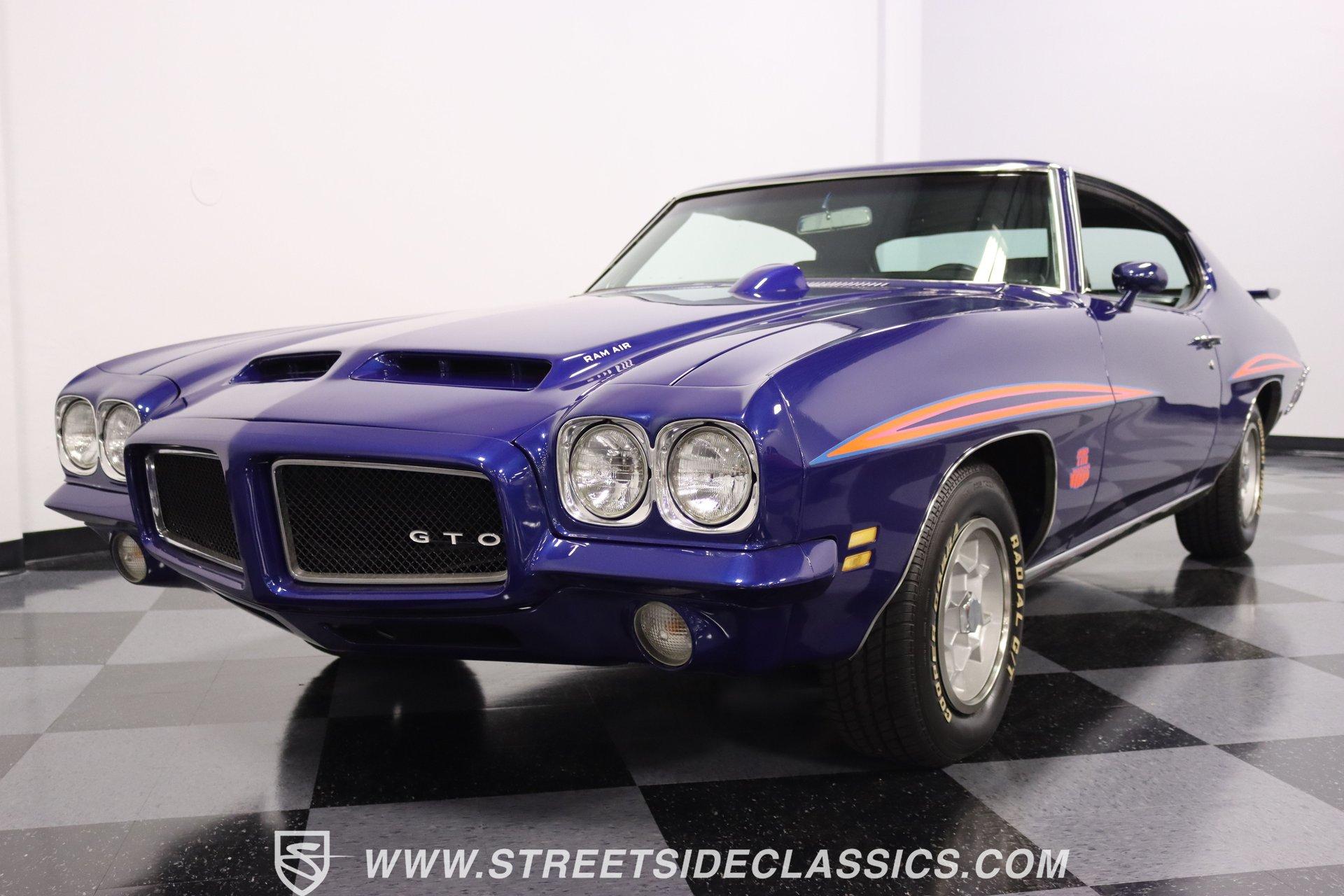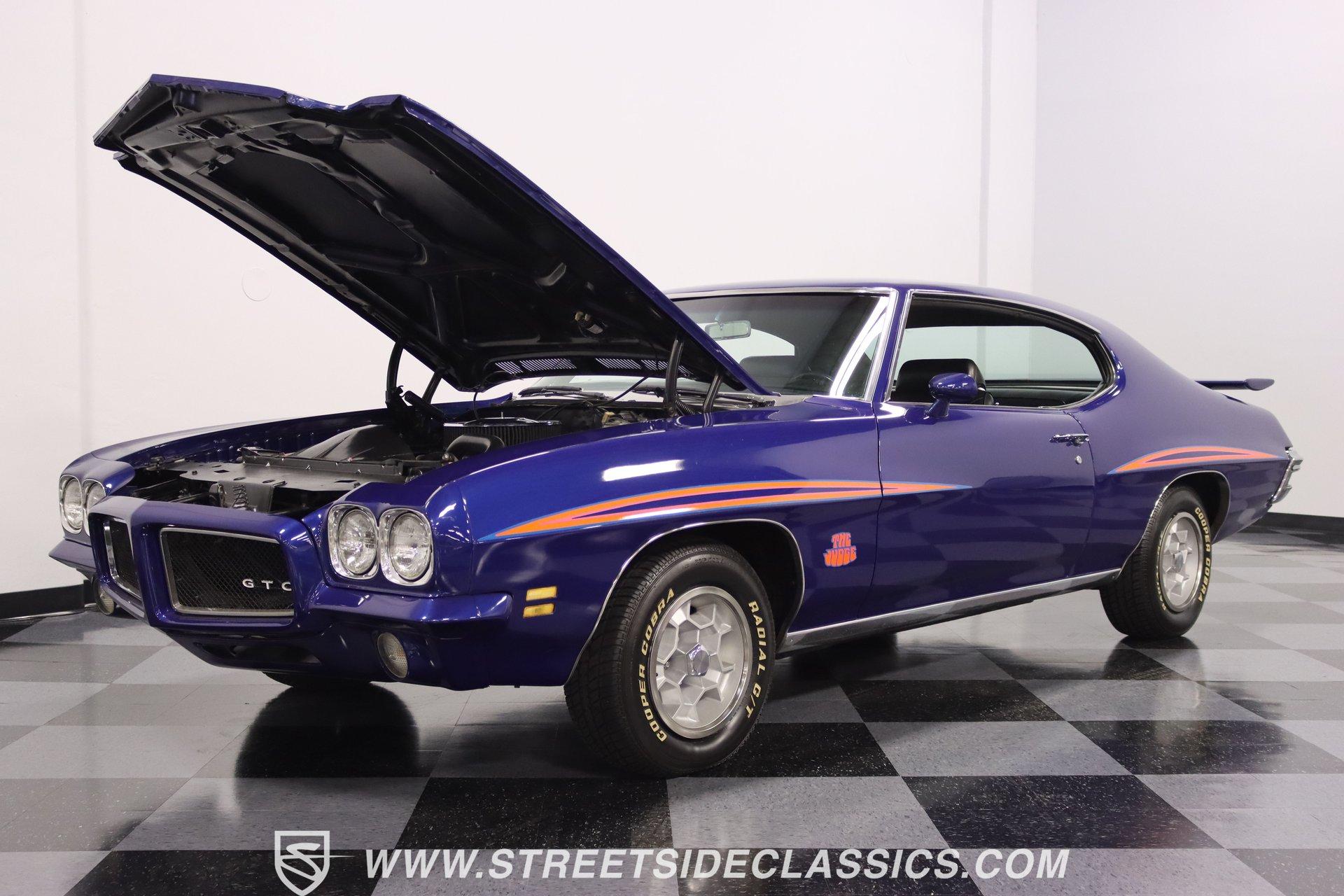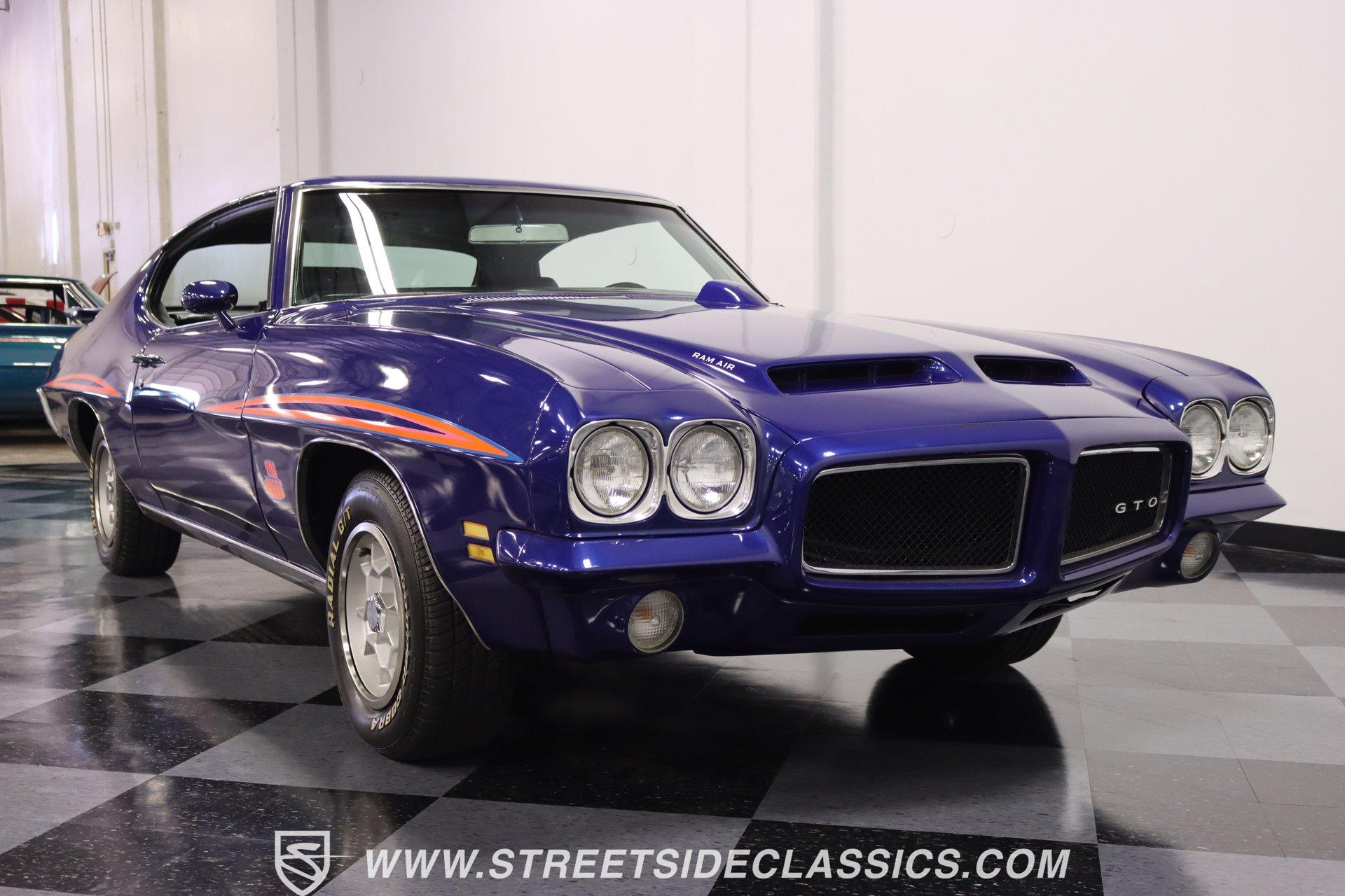 This 1971 Pontiac is a real-deal GTO that has been upgraded to the proper look for The Judge. In fact, as you look through the full package, it's like getting the best of everything Pontiac had to offer in the early 1970s. For example, the color holds close to Regency Blue, which is a hue that was exclusive to 1971. But there's a modern gloss and shine today that makes it even more radiant. Plus, The Judge's sunrise streaks were arguably the best stripe package of the era in the way they highlight the flare of the fenders. The color-matched bumper, big rear spoiler, hood tach, quad exhaust tips, and honeycomb alloys are all the best parts from the one that launched the muscle car. And because this one is so powerful looking inside and out, it's also awesome to have a throaty version of the 400 cubic-inch V8 under the hood. So take some extra time checking out a car that's extra sleek, extra means, and absolutely awesome. HIGHLIGHTS *Awesome shine to the upgraded blue metallic paint *Real-deal GTO upgraded to The Judge -Ram Air hood scoops -Blackout grille -Full-width rear spoiler -Iconic sunrise stripe and graphics package *Desirable hood-mounted tach *Honeycomb alloy wheels *Color-matched front bumper and form-hugging rear chrome bumper *Tasteful and clean black interior goes with The Judge stripes *AM/FM/cassette stereo *Driver-oriented: bucket seats, center console, and sporty round gauges *Classic machine-turned dash panel *Well-placed upgrades: sports steering wheel and aux readouts *400 cubic-inch V8 -Holley four-barrel carburetor -Edelbrock intake -Dual exhaust with Flowmaster mufflers *Three-speed automatic transmission *12-bolt rear end *Boxed rear trailing arms with sway bar *Power steering, power brakes, and front discs A real-deal GTO has an instant pedigree, but this one elevates the full package to deliver the best of the muscle car era. That's no small feat, and thus, it also makes this one of the most distinct ways to bring power to the streets. So if you love a GTO with a true GR-RRR you know this bold blue bad boy is the one. Call today!!!