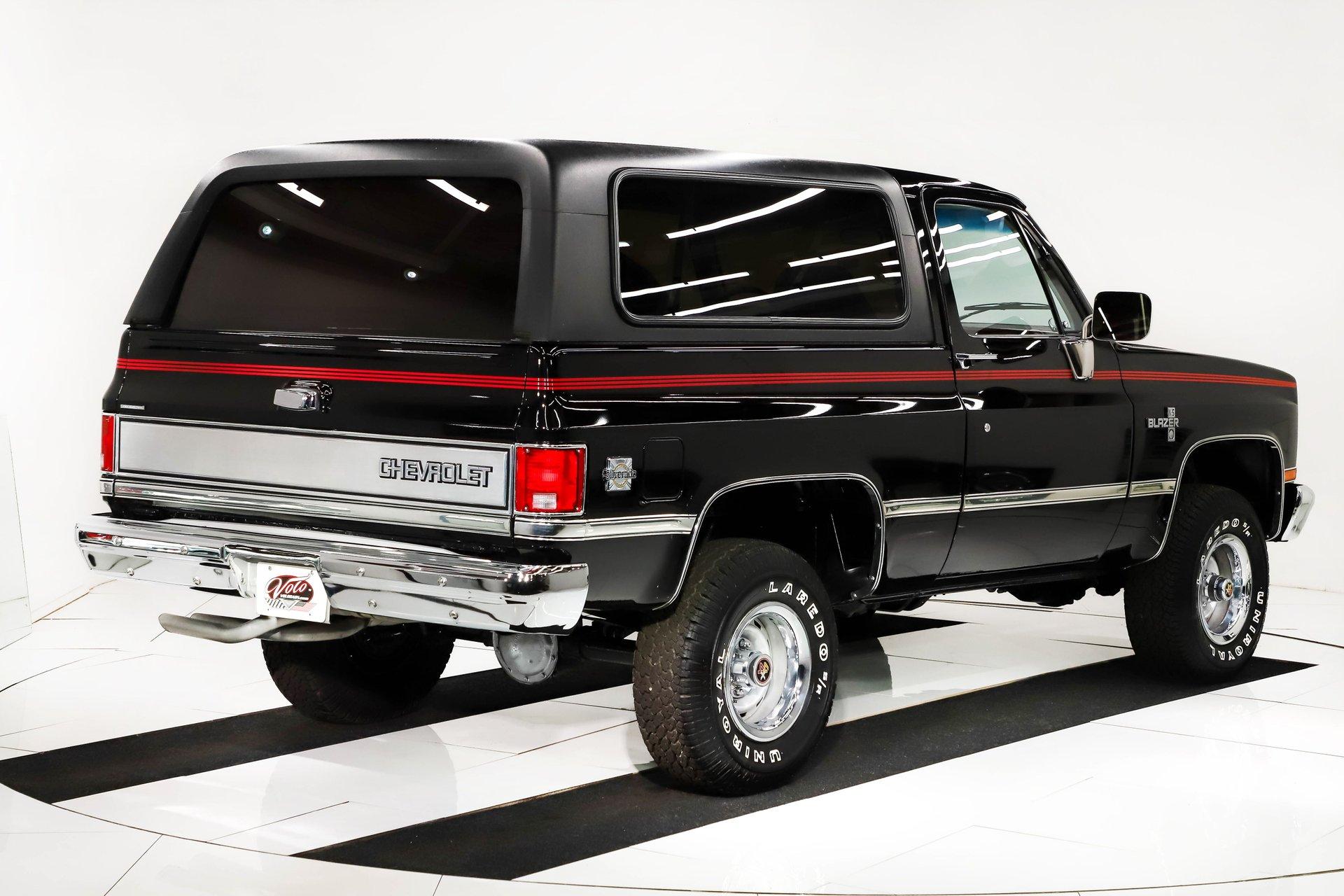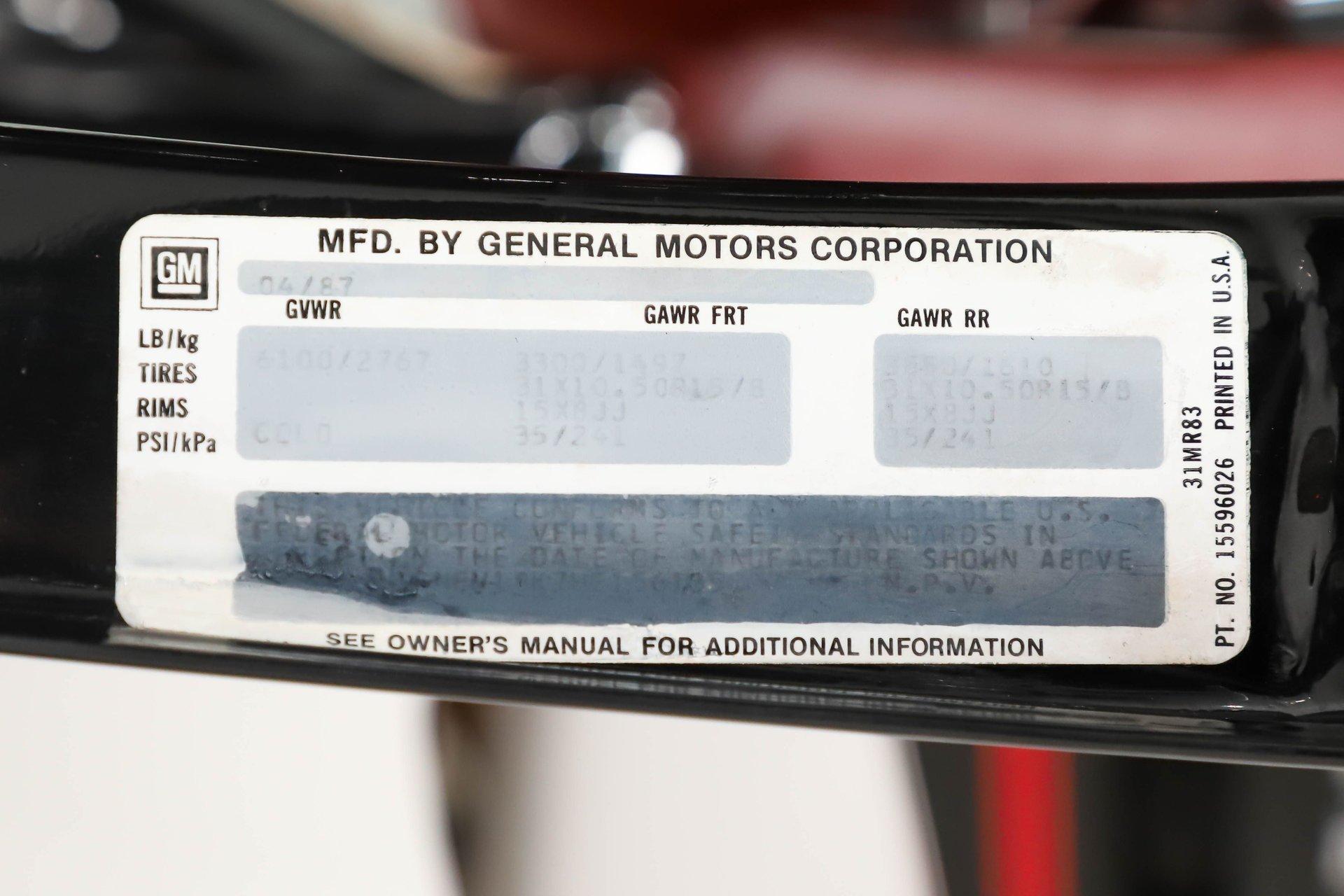 2,225 actual miles! Let's go right back to 1987 in this time capsule Silverado Blazer. This is all original and looks practically brand new! 1 owner with clean Carfax. EXTERIOR: It is beautiful to look at the black with the red striping. This show quality truck is original from 1987. I've been all over this paint job and cannot find anywhere it's been repainted. It's smooth and glossy with no rust or damage. All the chrome, trim, moldings bumpers are also in excellent shape. All the weatherstrips and rubber seals are still soft. All the glass is crystal clear. The removable roof is in excellent shape. It is sitting on its original Uniroyal tires and rally wheels. INTERIOR: I'm sitting inside right now, and it is literally as close to brand new as you will ever find. It has a very plush red velour upholstery, bucket seats in front with a center console and a removable seat in back. The cigarette lighter and ashtray have never been used. All the plastic chrome, vents, heater control panel are still shiny. There is absolutely no wear on the steering wheel, pedals, shifter knob etc. From carpet to headliner, it still looks new, new, new. Features include a tilt wheel and its original digital AM/FM cassette stereo. In the glove box is the original owner's manual. It also includes shop manuals that were bought back in 1987 and still look new as well. ENGINE COMPARTMENT: It has the optional 5.7 liter 350 motor. It's completely original other than a few maintenance items like the radiator hose, battery, and alternator. It has been inspected and serviced in our shop, it's running and operating very well. Features include air conditioning, power steering and power brakes. The original jack has never been removed; all the pollution equipment is in place. TRUNK COMPARTMENT: Remember the pop out chrome handle that you roll the window down with? Then you reach inside to open the tailgate. Inside the back is all carpeted and upholstered and still looks like brand new. The spare tire has never been out of the car. UNDERSIDE: Very well preserved. It has 4 wheel drive, the transfer case still looks like new and has the manufacturer's tag dated 1987. Power disc brakes in front, drum in back. Complete exhaust with catalytic converter and dual tail pipes. The fuel tank still looks clean. The bottom of the motor is clean. It has a manual 4-speed trans with a hydraulic clutch. SERVICE: Our shop drive and inspected this time capsule. They replaced a reverse light bulb, alternator and battery. They charged the air conditioning too. I'm still amazed at how clean this unrestored, original 38 year old Blazer is! Take a blast from the past in this time capsule. This era Blazer is going up in value with a long way to go considering the age of the group that it appeals to. For nearly 30 years, I, Jay Grams, have personally written the highlights for almost every car in our collection. What I provide is my professional opinion based on my experience with these vehicles. However, opinions can vary, and I strongly recommend a personal inspection to form your own view. Our sales team is always available to answer any questions you may have. One great option is to request a personalized walk-around video, where we can showcase the car and share our team’s insights. **Our cars are displayed within a museum setting. If you are interested in a specific vehicle, please schedule an appointment with a salesperson to view it. Without an appointment, there is an admission fee to enter the showroom. If you decide to purchase a car, your admission will be refunded, and you'll receive a one-year museum membership. 815 385 3644 9-5 central Sales@volocars.com Answered ASAP Air conditioning Power steering Power disc brakes 4 wheel drive Red velour Bucket seats Console Tilt wheel Cassette stereo Rally wheels Red stripes