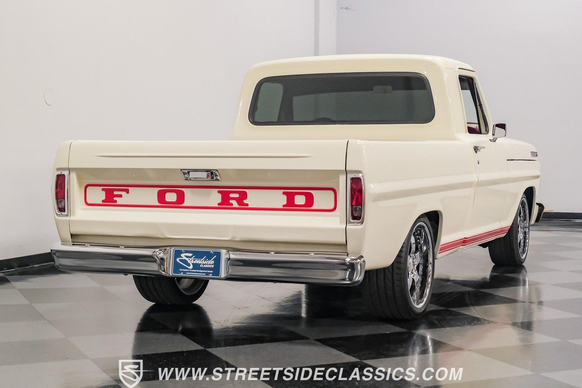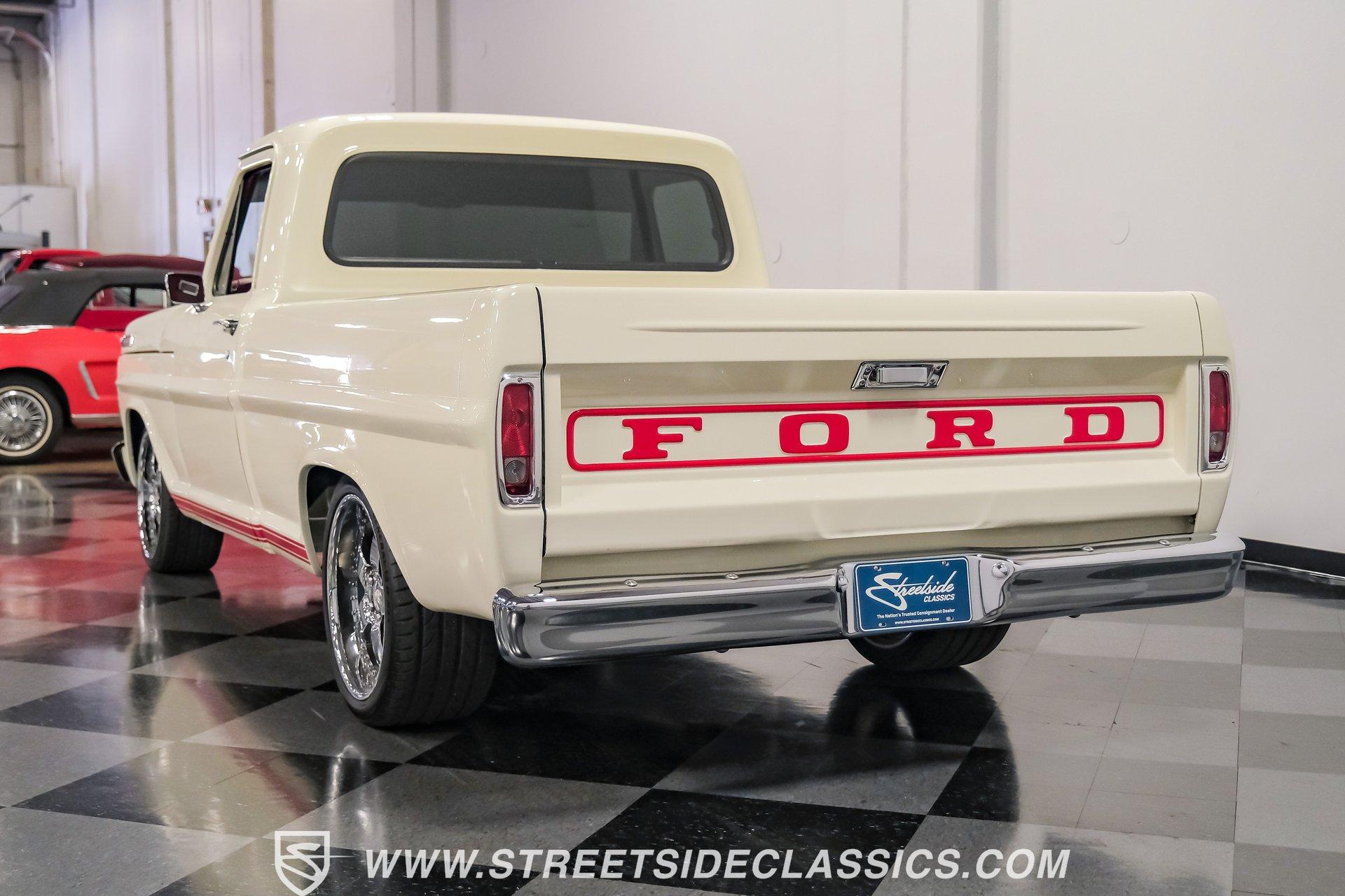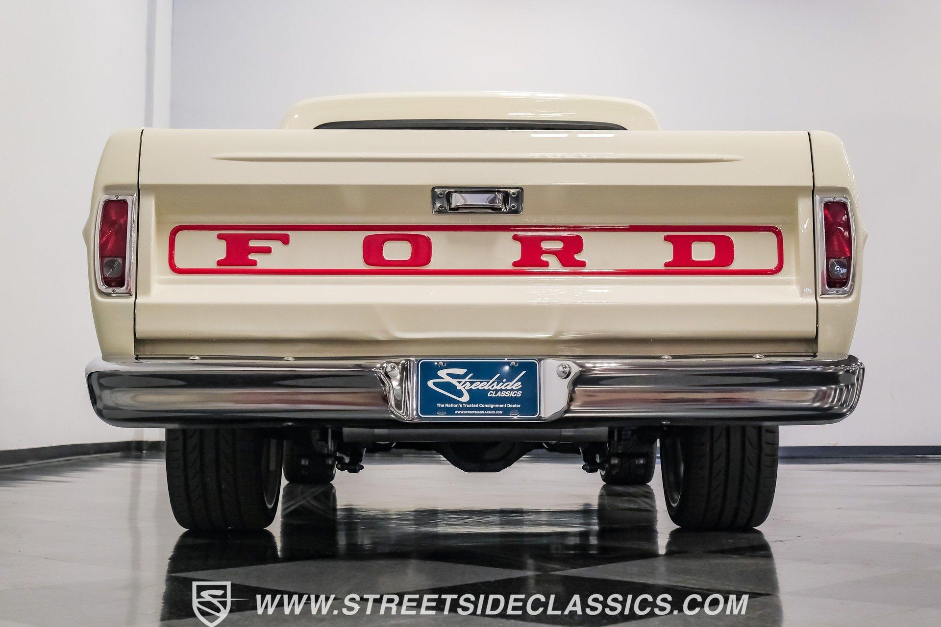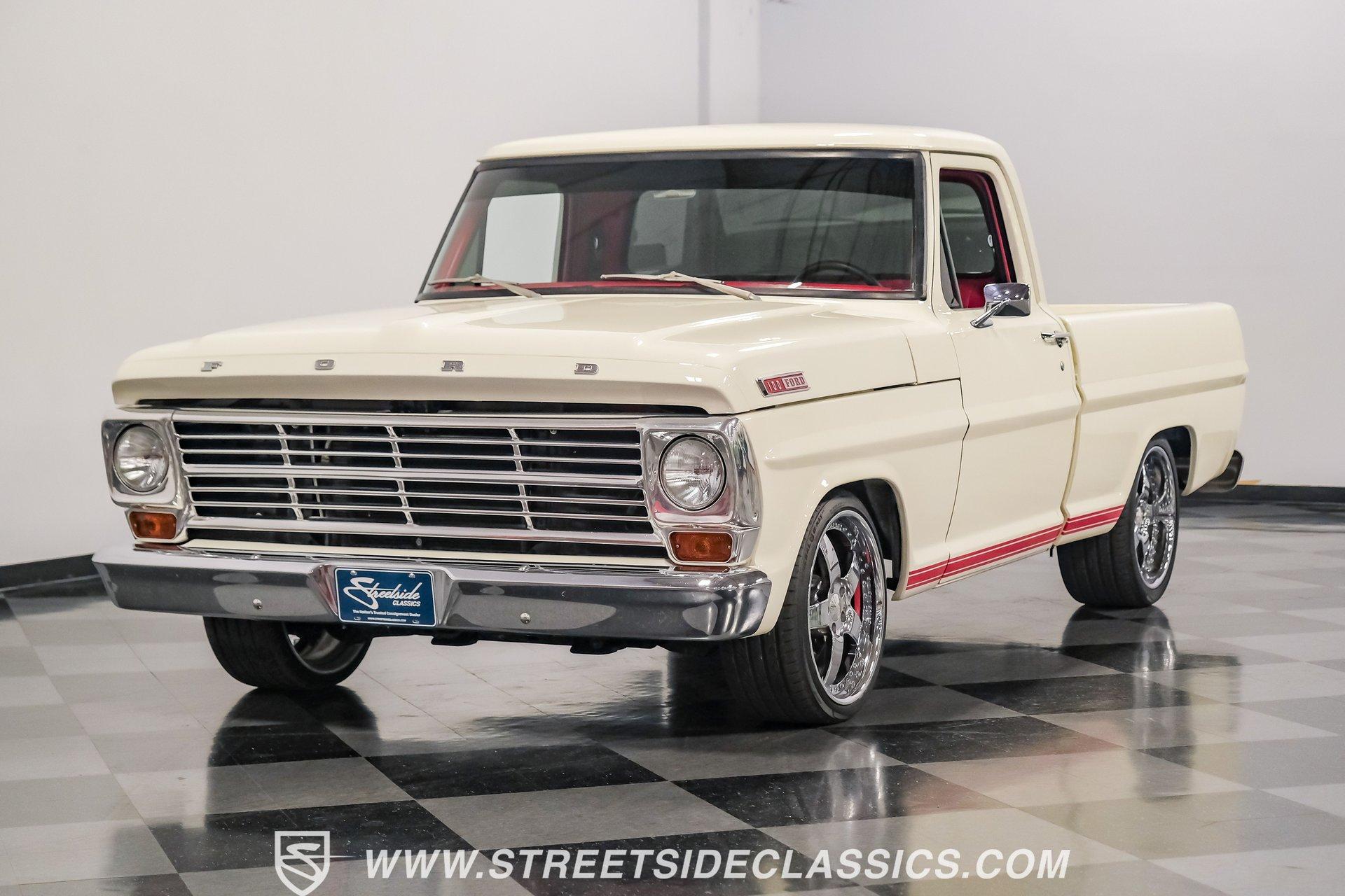 Ford chose 1967 to introduce its next generation of F-Series pickup truck. Designers squared off the body lines and accented the flat side panels with a narrow indentation. Truck interiors were also more "plush," and featured a padded dash, padded sun visors, and seat belts with shoulder anchor harnesses, all as standard equipment. This 1967 Ford F-100 restomod pickup combines Ford's classic styling with modern enhancements to create a one very special truck. This a high-quality restoration with show-quality Wimbledon White paint laid down on a laser-straight body accented by bright rim, brilliant chrome front and rear bumpers and a red lower Mustang GT-style side stripe that hints of what is under the hood of this classic. Exterior upgrades include a color coordinated Rhino-lined type spray bed finish and a relocated fuel tank with the filler located in the bed. A set of chrome 20-inch BOZE wheels wrapped with General tires staggered 245/35ZR19 front and 285/35ZR19 rear provide a confidant stance. HIGHLIGHTS: 4.6-liter fuel injected V8 5-Speed automatic transmission Vintage Air 20-inch BOZE wheels Crown Victoria front suspension 4-Wheel power disc brakes Rack and pinion power steering Dolphin gauges The interior looks amazing. Custom trimmed in red, it features a custom upholstered bench seat with integrated cup holders, Vintage Air, custom gauge cluster with Dolphin gauges, RetroSound AM/FM radio, chrome tilt steering column and a beautiful custom billet and leather steering wheel. The engine bay is highly detailed, showcasing a 4.6 Liter, fuel injected V8 engine paired with five-speed automatic transmission. A color-matched engine cover ads to the smooth and clean look under the hood. Other upgrades include an aluminum radiator, Crown Victoria front suspension with a power rack and pinion system, power disc brakes on all four corners and Belltech Nitro Drop 2 rear shocks. Restored to a very high standard, this exceptional 1967 Ford F100 truck is stunning to see and a thrill to drive. Call today!