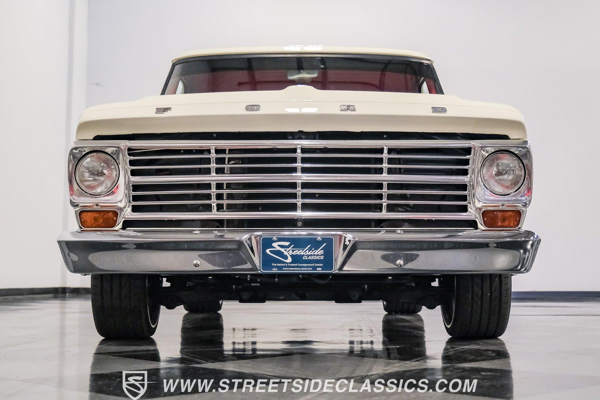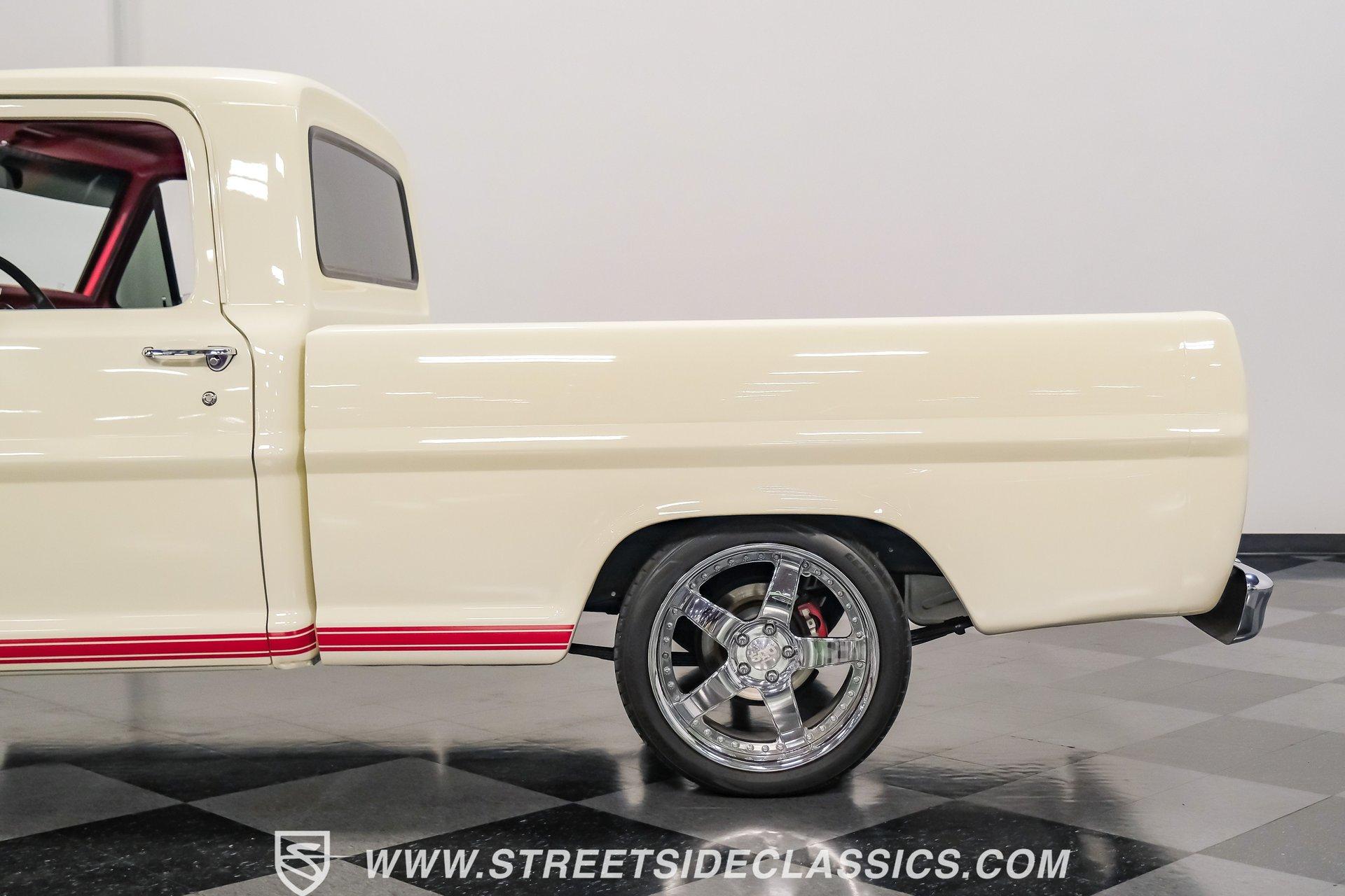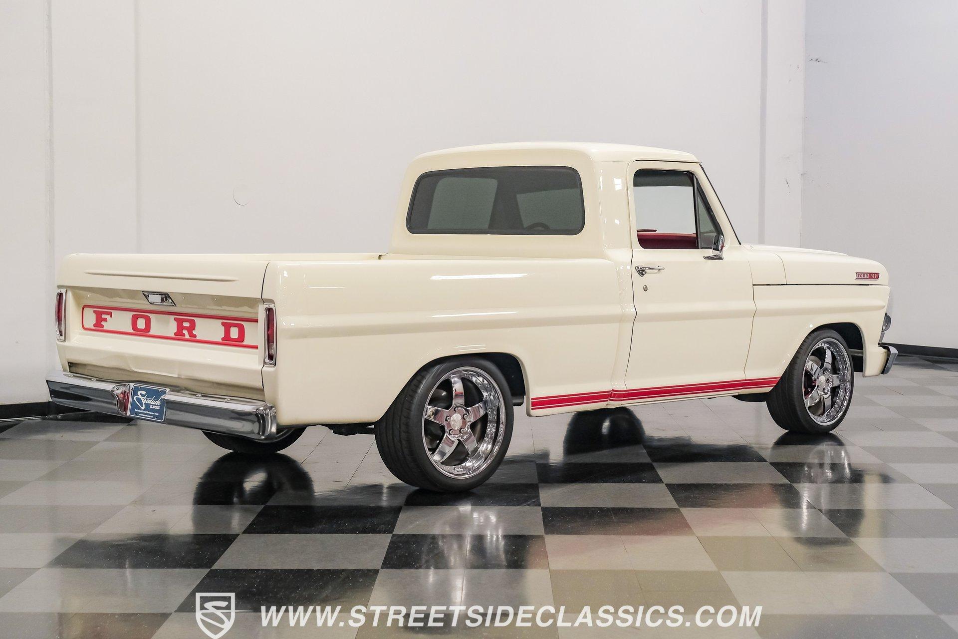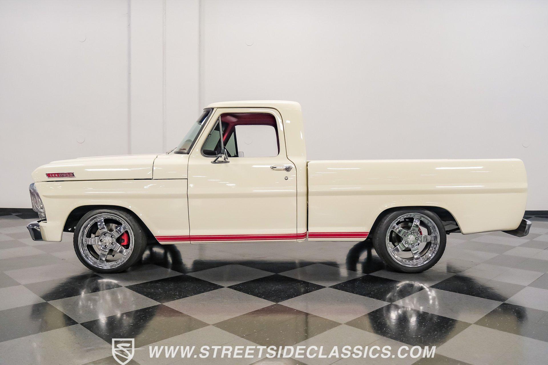 Ford chose 1967 to introduce its next generation of F-Series pickup truck. Designers squared off the body lines and accented the flat side panels with a narrow indentation. Truck interiors were also more "plush," and featured a padded dash, padded sun visors, and seat belts with shoulder anchor harnesses, all as standard equipment. This 1967 Ford F-100 restomod pickup combines Ford's classic styling with modern enhancements to create a one very special truck. This a high-quality restoration with show-quality Wimbledon White paint laid down on a laser-straight body accented by bright rim, brilliant chrome front and rear bumpers and a red lower Mustang GT-style side stripe that hints of what is under the hood of this classic. Exterior upgrades include a color coordinated Rhino-lined type spray bed finish and a relocated fuel tank with the filler located in the bed. A set of chrome 20-inch BOZE wheels wrapped with General tires staggered 245/35ZR19 front and 285/35ZR19 rear provide a confidant stance. HIGHLIGHTS: 4.6-liter fuel injected V8 5-Speed automatic transmission Vintage Air 20-inch BOZE wheels Crown Victoria front suspension 4-Wheel power disc brakes Rack and pinion power steering Dolphin gauges The interior looks amazing. Custom trimmed in red, it features a custom upholstered bench seat with integrated cup holders, Vintage Air, custom gauge cluster with Dolphin gauges, RetroSound AM/FM radio, chrome tilt steering column and a beautiful custom billet and leather steering wheel. The engine bay is highly detailed, showcasing a 4.6 Liter, fuel injected V8 engine paired with five-speed automatic transmission. A color-matched engine cover ads to the smooth and clean look under the hood. Other upgrades include an aluminum radiator, Crown Victoria front suspension with a power rack and pinion system, power disc brakes on all four corners and Belltech Nitro Drop 2 rear shocks. Restored to a very high standard, this exceptional 1967 Ford F100 truck is stunning to see and a thrill to drive. Call today!