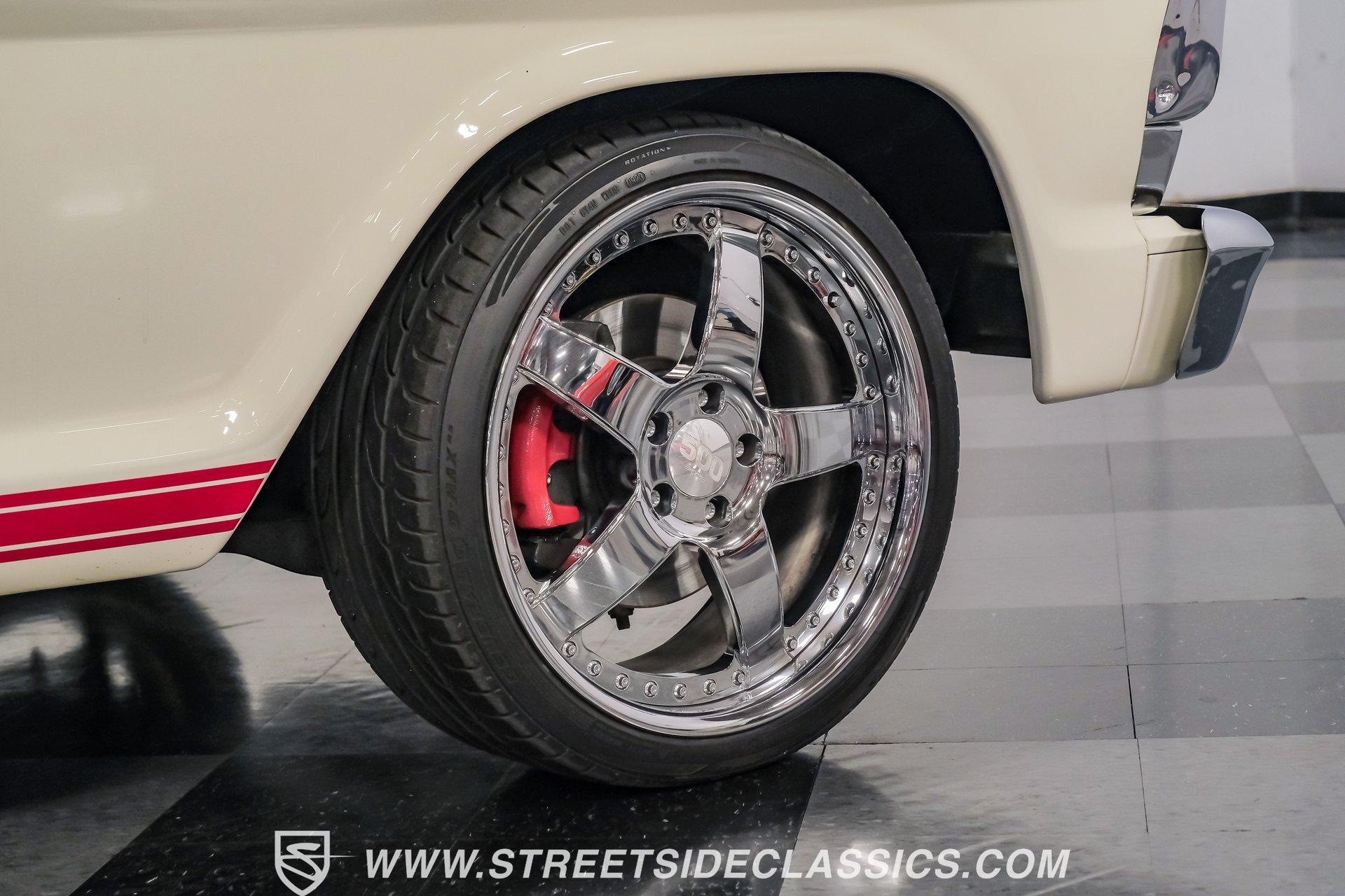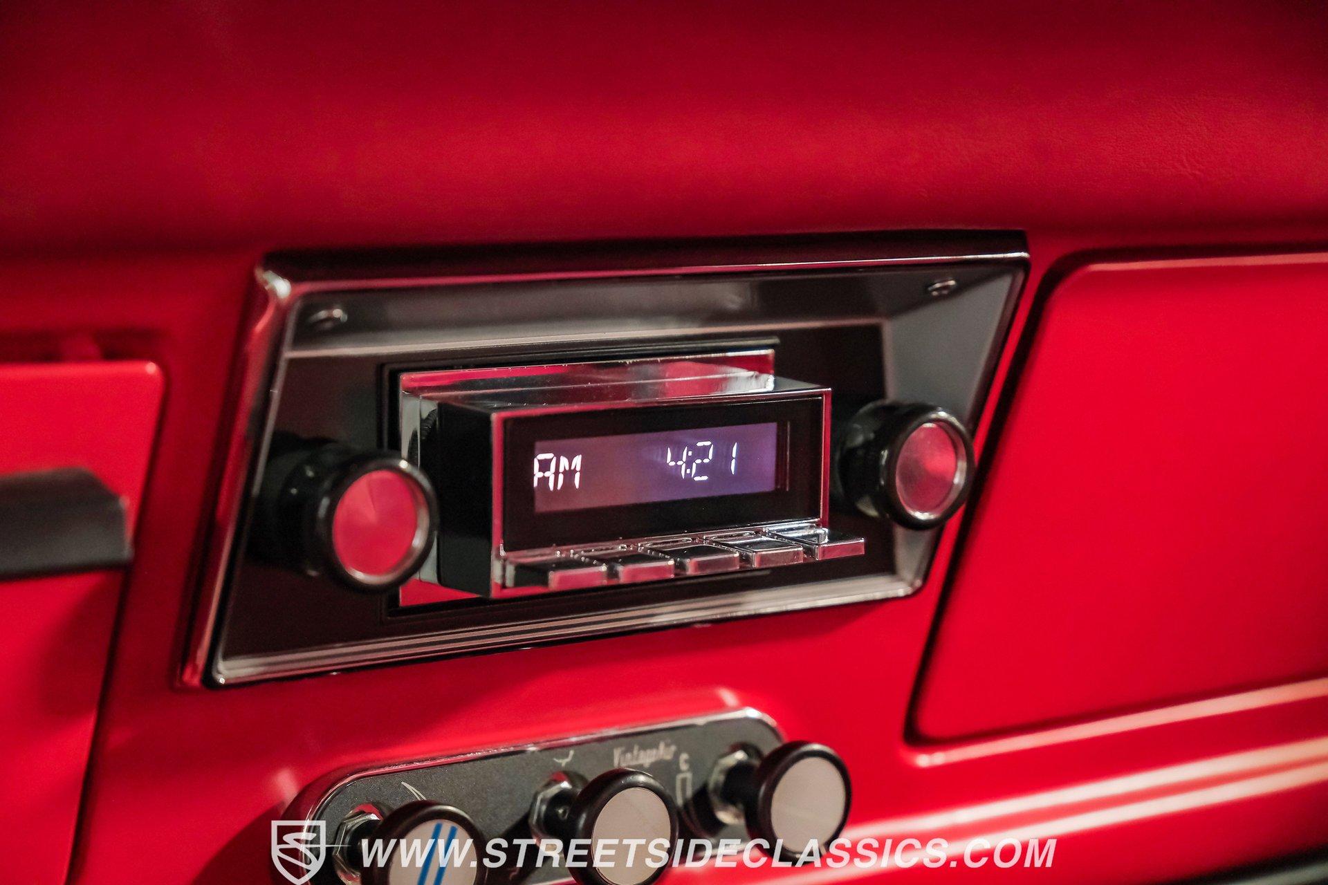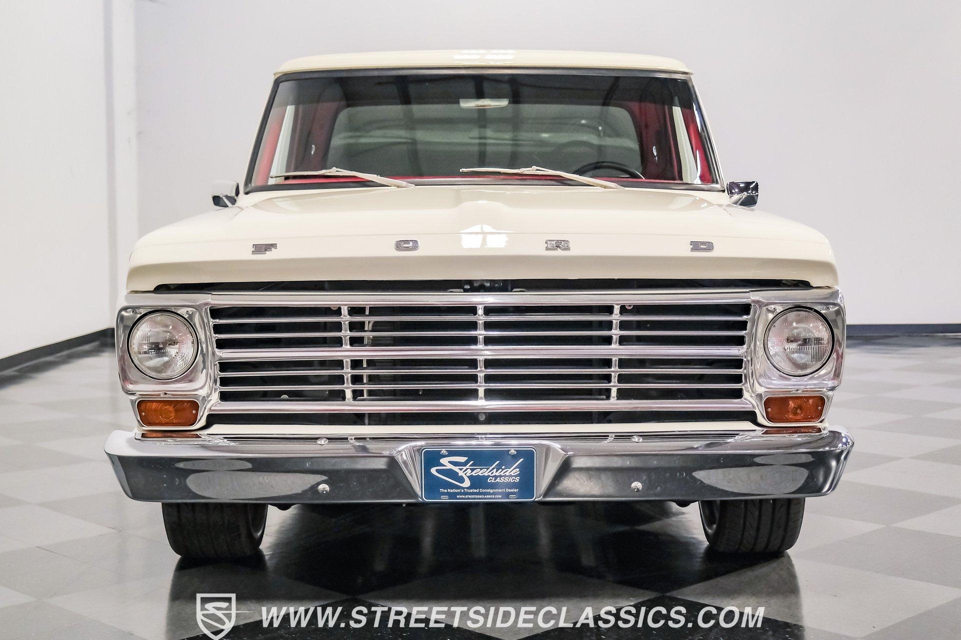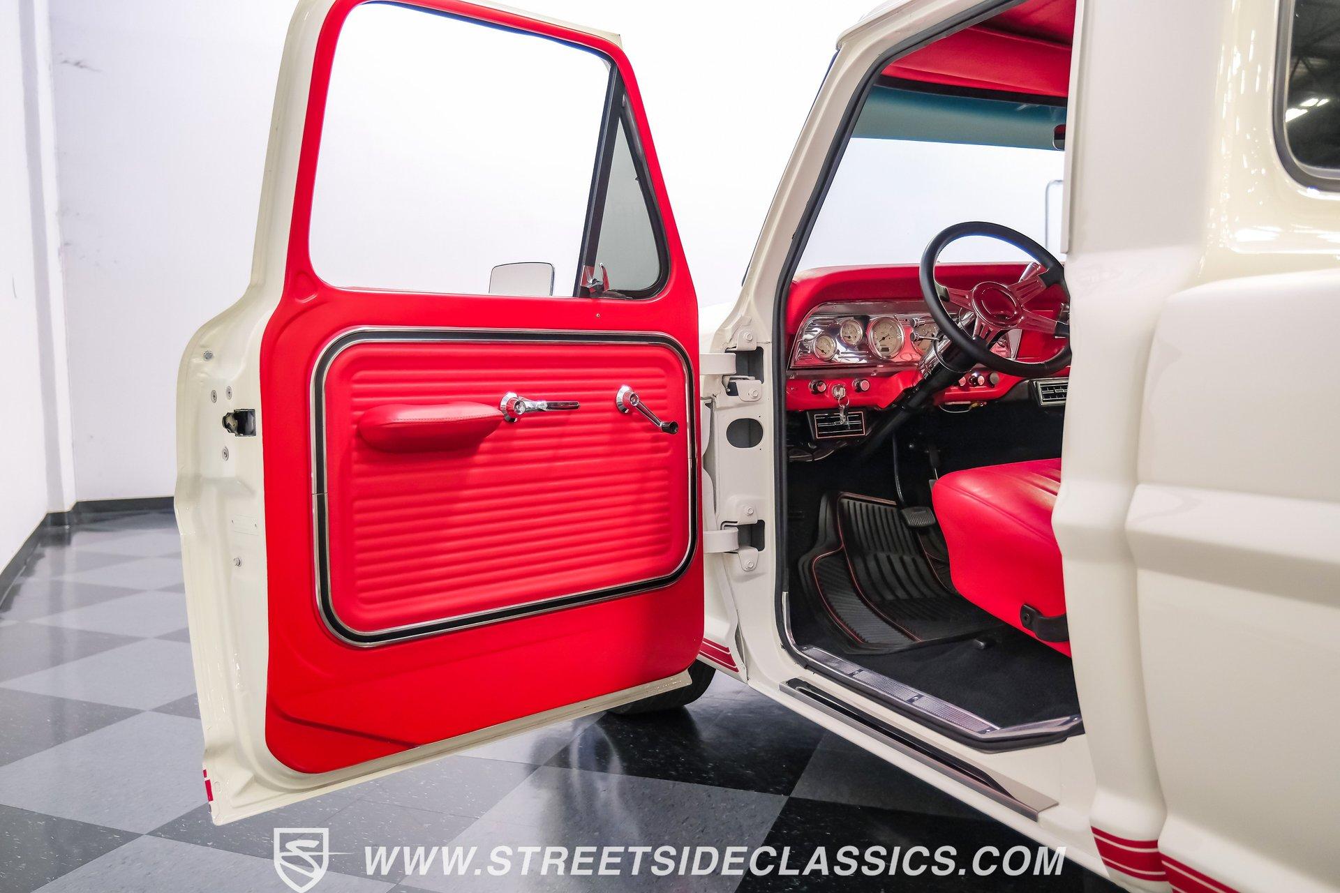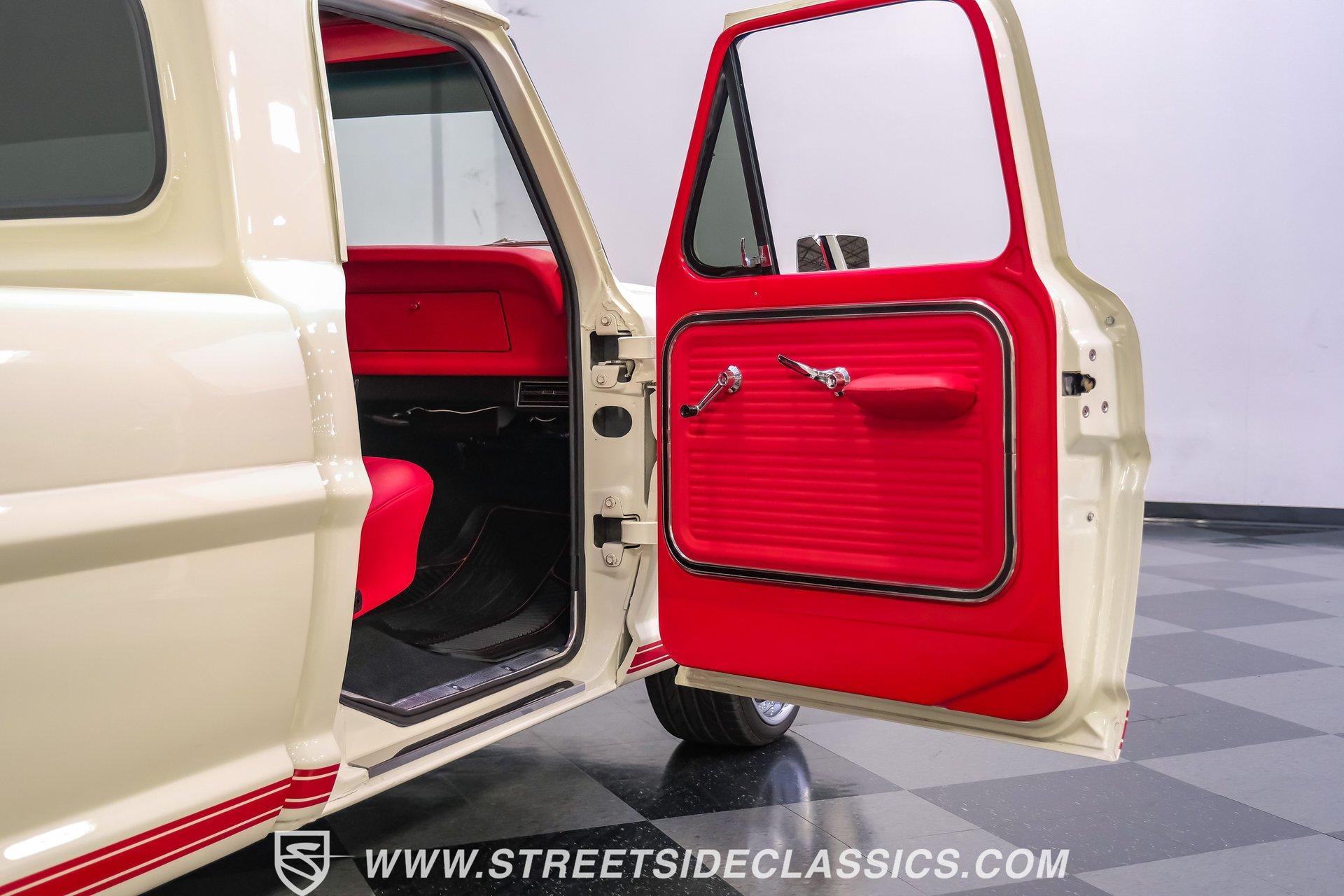 Ford chose 1967 to introduce its next generation of F-Series pickup truck. Designers squared off the body lines and accented the flat side panels with a narrow indentation. Truck interiors were also more "plush," and featured a padded dash, padded sun visors, and seat belts with shoulder anchor harnesses, all as standard equipment. This 1967 Ford F-100 restomod pickup combines Ford's classic styling with modern enhancements to create a one very special truck. This a high-quality restoration with show-quality Wimbledon White paint laid down on a laser-straight body accented by bright rim, brilliant chrome front and rear bumpers and a red lower Mustang GT-style side stripe that hints of what is under the hood of this classic. Exterior upgrades include a color coordinated Rhino-lined type spray bed finish and a relocated fuel tank with the filler located in the bed. A set of chrome 20-inch BOZE wheels wrapped with General tires staggered 245/35ZR19 front and 285/35ZR19 rear provide a confidant stance. HIGHLIGHTS: 4.6-liter fuel injected V8 5-Speed automatic transmission Vintage Air 20-inch BOZE wheels Crown Victoria front suspension 4-Wheel power disc brakes Rack and pinion power steering Dolphin gauges The interior looks amazing. Custom trimmed in red, it features a custom upholstered bench seat with integrated cup holders, Vintage Air, custom gauge cluster with Dolphin gauges, RetroSound AM/FM radio, chrome tilt steering column and a beautiful custom billet and leather steering wheel. The engine bay is highly detailed, showcasing a 4.6 Liter, fuel injected V8 engine paired with five-speed automatic transmission. A color-matched engine cover ads to the smooth and clean look under the hood. Other upgrades include an aluminum radiator, Crown Victoria front suspension with a power rack and pinion system, power disc brakes on all four corners and Belltech Nitro Drop 2 rear shocks. Restored to a very high standard, this exceptional 1967 Ford F100 truck is stunning to see and a thrill to drive. Call today!