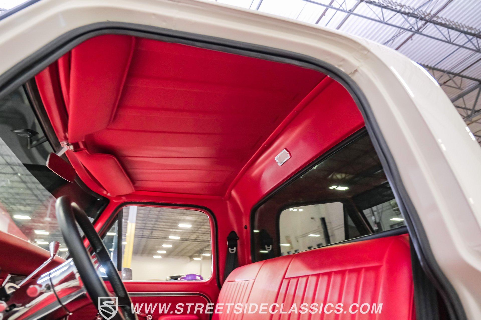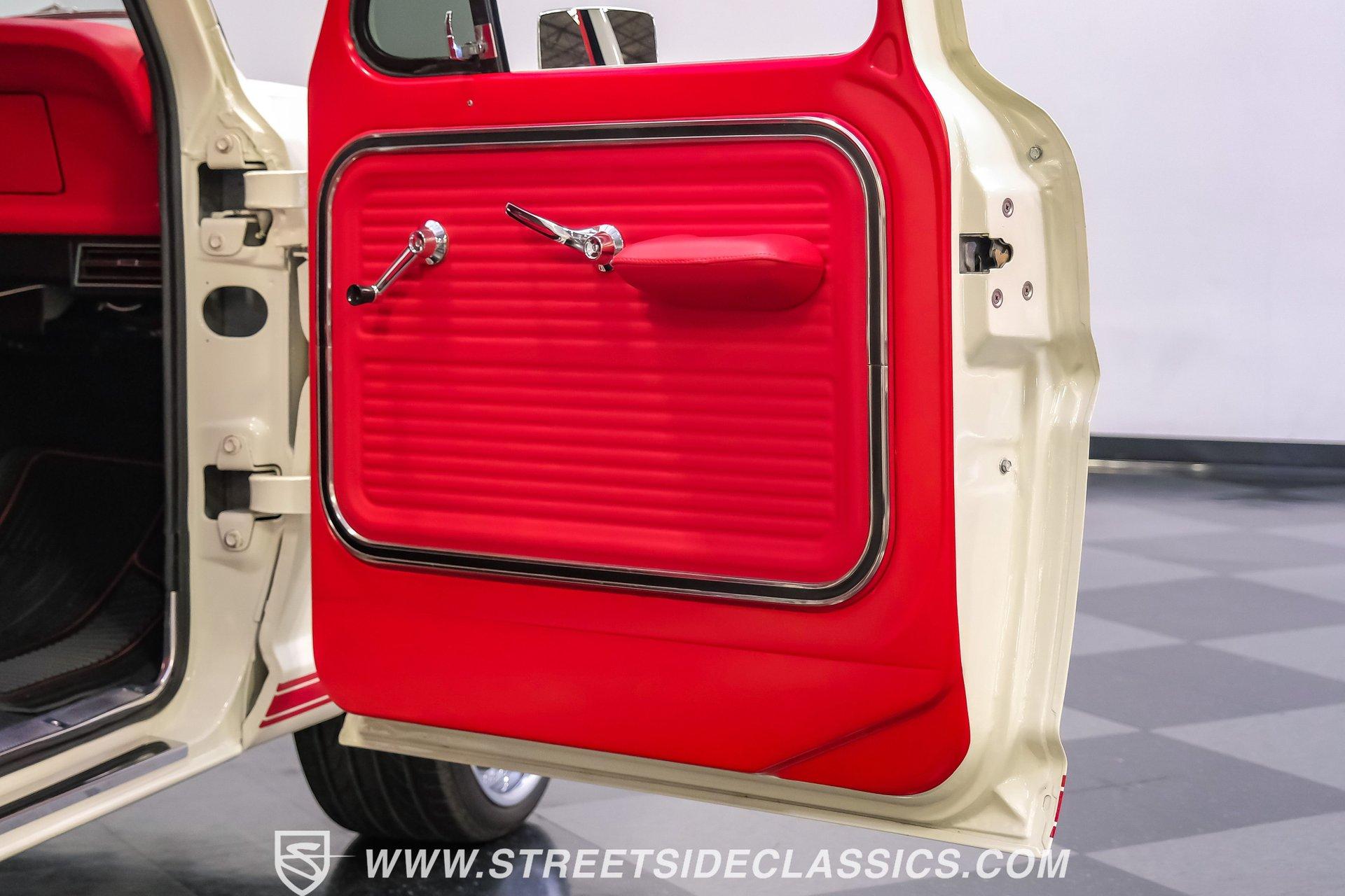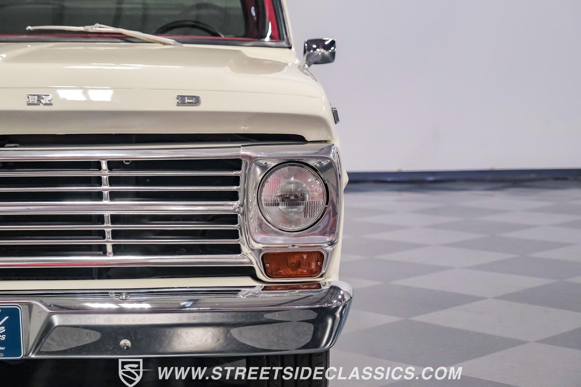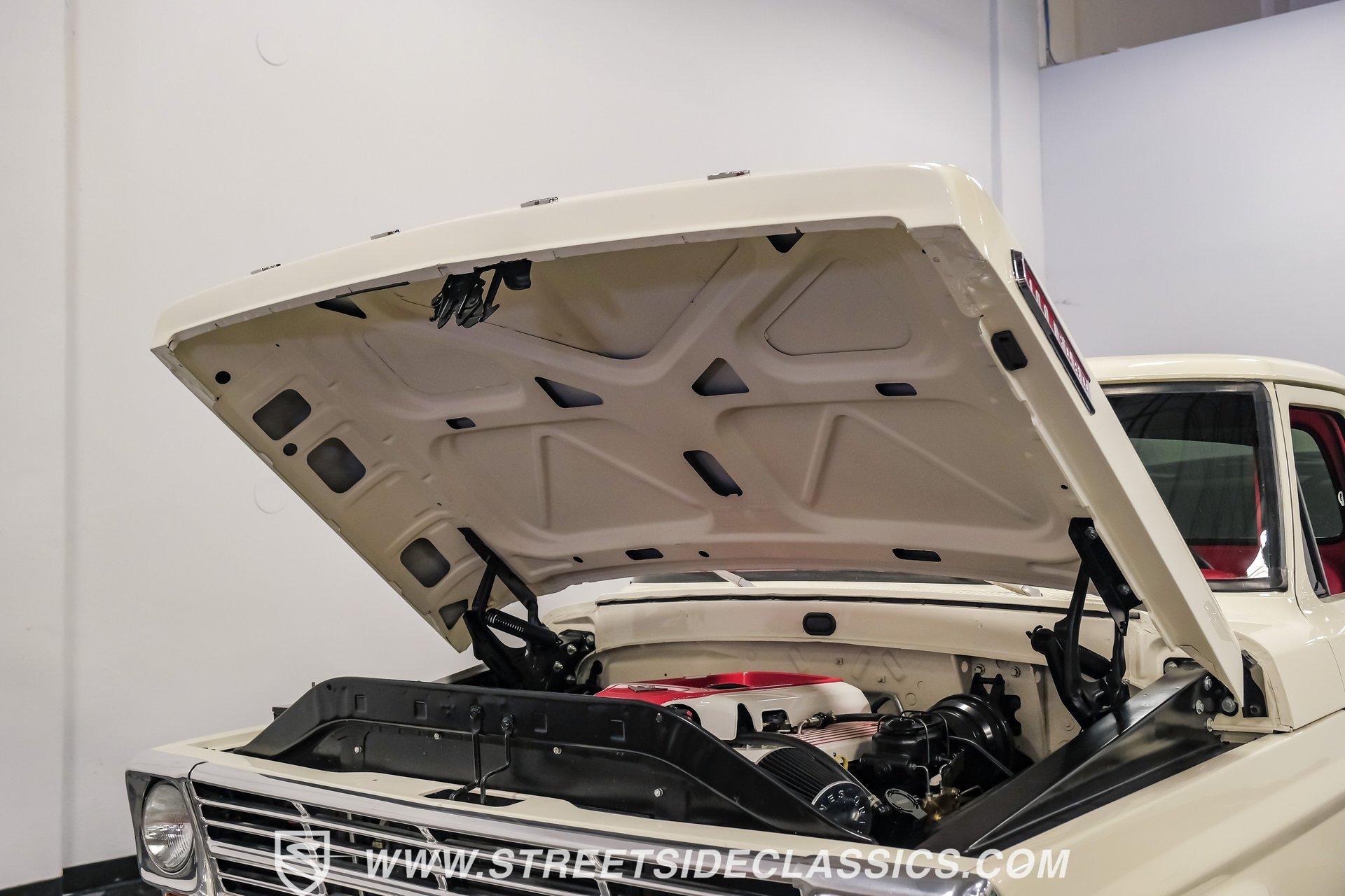 Ford chose 1967 to introduce its next generation of F-Series pickup truck. Designers squared off the body lines and accented the flat side panels with a narrow indentation. Truck interiors were also more "plush," and featured a padded dash, padded sun visors, and seat belts with shoulder anchor harnesses, all as standard equipment. This 1967 Ford F-100 restomod pickup combines Ford's classic styling with modern enhancements to create a one very special truck. This a high-quality restoration with show-quality Wimbledon White paint laid down on a laser-straight body accented by bright rim, brilliant chrome front and rear bumpers and a red lower Mustang GT-style side stripe that hints of what is under the hood of this classic. Exterior upgrades include a color coordinated Rhino-lined type spray bed finish and a relocated fuel tank with the filler located in the bed. A set of chrome 20-inch BOZE wheels wrapped with General tires staggered 245/35ZR19 front and 285/35ZR19 rear provide a confidant stance. HIGHLIGHTS: 4.6-liter fuel injected V8 5-Speed automatic transmission Vintage Air 20-inch BOZE wheels Crown Victoria front suspension 4-Wheel power disc brakes Rack and pinion power steering Dolphin gauges The interior looks amazing. Custom trimmed in red, it features a custom upholstered bench seat with integrated cup holders, Vintage Air, custom gauge cluster with Dolphin gauges, RetroSound AM/FM radio, chrome tilt steering column and a beautiful custom billet and leather steering wheel. The engine bay is highly detailed, showcasing a 4.6 Liter, fuel injected V8 engine paired with five-speed automatic transmission. A color-matched engine cover ads to the smooth and clean look under the hood. Other upgrades include an aluminum radiator, Crown Victoria front suspension with a power rack and pinion system, power disc brakes on all four corners and Belltech Nitro Drop 2 rear shocks. Restored to a very high standard, this exceptional 1967 Ford F100 truck is stunning to see and a thrill to drive. Call today!