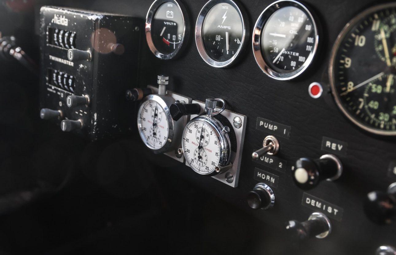Work started with the engine being removed and sent to Denis Welch for a full upgrade and rebuild including fitting an alloy head, triple Weber carburettors along with rally cams. Attention then past to the bodywork with panels being replaced by aluminium before being resprayed. The gearbox and drive train were rebuilt along with overhauling the braking and suspension system, fitting a roll cage and sump guard, full electrical re-wire, whilst still retaining its dynamo and non-electronic ignition to satisfy much more stringent scrutineering at classic rally events. Other notable features include a fire extinguisher, Halda twinmaster timer, twin rally timers, bucket sports seats with five-point harnesses, intercom system, heated windscreen and spotlights.