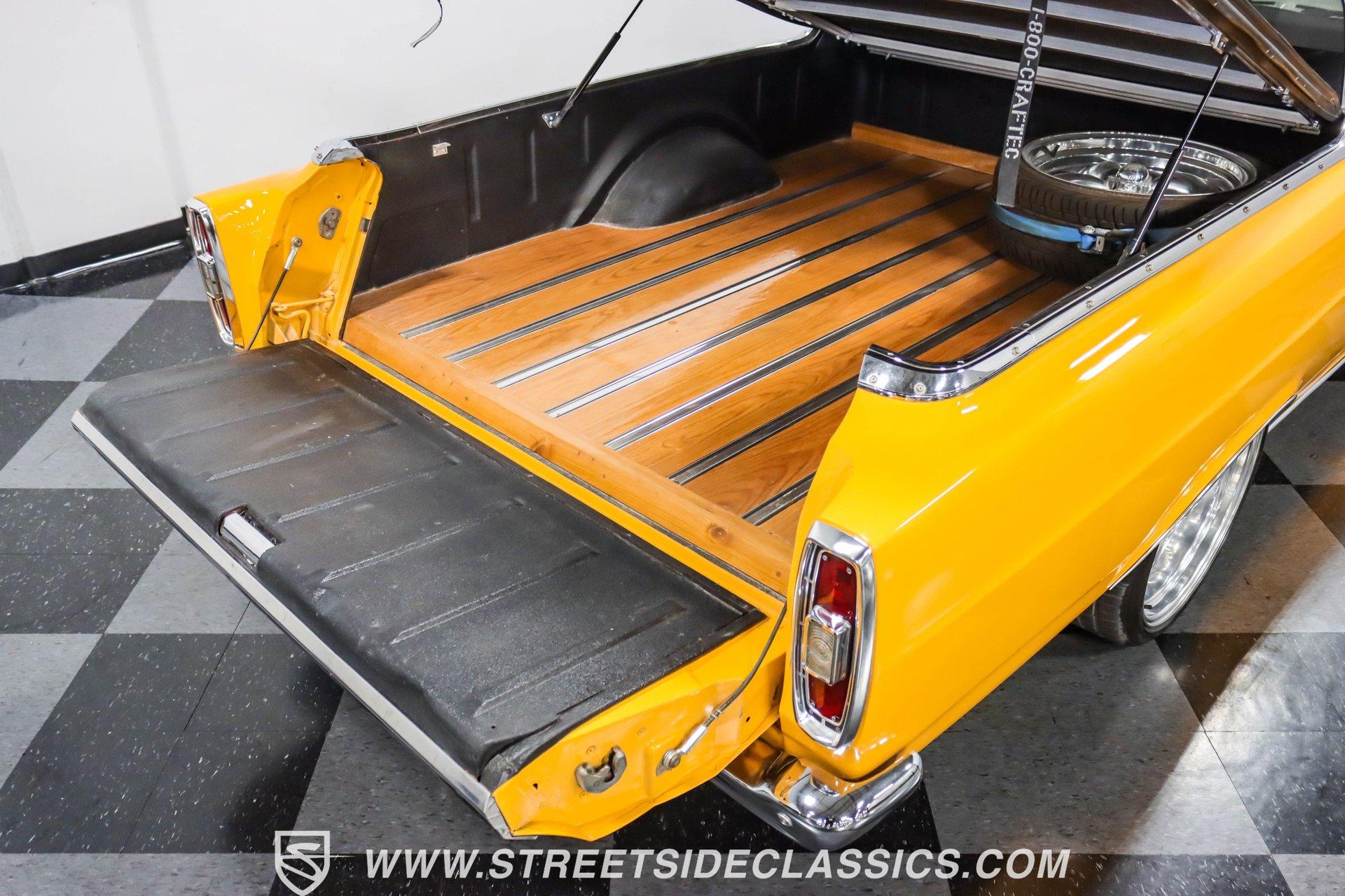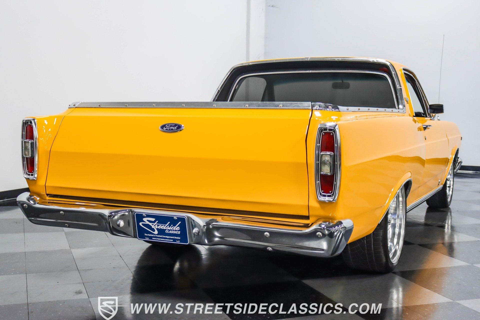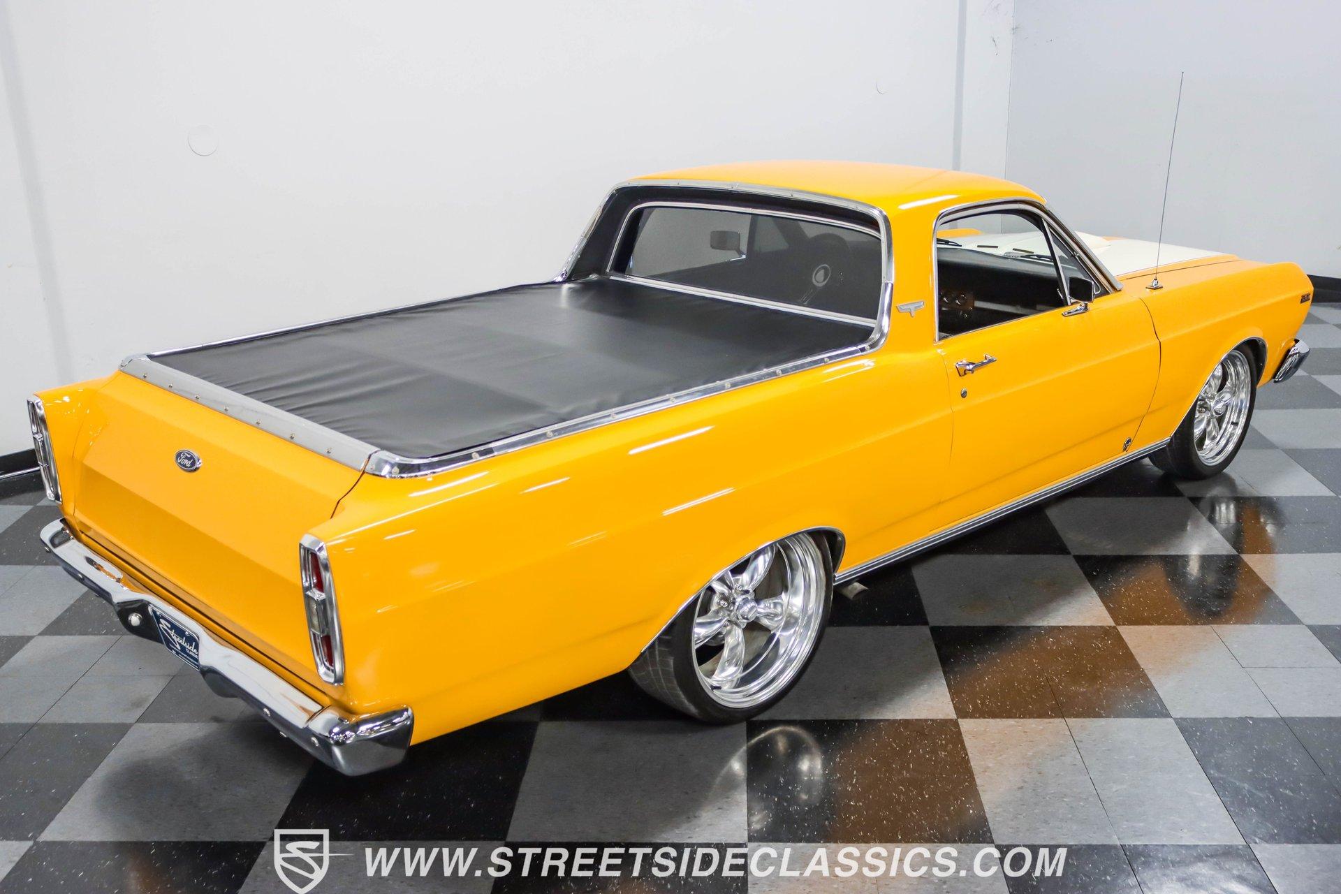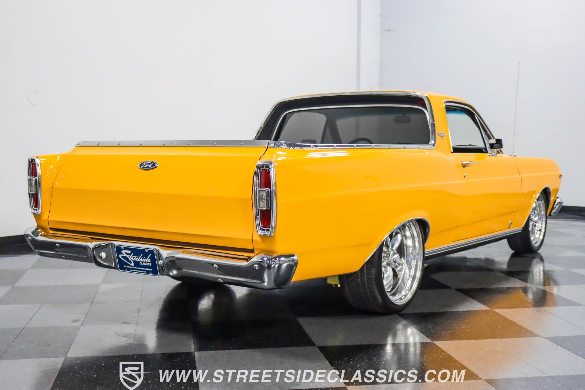 A 1966 Ford Ranchero is a rare find, and finding one in this condition is even rarer. The Ranchero was restyled for 1966 and would be the last year the Ranchero would have Falcon style front sheet metal. In 1967 Ford styled the cars to look more like a Fairlane, making the 1966 model unique and sought-after by collectors today. This sharp-looking Ranchero in finished handsomely in Wheatland Yellow with white hood stripes that showcase a custom installed non-functional hood scoop. Additionally, this classic has been enhanced with upgraded tri-bar headlights, dark tinted glass and a quality Craftec hatch-style tonneau cover with no snaps that lifts up to reveal a beautiful custom-made oakwood bed floor cover that looks amazing. A set of polished American Racing wheels with tires staggered 225/40ZR18 front and 285/30ZR20 rear give this classic Ford a great looking stance. HIGHLIGHTS: 302 V8 engine C4 automatic transmission 9-inch rear end with traction bars Front power disc brakes American Racing wheels Edelbrock intake manifold Holley carburetor Lokar shifter Air conditioning Tilt steering column The black interior features a comfortable bench seat, Lokar shifter, custom chrome tilt steering column, custom steering wheel, air conditioning, Ford logo floor mats, Equus Pro Tach and Bosch temperature, oil pressure and volt gauges to monitor engine functions. Music for cruising is provided by a Kenwood Excelon AM/FM/CD radio with AUX and Bluetooth that plays through kick panel mounted speakers with an Amp and subwoofer located behind the seat. Under the hood is a healthy 302 cubic inch engine mated to a C4 automatic transmission that sends power back to a 9-inch Ford rear end with traction bars. The engine looks as great as it runs, with an Edelbrock aluminum intake manifold topped with a Holley carburetor, Edelbrock finned aluminum valve covers with matching air cleaner, MSD ignition, aluminum radiator with electric fans and power brakes with front discs. A set of long-tube headers rumble back through gas pack style mufflers that exit just before the rear wheels on both sides. With quality upgrades in just the right places, this rare 1966 Ford Ranchero is a cool find. Call today!