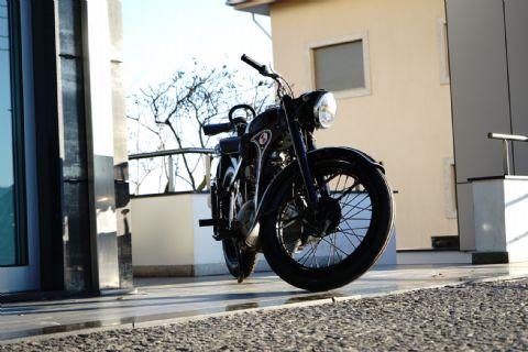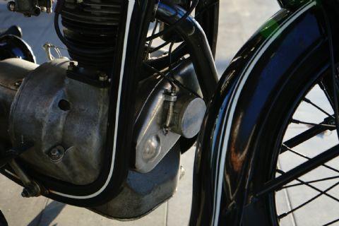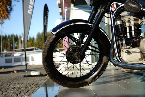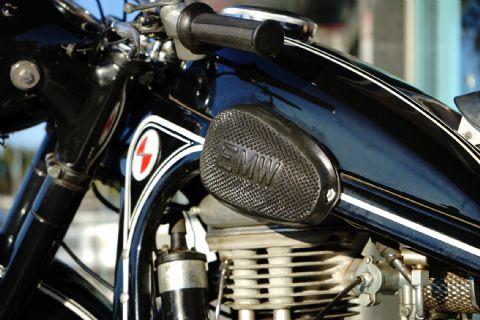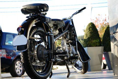 In 1937, Bayerische Motorenwerke developed the BMW R 35 single-cylinder motorbike with a single-cylinder four-stroke engine, 340 cm³ displacement and 14 hp. The R 35 was developed for use by the authorities, police and military. It was considered extremely robust, sturdy and reliable, above average at the time. Due to the construction of aircraft for the Second World War, the R35 project was suspended and resumed in 1947. Due to restrictions placed on BMW at the time, the EMW was then freed from these restrictions. Further modifications followed for the R-35, which from then on was called the EMW R-35-3. The frame was lengthened, reinforced from 2 to 3 mm and fitted with a damped straight rear wheel suspension. The engine is also ventilated at the air filter. The model presented to us dates from 1950 and was restored around 5 years ago.