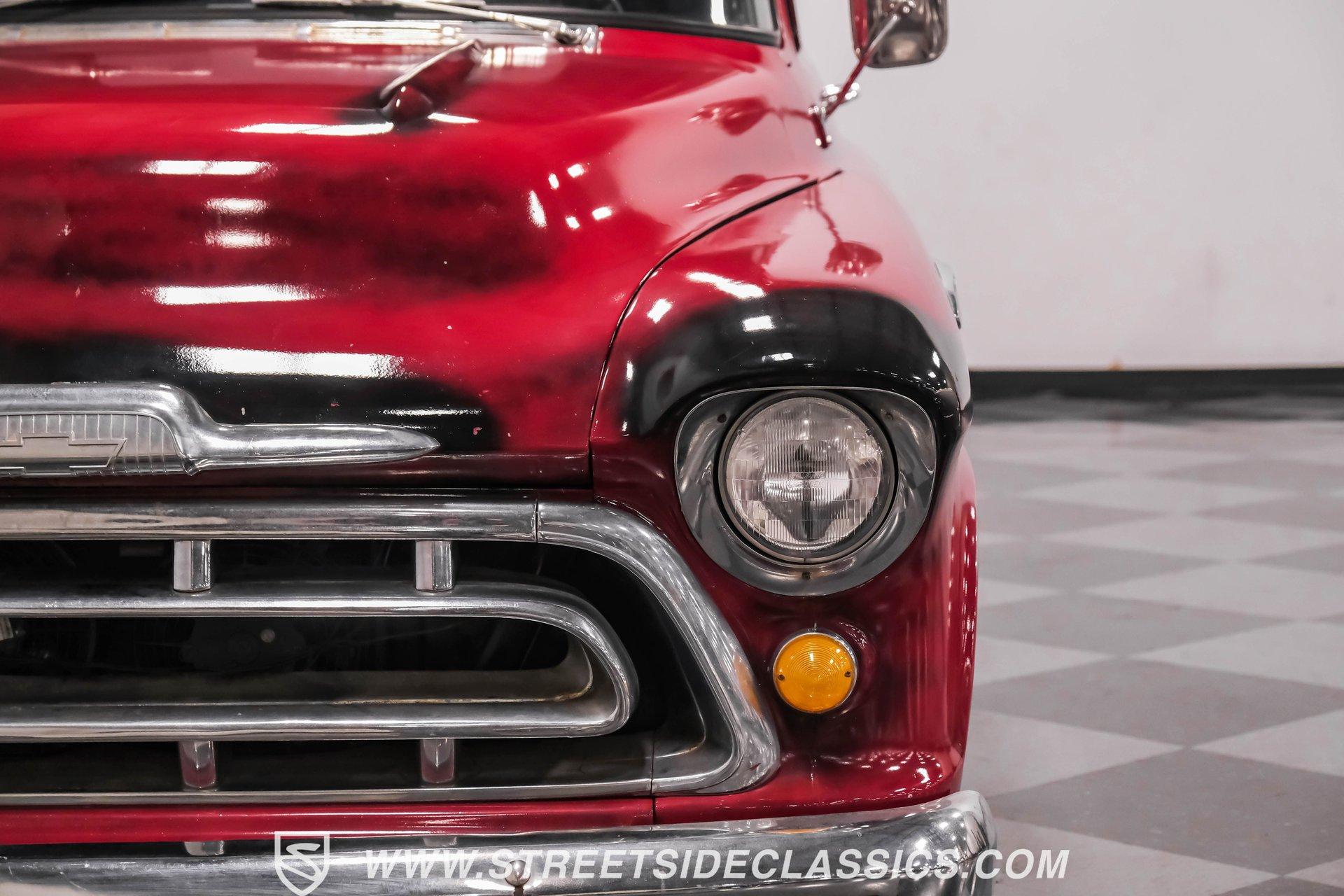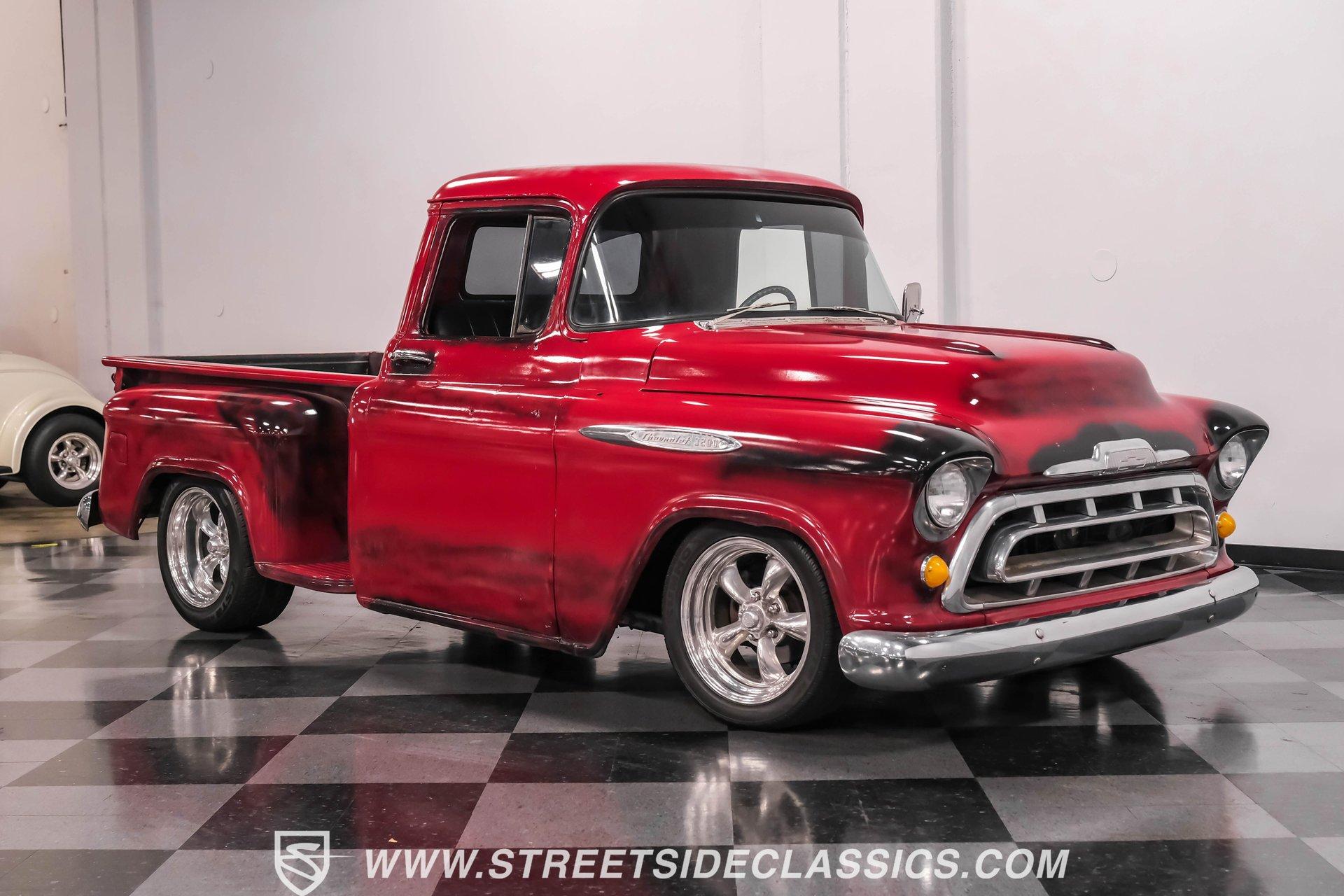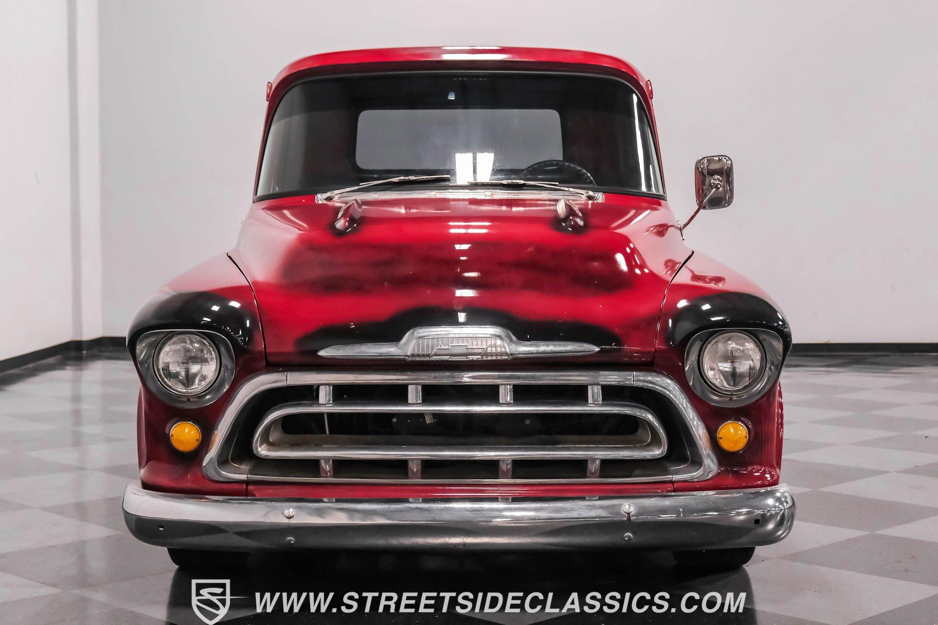 This 1957 Chevrolet 3100 brings style with its unique red patina finish sealed under a layer of clear coat, giving it an authentic aged look while protecting the metal underneath. The sleek modifications include integrated tail lights and a custom fuel filler in the fender, adding modern flair to the classic truck design. American Racing 17-inch wheels shod with 235/45R17 front and 255/50R17 rear tires anchor each corner, while the Camaro front subframe provides improved handling dynamics. The black and red interior blends classic style with modern upgrades. The vinyl bench seat offers comfortable cruising, while Dakota Digital gauges provide clear readouts of vital information. A tilt steering column topped with a billet wheel puts control at your fingertips, and the Lokar floor shifter adds a performance touch. Air conditioning keeps things cool while a Dual-brand radio with AM/FM/Bluetooth/AUX capabilities provides the soundtrack. A modern 5.3L LS V8 Vortec engine paired with a 4-speed automatic transmission delivers strong power to the 10-bolt rear end. Long tube headers feed into a dual Thrush exhaust system for an awesome sound. The power disc brakes at all four corners provide excellent stopping ability, while power steering makes maneuvering effortless. An electronic cooling fan maintains optimal operating temperatures. HIGHLIGHTS: 5.3L LS V8 Vortec Engine 4-Speed Automatic Transmission Electronic Fuel Injection Long Tube Headers Dual Thrush Exhaust Power Disc Brakes Front and Rear 10-Bolt Rear Axle Camaro Front Subframe Power Steering Red Patina with Clear Coat 17" American Racing Wheels 235/45R17 Front, 255/50R17 Rear Tires Custom Fuel Filler Location Black and Red Interior with Bench Seat Air Conditioning Dakota Digital Gauges Tilt Steering Column AM/FM/Bluetooth/AUX Radio This 1957 Chevrolet 3100 combines classic truck style with modern performance upgrades. The LS V8 power, upgraded suspension, and custom touches make this pickup a perfect blend of old and new. Call today!