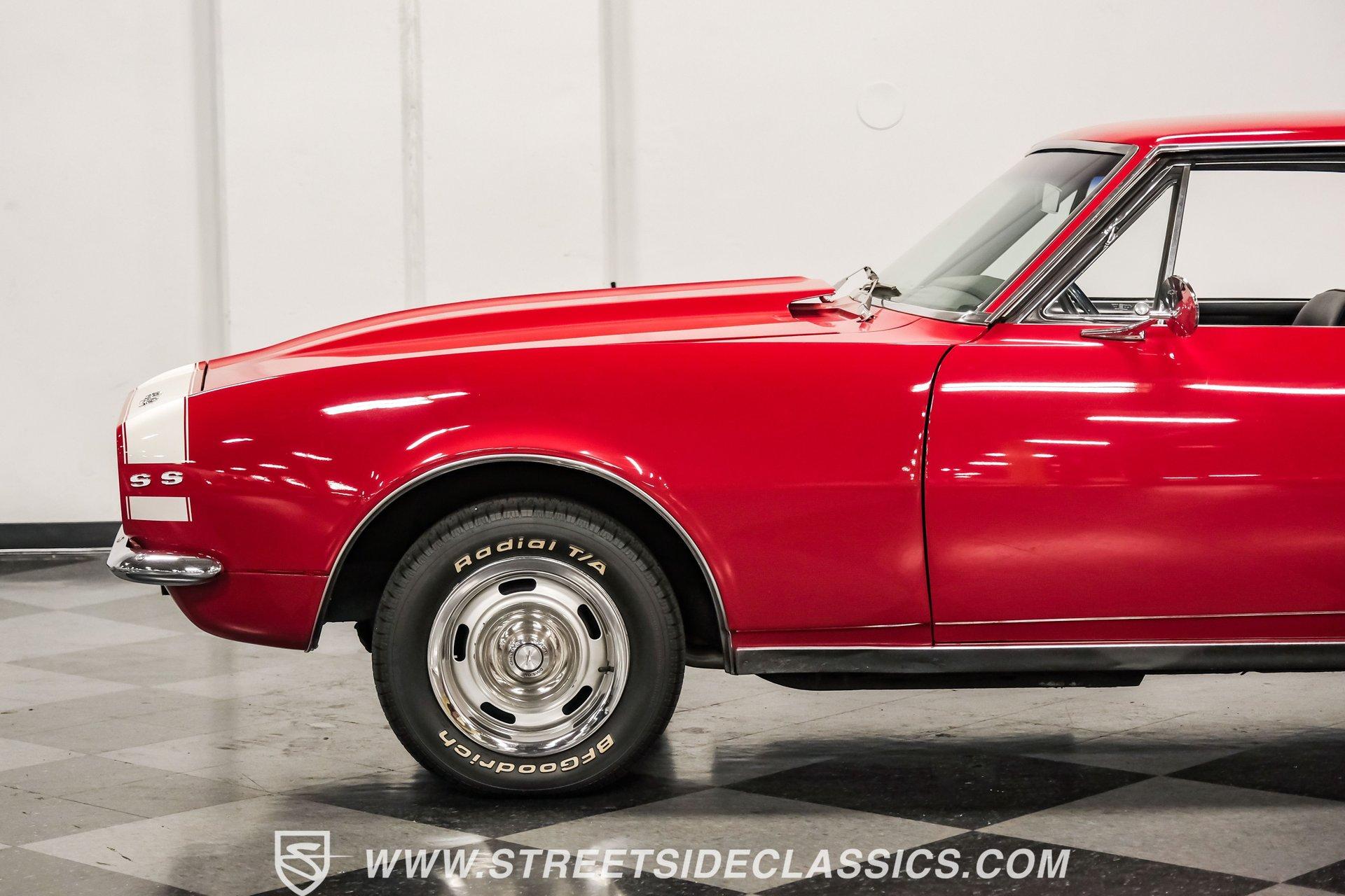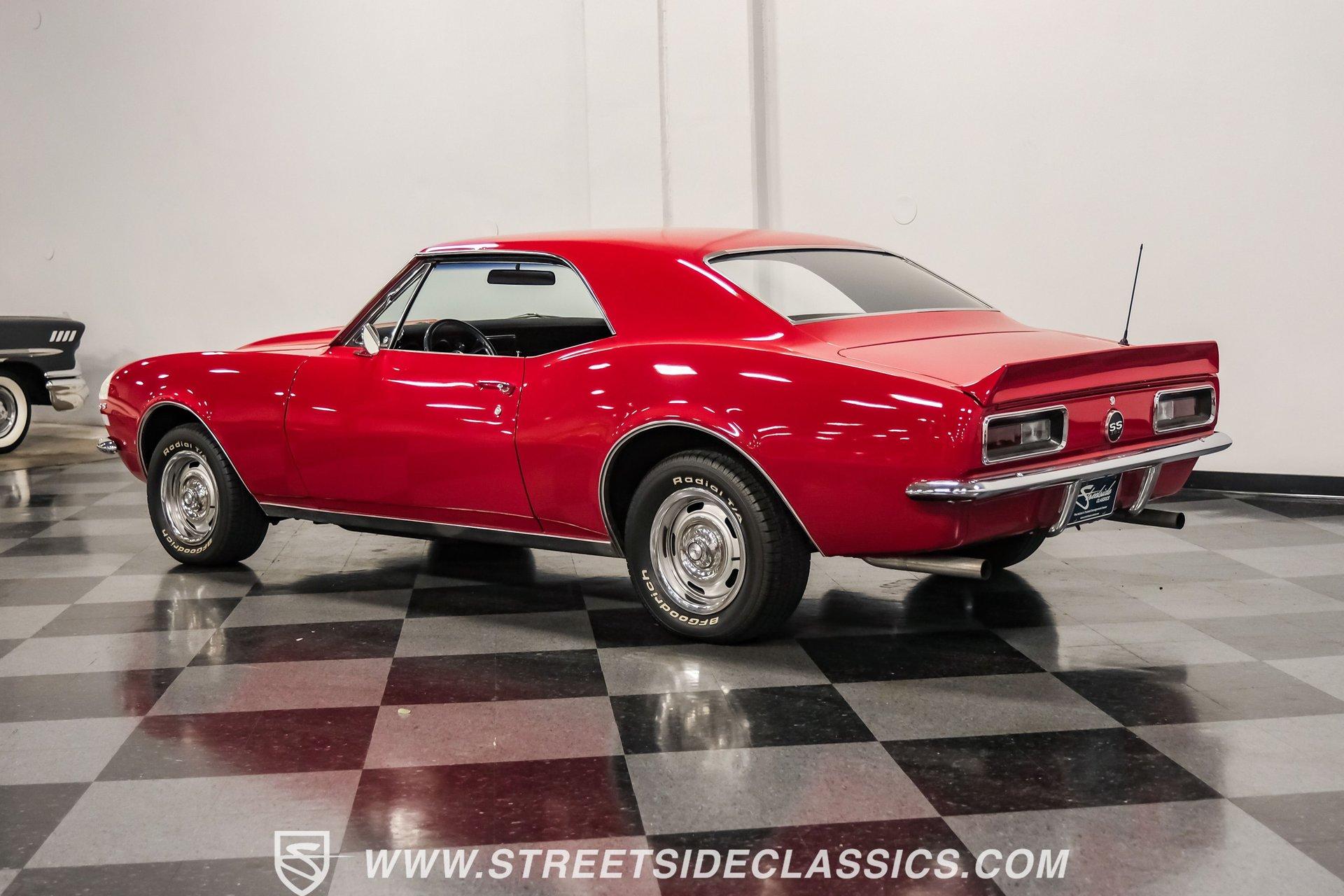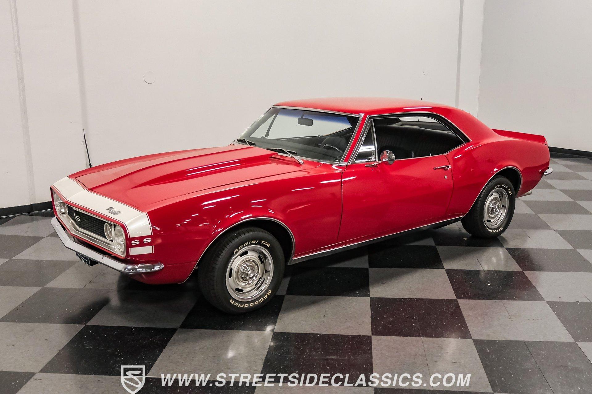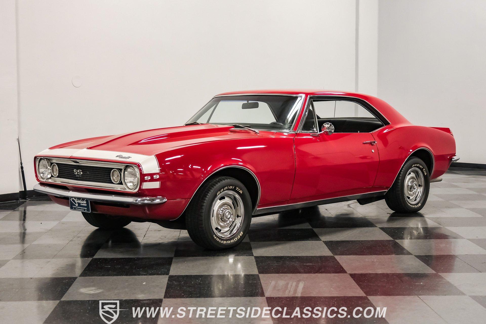 Kept by one family for 38 years, this 1967 Chevrolet Camaro SS Tribute displays a bold Bolero Red finish accented with crisp white painted stripes. The cowl hood adds muscle to the front end while completing the SS appearance package that makes first-generation Camaros so desirable. Chrome trim and SS badging throughout enhance the exterior's visual impact without overwhelming it. The 14" Rally wheels paired with 225/60R14 BFGoodrich tires give this Camaro its proper stance while the clean silhouette emphasizes its classic body lines. The black vinyl interior offers a pure performance aesthetic with bucket seats positioned for optimal control. The floor-mounted Hurst shifter connects to the Muncie 4-speed manual transmission for quick gear changes. A tilt steering column adds driver comfort while the Autogage cluster mounted below the dash provides additional vital information. The radio delete plate maintains the dash's clean layout, putting all focus on the driving experience. Black door panels and carpeting complete the factory-correct appearance throughout the cabin. A 350 cubic inch V8 engine gives this Camaro its go-fast credentials. The combination of a Holley intake and Quadrajet carburetor provides solid performance and throttle response. Dual exhaust with glasspack-style mufflers produces the aggressive sound that V8 enthusiasts crave. For added security, an ignition cut-off is cleverly hidden in the ashtray, while an electric cooling fan controlled by a dashboard toggle switch helps maintain optimal temperature. The 10-bolt rear axle with traction bars effectively transfers power to the ground, complemented by the coil spring front suspension. HIGHLIGHTS: 350 V8 Engine 4-Speed Muncie Manual Transmission Holley Intake Quadrajet Carburetor Dual Exhaust with Glasspack-Style Mufflers 10-Bolt Rear Axle Power Steering Bolero Red Paint w/ White Painted Stripes Cowl Hood SS Badging and Emblems 14" Rally Wheels 225/60R14 BFGoodrich Tires Black Vinyl Interior with Bucket Seats Hurst Shifter Tilt Steering Column Owner's Manual Some Miscellaneous Spare Parts First-generation Camaros rank among the most coveted American muscle cars ever made. With its powerful 350 V8, 4-speed manual, and authentic SS styling cues, this 1967 Camaro SS Tribute offers the classic muscle car experience that collectors and enthusiasts value. Call today!