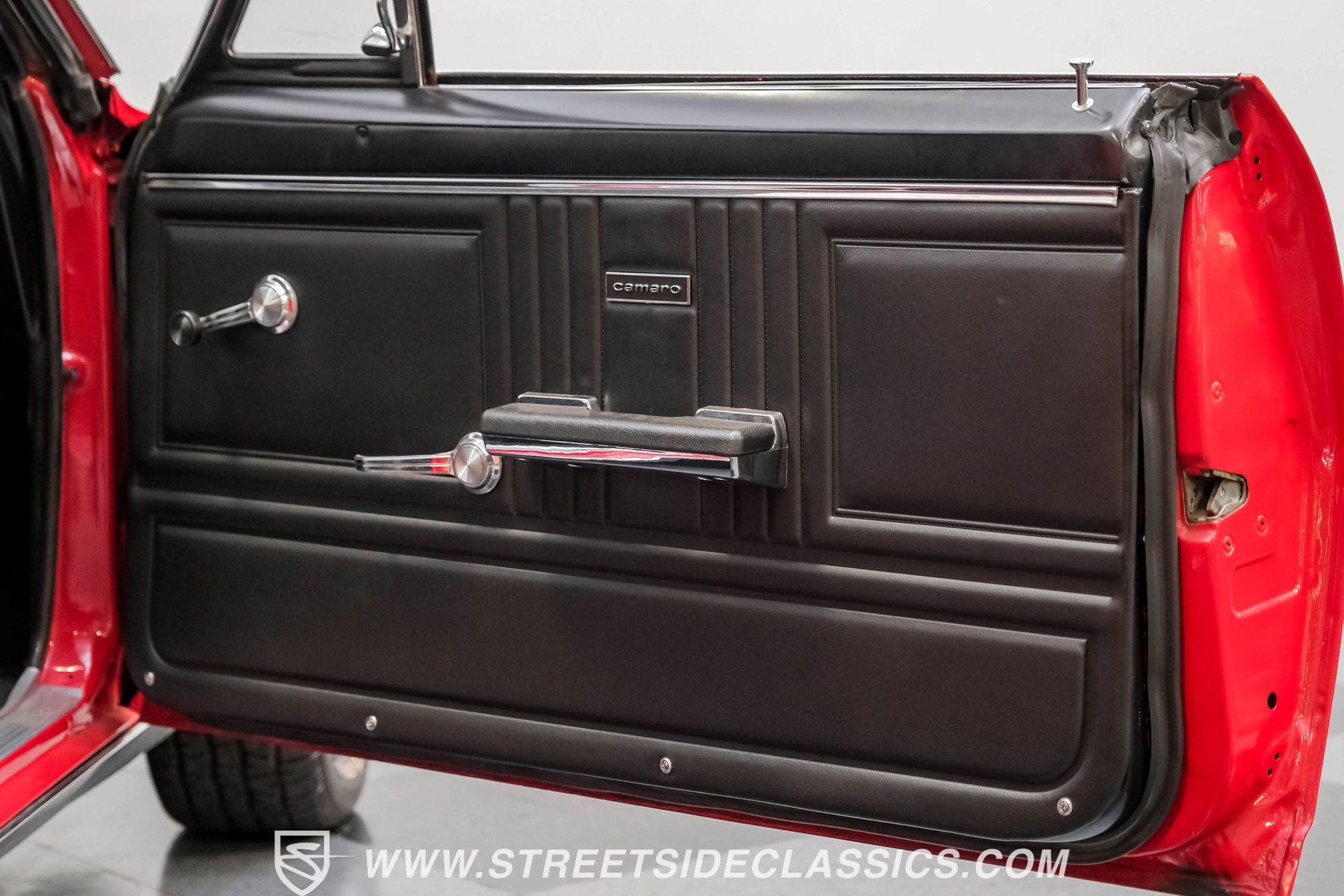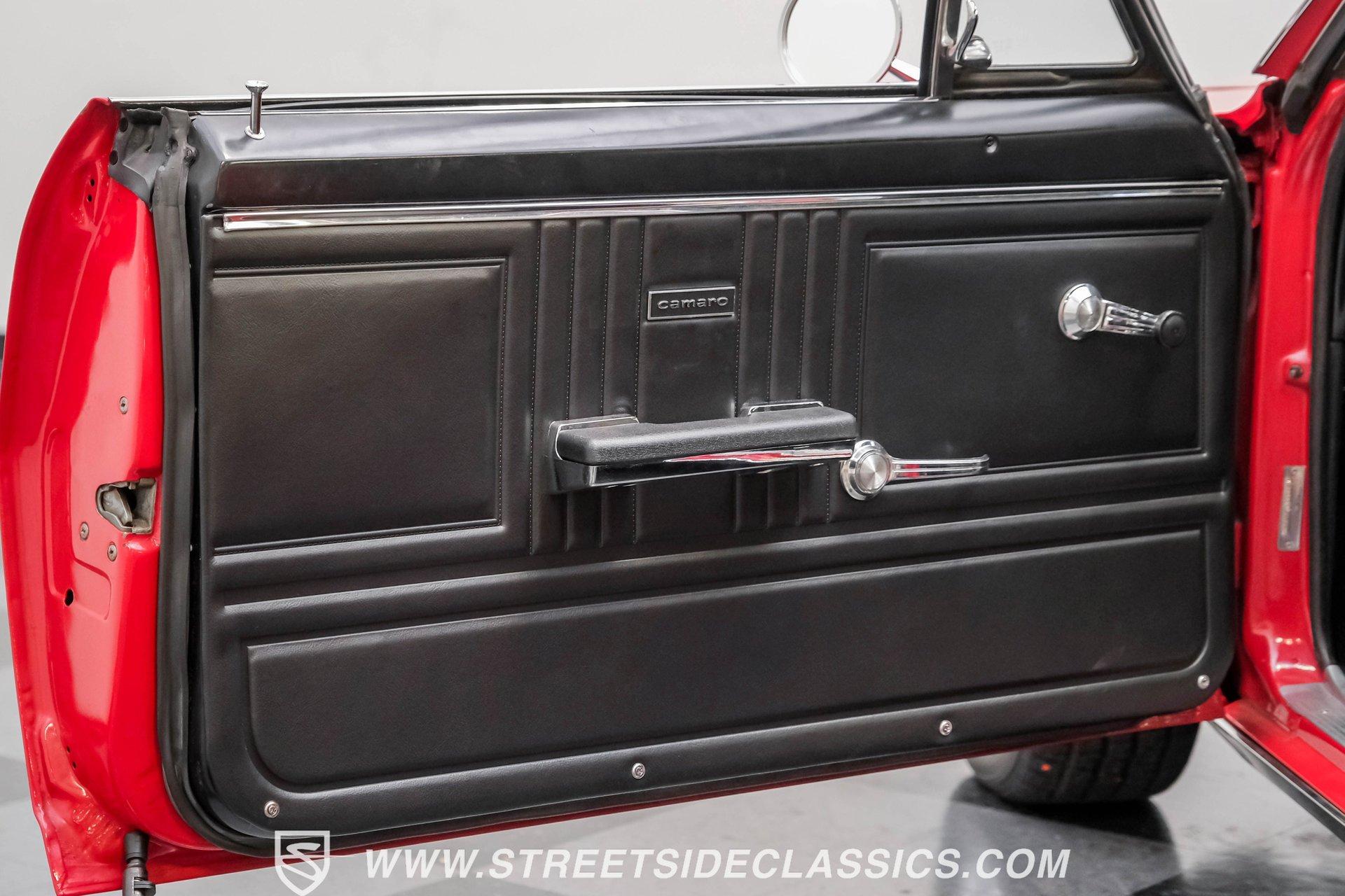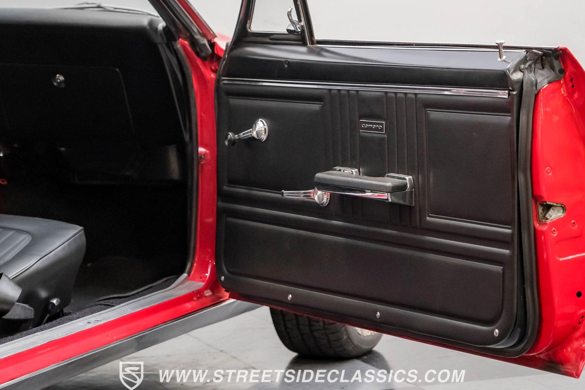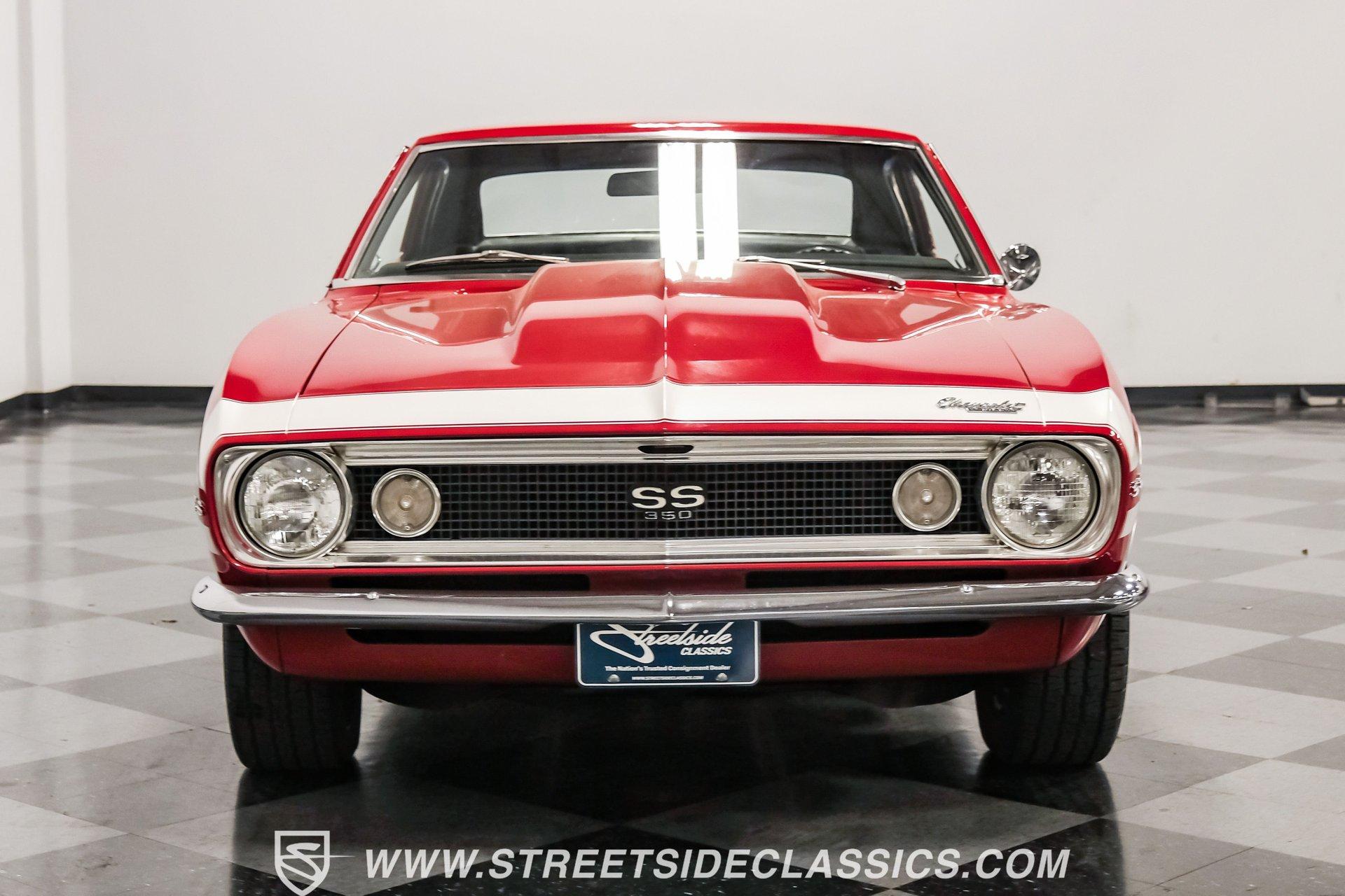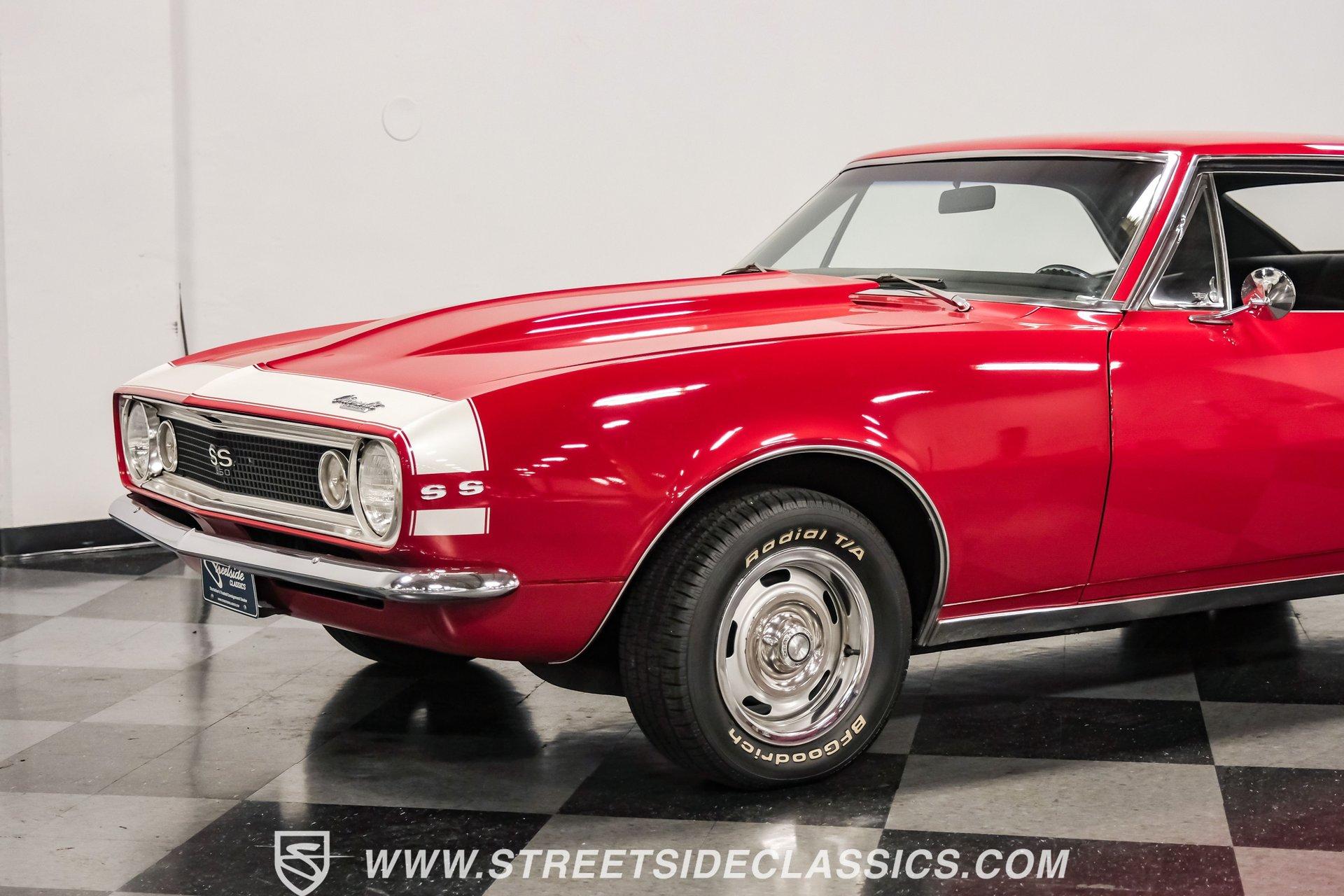 Kept by one family for 38 years, this 1967 Chevrolet Camaro SS Tribute displays a bold Bolero Red finish accented with crisp white painted stripes. The cowl hood adds muscle to the front end while completing the SS appearance package that makes first-generation Camaros so desirable. Chrome trim and SS badging throughout enhance the exterior's visual impact without overwhelming it. The 14" Rally wheels paired with 225/60R14 BFGoodrich tires give this Camaro its proper stance while the clean silhouette emphasizes its classic body lines. The black vinyl interior offers a pure performance aesthetic with bucket seats positioned for optimal control. The floor-mounted Hurst shifter connects to the Muncie 4-speed manual transmission for quick gear changes. A tilt steering column adds driver comfort while the Autogage cluster mounted below the dash provides additional vital information. The radio delete plate maintains the dash's clean layout, putting all focus on the driving experience. Black door panels and carpeting complete the factory-correct appearance throughout the cabin. A 350 cubic inch V8 engine gives this Camaro its go-fast credentials. The combination of a Holley intake and Quadrajet carburetor provides solid performance and throttle response. Dual exhaust with glasspack-style mufflers produces the aggressive sound that V8 enthusiasts crave. For added security, an ignition cut-off is cleverly hidden in the ashtray, while an electric cooling fan controlled by a dashboard toggle switch helps maintain optimal temperature. The 10-bolt rear axle with traction bars effectively transfers power to the ground, complemented by the coil spring front suspension. HIGHLIGHTS: 350 V8 Engine 4-Speed Muncie Manual Transmission Holley Intake Quadrajet Carburetor Dual Exhaust with Glasspack-Style Mufflers 10-Bolt Rear Axle Power Steering Bolero Red Paint w/ White Painted Stripes Cowl Hood SS Badging and Emblems 14" Rally Wheels 225/60R14 BFGoodrich Tires Black Vinyl Interior with Bucket Seats Hurst Shifter Tilt Steering Column Owner's Manual Some Miscellaneous Spare Parts First-generation Camaros rank among the most coveted American muscle cars ever made. With its powerful 350 V8, 4-speed manual, and authentic SS styling cues, this 1967 Camaro SS Tribute offers the classic muscle car experience that collectors and enthusiasts value. Call today!