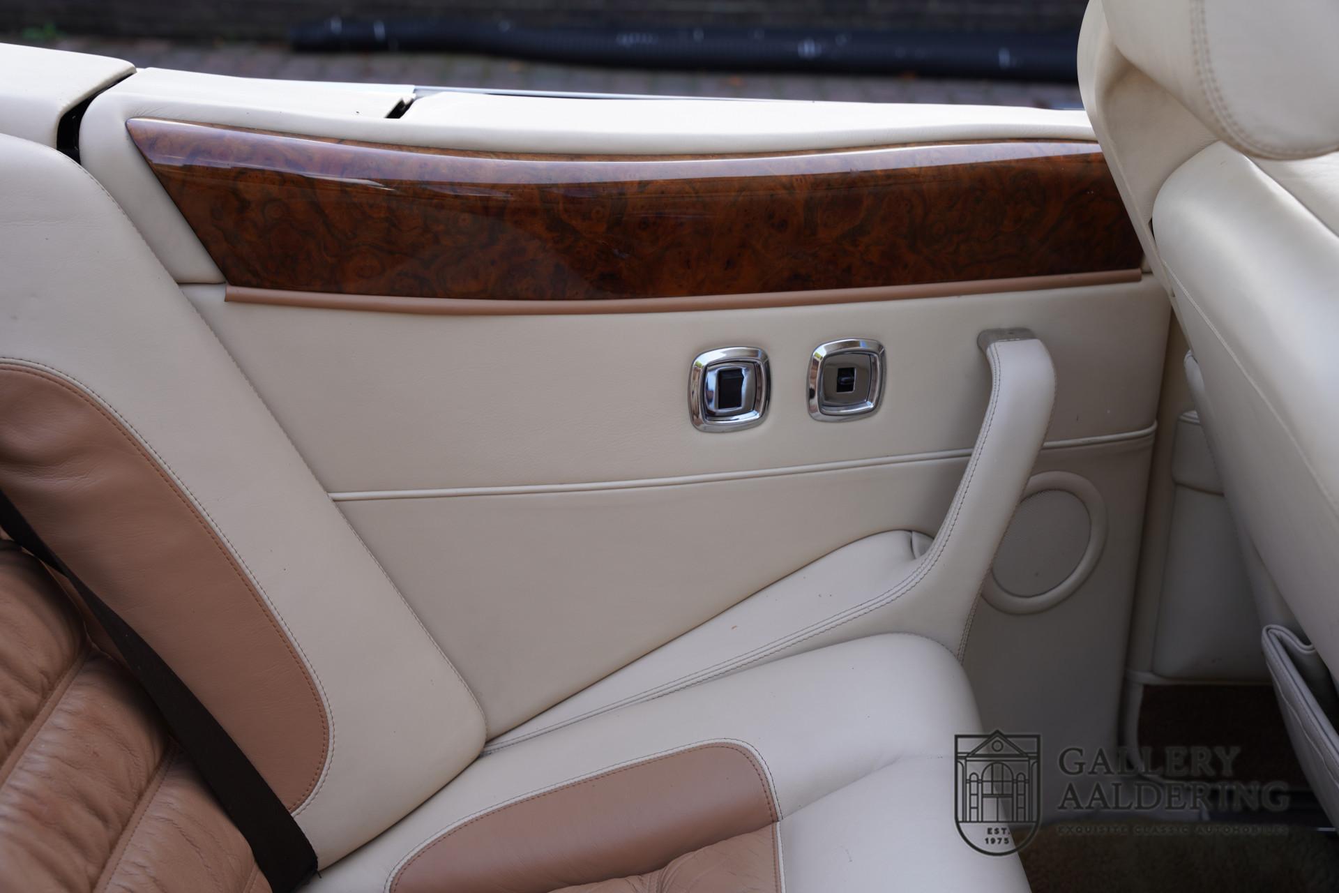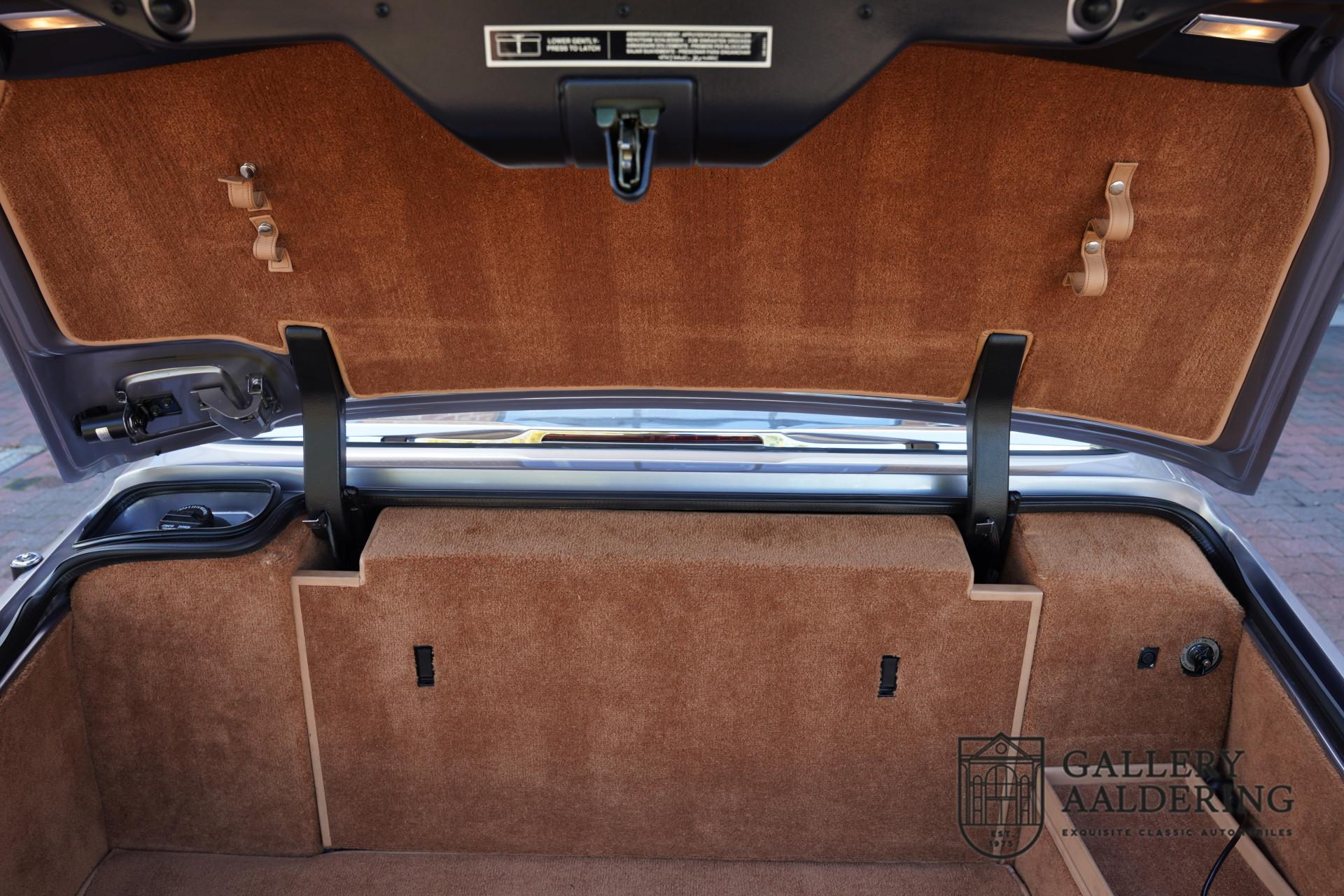 The beautiful two-tone interior also matches the mileage of 11,000. The dashboard, door panels, wool carpets, everything is in optimal condition. Only the leather upholstery of the seats shows signs it has been sat in, but nothing more than that. The wooden panels on the dashboard, center console, and door panels complete the picture: we fully understand why this model was known as the world's best convertible. What quality, what materials, what fit and finish! It's incredibly impressive how they managed to achieve this over 20 years ago. The extra-fast electrically operated convertible top has also seen little use over the years and is as beautiful as the rest of the car.