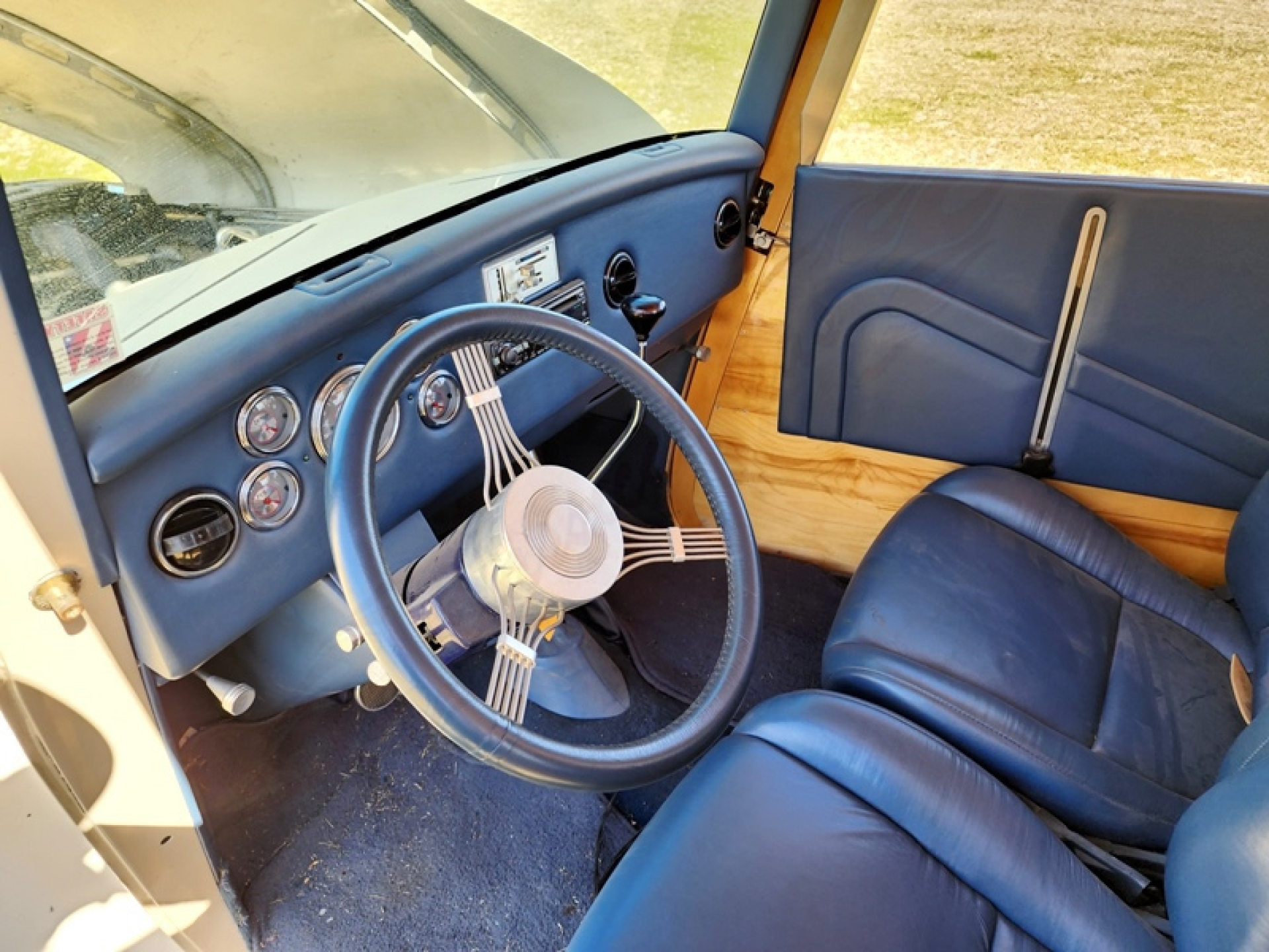 The interior was entirely redone in Blue upholstery that looks great. It has dual high back bucket seats up front and a full bench in rear. It has belts in place for all with the fronts being full retractable 3 point belts. The custom dash is all nicely upholstered as well and topped off with Boyds Classic Instrument gauges, adjustable vents, Vintage Air AC/Heat controls, and an Alpine AM/FM/CD player. A nice tilt column sits in front of the driver and fitted with a Banjo leather wrapped steering wheel. One of the prettiest parts of the car is actually hidden up above where you will note a beautiful exposed wood slat ceiling. In back the car has tons of storage space with a fully opening 2 piece rear gate.