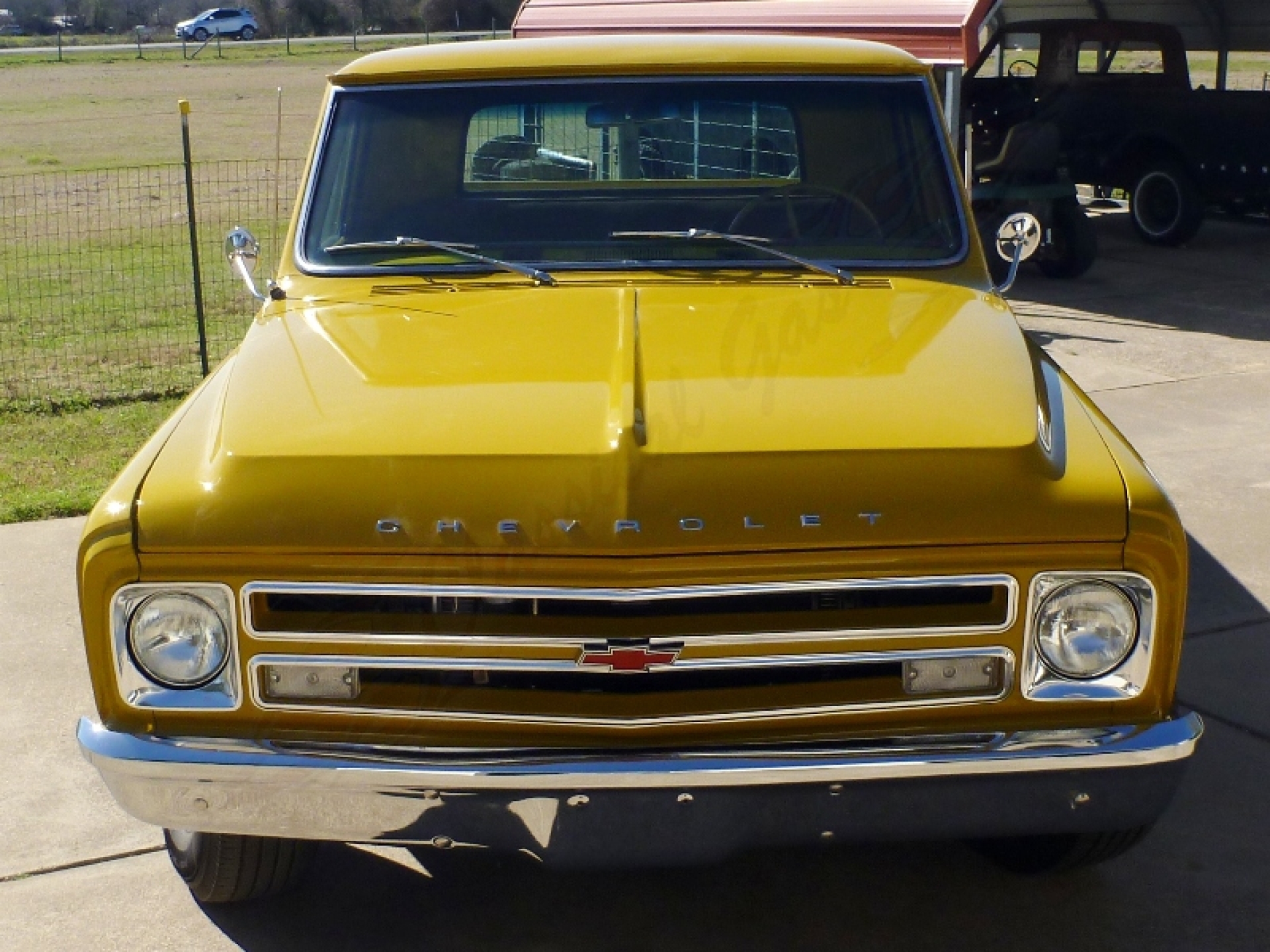 The C/K series of pickups was also known as the "Action Line" series. The goal for this series was to make the trucks more effective for personal use by incorporating more convenience features while still maintaining the durability and usefulness that a pickup provides. It is the second generation of the C/K trucks and the final year for the multiple rear window option. It saw a complete redesign and 1967 was the first year for it. This '67 is a shortbed Fleetside version and has just undergone a complete restoration. The body is very straight and all rust free. The paint is brand new and is the Ochre color applied to the 70 models. It has a beautiful finish and you can tell it is fresh. The chrome is in excellent condition throughout and the stock style front/rear bumpers are new and nicely mounted in place. Various grill designs were used throughout this generation of trucks and everyone has their favorite style but there is no denying the '67 has a great looking front end with the combo of paint and trim. All of the glass is in good shape and is all tinted. The bed has been entirely redone with new oak slats and new stainless steel strips. The truck has a great stance and the rides on very cool custom Black and Silver Moto Metal wheels with 245/75R16 tires.
