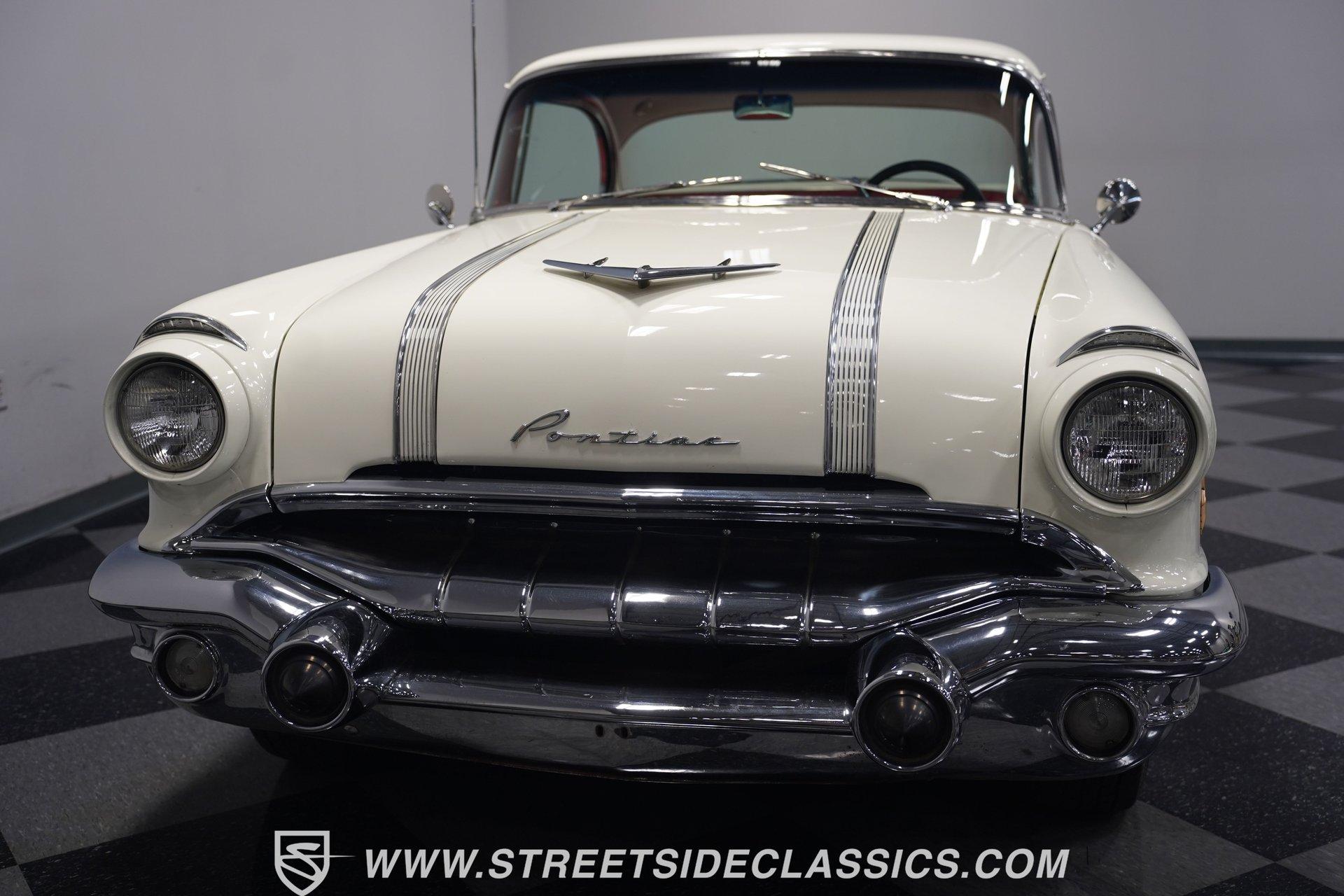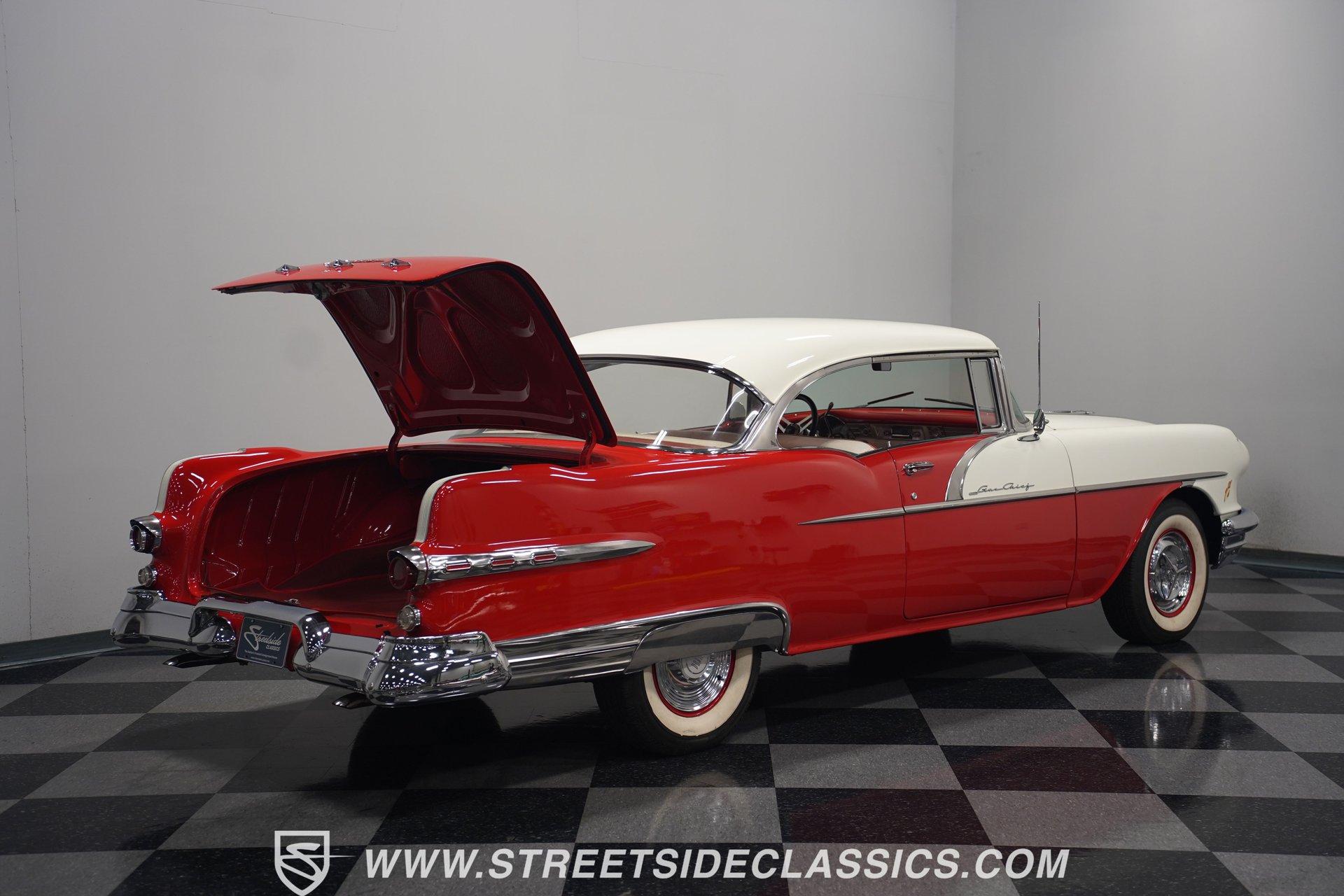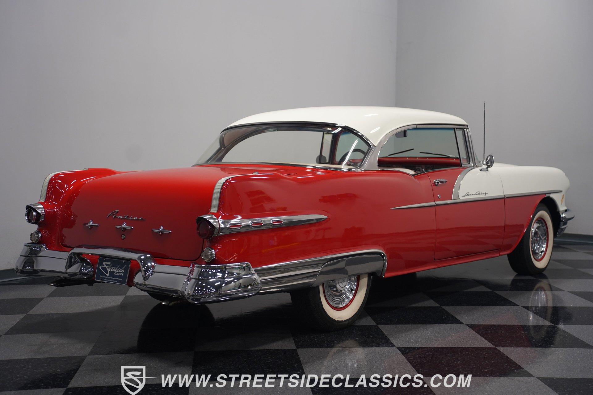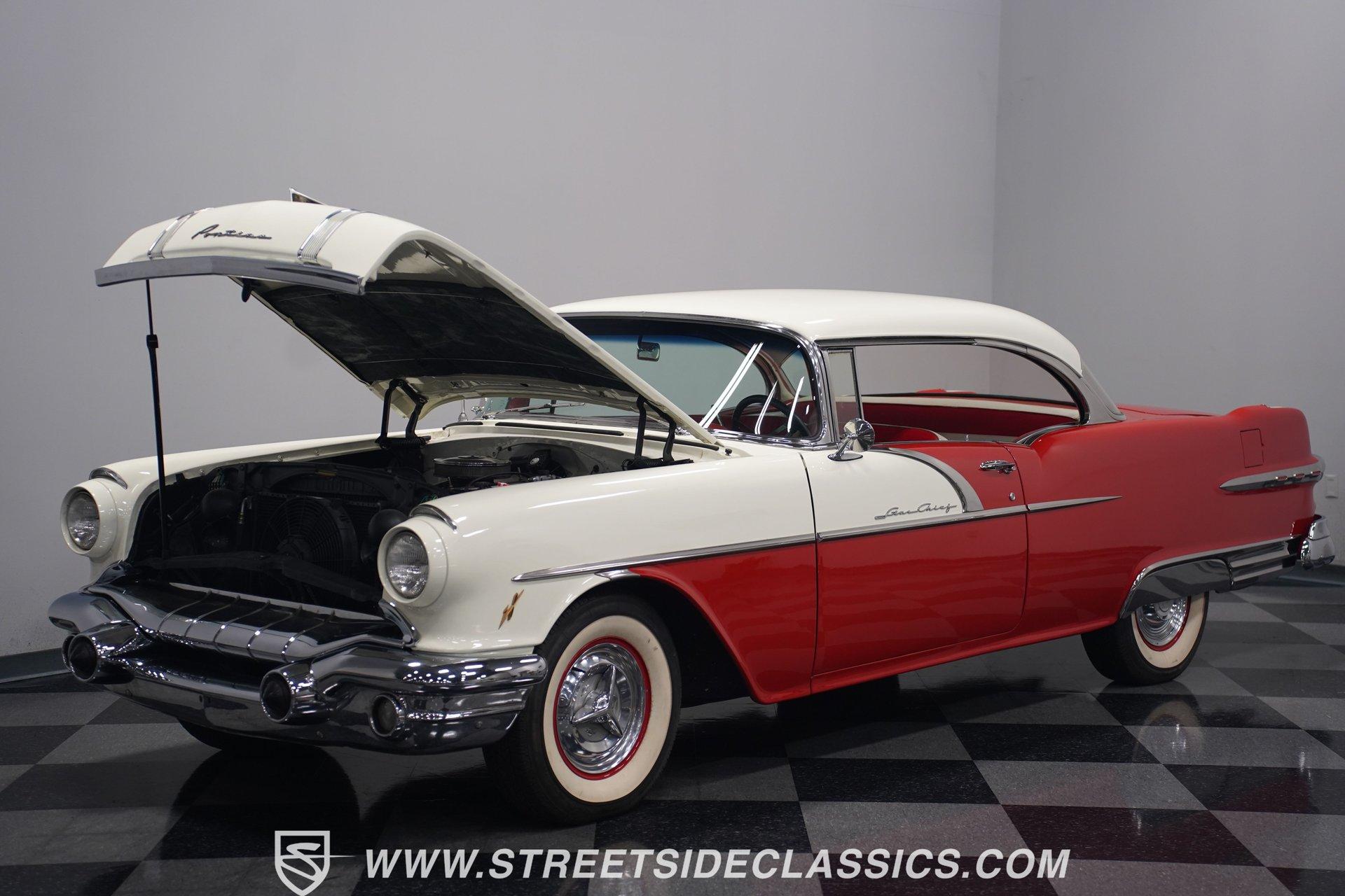 Once Pontiac's top-of-the-line model, the 1956 Star Chief wears a two-tone Bolero Red and White exterior that amplifies the car's grand dimensions. Long, flowing body lines run the length of this vehicle while abundant chrome trim decorates the sides, grille, and bumpers - hallmarks of 1950s American automotive styling. From the front to the back, this Star Chief has a solid presence with 15-inch wheels wrapped in P225/75R15 tires completing the classic profile. The well-appointed White vinyl interior matches the exterior theme with ample bench seating for comfortable cruising. An aftermarket steering wheel adds modern control while maintaining classic looks. For added comfort, this Star Chief comes equipped with power steering for light handling and air conditioning to beat the summer heat. Climate controls and vents have been added beneath the dash, and an AM radio remains in place for that authentic driving atmosphere. For propulsion, a 1974 Pontiac 400 V8 with ZH suffix code sits in the engine bay, connected to a TH400 3-speed automatic transmission. An Edelbrock 1411 single 4-barrel carburetor supplies the fuel mixture for optimal performance. The suspension features front coils with shocks and rear leaf springs paired with coilovers for a balanced ride. The dual exhaust system produces a deep tone while an electric pusher fan helps maintain proper operating temperatures. HIGHLIGHTS: 400 V8 Engine TH400 3-Speed Automatic Transmission Edelbrock 1411 Single 4-Barrel Carburetor Dual Exhaust System Electric Pusher Fan Drum Brakes Coil Springs with Shocks (Front) Leaf Springs & Coilovers (Rear) Bolero Red & White Two-Tone Paint 15" Wheels P225/75R15 Tires Chrome Trim White Interior with Bench Seats Power Steering Air Conditioning Tilt Steering Wheel AM Radio Aftermarket Climate Controls & Vents Column Shifter American automotive craftsmanship comes alive in this 1956 Pontiac Star Chief. With its impressive two-tone finish, luxurious interior, and powerful 400 V8 engine, this vehicle offers a unique blend of classic styling and enhanced performance that's increasingly hard to find today. Call today!