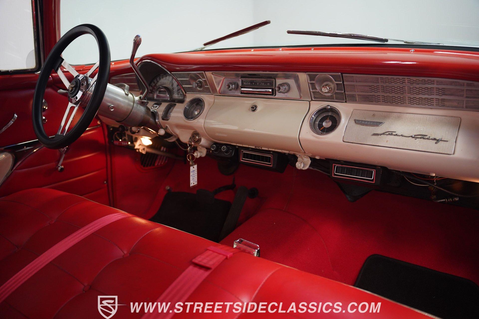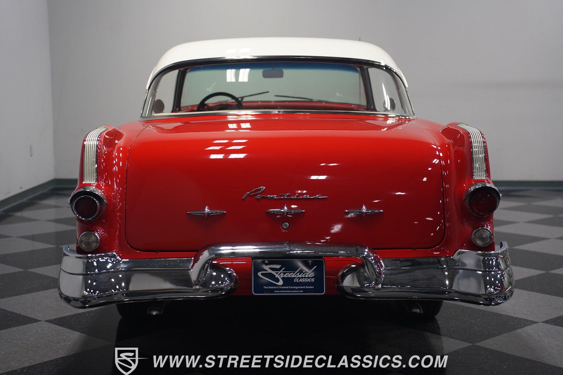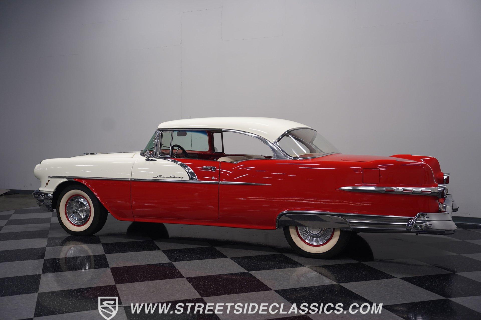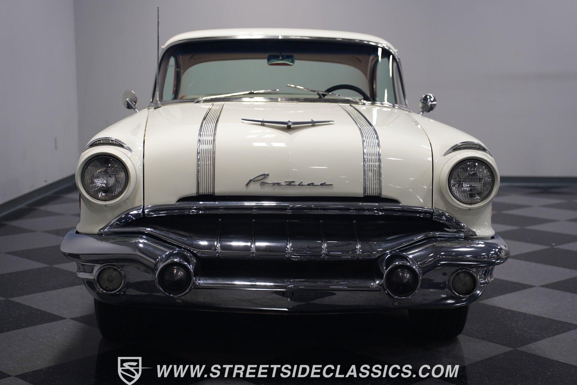 Once Pontiac's top-of-the-line model, the 1956 Star Chief wears a two-tone Bolero Red and White exterior that amplifies the car's grand dimensions. Long, flowing body lines run the length of this vehicle while abundant chrome trim decorates the sides, grille, and bumpers - hallmarks of 1950s American automotive styling. From the front to the back, this Star Chief has a solid presence with 15-inch wheels wrapped in P225/75R15 tires completing the classic profile. The well-appointed White vinyl interior matches the exterior theme with ample bench seating for comfortable cruising. An aftermarket steering wheel adds modern control while maintaining classic looks. For added comfort, this Star Chief comes equipped with power steering for light handling and air conditioning to beat the summer heat. Climate controls and vents have been added beneath the dash, and an AM radio remains in place for that authentic driving atmosphere. For propulsion, a 1974 Pontiac 400 V8 with ZH suffix code sits in the engine bay, connected to a TH400 3-speed automatic transmission. An Edelbrock 1411 single 4-barrel carburetor supplies the fuel mixture for optimal performance. The suspension features front coils with shocks and rear leaf springs paired with coilovers for a balanced ride. The dual exhaust system produces a deep tone while an electric pusher fan helps maintain proper operating temperatures. HIGHLIGHTS: 400 V8 Engine TH400 3-Speed Automatic Transmission Edelbrock 1411 Single 4-Barrel Carburetor Dual Exhaust System Electric Pusher Fan Drum Brakes Coil Springs with Shocks (Front) Leaf Springs & Coilovers (Rear) Bolero Red & White Two-Tone Paint 15" Wheels P225/75R15 Tires Chrome Trim White Interior with Bench Seats Power Steering Air Conditioning Tilt Steering Wheel AM Radio Aftermarket Climate Controls & Vents Column Shifter American automotive craftsmanship comes alive in this 1956 Pontiac Star Chief. With its impressive two-tone finish, luxurious interior, and powerful 400 V8 engine, this vehicle offers a unique blend of classic styling and enhanced performance that's increasingly hard to find today. Call today!