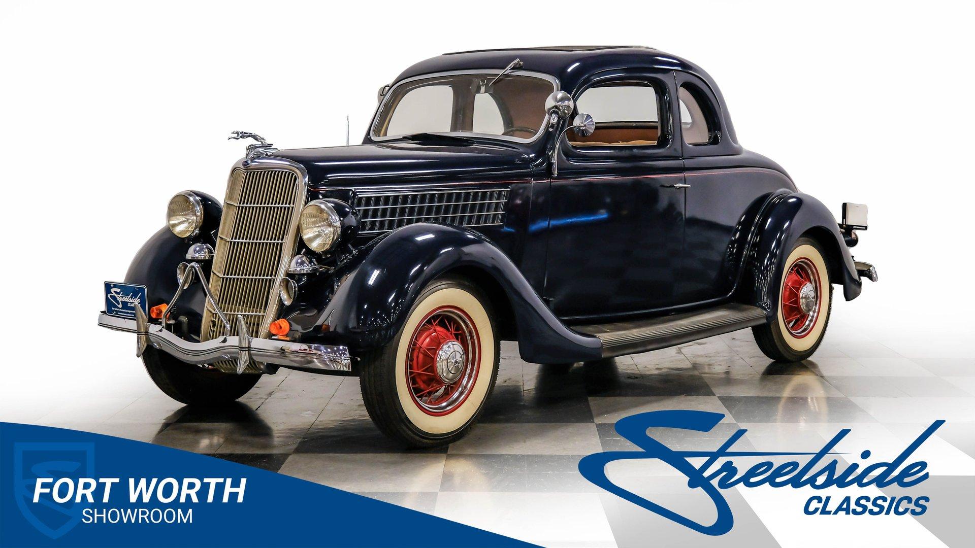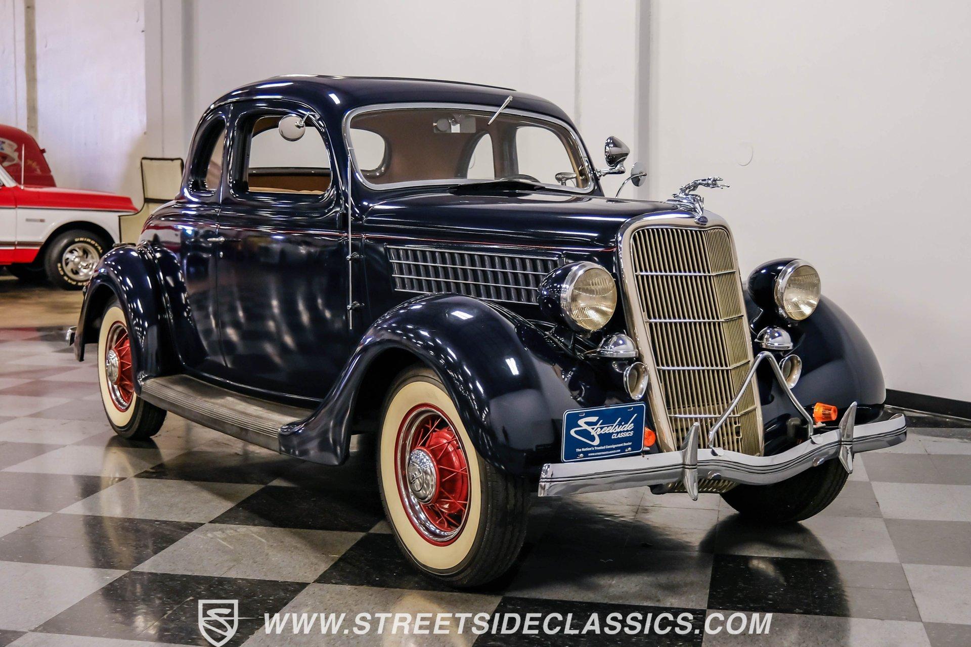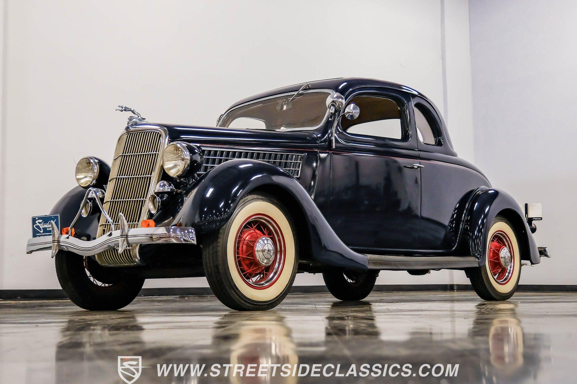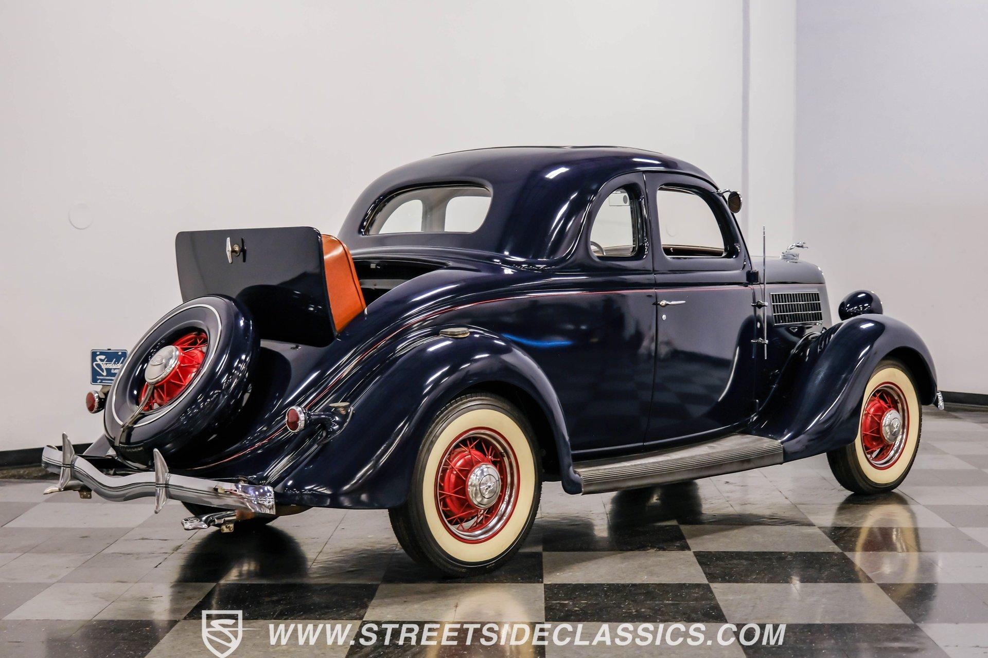 Rare and sought-after, this 1935 Ford 5-Window Rumble Seat Coupe comes finished in Dark Blue with red pinstriping. The roll-down rear window allows for easy communication with passengers seated in the back - an ingenious design feature from the era. Red-painted 16" wire wheels contrast nicely against the blue exterior while 6.00R16 Coker Classic whitewall tires complete the authentic pre-war look. The vinyl roof insert remains in good condition, and the driver's side spotlight adds a touch of period-correct detail to this all steel classic Ford's silhouette. Tan cloth covers the bench seat and door panels, creating a warm, inviting interior space. The stock dashboard houses original gauges and a custom shifter knob tops the floor-mounted transmission lever, adding a personalized element to the driving experience. The rearview mirror contains an integrated clock - a clever factory touch from Ford's engineers. For improved safety in today's traffic, an aftermarket turn signal lever has been added without compromising the original interior aesthetic. The 221 Flathead V8 engine provides ample power through a 3-speed manual transmission. A single-barrel carburetor manages fuel delivery while dual glasspack-style exhaust produces the unmistakable sound that made these engines famous. Mono leaf springs support both front and rear suspension, while drum brakes handle stopping duties. HIGHLIGHTS: 221 Flathead V8 Engine 3-Speed Manual Transmission Dual Glasspack-Style Exhaust 12-Volt Electrical System Conversion Newer Gas Tank Dark Blue Paint with Red Pinstriping 16" Wire Wheels with Red Paint 6.00R16 Coker Classic Whitewall Tires Rumble Seat Tan Interior with Bench Seat Stock Dash with Original Gauges Stock Steering Wheel Clock in Rearview Mirror Aftermarket Turn Signal Lever Car Cover Owner's Manual Offering authentic pre-war American automobile engineering, this 1935 Ford combines the desirable 5-Window Coupe body style with the practical rumble seat configuration. The flathead V8 engine, classic styling, and upgraded 12V electrical system make this a drivable piece of automotive craftsmanship. Call today!
