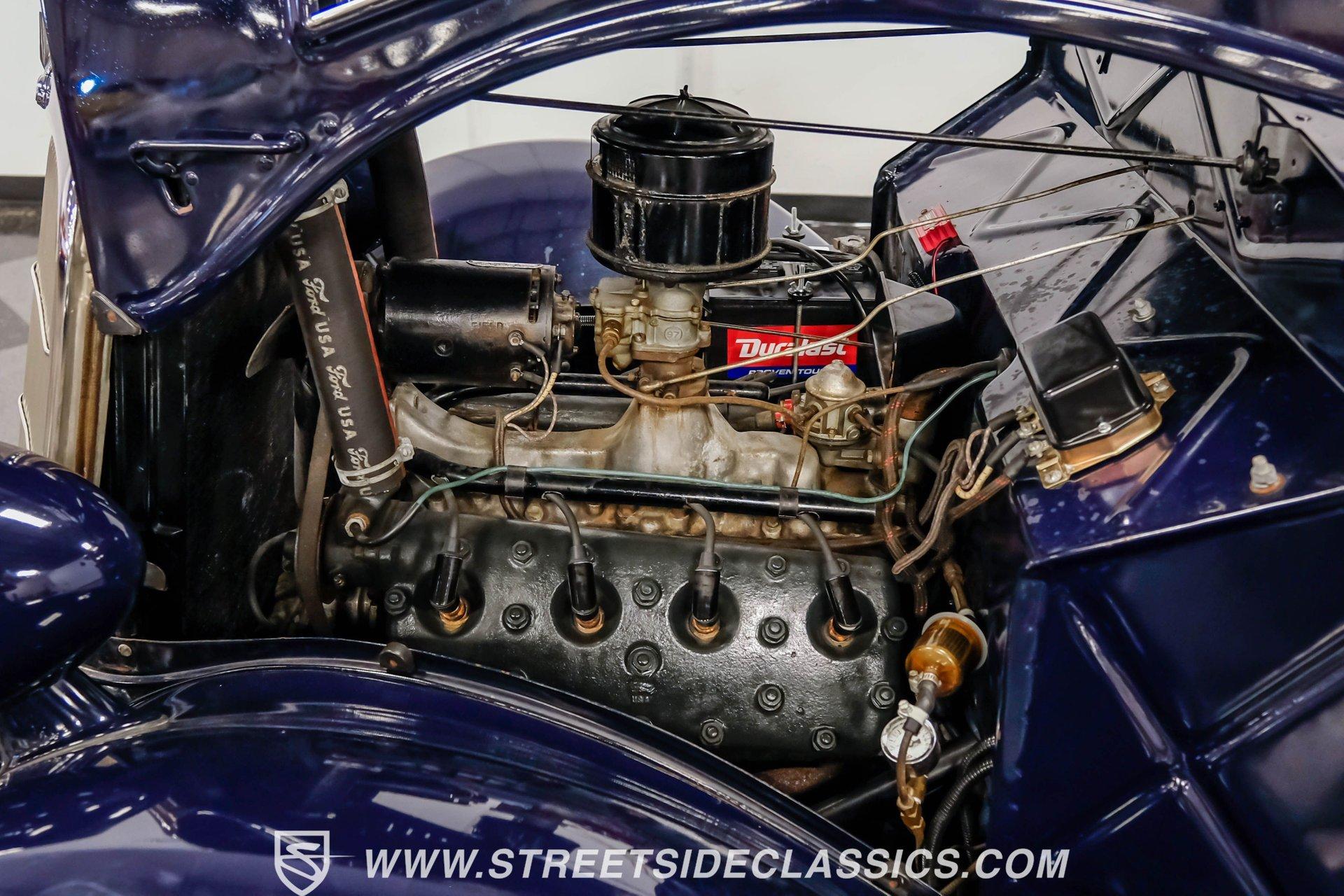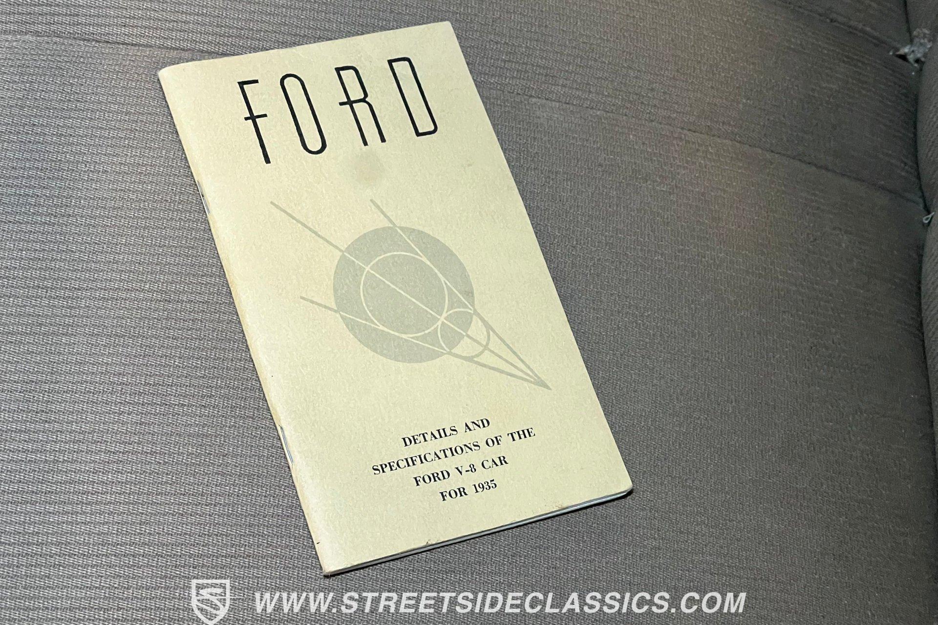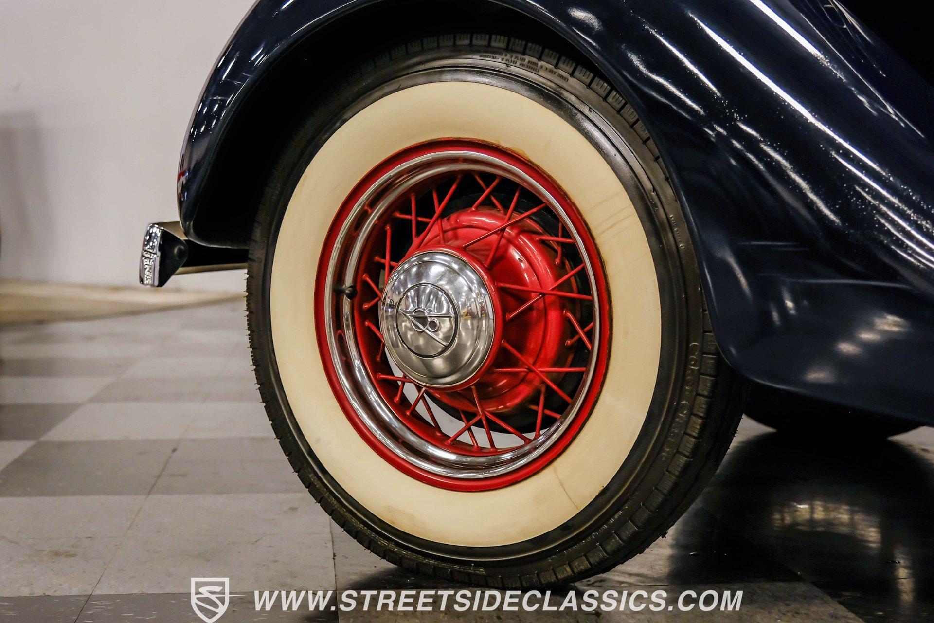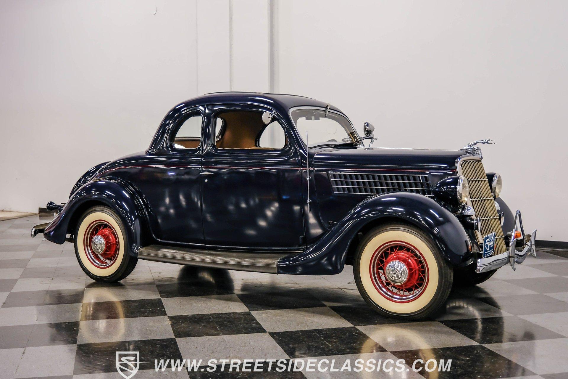 Rare and sought-after, this 1935 Ford 5-Window Rumble Seat Coupe comes finished in Dark Blue with red pinstriping. The roll-down rear window allows for easy communication with passengers seated in the back - an ingenious design feature from the era. Red-painted 16" wire wheels contrast nicely against the blue exterior while 6.00R16 Coker Classic whitewall tires complete the authentic pre-war look. The vinyl roof insert remains in good condition, and the driver's side spotlight adds a touch of period-correct detail to this all steel classic Ford's silhouette. Tan cloth covers the bench seat and door panels, creating a warm, inviting interior space. The stock dashboard houses original gauges and a custom shifter knob tops the floor-mounted transmission lever, adding a personalized element to the driving experience. The rearview mirror contains an integrated clock - a clever factory touch from Ford's engineers. For improved safety in today's traffic, an aftermarket turn signal lever has been added without compromising the original interior aesthetic. The 221 Flathead V8 engine provides ample power through a 3-speed manual transmission. A single-barrel carburetor manages fuel delivery while dual glasspack-style exhaust produces the unmistakable sound that made these engines famous. Mono leaf springs support both front and rear suspension, while drum brakes handle stopping duties. HIGHLIGHTS: 221 Flathead V8 Engine 3-Speed Manual Transmission Dual Glasspack-Style Exhaust 12-Volt Electrical System Conversion Newer Gas Tank Dark Blue Paint with Red Pinstriping 16" Wire Wheels with Red Paint 6.00R16 Coker Classic Whitewall Tires Rumble Seat Tan Interior with Bench Seat Stock Dash with Original Gauges Stock Steering Wheel Clock in Rearview Mirror Aftermarket Turn Signal Lever Car Cover Owner's Manual Offering authentic pre-war American automobile engineering, this 1935 Ford combines the desirable 5-Window Coupe body style with the practical rumble seat configuration. The flathead V8 engine, classic styling, and upgraded 12V electrical system make this a drivable piece of automotive craftsmanship. Call today!