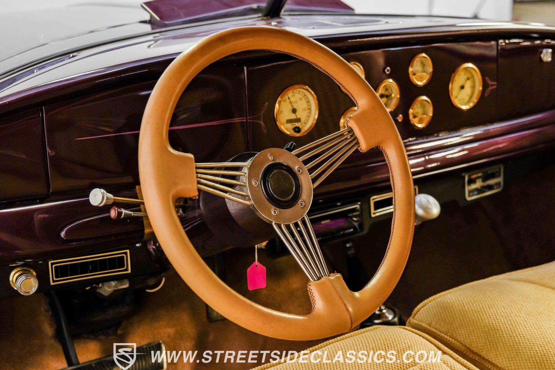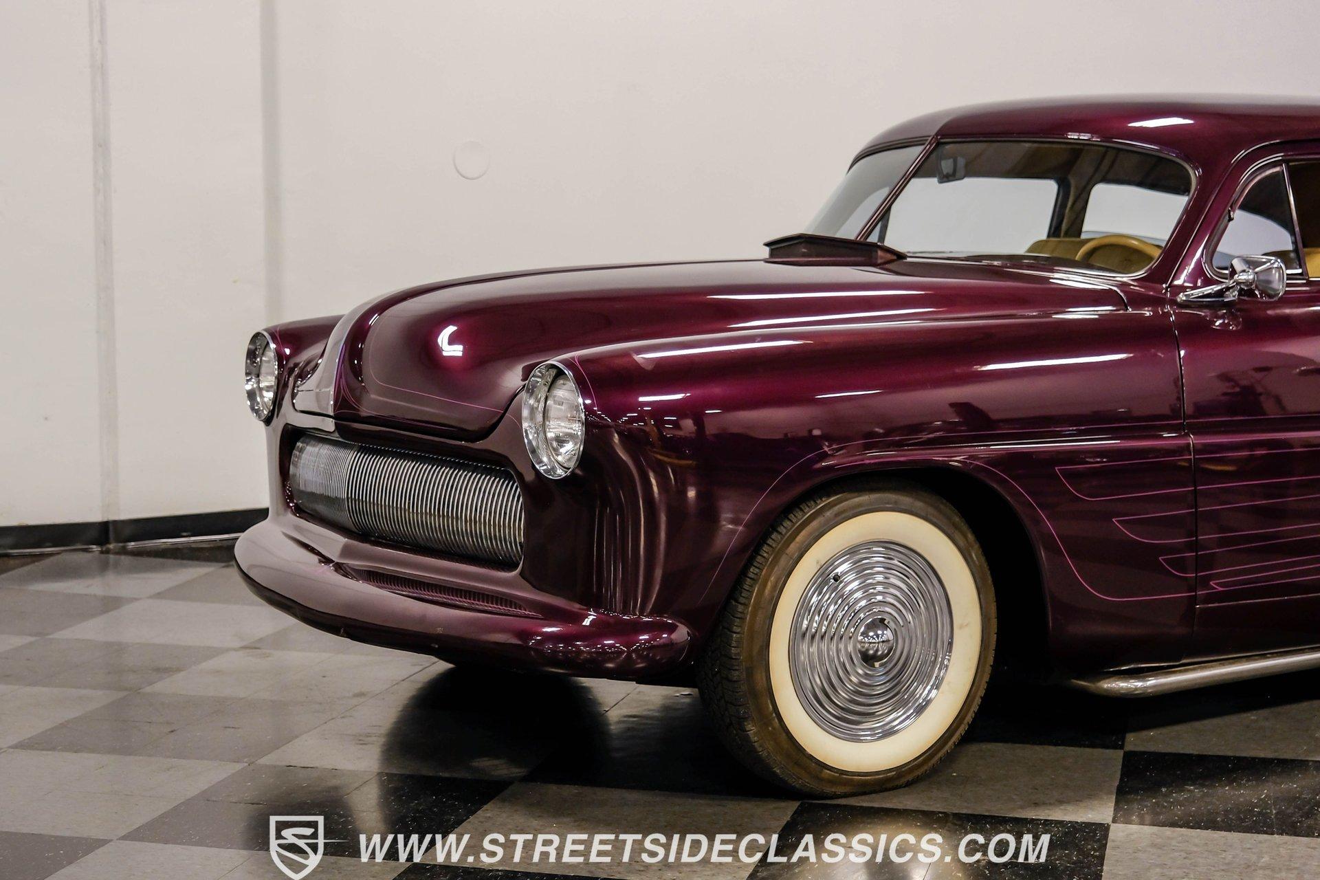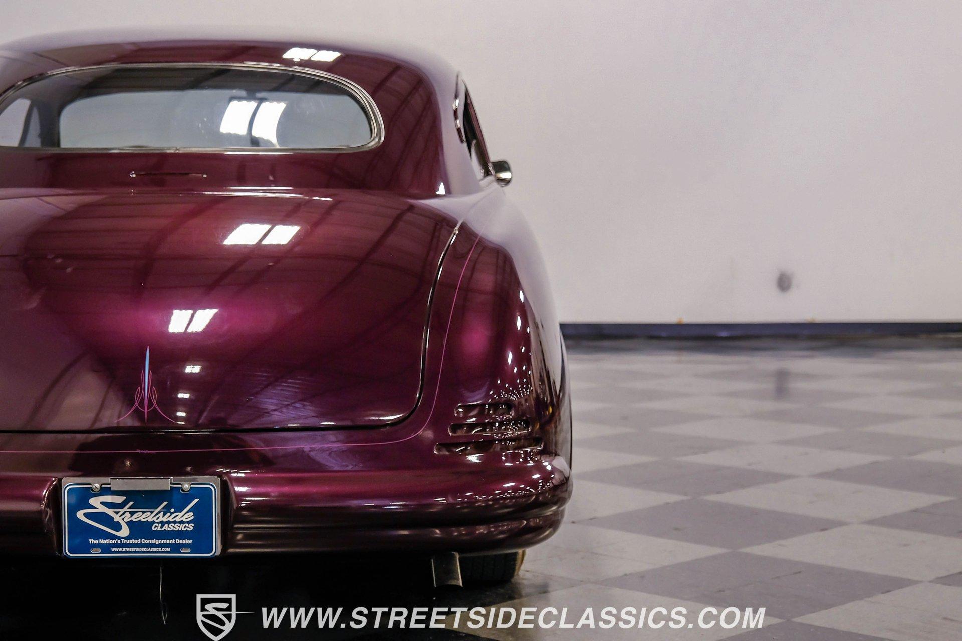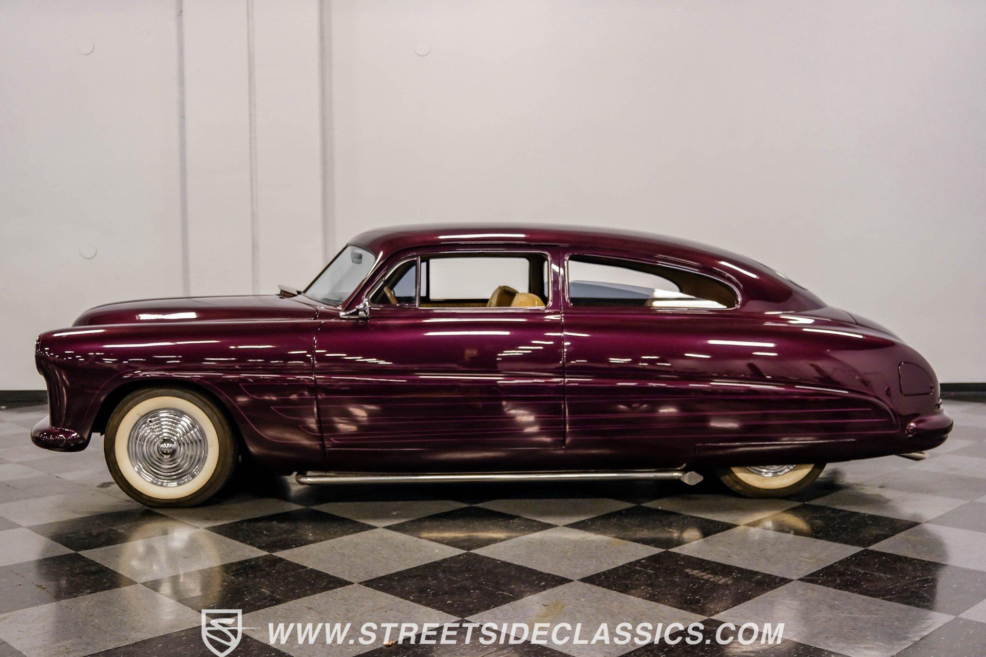 This 1949 Hudson Super 6 Brougham get's the full Lead Sled treatment resulting in extensive bodywork that transforms it original profile into an even sleeker appearance. Covered in PPG's Huckleberry (dark purple) paint with accenting pinstripes, the metalwork includes frenched headlights, a 1957 Buick grille, front and rear roll pans, and shaved hood, trunk, and door handles with electric openers. Custom tail lights complete the transformed exterior, while 15" wheels wrapped in 205/75R15 Coker Classic tires provide the proper stance. Inside, the tan cloth interior combines custom tweed upholstery with practical comfort throughout the cabin. A split bench with power driver seat combines with custom door panels and a suede headliner, while the painted dash houses VDO gauges which complement the overall color scheme. Pioneer AM/FM/CD player with auxiliary input and remote control handles the entertainment, while the Lokar floor shifter manages gear changes and air conditioning keeps things comfortable during warmer drives. Power comes from a transplanted 472 cubic inch Cadillac V8 engine paired with a TH400 3-speed automatic transmission. The Edelbrock 4-barrel carburetor feeds the V8, while chrome valve covers and a painted vintage Cadillac breather dress up the engine bay. An aluminum radiator handles cooling duties, and dual exhaust with aftermarket mufflers provides the soundtrack. Power steering makes maneuvering easy and power drum brakes front and rear handle stopping duties, with power assist for easier pedal effort. Coil spring front suspension with shocks and sway bar teams with a solid rear axle featuring leaf springs and shocks. HIGHLIGHTS: 472 Cubic Inch Cadillac V8 Engine TH400 3-Speed Automatic Transmission Edelbrock 4-Barrel Carburetor Aluminum Radiator Dual Exhaust with Aftermarket Mufflers Power Steering Power Drum Brakes Ford 8" Rear Axle PPG Huckleberry Paint with Pinstriping Frenched Headlights 1957 Buick Grille Front and Rear Roll Pans Shaved Hood, Trunk, and Door Handles Electric Door and Trunk Openers 15" Wheels with 205/75R15 Coker Classic Tires Tan Custom Cloth Interior Power Driver's Seat VDO Gauges Pioneer AM/FM/CD Player with Auxiliary Input and Remote Air Conditioning Restoration Photos Custom lead sled builds like this 1949 Hudson deliver serious street appeal with their extensive bodywork and modern drivetrain upgrades. The 472 Cadillac V8 provides reliable power, while the custom interior and exterior modifications create a unique ride that stands apart from typical restorations. Call today!