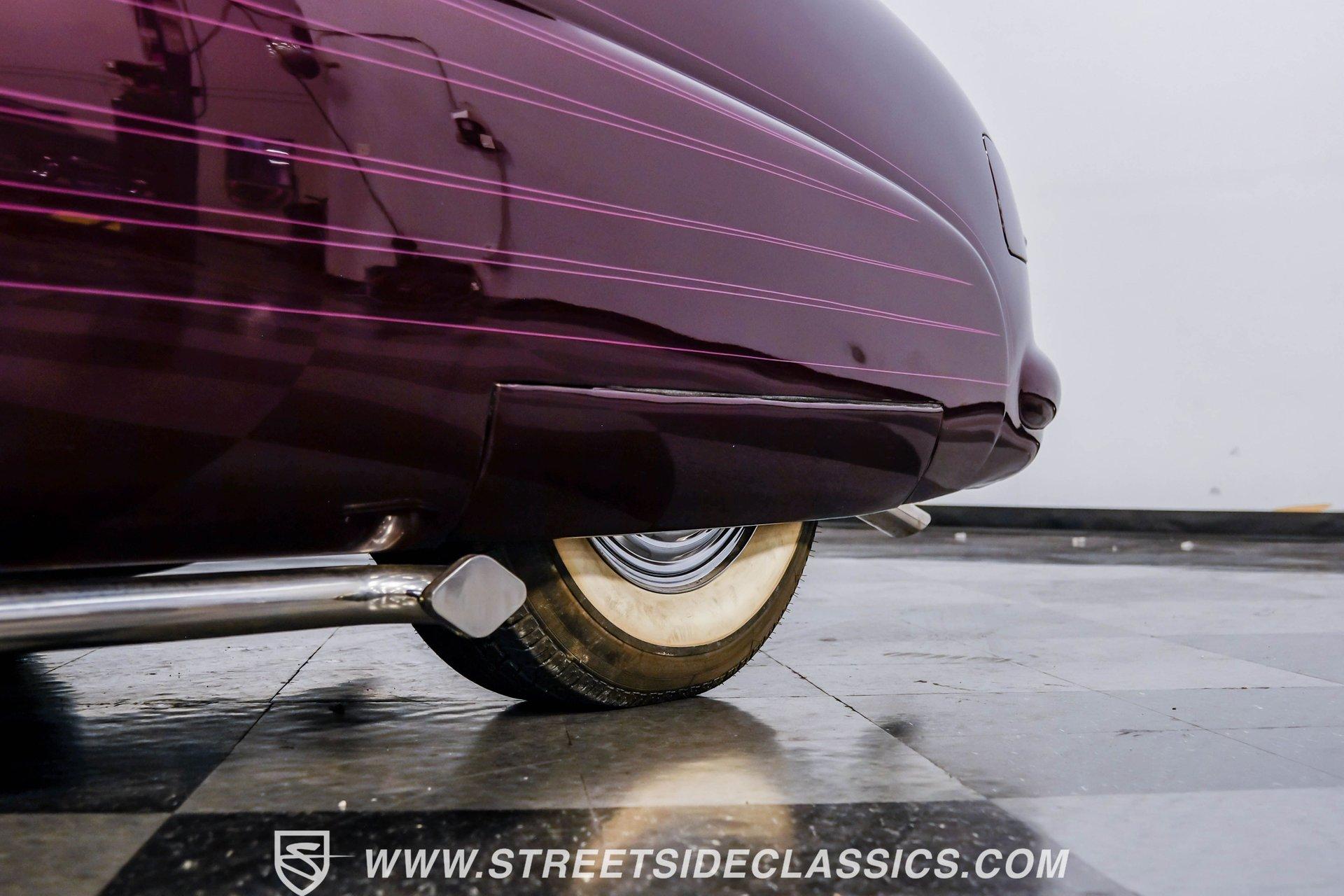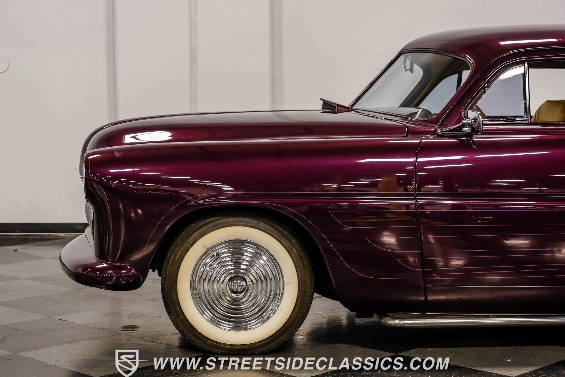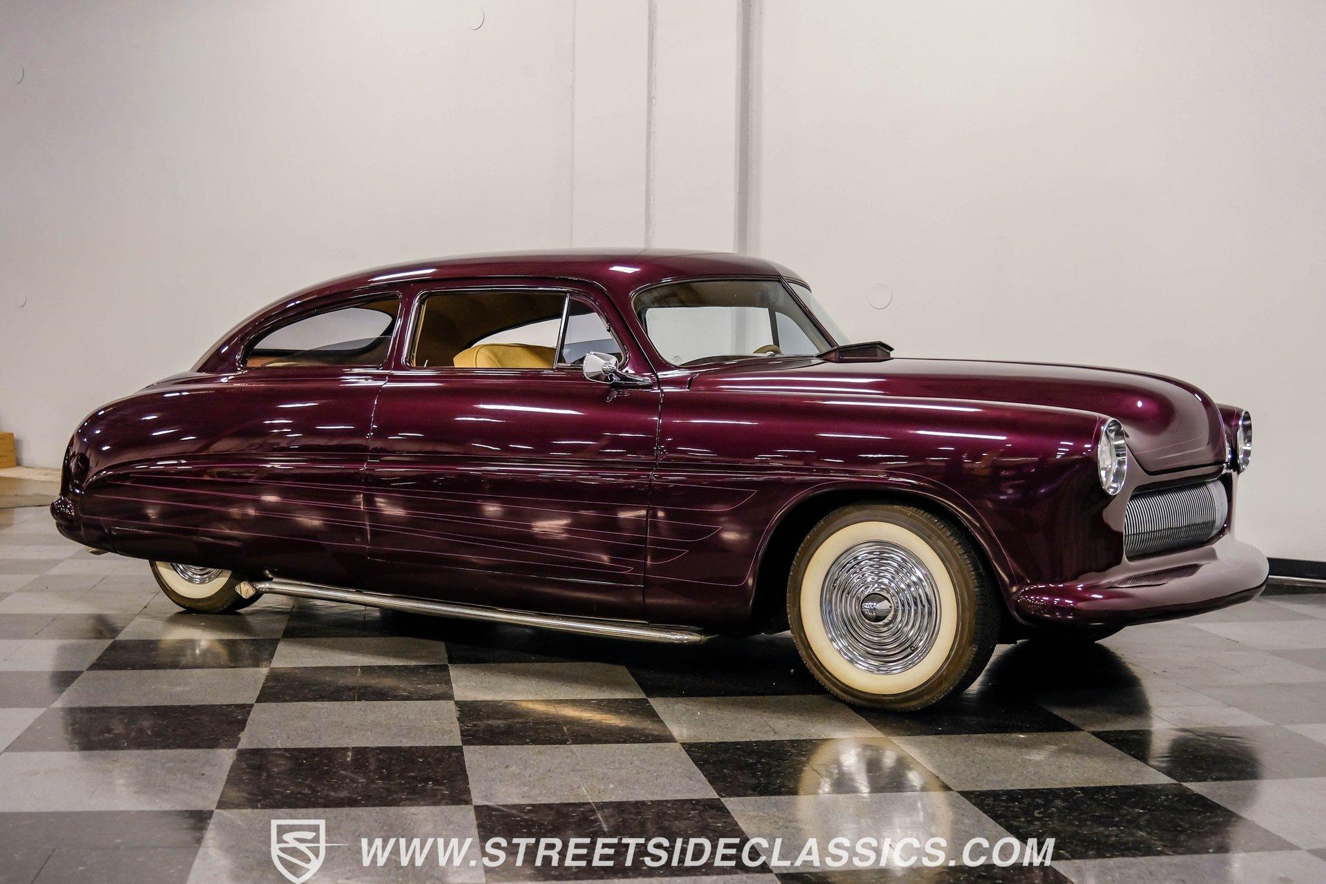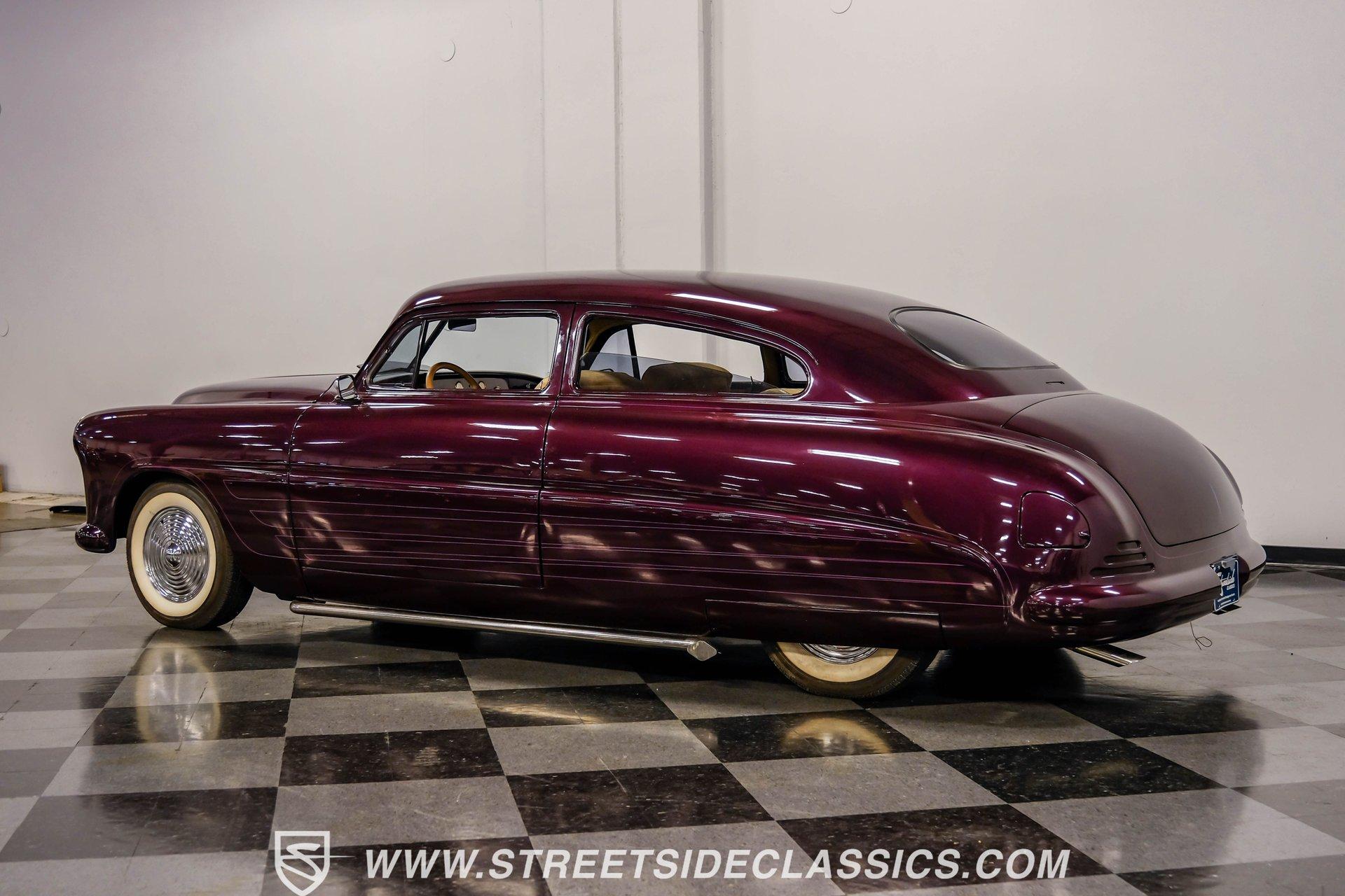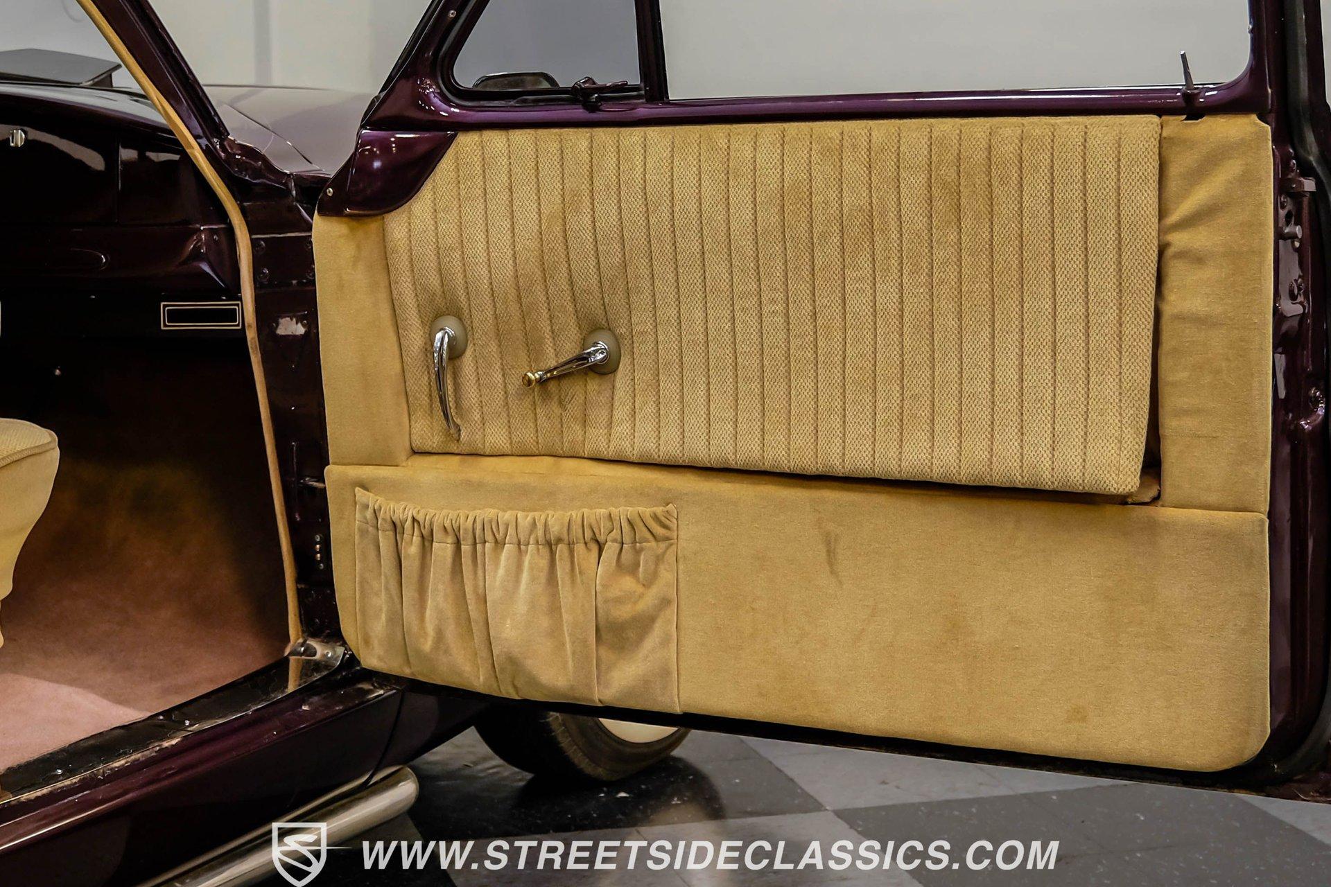 This 1949 Hudson Super 6 Brougham get's the full Lead Sled treatment resulting in extensive bodywork that transforms it original profile into an even sleeker appearance. Covered in PPG's Huckleberry (dark purple) paint with accenting pinstripes, the metalwork includes frenched headlights, a 1957 Buick grille, front and rear roll pans, and shaved hood, trunk, and door handles with electric openers. Custom tail lights complete the transformed exterior, while 15" wheels wrapped in 205/75R15 Coker Classic tires provide the proper stance. Inside, the tan cloth interior combines custom tweed upholstery with practical comfort throughout the cabin. A split bench with power driver seat combines with custom door panels and a suede headliner, while the painted dash houses VDO gauges which complement the overall color scheme. Pioneer AM/FM/CD player with auxiliary input and remote control handles the entertainment, while the Lokar floor shifter manages gear changes and air conditioning keeps things comfortable during warmer drives. Power comes from a transplanted 472 cubic inch Cadillac V8 engine paired with a TH400 3-speed automatic transmission. The Edelbrock 4-barrel carburetor feeds the V8, while chrome valve covers and a painted vintage Cadillac breather dress up the engine bay. An aluminum radiator handles cooling duties, and dual exhaust with aftermarket mufflers provides the soundtrack. Power steering makes maneuvering easy and power drum brakes front and rear handle stopping duties, with power assist for easier pedal effort. Coil spring front suspension with shocks and sway bar teams with a solid rear axle featuring leaf springs and shocks. HIGHLIGHTS: 472 Cubic Inch Cadillac V8 Engine TH400 3-Speed Automatic Transmission Edelbrock 4-Barrel Carburetor Aluminum Radiator Dual Exhaust with Aftermarket Mufflers Power Steering Power Drum Brakes Ford 8" Rear Axle PPG Huckleberry Paint with Pinstriping Frenched Headlights 1957 Buick Grille Front and Rear Roll Pans Shaved Hood, Trunk, and Door Handles Electric Door and Trunk Openers 15" Wheels with 205/75R15 Coker Classic Tires Tan Custom Cloth Interior Power Driver's Seat VDO Gauges Pioneer AM/FM/CD Player with Auxiliary Input and Remote Air Conditioning Restoration Photos Custom lead sled builds like this 1949 Hudson deliver serious street appeal with their extensive bodywork and modern drivetrain upgrades. The 472 Cadillac V8 provides reliable power, while the custom interior and exterior modifications create a unique ride that stands apart from typical restorations. Call today!