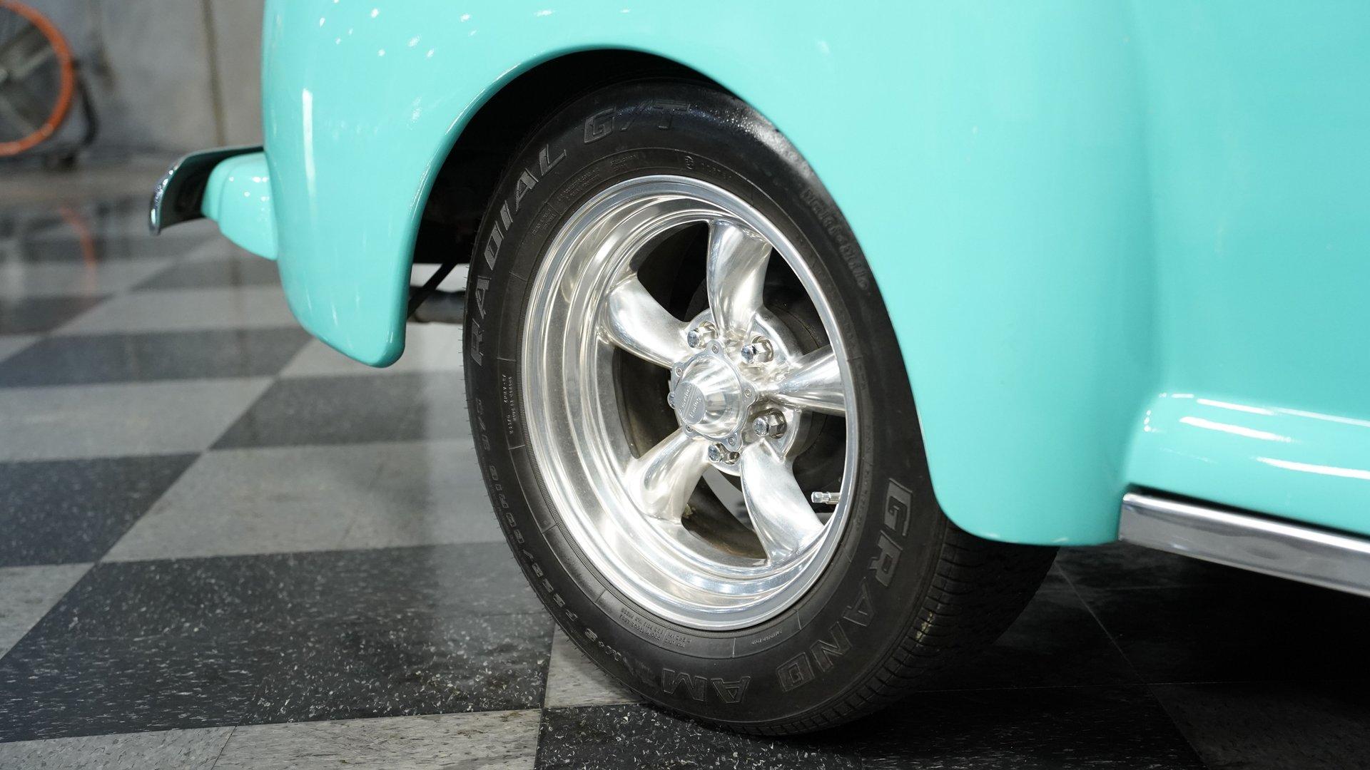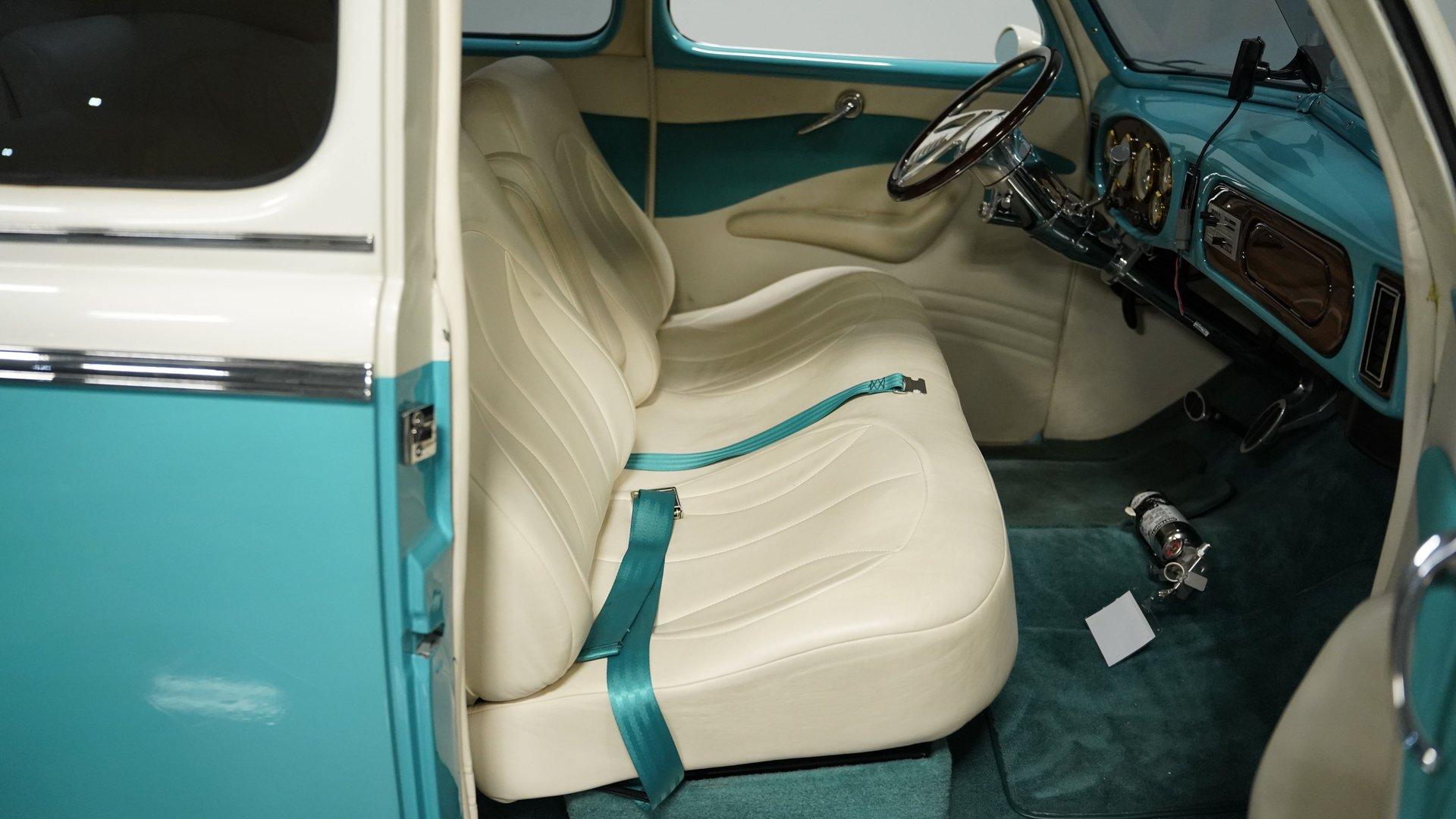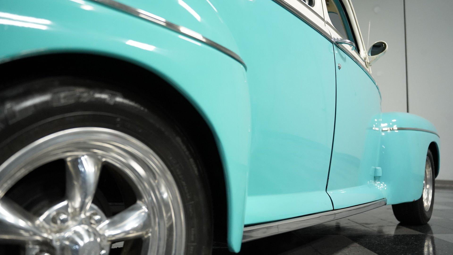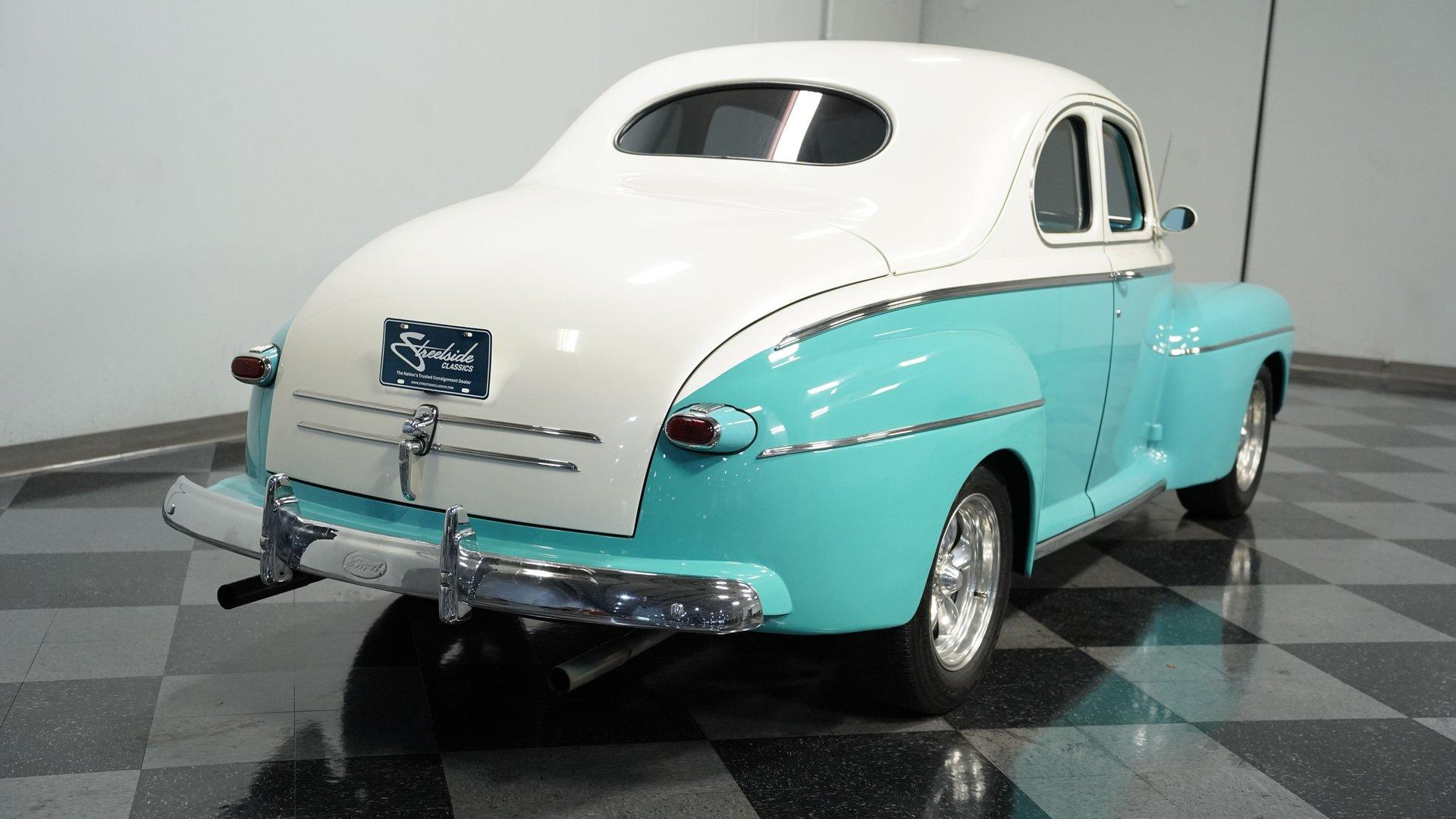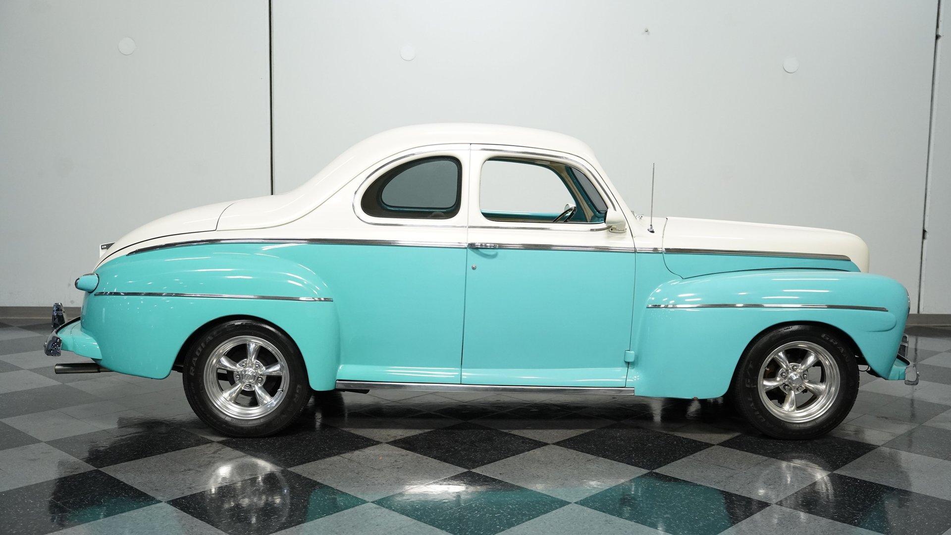Right out of Detroit's first post-war assembly line, this 1946 Ford Custom Coupe has been transformed into a street rod that knows how to get down to business. The turquoise and white two-tone combination gives it that classic hot rod vibe while tri-bar clear headlights cut through the darkness with modern efficiency. Those sport mirrors and V-butt windshield aren't just for looks - they're functional upgrades that separate this ride from the trailer queens. Single-piece door glass keeps the lines clean by ditching those old side vents. Sitting on legendary 16" American Racing Torq Thrust wheels wrapped in 225/60R16 front and meaty 255/60R16 rear rubber, this coupe has the stance that says it's built to run. Dual exhaust tips finish off the package with authority. Crack open the doors and you'll find a cream and turquoise interior that screams vintage hot rod cool without sacrificing comfort. Split-bench leather seating keeps things period-correct while giving you a place to settle in for some serious road time. The column shifter maintains that traditional Ford feel, but don't think this ride is stuck in the past. Air conditioning keeps you cool when the asphalt gets hot, power steering makes threading through traffic effortless, and power windows mean no cranking handles here. That AM/FM single CD player provides the soundtrack for your adventures, while the tilt wheel lets you dial in your perfect driving position. What really makes this Ford move is the 350 small block V8 breathing through electronic fuel injection courtesy of a FAST system. Fresh aluminum heads from March 2025 with cooling system upgrades mean this motor is ready to run hard and stay cool doing it. The TH350 3-speed automatic handles the power transfer duties with smooth, reliable shifts every time. That 8" rear axle puts the power to the pavement while A-arm front suspension and leaf spring rear setup keep everything planted and predictable. Power disc brakes up front provide the stopping power you need, and the dual exhaust system with Dynomax mufflers gives it that perfect hot rod rumble. Electronic fans keep temps in check so you can focus on driving instead of watching gauges. HIGHLIGHTS: 350 V8 Engine Electronic Fuel Injection (FAST System) 3 Speed Automatic TH350 Transmission New Aluminum Heads (3/2025) Edelbrock Manifold Electronic Cooling Fans A-Arm Front Suspension Leaf Springs with Shocks Rear Suspension 8" Rear Axle Power Disc Front Brakes Dual Exhaust with Dynomax Mufflers Turquoise and White Two-Tone Paint 16" American Racing Torq Thrust Wheels 225/60R16 Front, 255/60R16 Rear Tires Tri-Bar Clear Headlights Sport Mirrors V-Butt Windshield Cream and Turquoise Interior with Split-Bench Leather Seats Column Shifter Air Conditioning Power Steering Power Windows Tilt Wheel AM/FM Single CD Player Service Records and Receipts This 1946 Ford Custom Coupe brings together old-school cool with modern reliability - electronic fuel injection that starts every time, leather comfort, and documented upgrades that prove someone invested serious money in doing things right. Call today!
