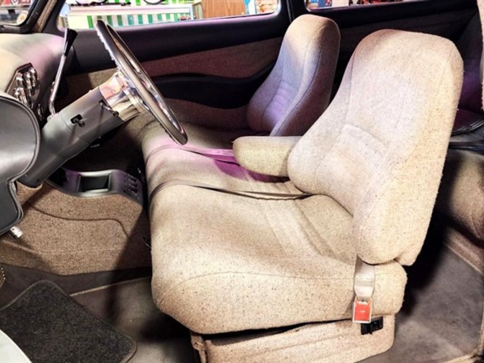 The chassis is designed for a full air ride (front and rear) with an on-board air compressor trunk mounted. Stopping power comes from Wilwood power front disc brakes and rear drums. Power to the ground is thanks to a GM 10 bolt rear. The power steering and a Mustang II rack makes parking and driving a dream.