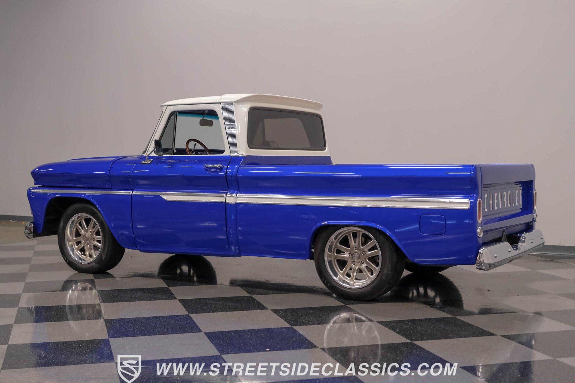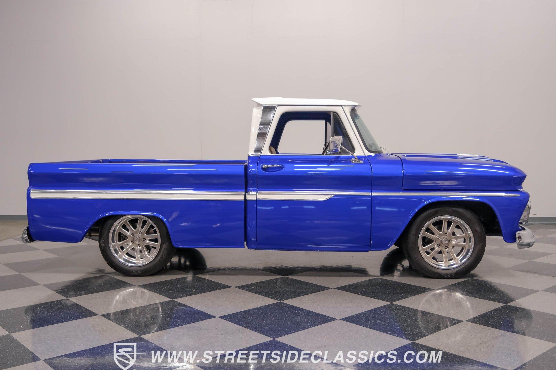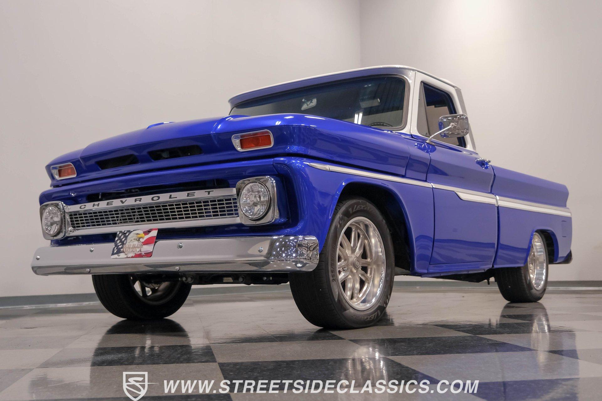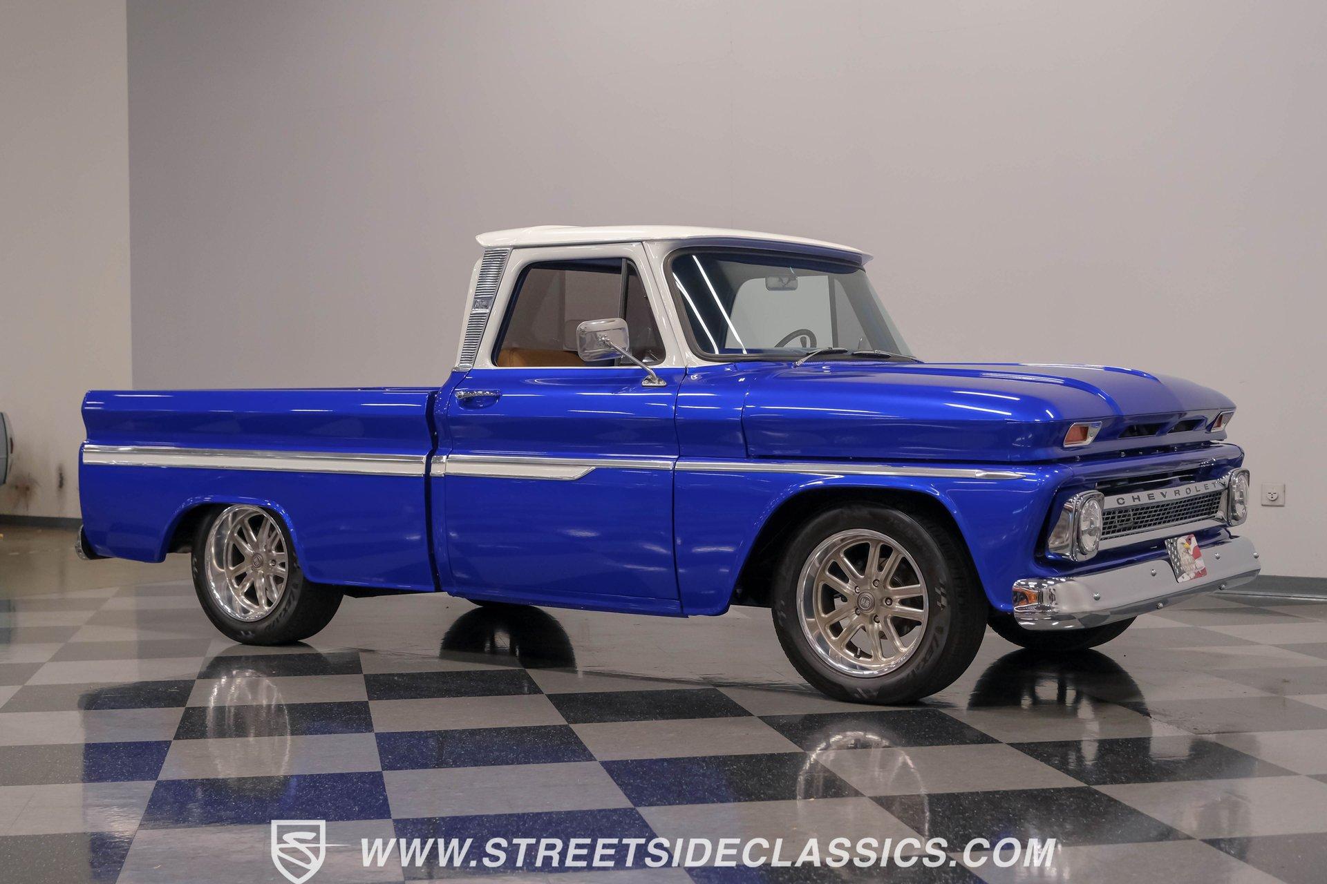 Big back windows make all the difference on classic trucks, and that's exactly what you'll find on this 1966 Chevrolet C10 Restomod. Gravity Blue Pearl with Pearl White accents creates a two-tone combination that looks fantastic against the clean lines of this pickup. Wood bed flooring adds natural warmth to the exterior package while chrome mirrors provide additional visual detail. The quality of the workmanship is evident throughout - excellent panel gaps, no dents or dings, and good glass all around. The overall look is completed by 18" U.S. Mags wheels and 255/55R18 tires that give this C10 the perfect stance. Inside, tan vinyl covers a custom 70/30 bench seat that offers both style and function. Digital gauges provide clear information at a glance, while the wood grain steering wheel mounted on a tilt column gives the driver optimal control. For added convenience, a flip-down center console is present along with clear floor mats that maintain the clean appearance of the interior. Modern upgrades include a Bluetooth radio for your favorite music, heated seats for cold mornings, and cruise control for long drives. The column shifter keeps the cabin layout true to the truck's heritage while adding modern comfort. Powering this C10 is a 383 Stroker V8 generating an estimated 480-500 horsepower. The engine utilizes Holley Sniper electronic fuel injection for consistent performance in any condition. A 700R4 4-speed automatic transmission transfers power to a 3.73 limited slip rear end. The suspension has been thoroughly updated with a Mustang II-type front setup featuring tubular A-arms and coilovers, matched with coilovers at the rear and aftermarket trailing arms. Braking is handled by slotted and drilled power disc brakes up front with power discs at the rear. Shorty headers connect to a MagnaFlow dual exhaust system that gives this truck an appropriate sound to match its capabilities. HIGHLIGHTS: 383 Stroker V8 Engine (480-500 hp) 700R4 4-Speed Automatic Transmission Electronic Fuel Injection - Holley Sniper Four Wheel Power Disc Brakes Slotted and Drilled Front Disc Brakes Shorty Headers MagnaFlow Dual Exhaust Mustang II Front Suspension Tubular A-Arms with Coilovers Rear Coilover Suspension Aftermarket Bolt-in Center Frame Bracing Aluminum Radiator Serpentine Belt System Gravity Blue Pearl with Pearl White Accents 18" U.S. Mags Wheels with 255/55R18 Tires Chrome Mirrors Wood Bed Tan Vinyl Interior with 70/30 Heated Bench Seat Digital Gauges Tilt Column Wood Grain Steering Wheel Power Steering Column Shifter Air Conditioning - Vintage Air Bluetooth Radio Cruise Control Flash Drive with Restoration Photos 1,596 Miles Since Build With just 1,596 miles since completion, this C10 offers the perfect blend of classic pickup style and modern drivability. A potent 383 Stroker V8, fully updated suspension, and comfortable interior make for an ideal combination of show and go. Call today!