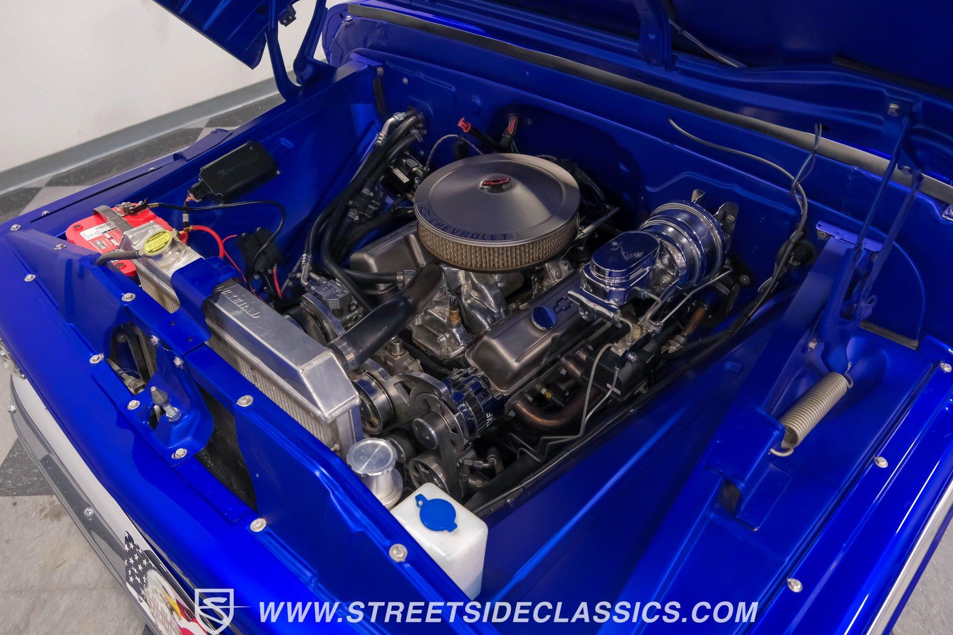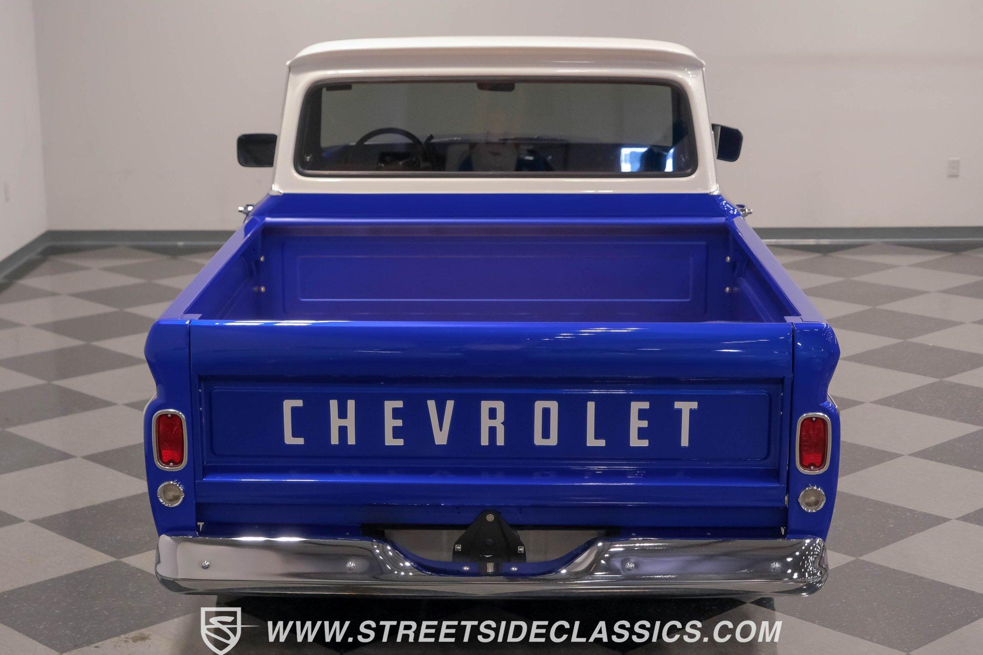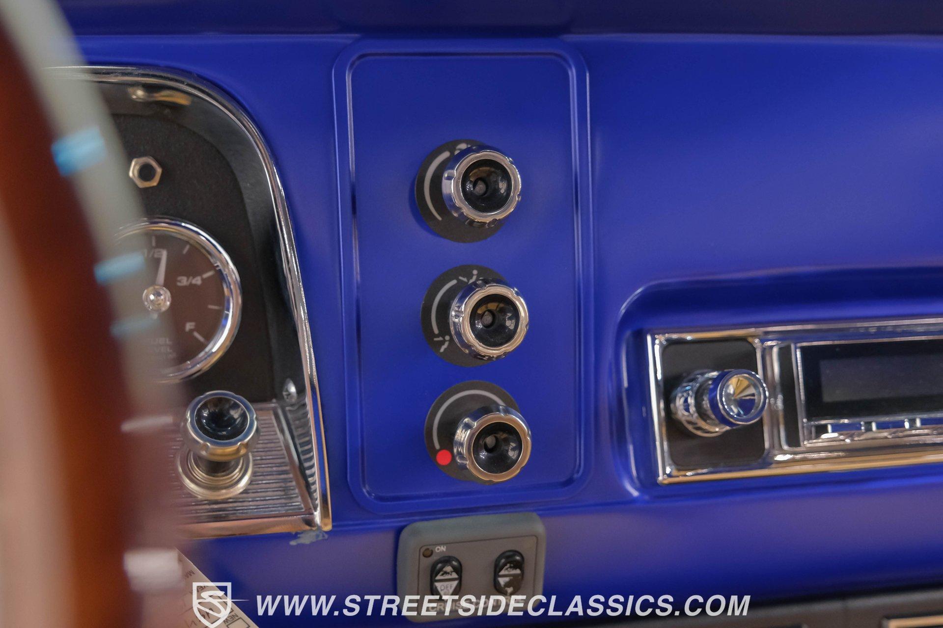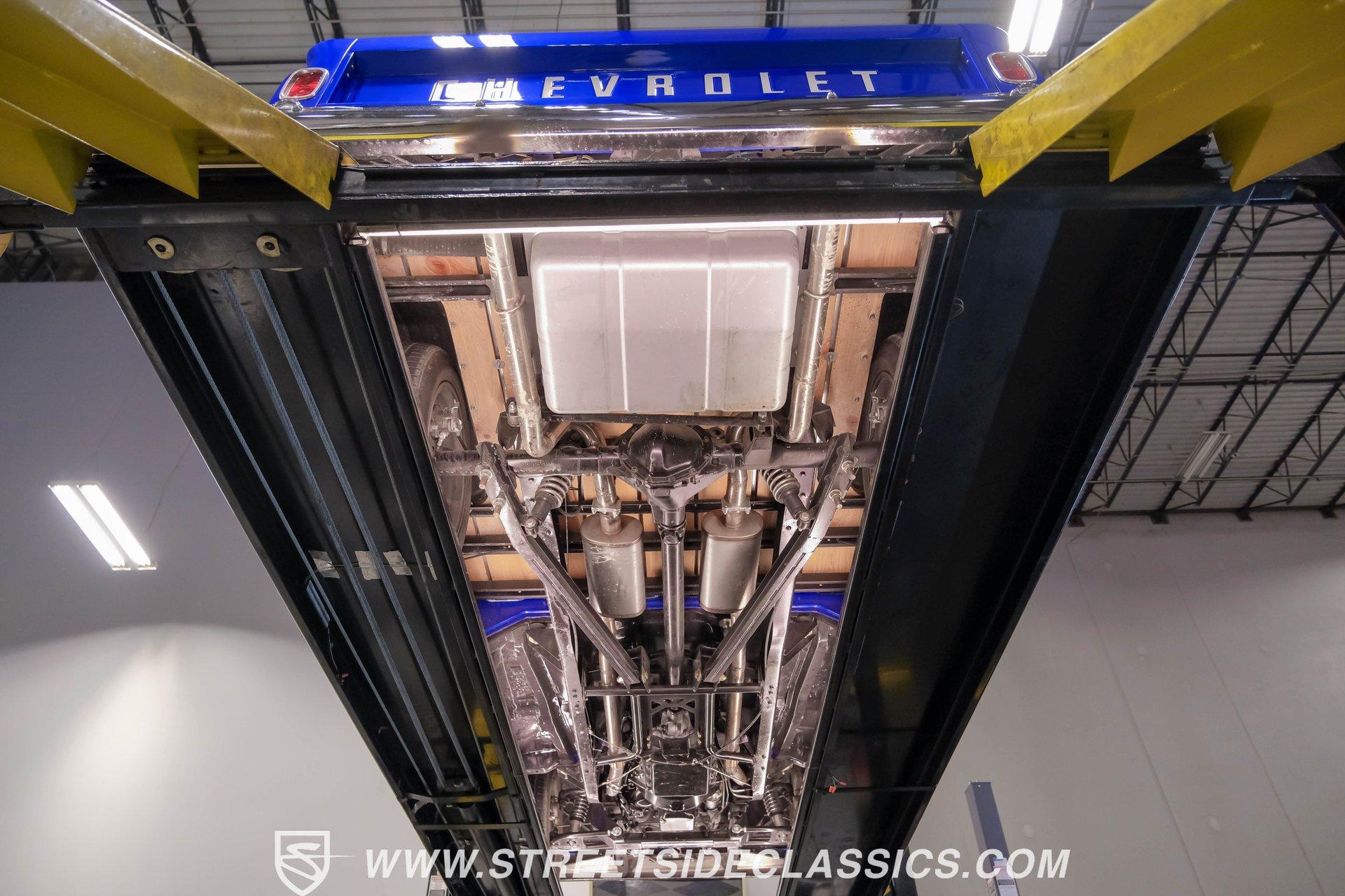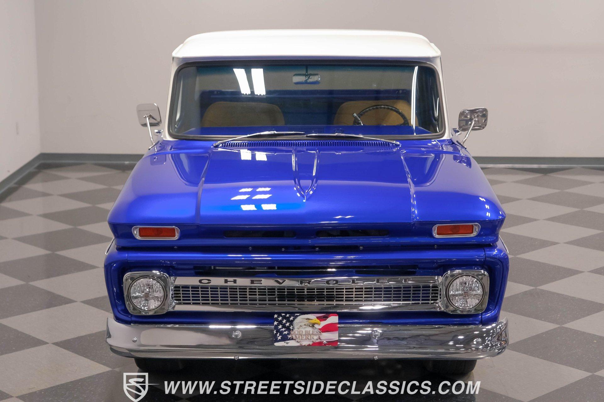 Big back windows make all the difference on classic trucks, and that's exactly what you'll find on this 1966 Chevrolet C10 Restomod. Gravity Blue Pearl with Pearl White accents creates a two-tone combination that looks fantastic against the clean lines of this pickup. Wood bed flooring adds natural warmth to the exterior package while chrome mirrors provide additional visual detail. The quality of the workmanship is evident throughout - excellent panel gaps, no dents or dings, and good glass all around. The overall look is completed by 18" U.S. Mags wheels and 255/55R18 tires that give this C10 the perfect stance. Inside, tan vinyl covers a custom 70/30 bench seat that offers both style and function. Digital gauges provide clear information at a glance, while the wood grain steering wheel mounted on a tilt column gives the driver optimal control. For added convenience, a flip-down center console is present along with clear floor mats that maintain the clean appearance of the interior. Modern upgrades include a Bluetooth radio for your favorite music, heated seats for cold mornings, and cruise control for long drives. The column shifter keeps the cabin layout true to the truck's heritage while adding modern comfort. Powering this C10 is a 383 Stroker V8 generating an estimated 480-500 horsepower. The engine utilizes Holley Sniper electronic fuel injection for consistent performance in any condition. A 700R4 4-speed automatic transmission transfers power to a 3.73 limited slip rear end. The suspension has been thoroughly updated with a Mustang II-type front setup featuring tubular A-arms and coilovers, matched with coilovers at the rear and aftermarket trailing arms. Braking is handled by slotted and drilled power disc brakes up front with power discs at the rear. Shorty headers connect to a MagnaFlow dual exhaust system that gives this truck an appropriate sound to match its capabilities. HIGHLIGHTS: 383 Stroker V8 Engine (480-500 hp) 700R4 4-Speed Automatic Transmission Electronic Fuel Injection - Holley Sniper Four Wheel Power Disc Brakes Slotted and Drilled Front Disc Brakes Shorty Headers MagnaFlow Dual Exhaust Mustang II Front Suspension Tubular A-Arms with Coilovers Rear Coilover Suspension Aftermarket Bolt-in Center Frame Bracing Aluminum Radiator Serpentine Belt System Gravity Blue Pearl with Pearl White Accents 18" U.S. Mags Wheels with 255/55R18 Tires Chrome Mirrors Wood Bed Tan Vinyl Interior with 70/30 Heated Bench Seat Digital Gauges Tilt Column Wood Grain Steering Wheel Power Steering Column Shifter Air Conditioning - Vintage Air Bluetooth Radio Cruise Control Flash Drive with Restoration Photos 1,596 Miles Since Build With just 1,596 miles since completion, this C10 offers the perfect blend of classic pickup style and modern drivability. A potent 383 Stroker V8, fully updated suspension, and comfortable interior make for an ideal combination of show and go. Call today!