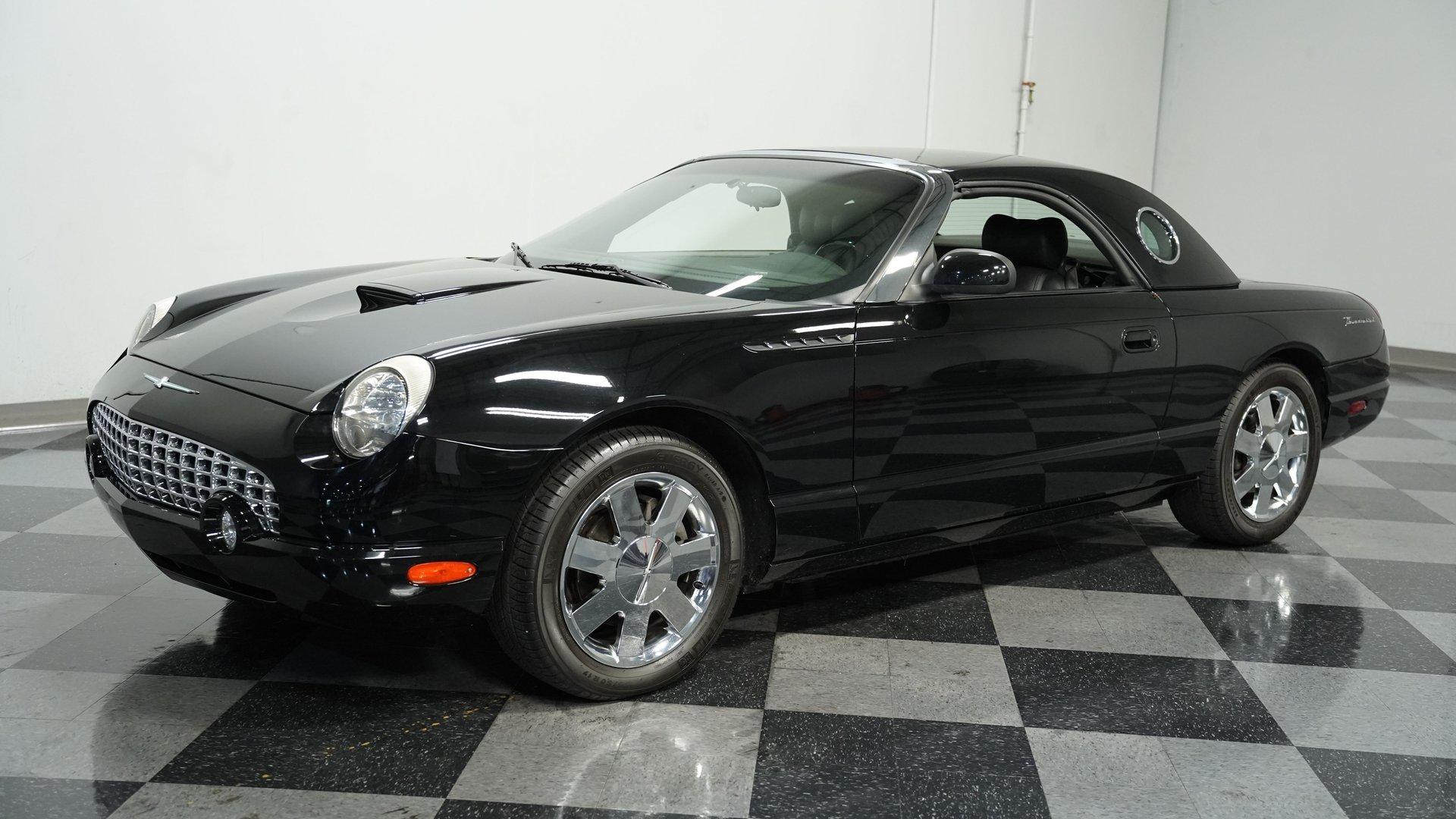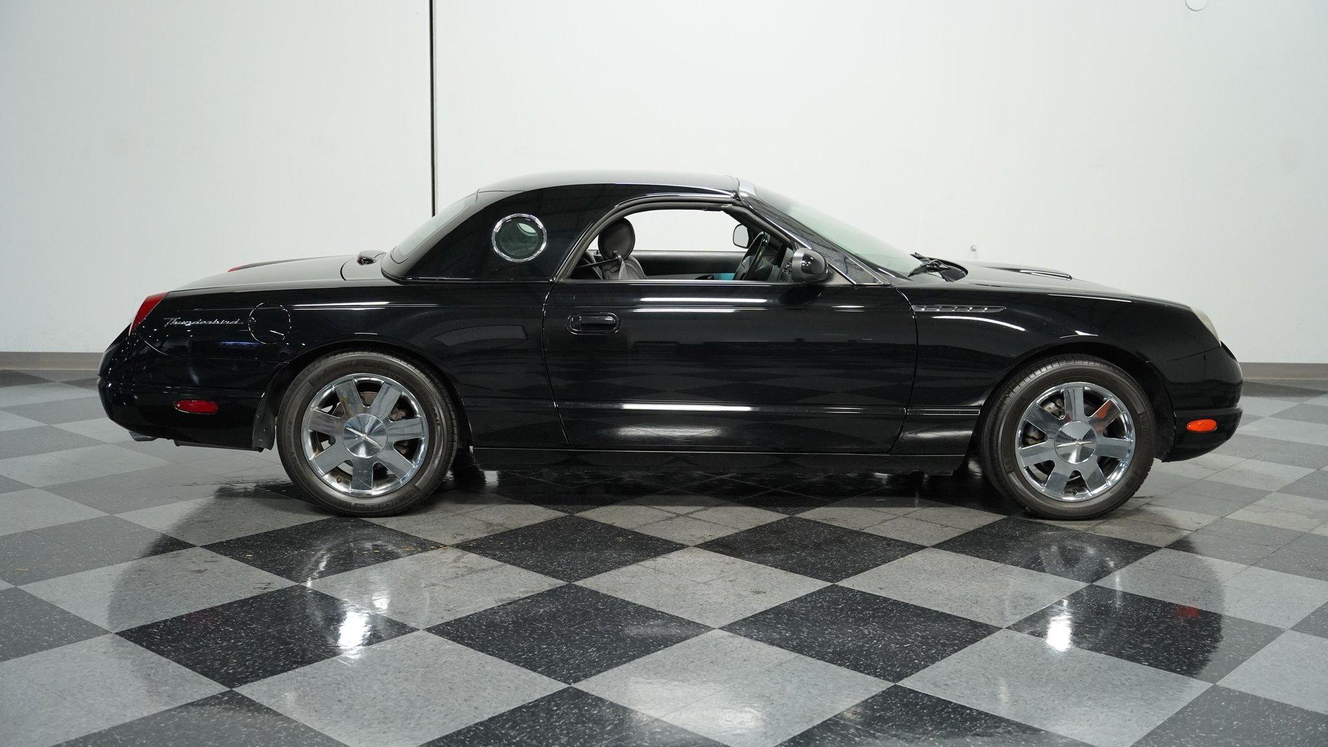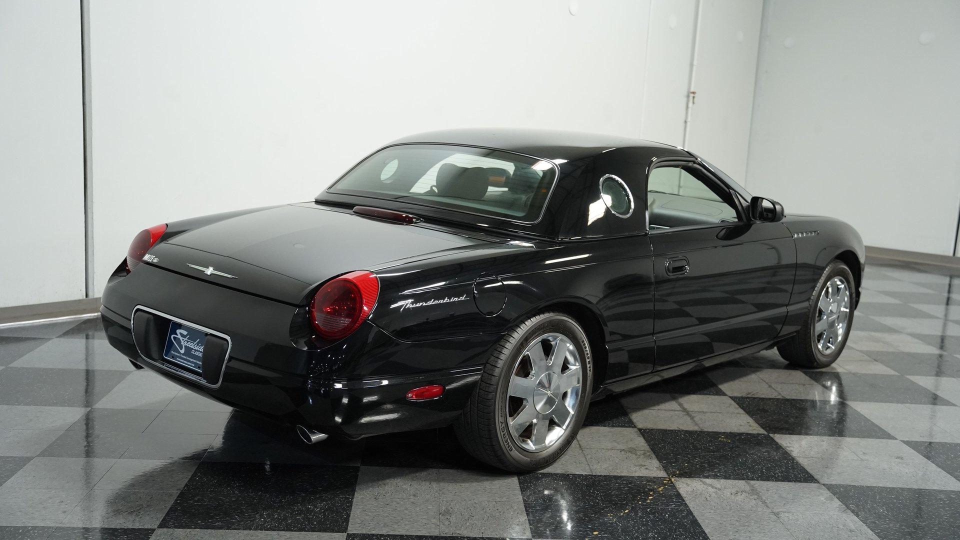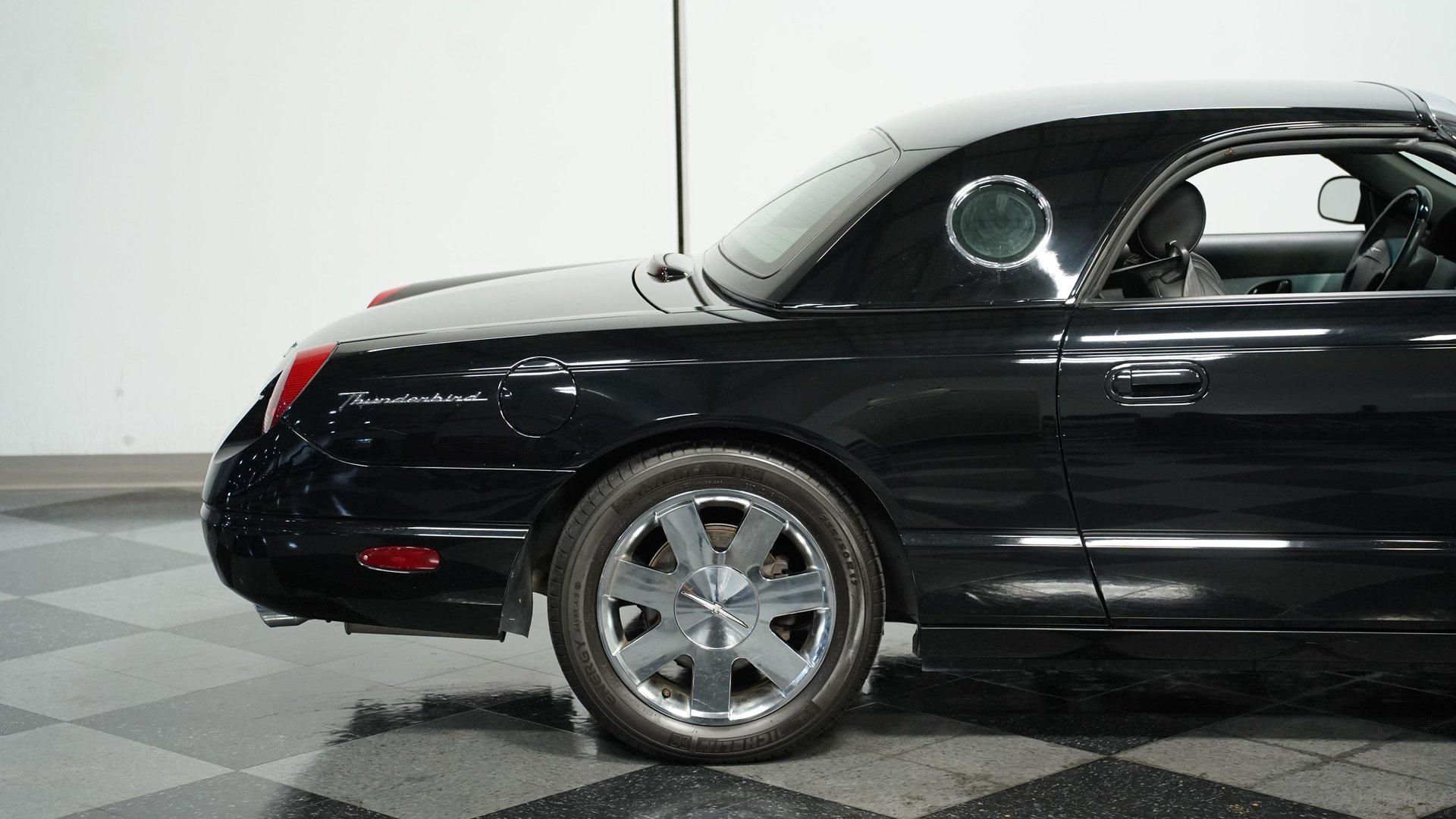 This generation Thunderbird, finished elegantly in Evening Black with a Midnight Black interior, features automatic A/C climate control and heated seats, allowing you to drive comfortably with the top down nearly all year round. This car was created to be a terrific cruiser loaded with power windows, power locks, keyless entry/alarm, dual front airbags, a premium AM/FM/6-CD changer stereo and cruise control. The leather seats feel comfy and have a well-respected style with the kind of use that goes with the low mileage. The power driver's seat gets you in the right position to really see nice details such as the steering wheel's classic turquoise streak in the Thunderbird logo that is coordinated with the needles on the gauges. HIGHLIGHTS: Only 46,503 miles from new One owner since new First year of the last generation of Thunderbirds Fuel-injected DOHC 3.9-liter V8 Automatic transmission Factory stereo with 6-CD changer Air conditioning Heated seats Rare triple black color scheme Removable hardtop and folding soft top While the looks of the car are meant to be retro-cool, the engine bay is a pure modern motor. It is a fuel-injected DOHC 3.9-liter V8 that fires up readily, idles smoothly and delivers plenty of power when you want it, making it the ideal smooth cruiser from day one. You will love using this Thunderbird to drive near or far with its smooth five-speed automatic transmission, power steering, four-wheel disc brakes and fully-independent suspension. This may look like a vintage car, but this 2002 Ford Thunderbird with just 46,503 miles certainly has modern moves. Call today!