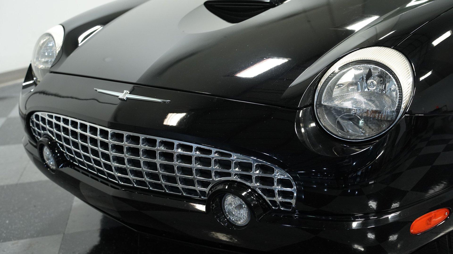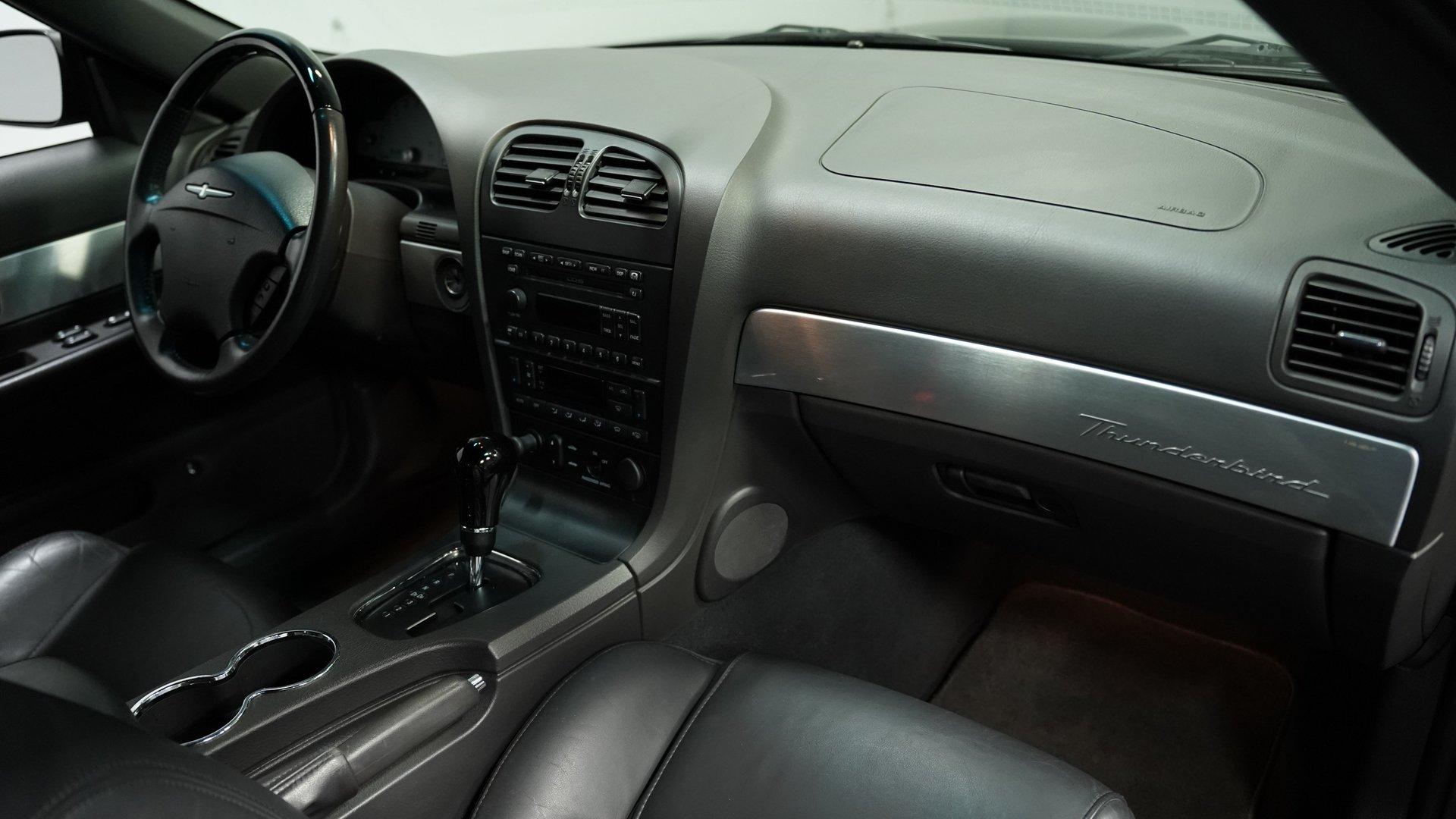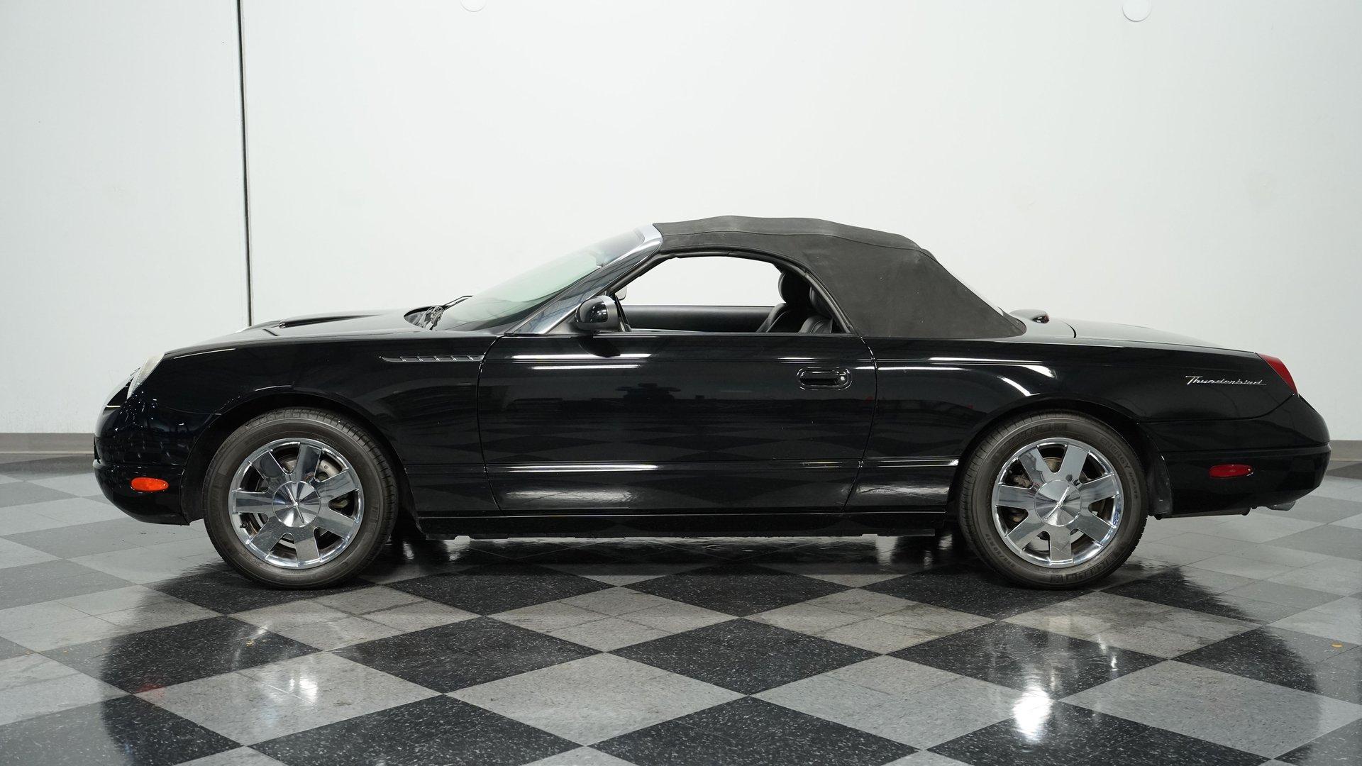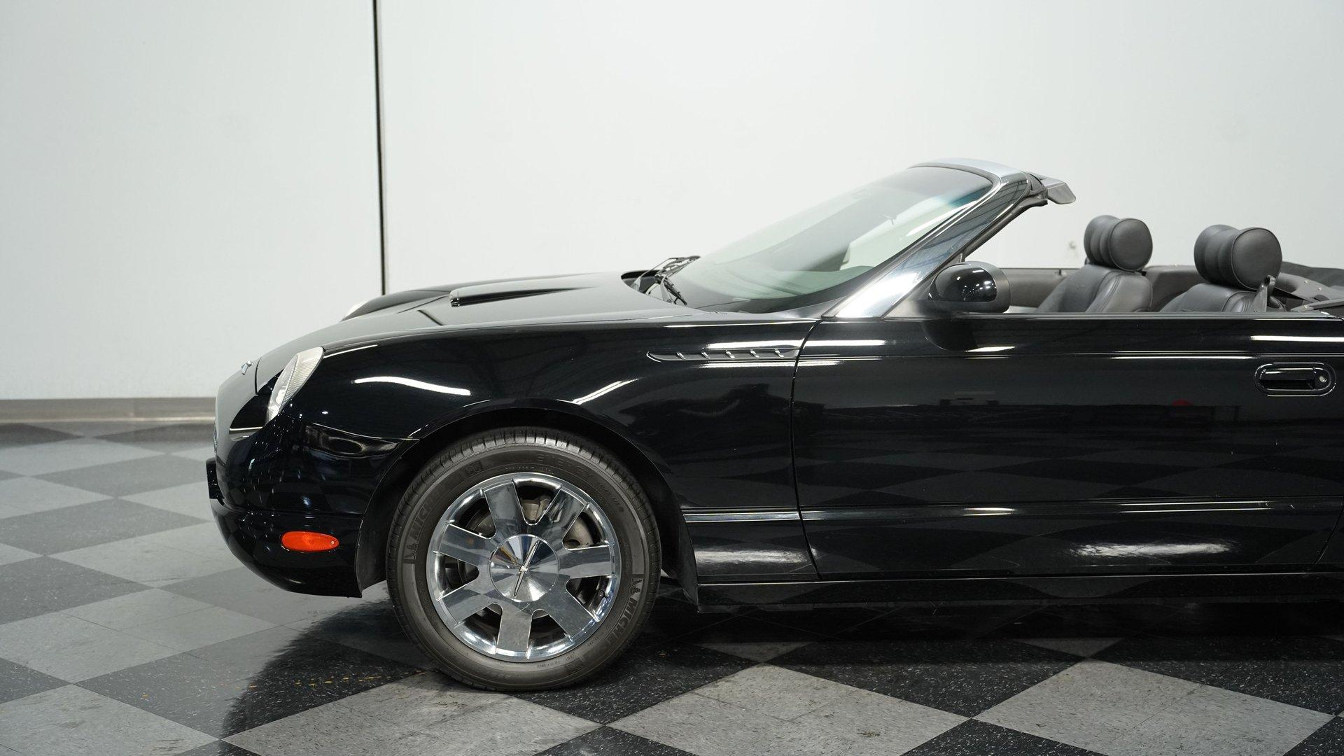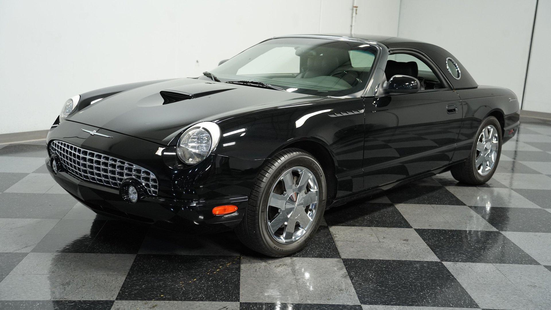 This generation Thunderbird, finished elegantly in Evening Black with a Midnight Black interior, features automatic A/C climate control and heated seats, allowing you to drive comfortably with the top down nearly all year round. This car was created to be a terrific cruiser loaded with power windows, power locks, keyless entry/alarm, dual front airbags, a premium AM/FM/6-CD changer stereo and cruise control. The leather seats feel comfy and have a well-respected style with the kind of use that goes with the low mileage. The power driver's seat gets you in the right position to really see nice details such as the steering wheel's classic turquoise streak in the Thunderbird logo that is coordinated with the needles on the gauges. HIGHLIGHTS: Only 46,503 miles from new One owner since new First year of the last generation of Thunderbirds Fuel-injected DOHC 3.9-liter V8 Automatic transmission Factory stereo with 6-CD changer Air conditioning Heated seats Rare triple black color scheme Removable hardtop and folding soft top While the looks of the car are meant to be retro-cool, the engine bay is a pure modern motor. It is a fuel-injected DOHC 3.9-liter V8 that fires up readily, idles smoothly and delivers plenty of power when you want it, making it the ideal smooth cruiser from day one. You will love using this Thunderbird to drive near or far with its smooth five-speed automatic transmission, power steering, four-wheel disc brakes and fully-independent suspension. This may look like a vintage car, but this 2002 Ford Thunderbird with just 46,503 miles certainly has modern moves. Call today!