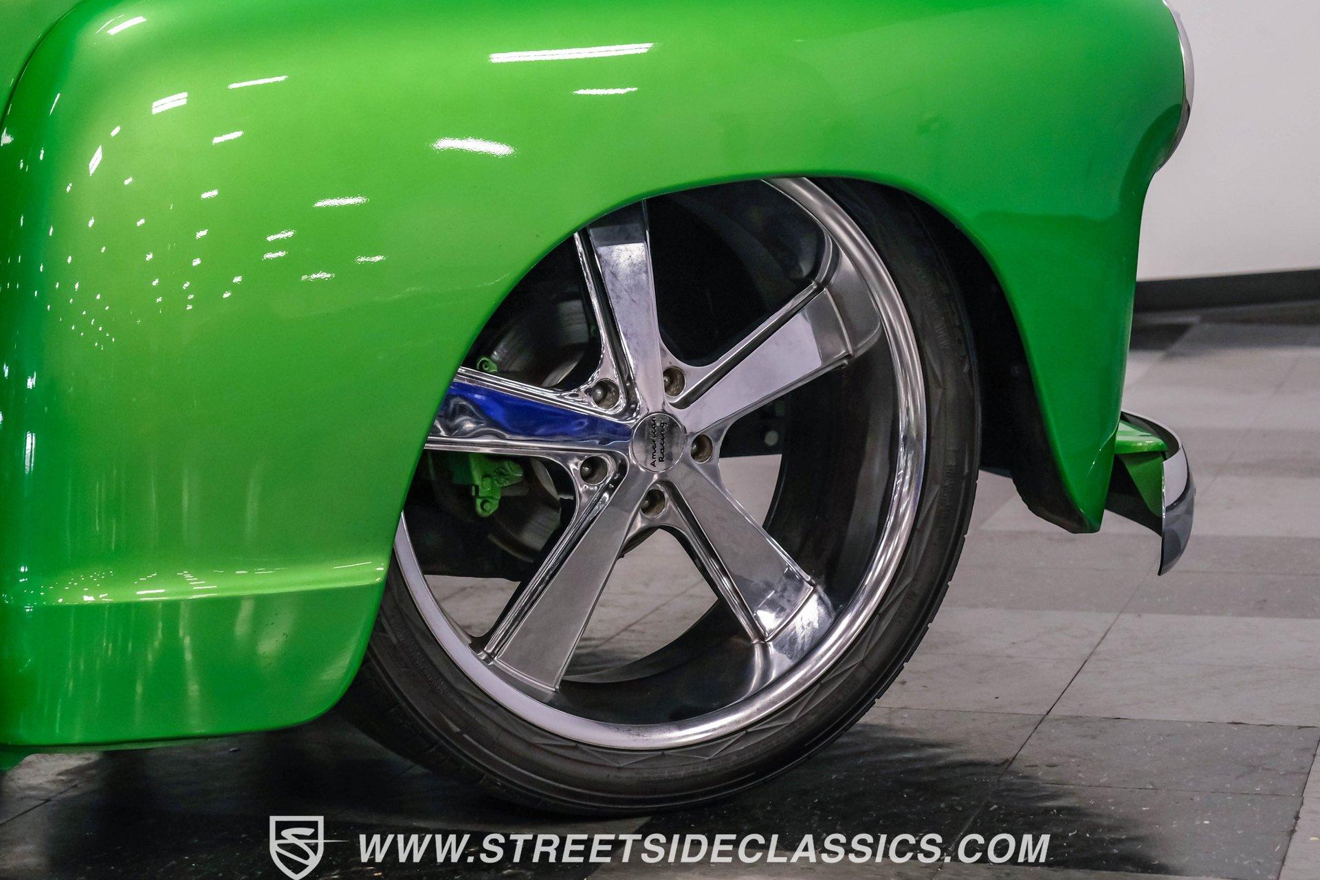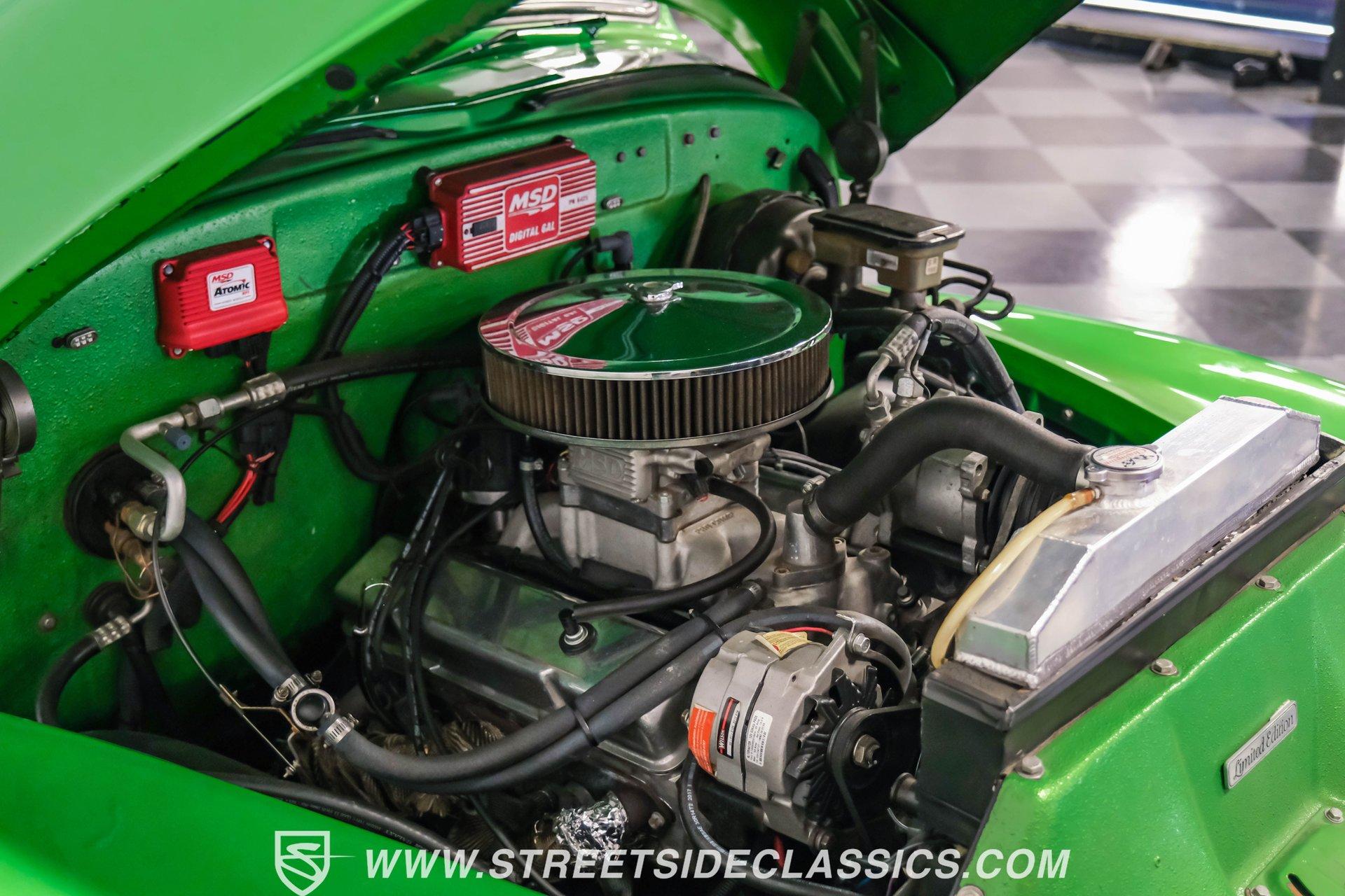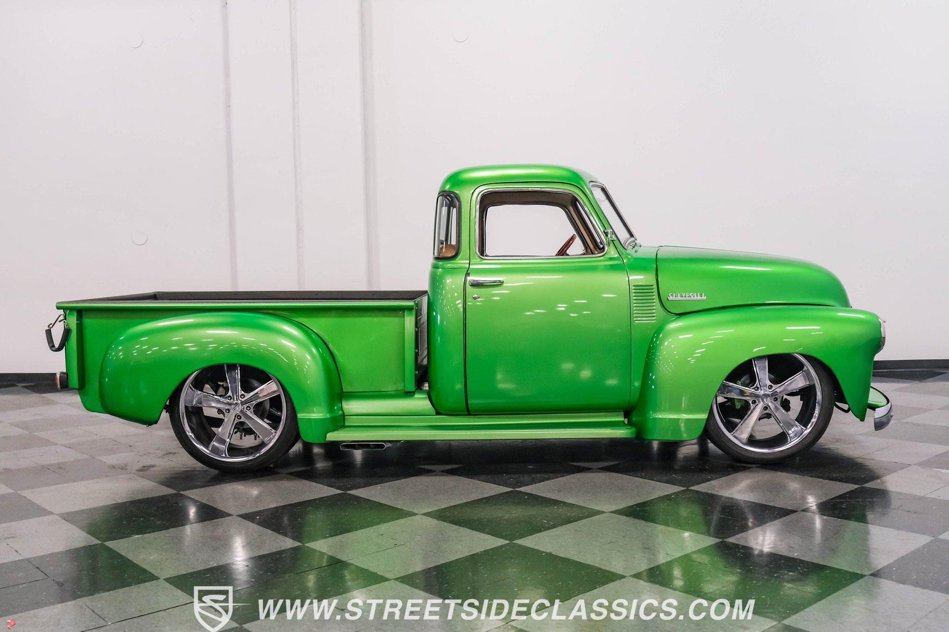 Crafted with precision, this 1950 Chevrolet 3100 5 Window Restomod wears a vibrant Green Metallic finish that accentuates its classic pickup lines. The upgraded stance comes from the muscular 22" American Racing wheels wrapped in 285/35R22 Nitto tires that fill the wheel wells perfectly. The truck's silhouette maintains the iconic 5-window design while the modern touches like custom side exit exhaust add contemporary flair. The bed features a durable liner that adds both protection and utility to this classic hauler. The Carmel interior balances vintage appeal with modern comfort. Supportive bucket seats flanked by a custom center console create an inviting cabin environment. The wood grip steering wheel mounted on a tilt column offers superior control and driving position. Jegs white-faced gauges provide clear readouts of vital information, while the underdash gauge cluster adds a custom touch. The Kenwood AM/FM/CD/MP3/USB head unit delivers quality sound, complemented by air conditioning for comfort in any weather. Powering this classic truck is a potent 350 V8 engine equipped with Atomic EFI by MSD for improved performance and reliability. The 700R4 four-speed automatic transmission transfers power smoothly to the 10-bolt rear end. The truck sits on an S10 frame with coil spring front suspension featuring shocks and a sway bar, while the rear utilizes a solid axle with leaf springs and shocks. The four-wheel power disc brake system provides superior stopping capability compared to the original drums. HIGHLIGHTS: 350 V8 Engine 700R4 4-Speed Automatic Transmission Atomic EFI by MSD Pro Comp Intake Manifold AFR Aluminum Heads Four-Wheel Power Disc Brakes S10 Frame Headers w/ Dual Flowmaster Mufflers Custom Side Exit Exhaust Champion Aluminum Radiator with Electric Fan 10-Bolt Rear Axle Green Metallic Paint 22" American Racing Wheels with 285/35R22 Nitto Tires Bed Liner Carmel Interior with Bucket Seats and Console Wood Grip Steering Wheel on Tilt Column Lokar Floor Shifter Jegs White-Faced Gauges Underdash Gauge Cluster Air Conditioning Power Steering Kenwood AM/FM/CD/MP3/USB Head Unit S10 Chassis This 1950 Chevrolet 3100 combines vintage appeal with modern performance upgrades. From its Green Metallic exterior to the powerful fuel-injected V8 and comfortable custom interior, this restomod pickup delivers an exceptional blend of classic style and contemporary function. Call today!