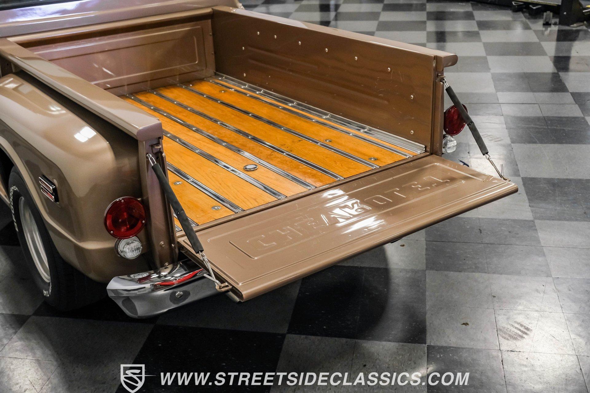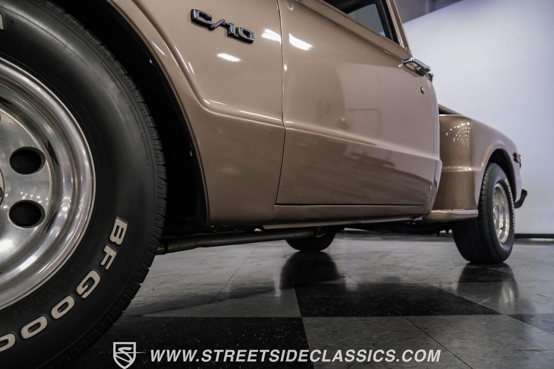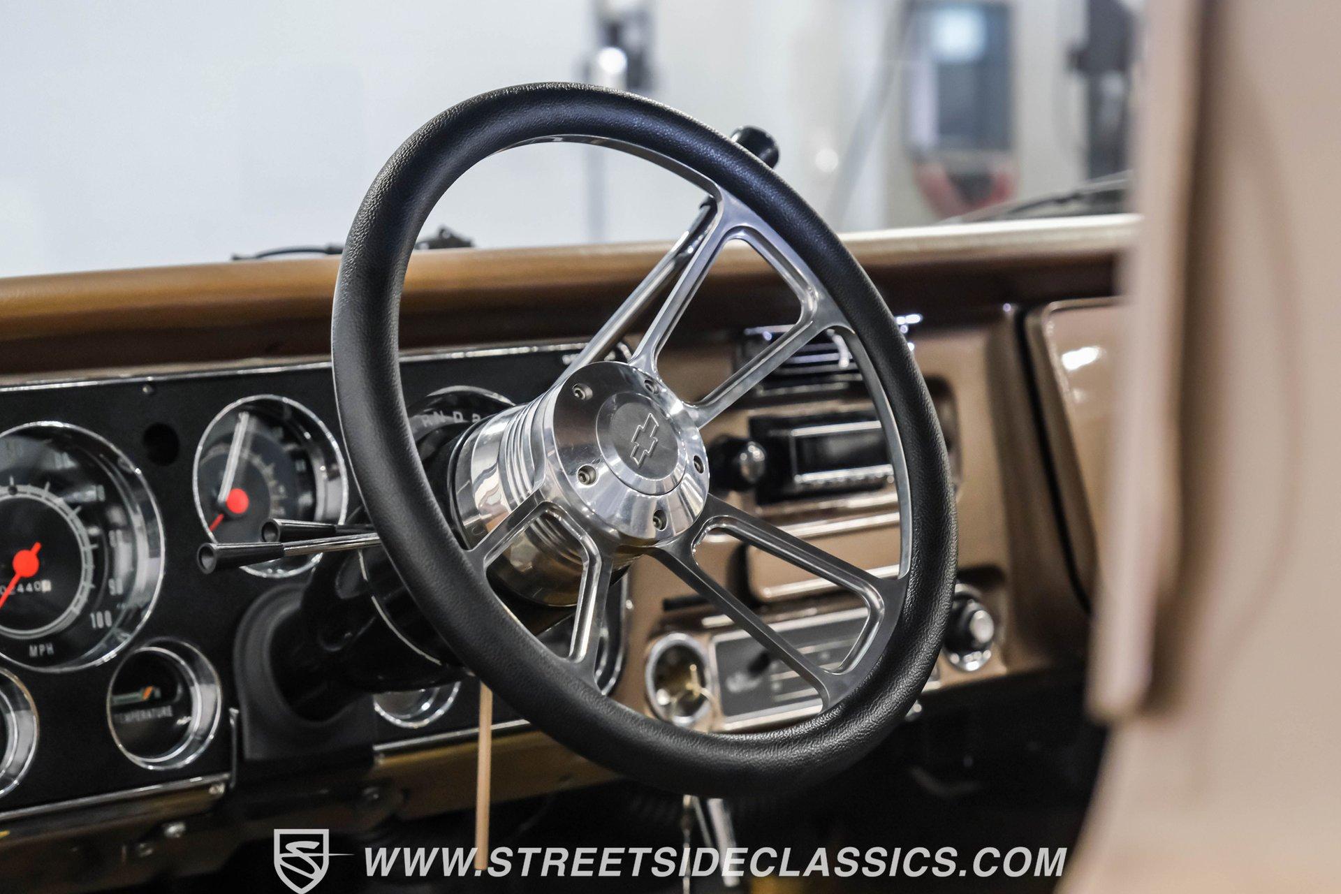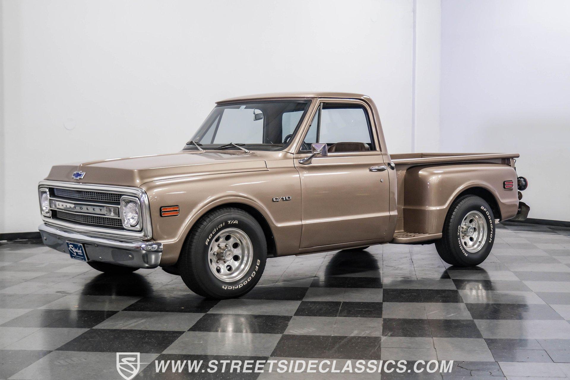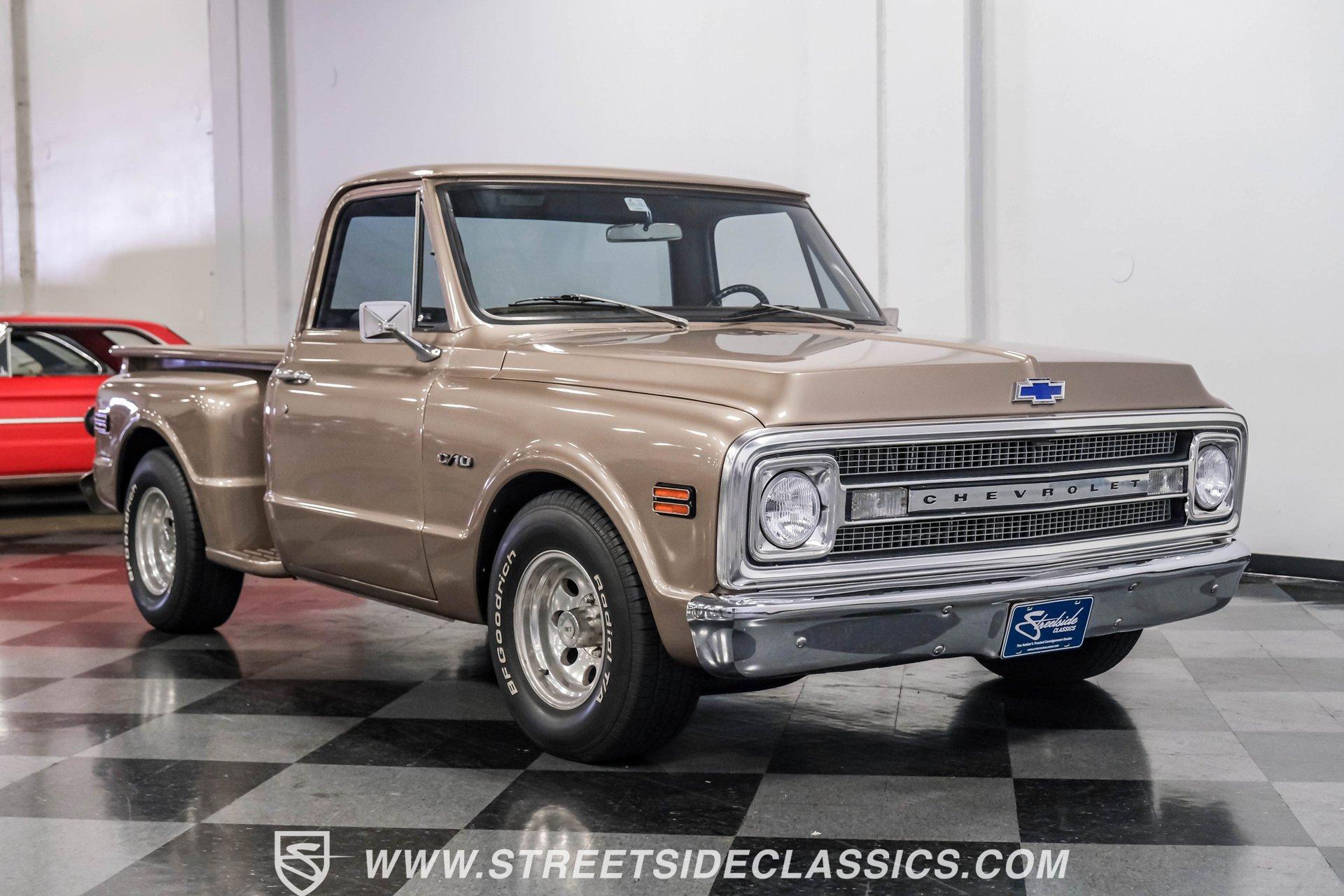 A true workhorse with weekend cruiser style, the 1969 Chevrolet C10 Stepside combines utility and good looks in one package. Finished in Pewter Metallic paint that accentuates its classic truck proportions, this pickup features the distinctive stepside bed design that made these C10s so popular. The 15" Mickey Thompson wheels wrapped in 255/70R15 BFG tires give it a balanced stance, while the bright chrome trim adds a touch of flash against the subtle metallic finish. The short bed configuration adds to the overall visual appeal while maintaining excellent functionality. Inside, the brown and tan custom TMI interior offers both comfort and style. The high-end soft vinyl bucket seats include a folding armrest for long-distance comfort. A column shifter controls the transmission while maintaining an uncluttered floor area. Modern upgrades include air conditioning for summer driving comfort, a tilt steering wheel for improved driving position, and an AM/FM radio with auxiliary and Bluetooth connectivity. Pioneer kick panel speakers deliver clear audio throughout the cabin while maintaining the truck's clean interior appearance. Powering this C10 is a 350 cubic inch V8 engine equipped with an Edelbrock AVS2 carburetor and Edelbrock intake manifold for improved performance. The engine sends power through a 700R4 four-speed automatic transmission with overdrive for highway cruising. Long tube headers connect to a dual exhaust system with aftermarket mufflers for a great sound. Additional mechanical features include an aluminum radiator for improved cooling, power steering for easy maneuverability, and power front disc brakes for reliable stopping power. The fuel tank has been relocated under the bed for improved safety and capacity. HIGHLIGHTS: 350 V8 Engine 700R4 4-Speed Automatic Transmission with Overdrive Edelbrock AVS2 Carburetor Edelbrock Intake Manifold Long Tube Headers Dual Exhaust with Aftermarket Mufflers 12 Bolt Rear Axle Aluminum Radiator Power Front Disc Brakes Fuel Tank Relocated Under Bed Pewter Metallic Paint 15" Mickey Thompson Wheels 255/70R15 BFG Tires Custom TMI Interior Bucket Seats with Folding Armrest Air Conditioning Tilt Wheel Power Steering AM/FM Radio with Aux and Bluetooth Pioneer Kick Panel Speakers For truck lovers seeking a classic C10 with modern upgrades, look no further. The combination of the 350 V8, 700R4 transmission, power disc brakes, and comfortable interior make this 1969 Chevrolet C10 Stepside an excellent choice for both weekend cruises and daily use. Call today!