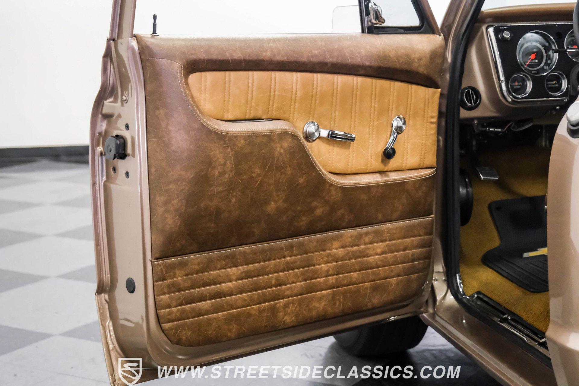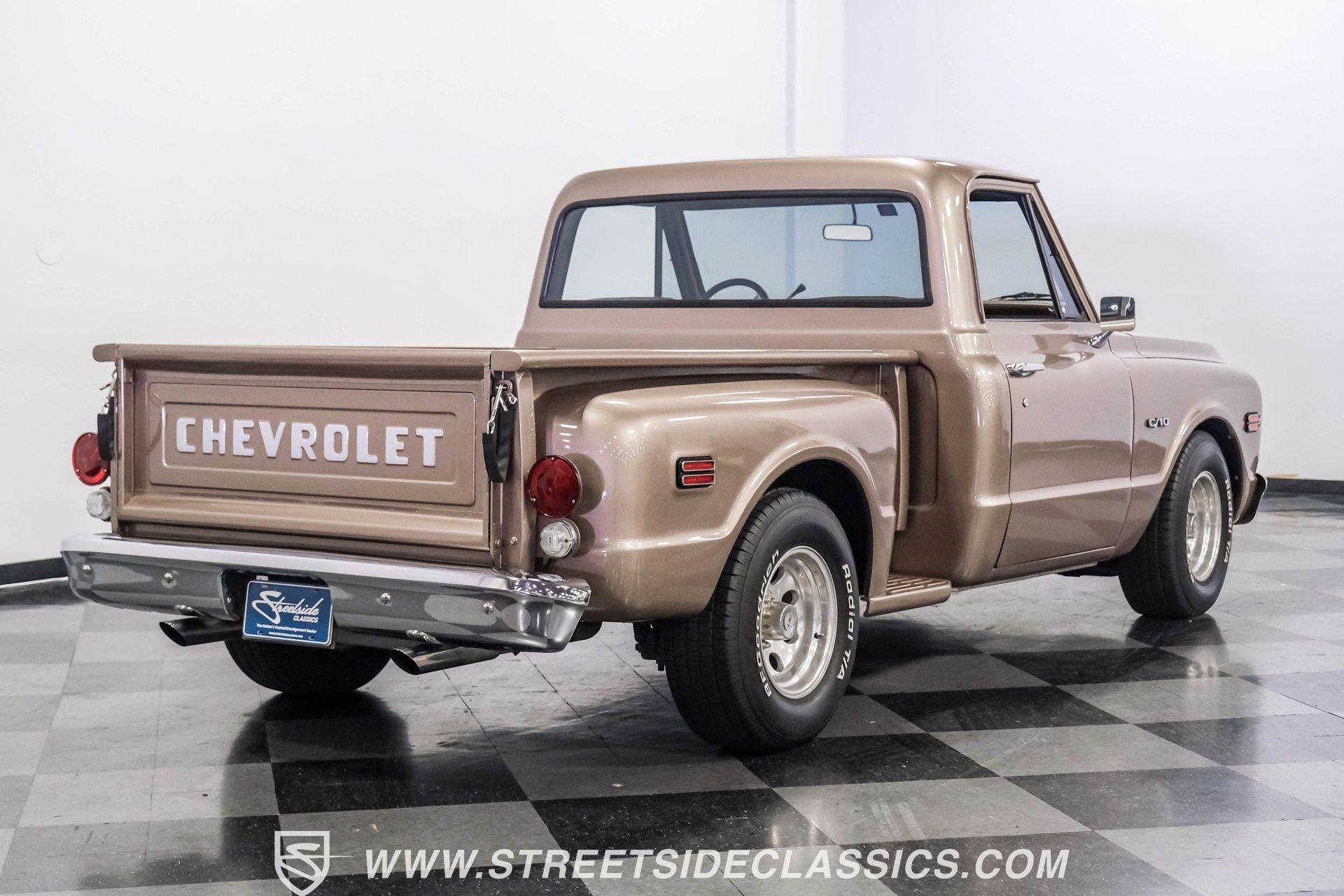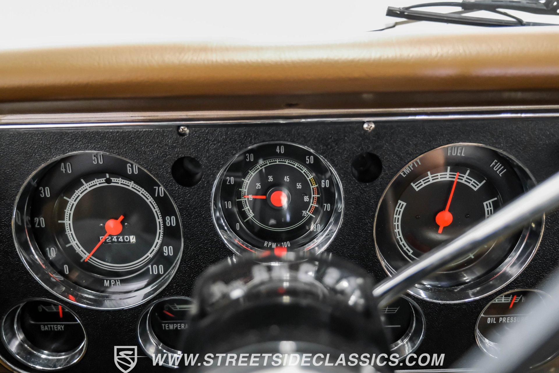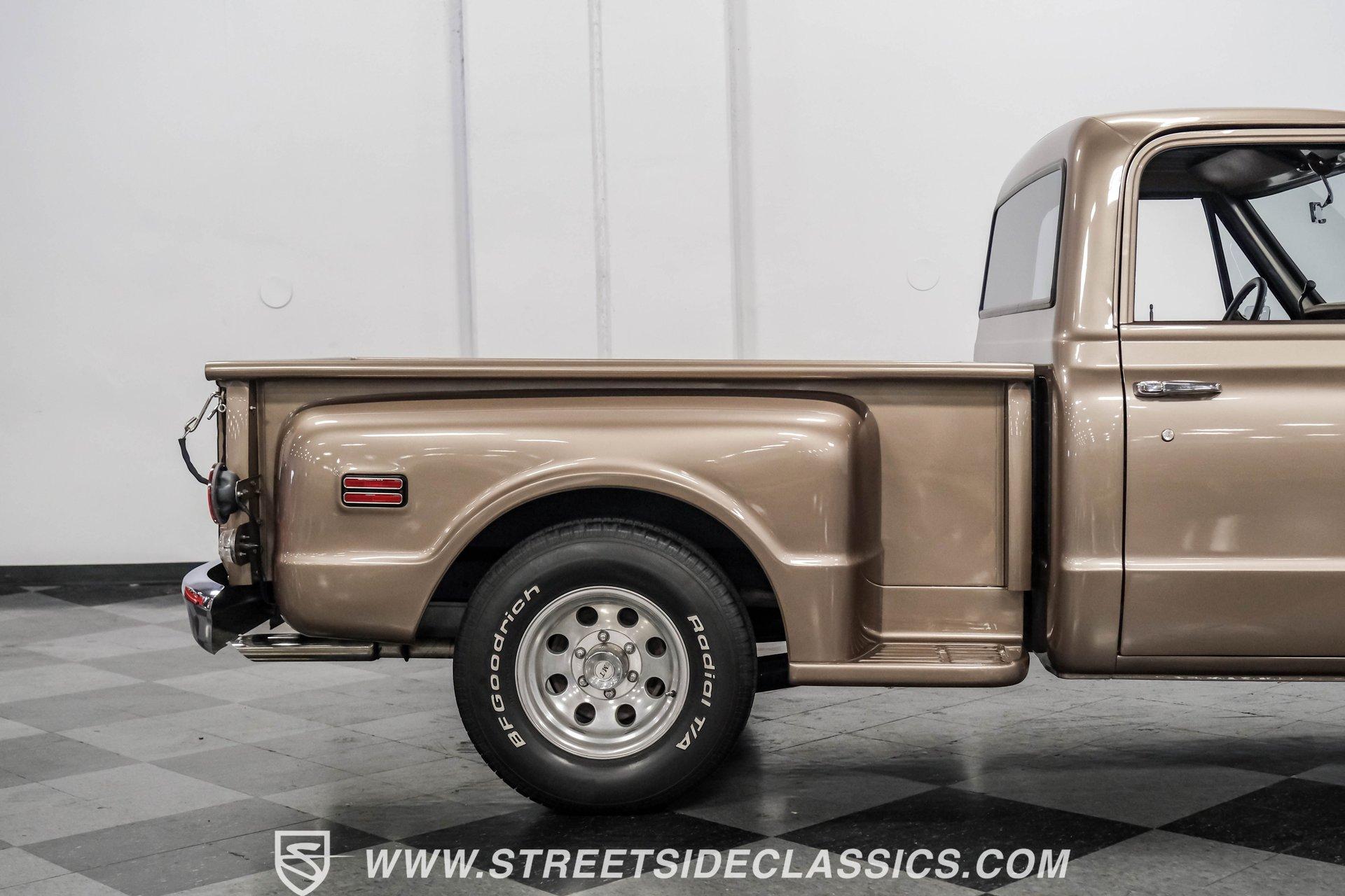 A true workhorse with weekend cruiser style, the 1969 Chevrolet C10 Stepside combines utility and good looks in one package. Finished in Pewter Metallic paint that accentuates its classic truck proportions, this pickup features the distinctive stepside bed design that made these C10s so popular. The 15" Mickey Thompson wheels wrapped in 255/70R15 BFG tires give it a balanced stance, while the bright chrome trim adds a touch of flash against the subtle metallic finish. The short bed configuration adds to the overall visual appeal while maintaining excellent functionality. Inside, the brown and tan custom TMI interior offers both comfort and style. The high-end soft vinyl bucket seats include a folding armrest for long-distance comfort. A column shifter controls the transmission while maintaining an uncluttered floor area. Modern upgrades include air conditioning for summer driving comfort, a tilt steering wheel for improved driving position, and an AM/FM radio with auxiliary and Bluetooth connectivity. Pioneer kick panel speakers deliver clear audio throughout the cabin while maintaining the truck's clean interior appearance. Powering this C10 is a 350 cubic inch V8 engine equipped with an Edelbrock AVS2 carburetor and Edelbrock intake manifold for improved performance. The engine sends power through a 700R4 four-speed automatic transmission with overdrive for highway cruising. Long tube headers connect to a dual exhaust system with aftermarket mufflers for a great sound. Additional mechanical features include an aluminum radiator for improved cooling, power steering for easy maneuverability, and power front disc brakes for reliable stopping power. The fuel tank has been relocated under the bed for improved safety and capacity. HIGHLIGHTS: 350 V8 Engine 700R4 4-Speed Automatic Transmission with Overdrive Edelbrock AVS2 Carburetor Edelbrock Intake Manifold Long Tube Headers Dual Exhaust with Aftermarket Mufflers 12 Bolt Rear Axle Aluminum Radiator Power Front Disc Brakes Fuel Tank Relocated Under Bed Pewter Metallic Paint 15" Mickey Thompson Wheels 255/70R15 BFG Tires Custom TMI Interior Bucket Seats with Folding Armrest Air Conditioning Tilt Wheel Power Steering AM/FM Radio with Aux and Bluetooth Pioneer Kick Panel Speakers For truck lovers seeking a classic C10 with modern upgrades, look no further. The combination of the 350 V8, 700R4 transmission, power disc brakes, and comfortable interior make this 1969 Chevrolet C10 Stepside an excellent choice for both weekend cruises and daily use. Call today!