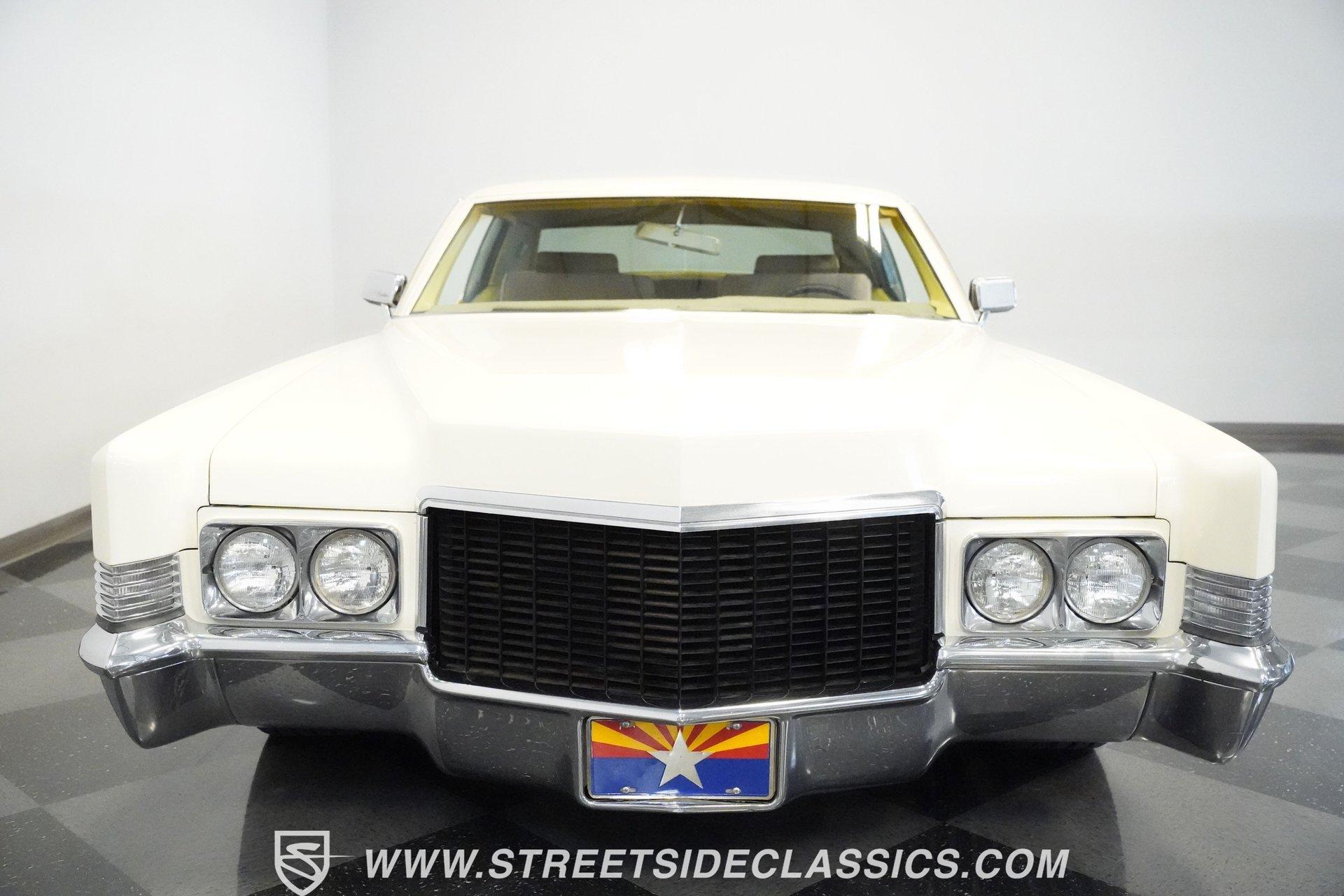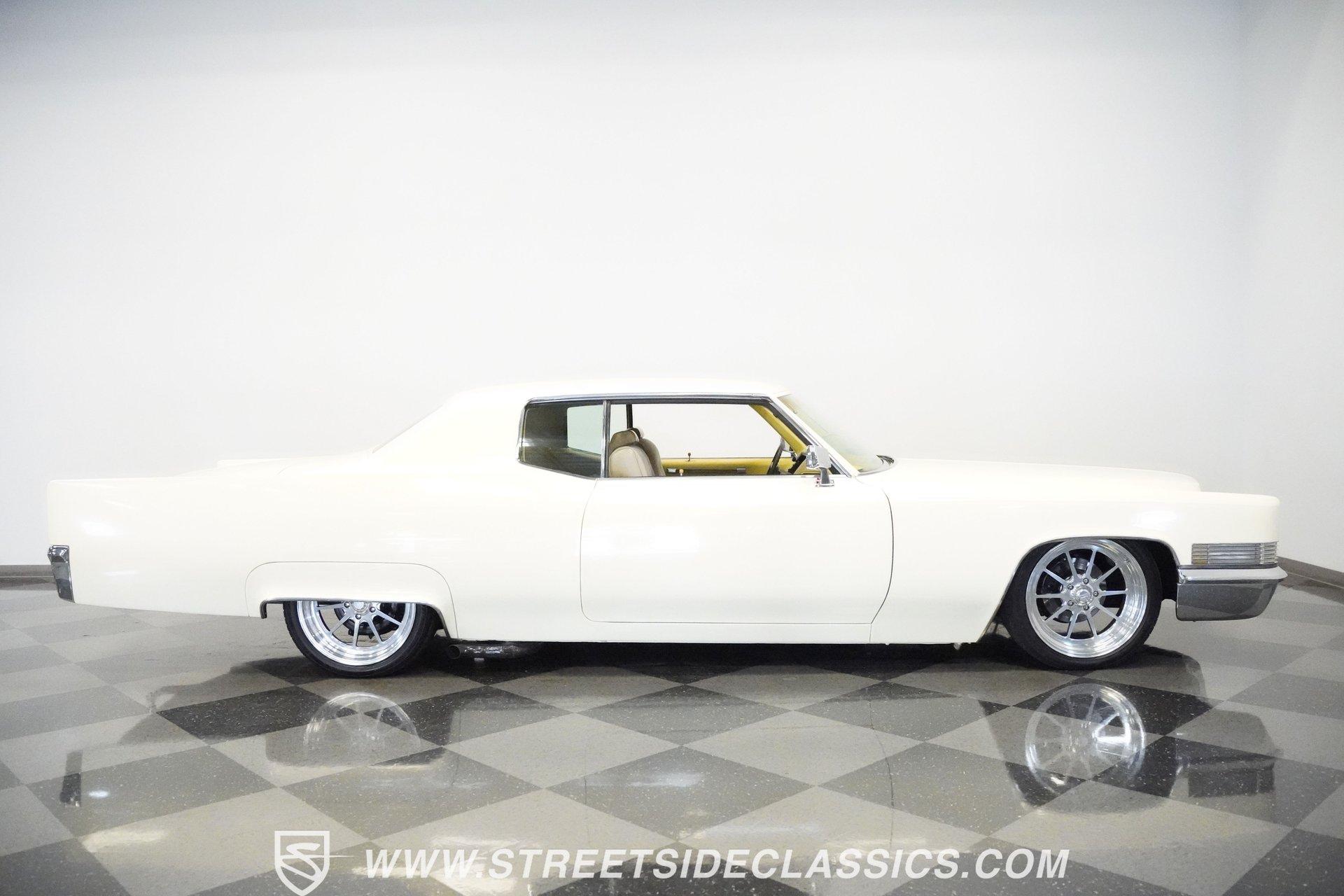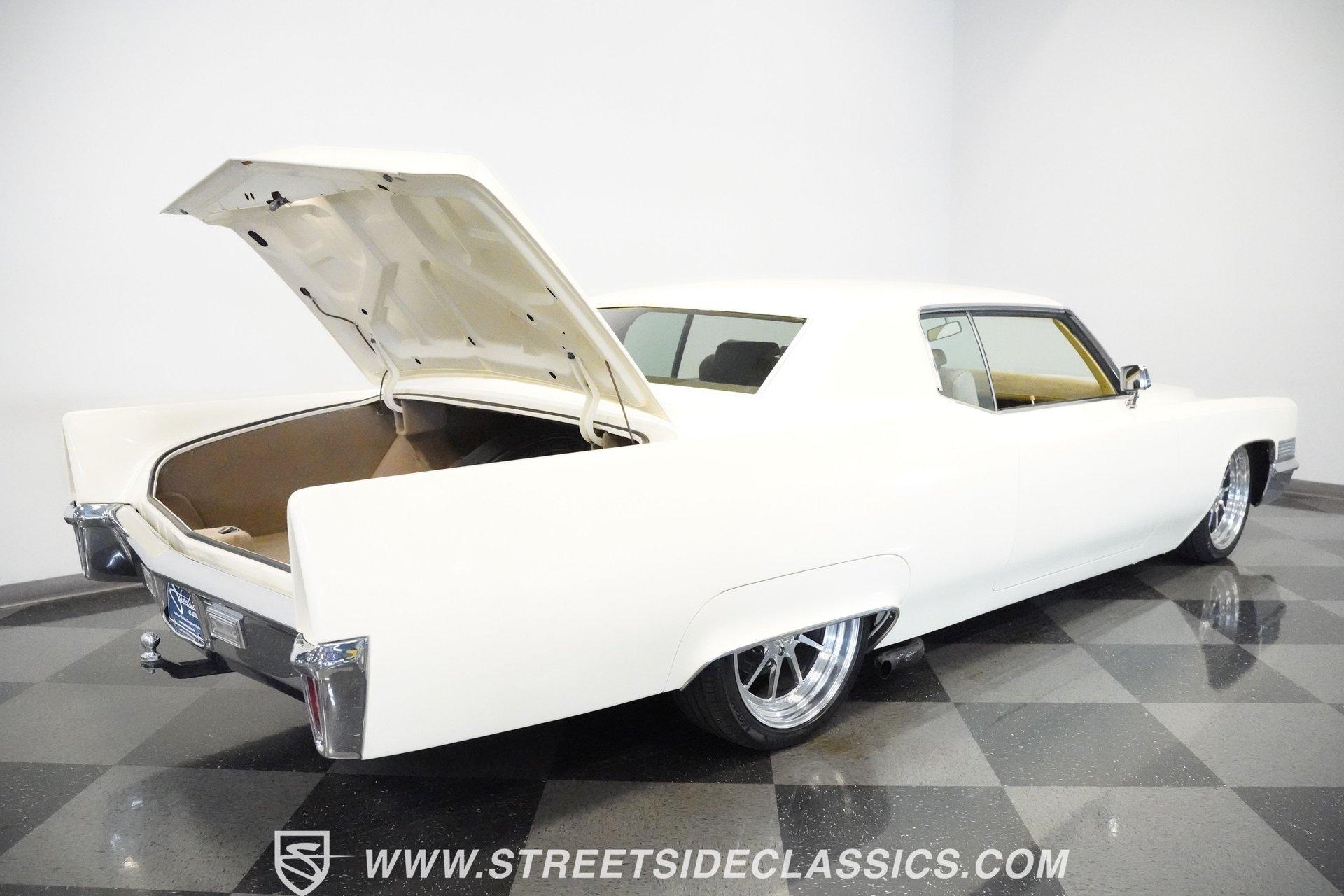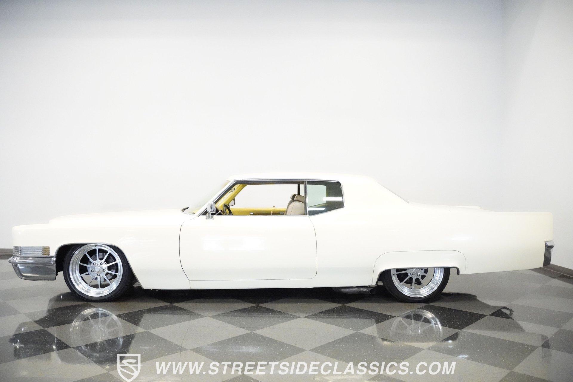 Massive and magnificent, Cadillac's flagship luxury cruiser rolls with undeniable authority. The 1970 Cadillac Coupe DeVille in Cotillion White displays the unmistakable long hood and short deck proportions that made these full-size luxury machines icons of American roads. Ten-spoke polished aluminum American Racing 20-inch wheels wrapped in 245/40ZR20 Lexani tires amplify the grand scale of this luxury coupe, creating a perfect blend of classic lines and custom flair. Tan vinyl covers the spacious bench seats inside this luxury cruiser, providing comfort for long highway journeys. A custom carpeted dash houses specialized gauges that give this DeVille a personalized touch while maintaining the upscale atmosphere. The wood console in back adds warmth to the cabin's design. Column shifting, power windows, and power locks provide convenience while the factory air conditioning keeps passengers cool. A power driver's seat and tilt wheel allow for ideal positioning behind the wheel. Cadillac's mighty 500 cubic inch V8 engine sits between the front fenders, connected to a TH200-4R 4-speed automatic transmission for effortless cruising. The factory hypoid rear axle puts power to the pavement through that polished wheel and tire combination. Power steering makes navigating this full-size luxury machine a breeze, while power disc brakes up front provide stopping capability. Glasspack style mufflers add a subtle rumble to the exhaust note without being excessive.