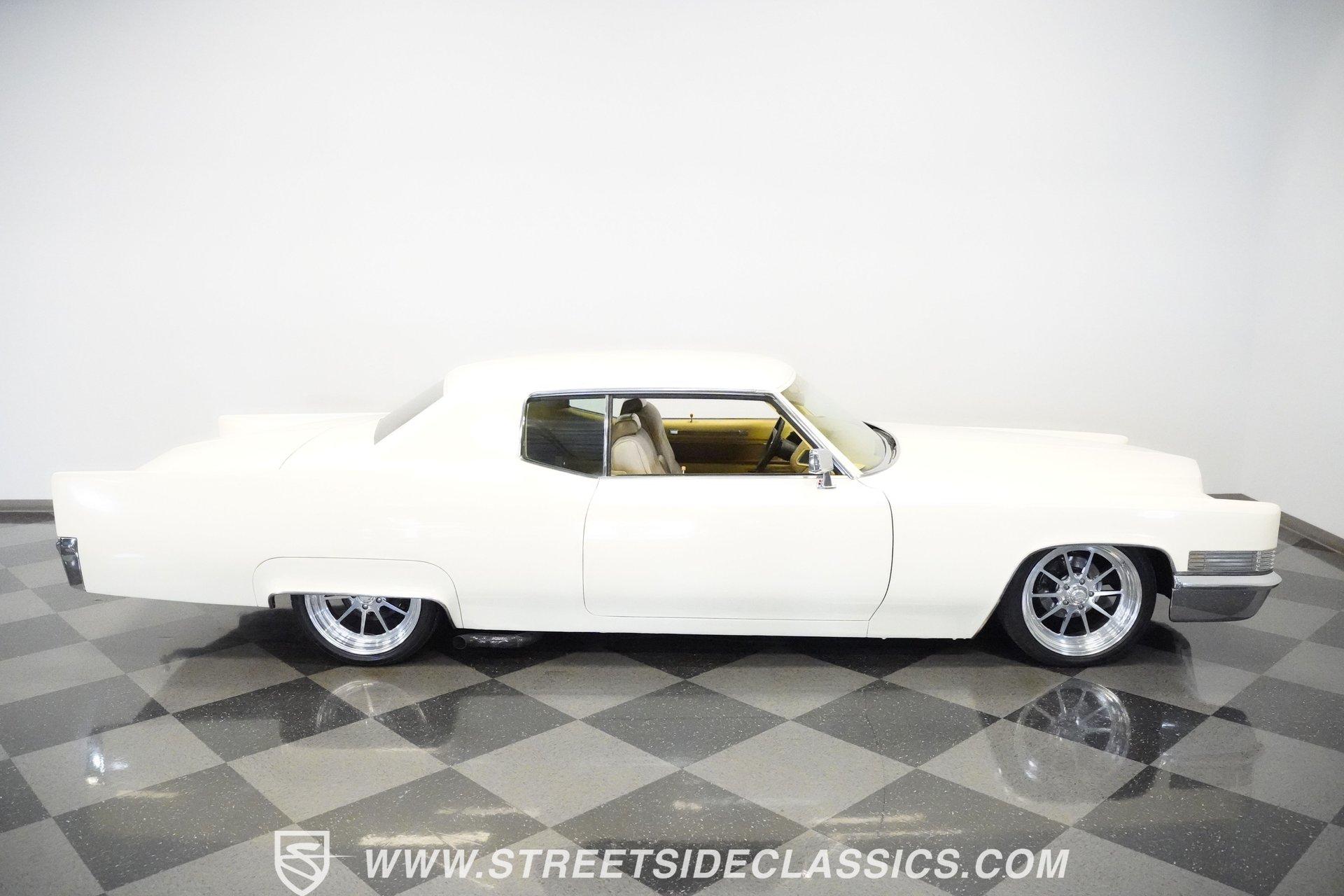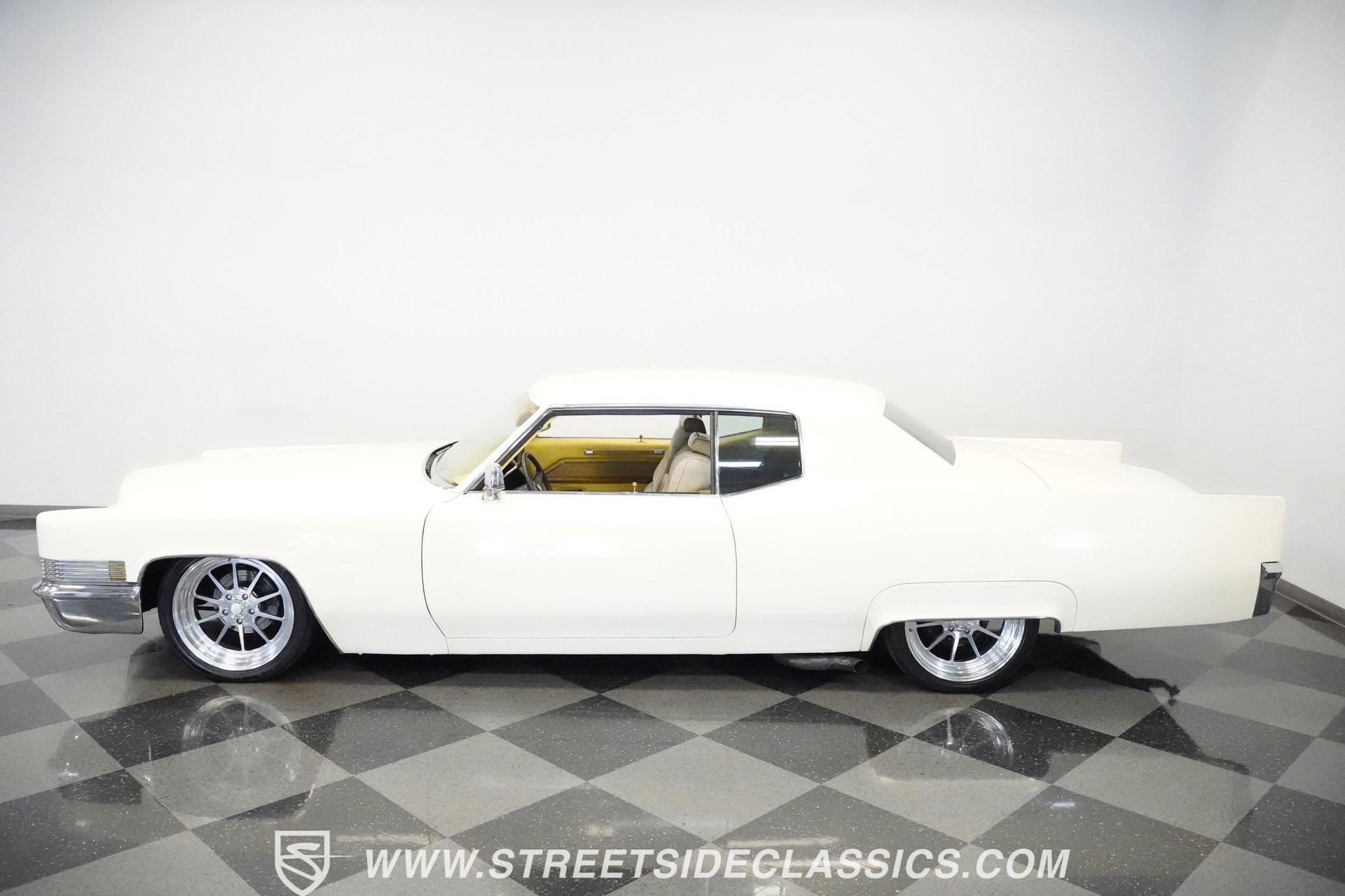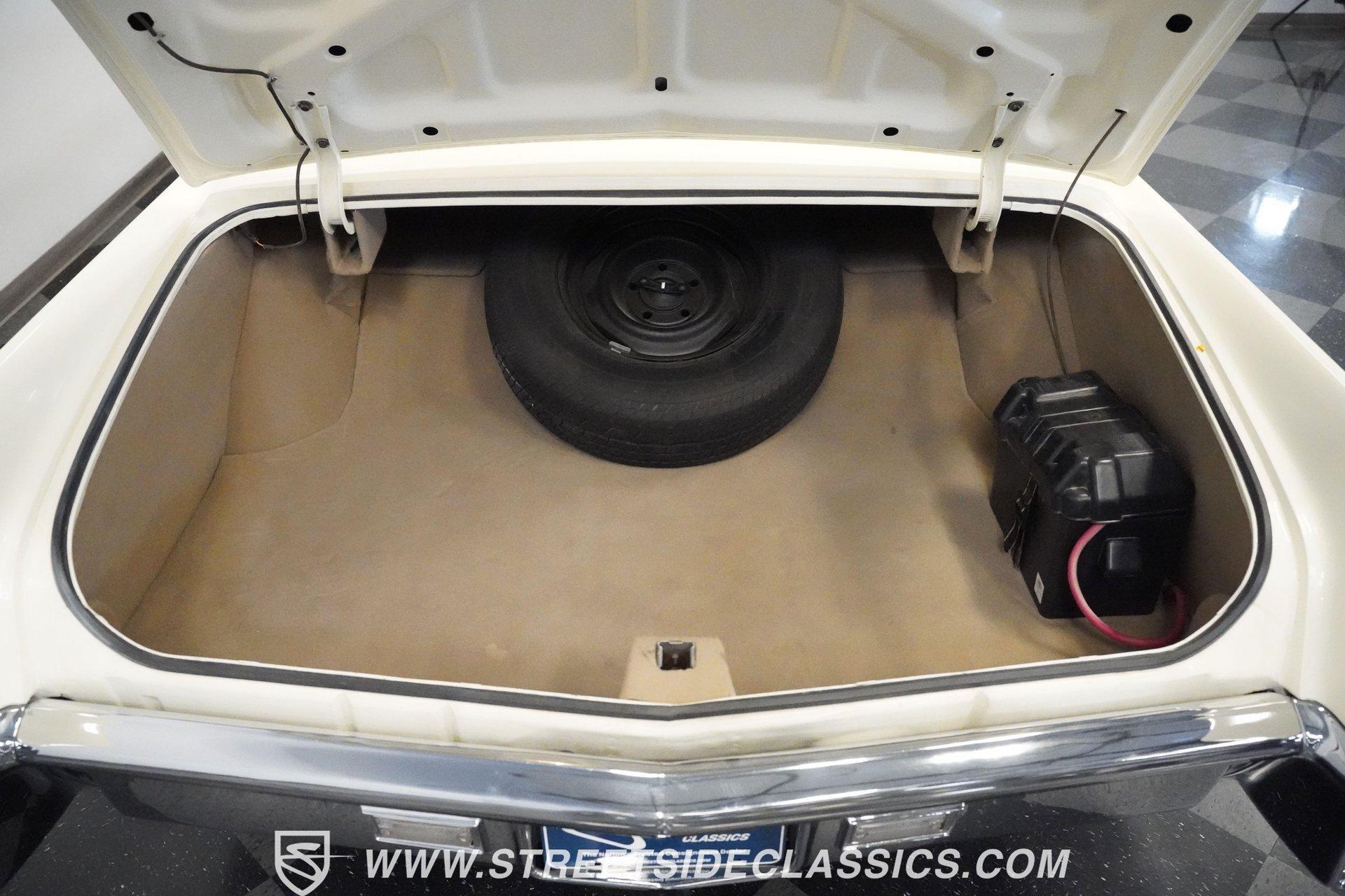 Massive and magnificent, Cadillac's flagship luxury cruiser rolls with undeniable authority. The 1970 Cadillac Coupe DeVille in Cotillion White displays the unmistakable long hood and short deck proportions that made these full-size luxury machines icons of American roads. Ten-spoke polished aluminum American Racing 20-inch wheels wrapped in 245/40ZR20 Lexani tires amplify the grand scale of this luxury coupe, creating a perfect blend of classic lines and custom flair. Tan vinyl covers the spacious bench seats inside this luxury cruiser, providing comfort for long highway journeys. A custom carpeted dash houses specialized gauges that give this DeVille a personalized touch while maintaining the upscale atmosphere. The wood console in back adds warmth to the cabin's design. Column shifting, power windows, and power locks provide convenience while the factory air conditioning keeps passengers cool. A power driver's seat and tilt wheel allow for ideal positioning behind the wheel. Cadillac's mighty 500 cubic inch V8 engine sits between the front fenders, connected to a TH200-4R 4-speed automatic transmission for effortless cruising. The factory hypoid rear axle puts power to the pavement through that polished wheel and tire combination. Power steering makes navigating this full-size luxury machine a breeze, while power disc brakes up front provide stopping capability. Glasspack style mufflers add a subtle rumble to the exhaust note without being excessive.