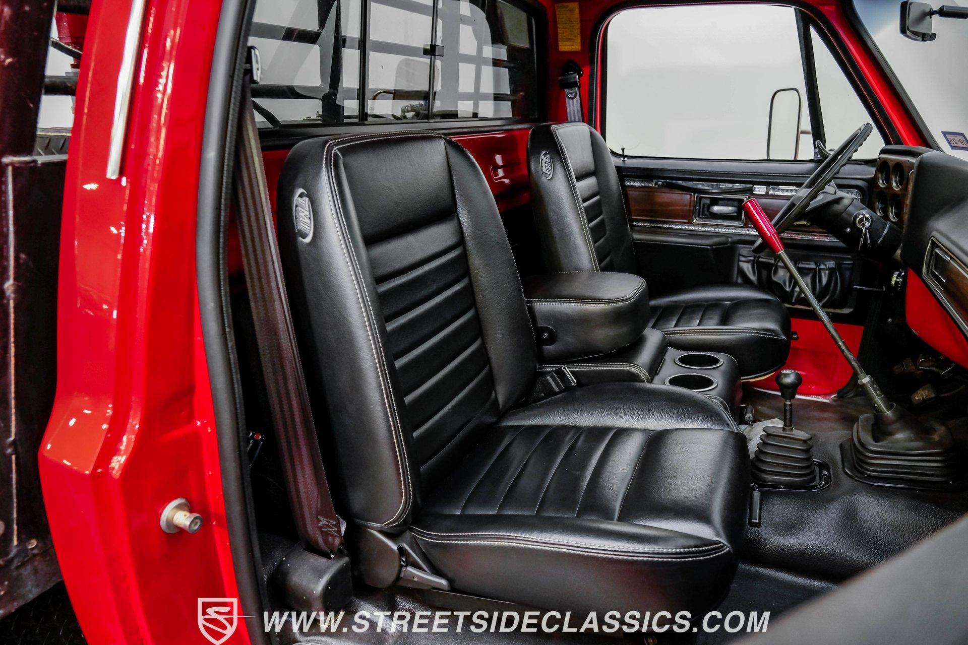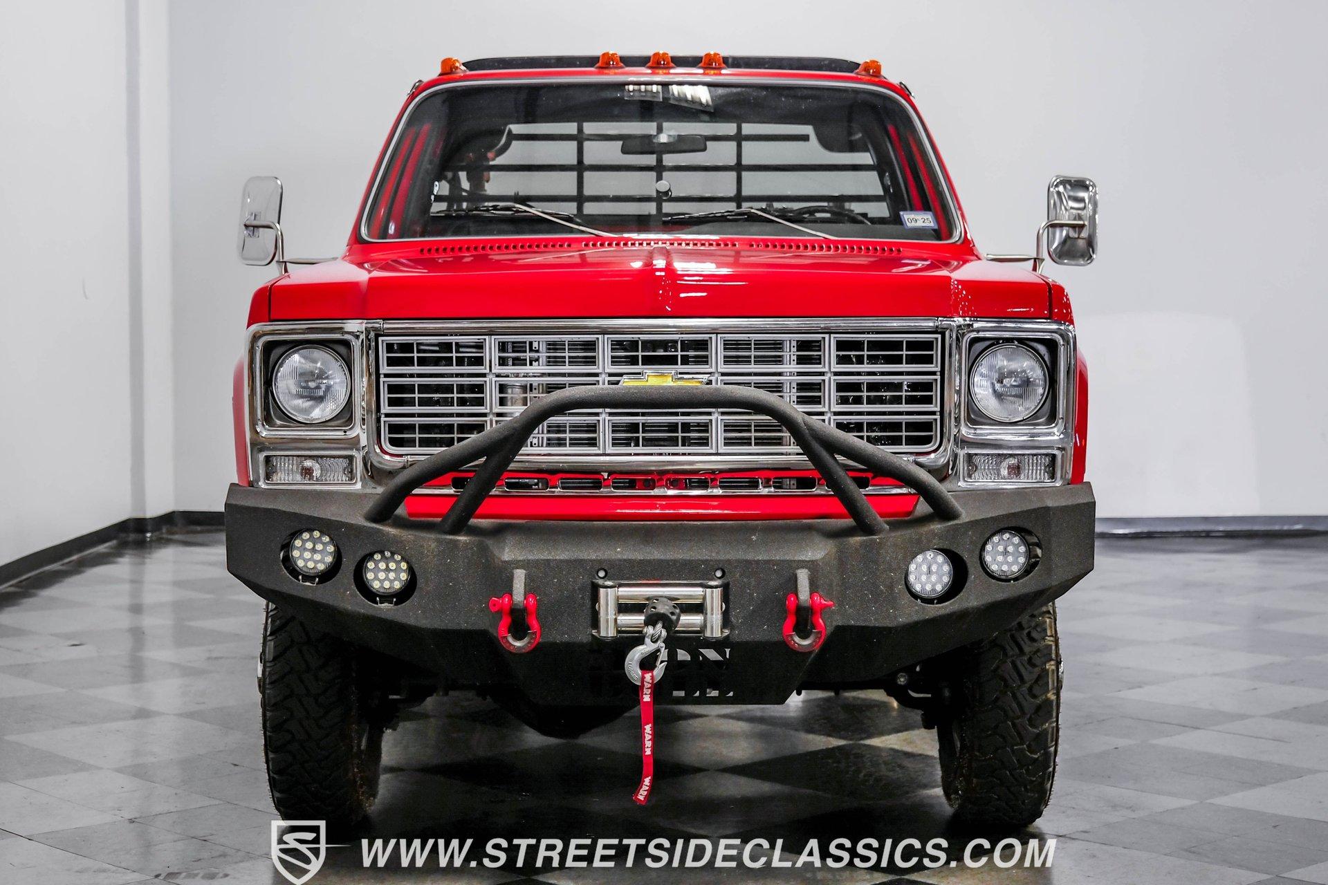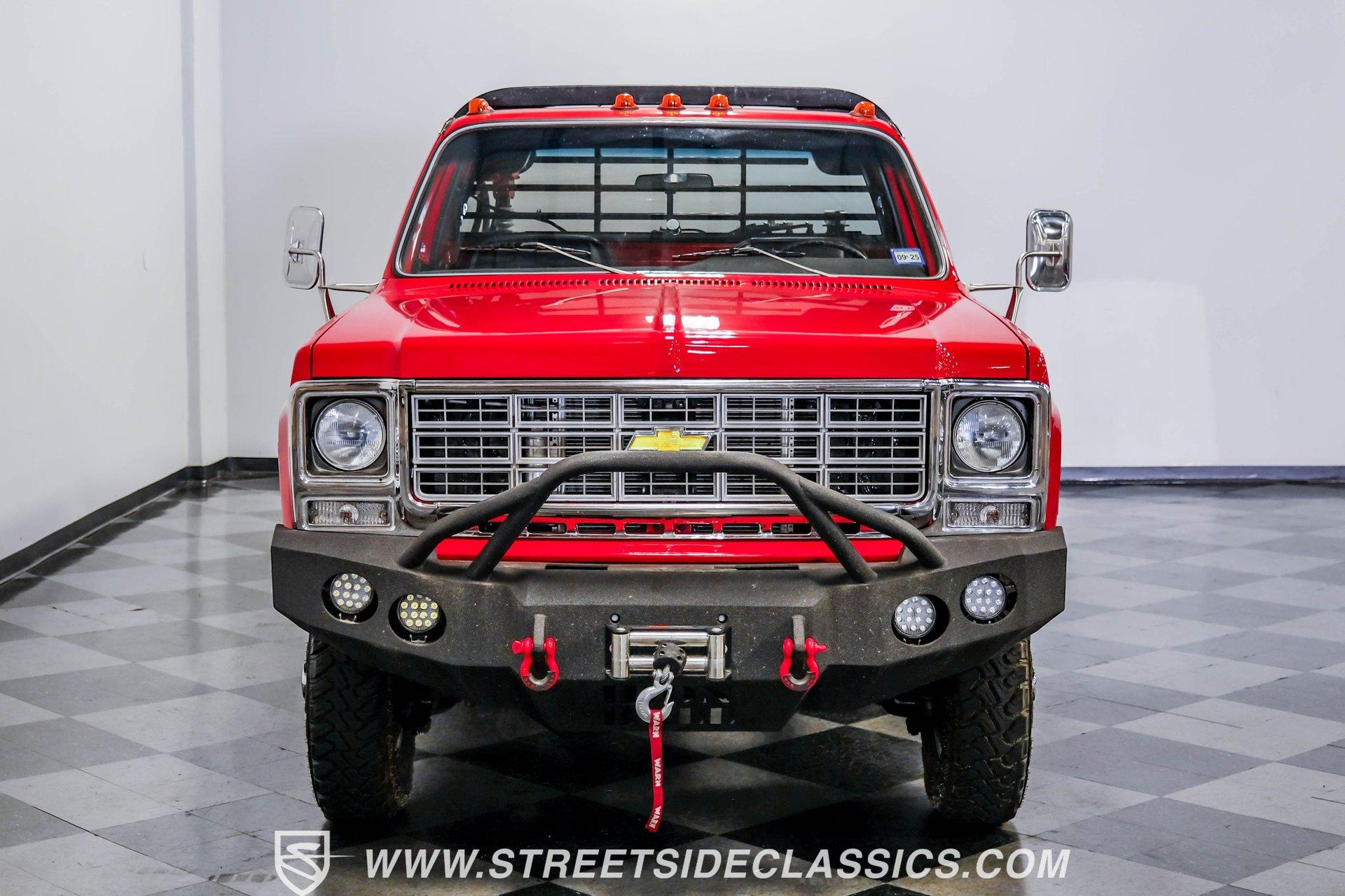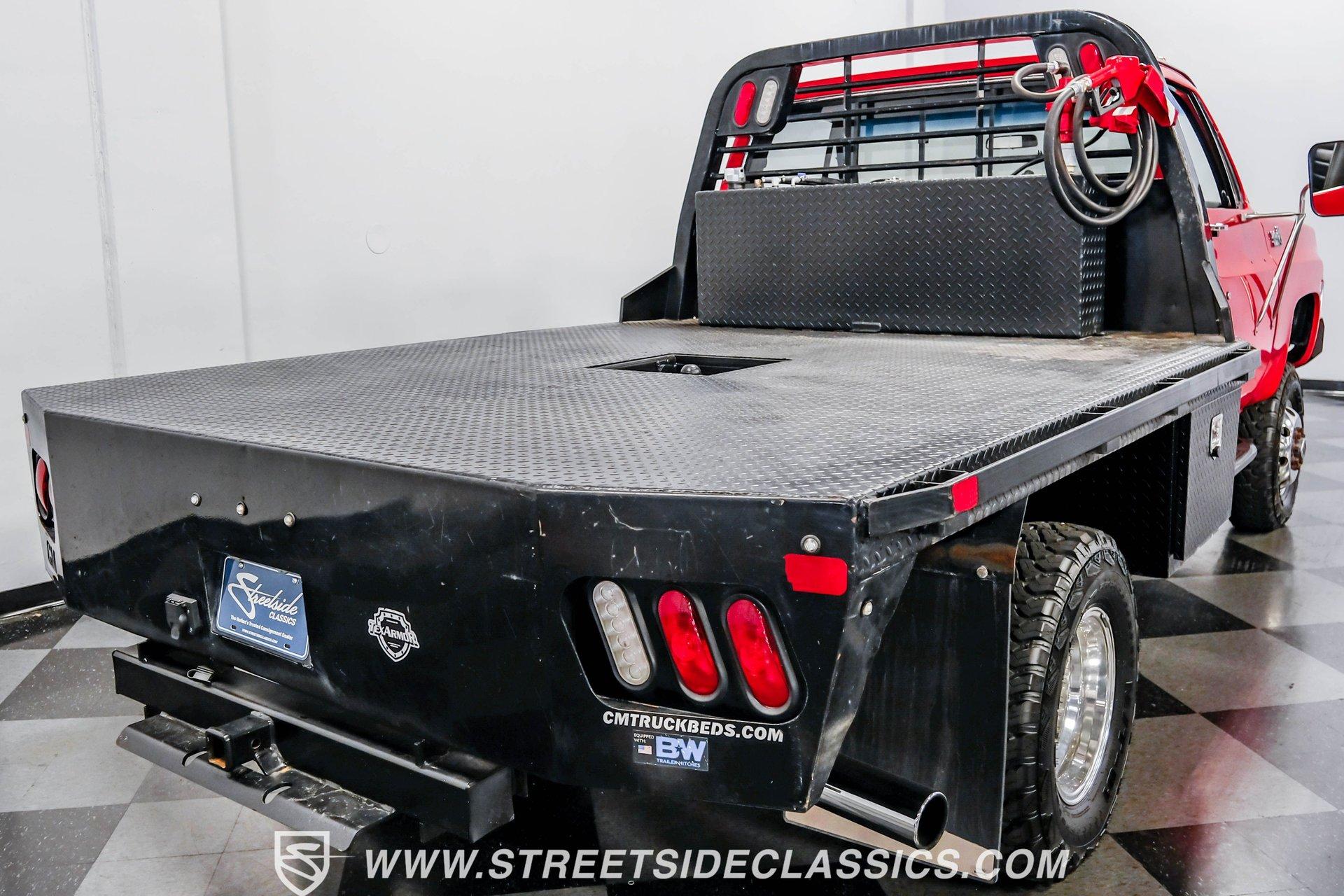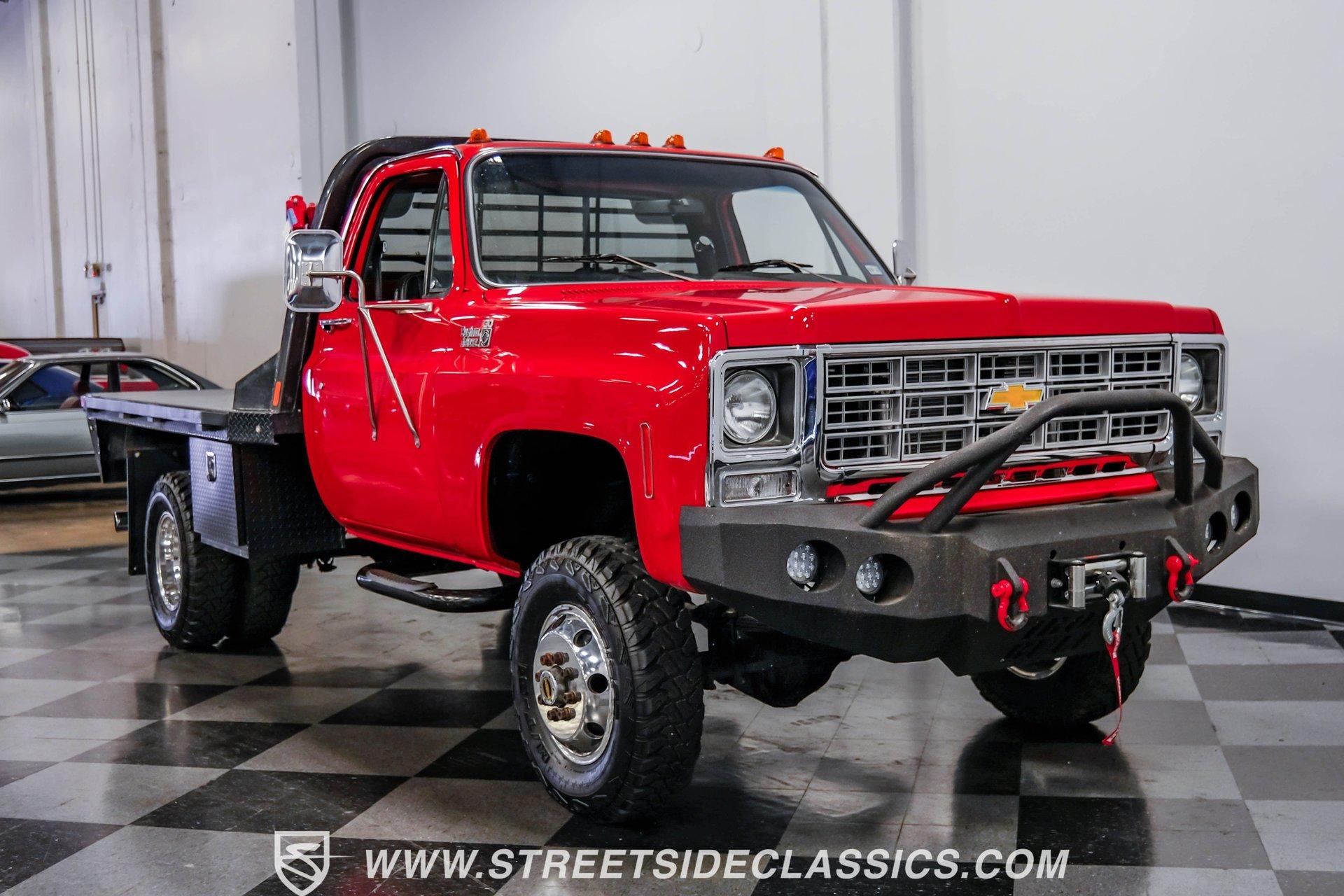From firetruck to formidable hauler, the 1979 Chevrolet K30 Custom Deluxe Flatbed Dually 4X4 has been transformed into a workhorse built for serious action. The red cab contrasts sharply against the black CM Truck Beds flatbed, creating a tough, no-excuses look. A 45-gallon RDS transfer tank sits ready for duty while the aftermarket front bumper houses fog lights and anchors a Warn 12,000-pound winch. The 16" wheels wrapped in 235/85R16 tires provide the stance and traction expected from a truck designed to conquer rough terrain. Black dominates the fully restored interior, centered around custom TMI bucket seats with a folding armrest that doubles as a functional console. The vinyl floor offers durability while the deluxe door cards add a touch of class. Vintage brand climate control keeps the cabin comfortable with ice-cold air conditioning for summer drives. A Custom Auto Sound AM/FM/AUX radio connected to an amp and Kicker subwoofer provides the soundtrack. The tilt steering column and custom gauges complete the driver-oriented cabin. The 350 V8 engine has just 1,330 miles since being rebuilt and breathes through an Edelbrock intake topped with an Edelbrock AVS2 carburetor. Power flows through an NV4500 5-speed manual transmission to both axles – a Dana 60 up front and 14-bolt rear – making this 4X4 ready for any challenge. Flowmaster dual exhaust with long tube headers provides the soundtrack while the aluminum radiator with electric fans keeps temperatures in check. Air-lift helper bags with onboard compressor support the rear suspension system. HIGHLIGHTS: 350 V8 Engine (1,330 Miles Since Built) NV4500 5-Speed Manual Transmission 4X4 Drivetrain Dana 60 Front / 14-Bolt Rear Axles Edelbrock AVS2 Carburetor Edelbrock Intake Manifold Flowmaster Dual Exhaust With Long Tube Headers Power Front Disc Brakes Aluminum Radiator With Electric Fans Billet Accessory Brackets Air-Lift Helper Bags With Onboard Compressor Red Cab With Black Flatbed 16" Wheels With 235/85R16 Tires 45 Gallon RDS Transfer Tank Aftermarket Front Bumper With Fog Lights Warn 12,000lb Winch Black Interior With TMI Custom Bucket Seats with Folding Armrests Vintage Brand Air Conditioning Custom Auto Sound AM/FM/AUX Radio Amp And Kicker Subwoofer Tilt Steering Column Power Steering Custom Gauges Deluxe Door Cards Trailer Brake System Fully restored with just 1,330 miles on the clock, this 1979 Chevrolet K30 Custom Deluxe Flatbed Dually 4X4 offers everything needed for work or play. From its burly exterior to its comfortable interior and potent drivetrain, every aspect has been carefully addressed to create a truck that's both capable and enjoyable. Call today!