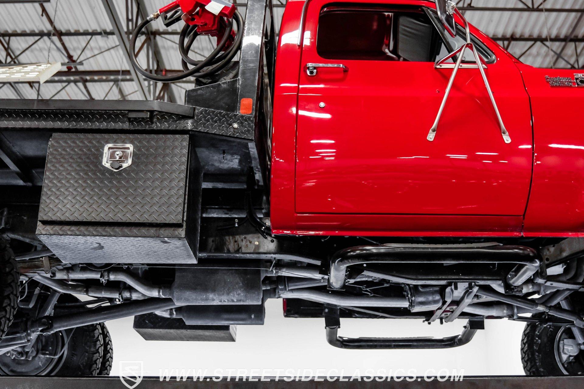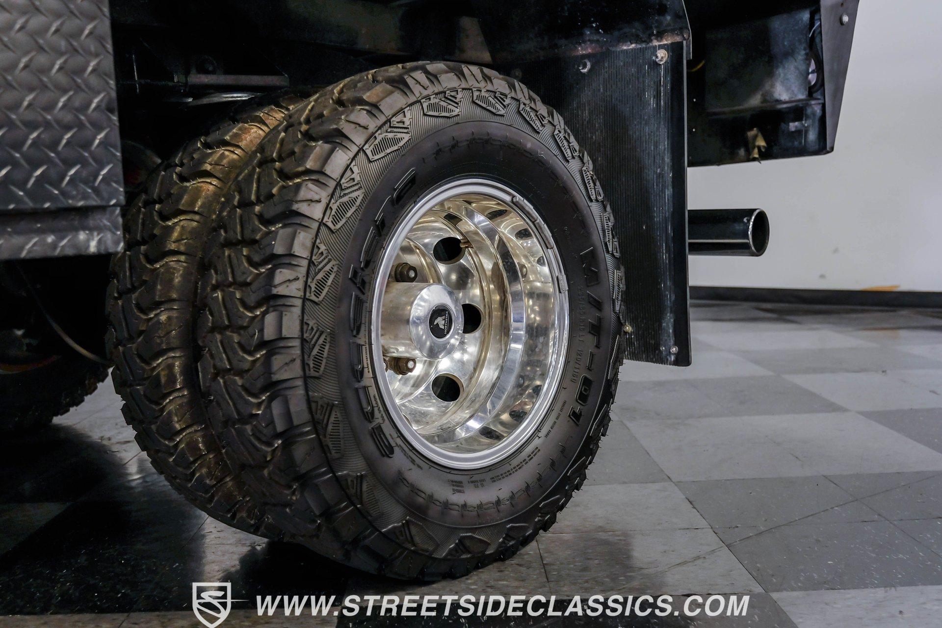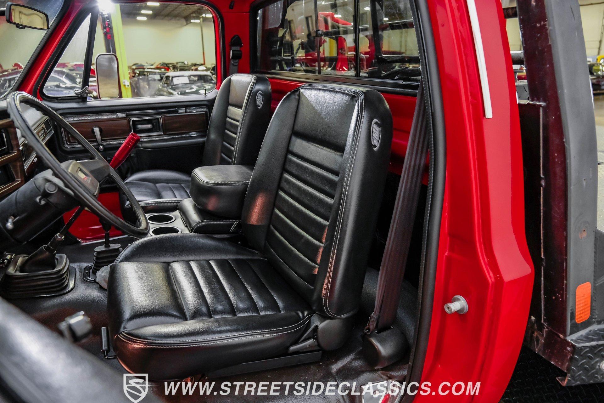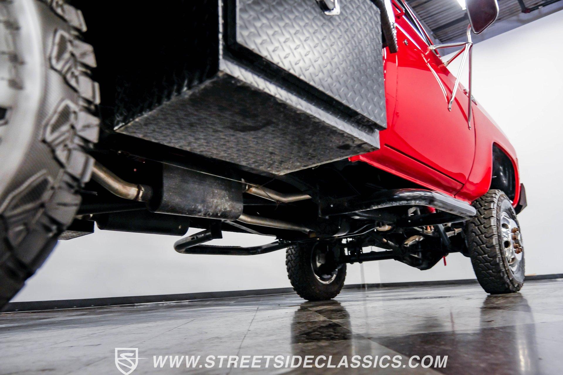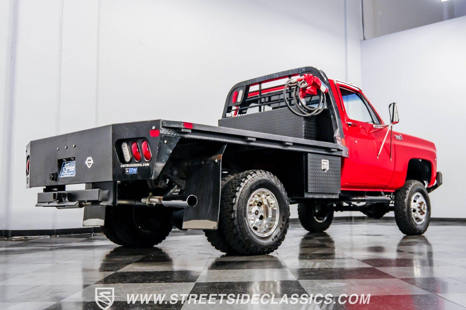 From firetruck to formidable hauler, the 1979 Chevrolet K30 Custom Deluxe Flatbed Dually 4X4 has been transformed into a workhorse built for serious action. The red cab contrasts sharply against the black CM Truck Beds flatbed, creating a tough, no-excuses look. A 45-gallon RDS transfer tank sits ready for duty while the aftermarket front bumper houses fog lights and anchors a Warn 12,000-pound winch. The 16" wheels wrapped in 235/85R16 tires provide the stance and traction expected from a truck designed to conquer rough terrain. Black dominates the fully restored interior, centered around custom TMI bucket seats with a folding armrest that doubles as a functional console. The vinyl floor offers durability while the deluxe door cards add a touch of class. Vintage brand climate control keeps the cabin comfortable with ice-cold air conditioning for summer drives. A Custom Auto Sound AM/FM/AUX radio connected to an amp and Kicker subwoofer provides the soundtrack. The tilt steering column and custom gauges complete the driver-oriented cabin. The 350 V8 engine has just 1,330 miles since being rebuilt and breathes through an Edelbrock intake topped with an Edelbrock AVS2 carburetor. Power flows through an NV4500 5-speed manual transmission to both axles – a Dana 60 up front and 14-bolt rear – making this 4X4 ready for any challenge. Flowmaster dual exhaust with long tube headers provides the soundtrack while the aluminum radiator with electric fans keeps temperatures in check. Air-lift helper bags with onboard compressor support the rear suspension system. HIGHLIGHTS: 350 V8 Engine (1,330 Miles Since Built) NV4500 5-Speed Manual Transmission 4X4 Drivetrain Dana 60 Front / 14-Bolt Rear Axles Edelbrock AVS2 Carburetor Edelbrock Intake Manifold Flowmaster Dual Exhaust With Long Tube Headers Power Front Disc Brakes Aluminum Radiator With Electric Fans Billet Accessory Brackets Air-Lift Helper Bags With Onboard Compressor Red Cab With Black Flatbed 16" Wheels With 235/85R16 Tires 45 Gallon RDS Transfer Tank Aftermarket Front Bumper With Fog Lights Warn 12,000lb Winch Black Interior With TMI Custom Bucket Seats with Folding Armrests Vintage Brand Air Conditioning Custom Auto Sound AM/FM/AUX Radio Amp And Kicker Subwoofer Tilt Steering Column Power Steering Custom Gauges Deluxe Door Cards Trailer Brake System Fully restored with just 1,330 miles on the clock, this 1979 Chevrolet K30 Custom Deluxe Flatbed Dually 4X4 offers everything needed for work or play. From its burly exterior to its comfortable interior and potent drivetrain, every aspect has been carefully addressed to create a truck that's both capable and enjoyable. Call today!