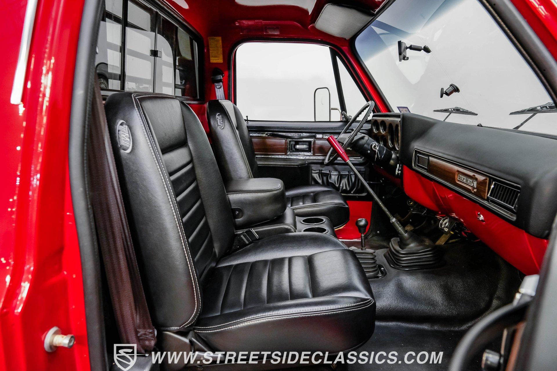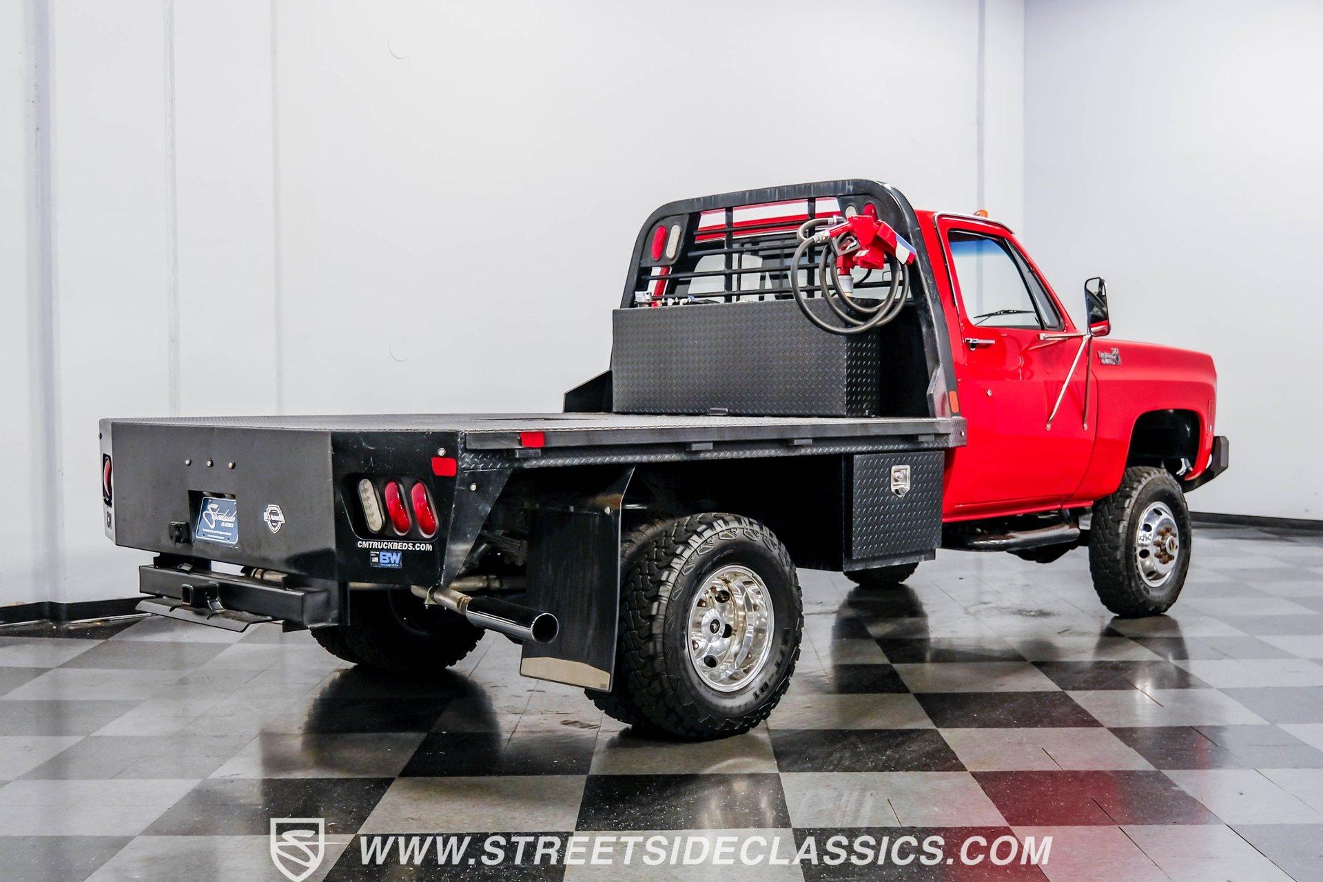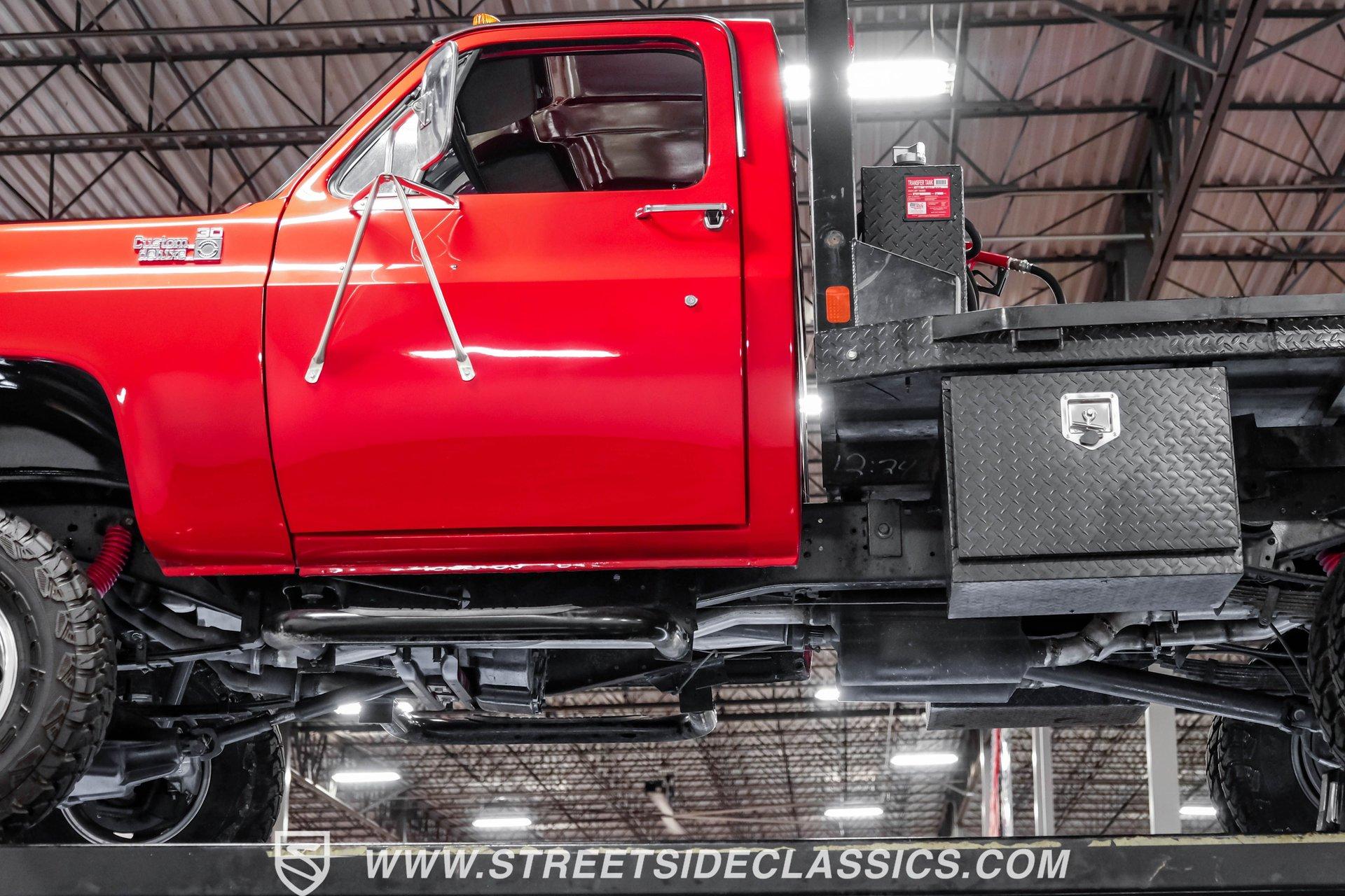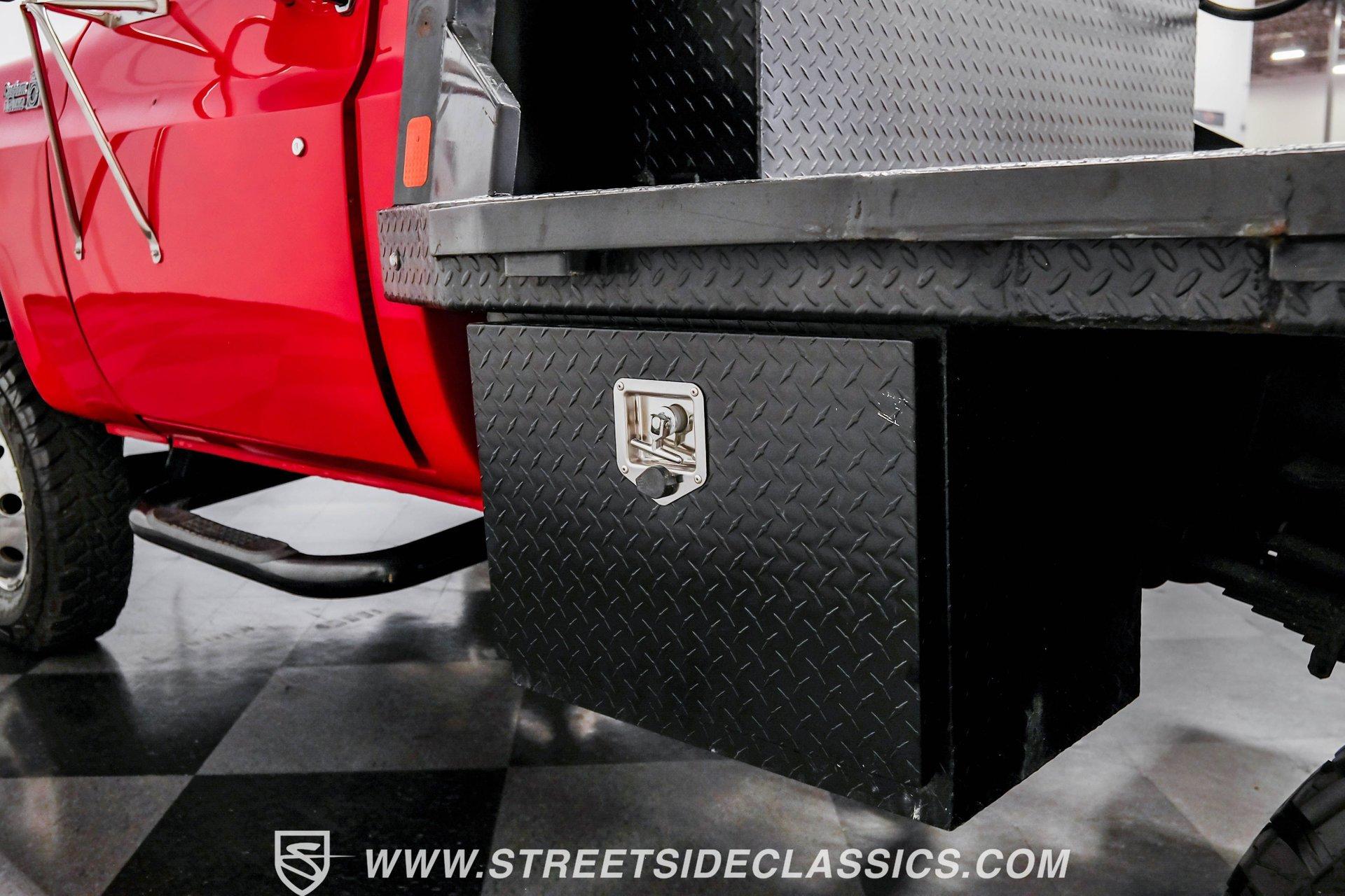 From firetruck to formidable hauler, the 1979 Chevrolet K30 Custom Deluxe Flatbed Dually 4X4 has been transformed into a workhorse built for serious action. The red cab contrasts sharply against the black CM Truck Beds flatbed, creating a tough, no-excuses look. A 45-gallon RDS transfer tank sits ready for duty while the aftermarket front bumper houses fog lights and anchors a Warn 12,000-pound winch. The 16" wheels wrapped in 235/85R16 tires provide the stance and traction expected from a truck designed to conquer rough terrain. Black dominates the fully restored interior, centered around custom TMI bucket seats with a folding armrest that doubles as a functional console. The vinyl floor offers durability while the deluxe door cards add a touch of class. Vintage brand climate control keeps the cabin comfortable with ice-cold air conditioning for summer drives. A Custom Auto Sound AM/FM/AUX radio connected to an amp and Kicker subwoofer provides the soundtrack. The tilt steering column and custom gauges complete the driver-oriented cabin. The 350 V8 engine has just 1,330 miles since being rebuilt and breathes through an Edelbrock intake topped with an Edelbrock AVS2 carburetor. Power flows through an NV4500 5-speed manual transmission to both axles – a Dana 60 up front and 14-bolt rear – making this 4X4 ready for any challenge. Flowmaster dual exhaust with long tube headers provides the soundtrack while the aluminum radiator with electric fans keeps temperatures in check. Air-lift helper bags with onboard compressor support the rear suspension system. HIGHLIGHTS: 350 V8 Engine (1,330 Miles Since Built) NV4500 5-Speed Manual Transmission 4X4 Drivetrain Dana 60 Front / 14-Bolt Rear Axles Edelbrock AVS2 Carburetor Edelbrock Intake Manifold Flowmaster Dual Exhaust With Long Tube Headers Power Front Disc Brakes Aluminum Radiator With Electric Fans Billet Accessory Brackets Air-Lift Helper Bags With Onboard Compressor Red Cab With Black Flatbed 16" Wheels With 235/85R16 Tires 45 Gallon RDS Transfer Tank Aftermarket Front Bumper With Fog Lights Warn 12,000lb Winch Black Interior With TMI Custom Bucket Seats with Folding Armrests Vintage Brand Air Conditioning Custom Auto Sound AM/FM/AUX Radio Amp And Kicker Subwoofer Tilt Steering Column Power Steering Custom Gauges Deluxe Door Cards Trailer Brake System Fully restored with just 1,330 miles on the clock, this 1979 Chevrolet K30 Custom Deluxe Flatbed Dually 4X4 offers everything needed for work or play. From its burly exterior to its comfortable interior and potent drivetrain, every aspect has been carefully addressed to create a truck that's both capable and enjoyable. Call today!