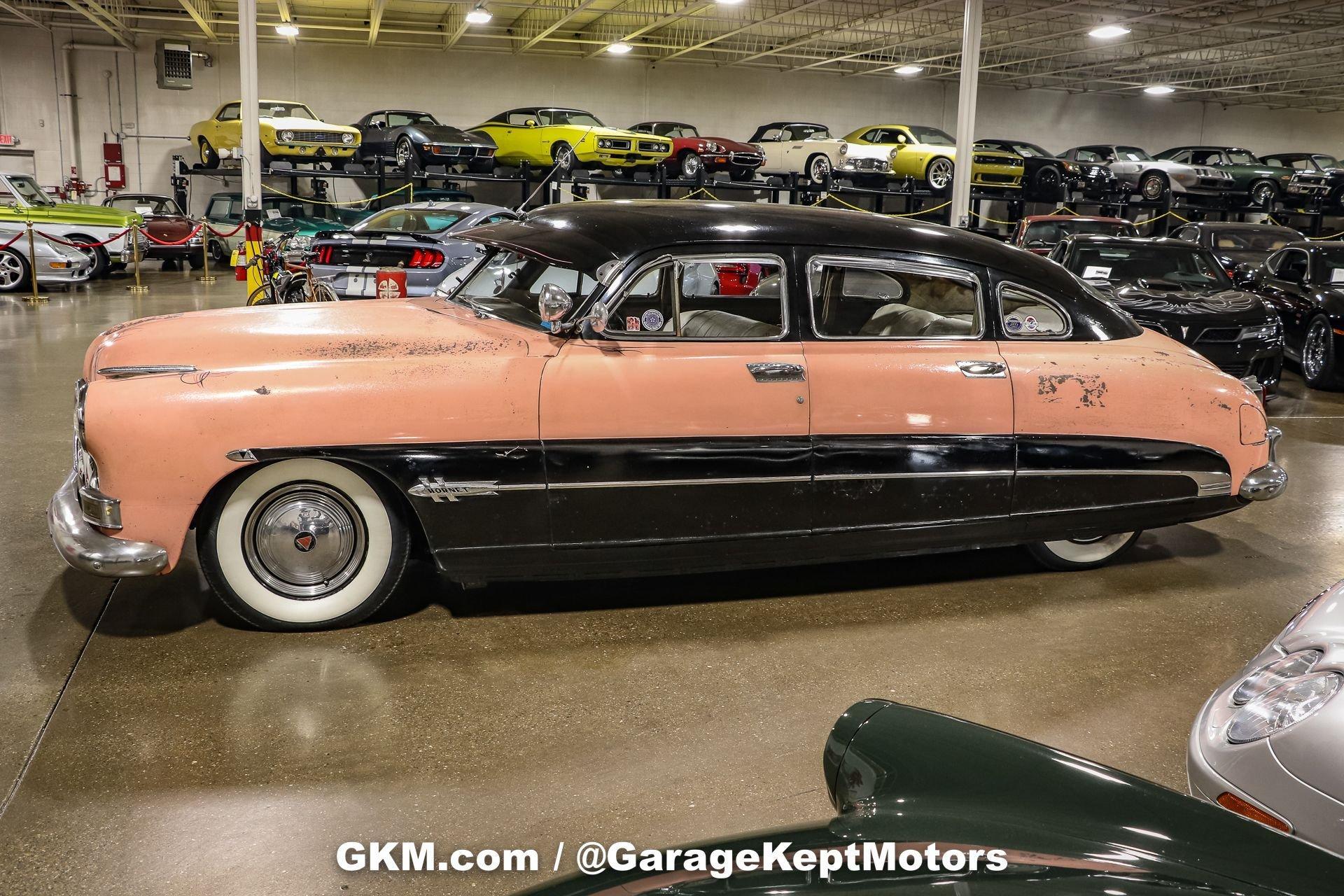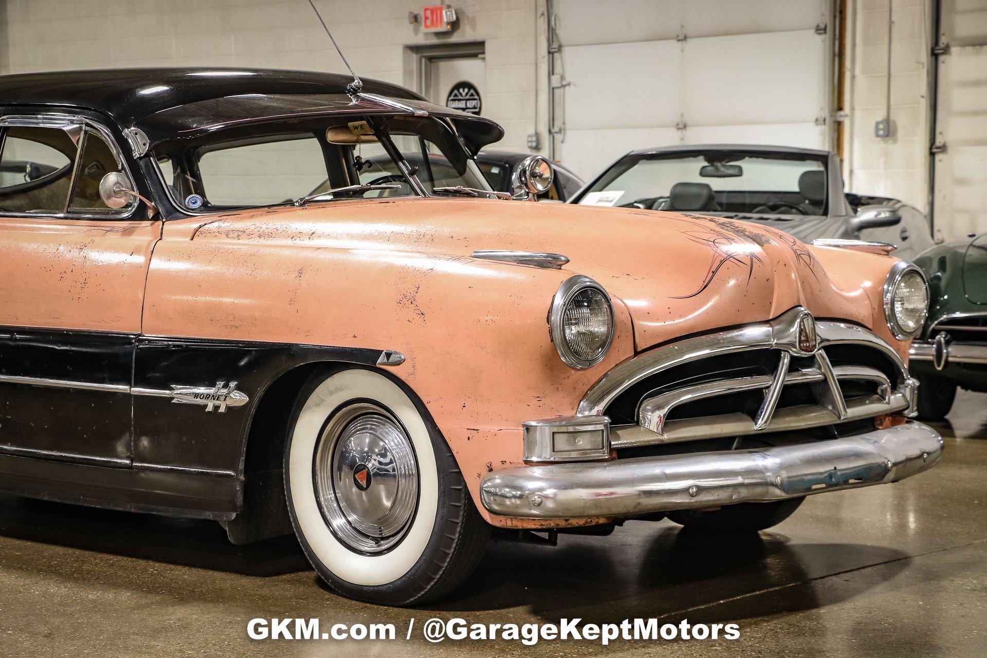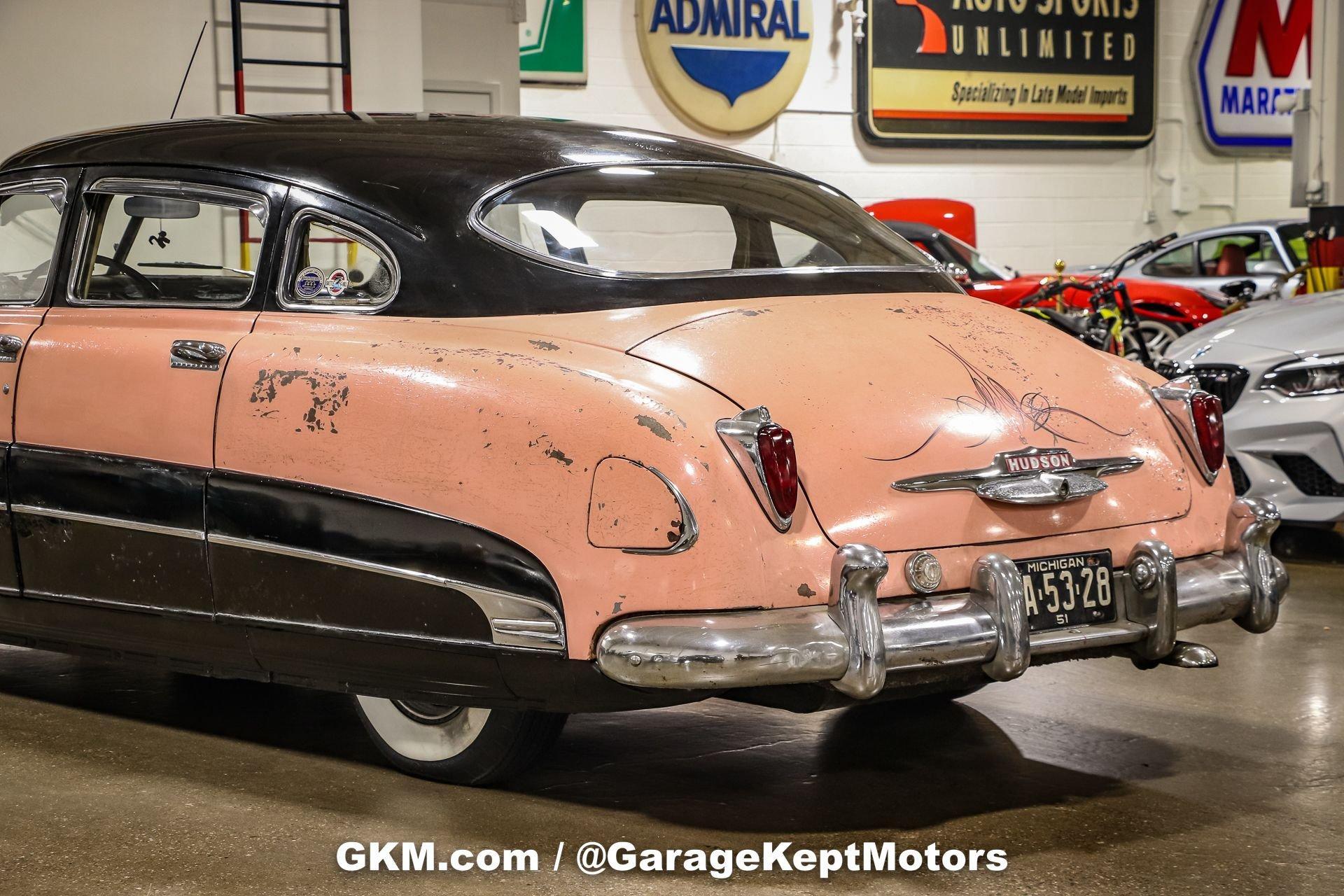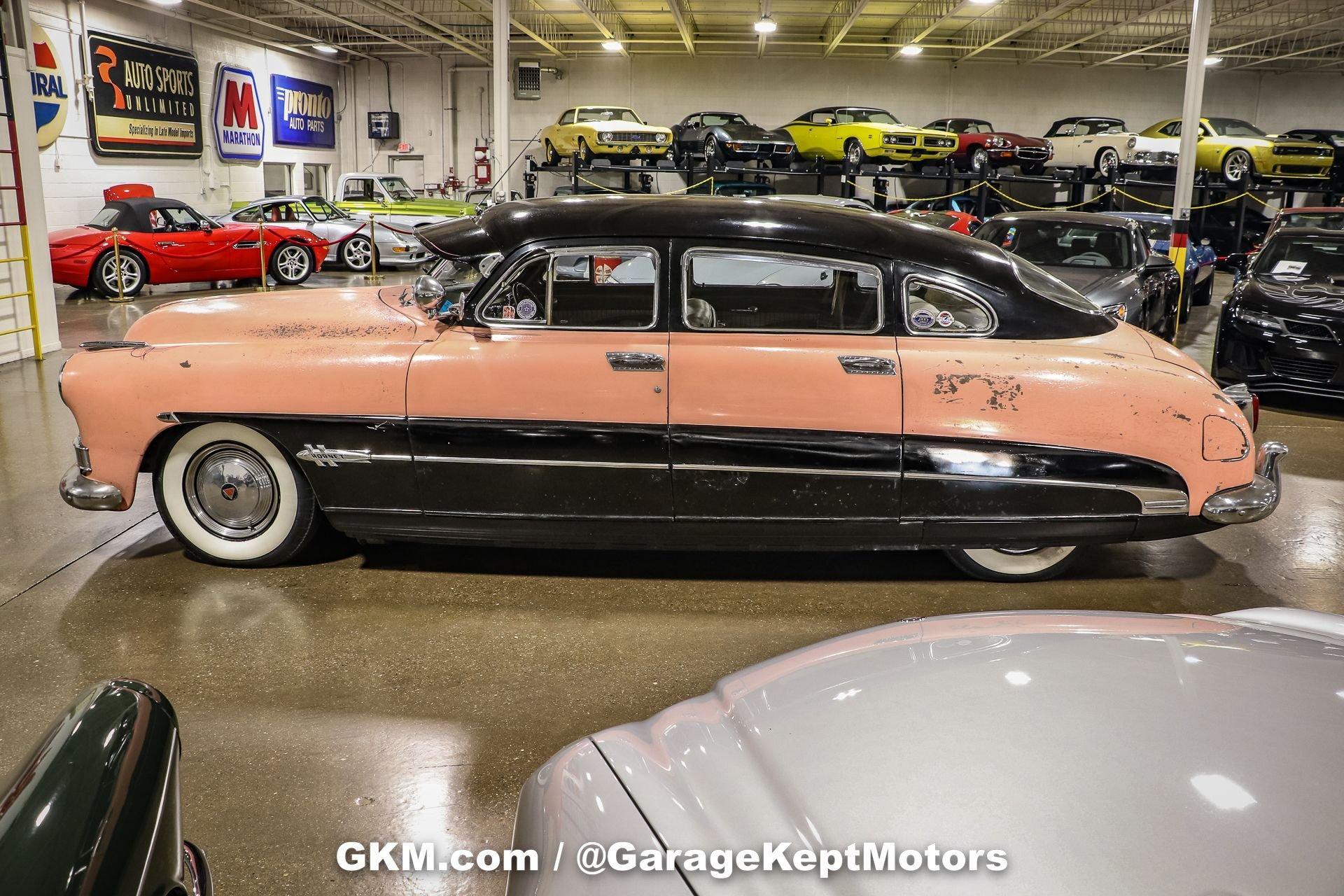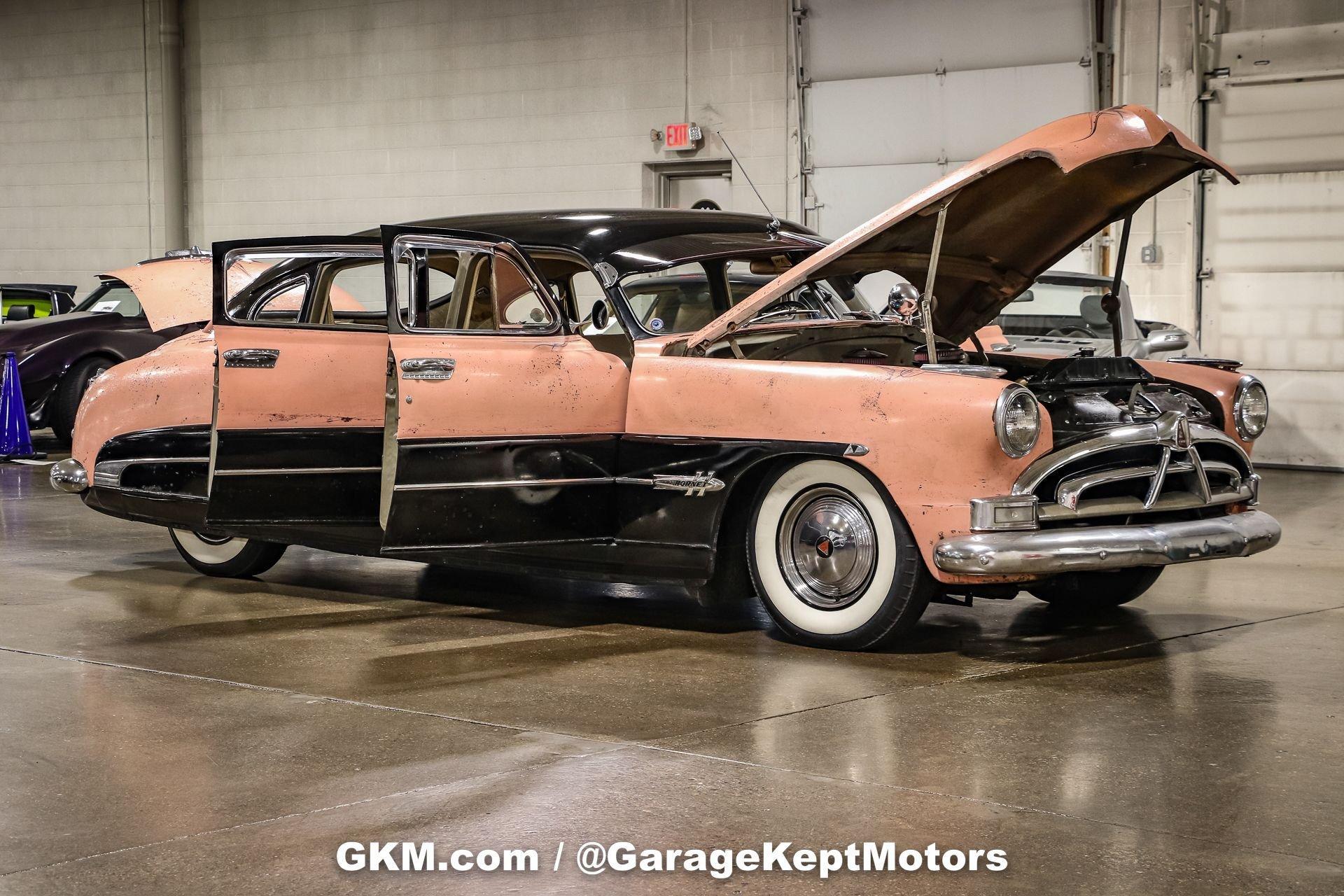 1951 Hudson Hornet- Originally Modified in 1958- Stored In 1960 Until 2011- Restored In 2018- 1956 308ci Inline 6- 262 Head- Mild Cam- Twin Intake- Clifford Headers And New Exhaust- Pink and Black Exterior- Original White InteriorFeatured here is a 1951 Hudson Hornet that is an amazing barn find and a true time capsule of the car culture of the 1950's. This car was originally modified in 1958 and two years later was put into storage in 1960. Emerging from a 51-year slumber in 2011 this classic cruiser went through a mechanical restoration with meticulous care and attention to preserve this car's appearance in its as-found condition. The pink and black two-tone paint is a classic 50's color combination on this four-door Hudson. The finish is unrestored representing the condition it was in when pulled from storage and preserved. The hand-painted pinstripe throughout the body is a classic touch and compliments the base paint job. The chrome bumpers and related trim are all original showing pitting and are rich in patina. The trunk compartment is unrestored featuring the original rubber floor mat with the spare tire and jack tools all present. The trunk floor is well preserved no doubt due to the rubber coating applied 60-some years ago keeping the metal free of any rust-through. The front windshield visor and stainless side-window visors with the driver's side-mounted searchlight are classic 50's era owner add-ons. In the case of this Hornet these subtle touches accentuate the sleek body lines and the lowered stance on this classic. Opening the doors on this Hudson is like opening a portal to the past that takes you back to a time when dashboards were pieces of art adorned in chrome and ivory. The interior is all original and has simply been cleaned. The original upholstery is present and in good condition showing some light wear but no rips or tears. The seat insert fabric and door panels as well as the rear grab rail are great examples of the formal quality of car interiors that was so rich during this time period. The dash cluster has a heavy Art Deco influence with an oversized speedometer and clock framing fuel and temperature gauges and oil and amp indicator lights and plenty of chrome accouterments. The Motorola AM radio is still present and looking at it you can almost hear the classic doo-whoop music coming from the speaker. Under the hood the original engine was replaced with a larger 1956 Hudson 308cid inline 6-cylinder with a 262 cylinder head and the powerplant was gone through during the restoration process. Era-correct performance upgrades include a mild camshaft Hudson dual carburetor intake and Clifford Performance header that flows into a new exhaust with a glass-packed bullet-style muffler. Power is transferred through a column-shifted 3-speed manual transmission. Underneath the frame and underbody are unrestored however the frame and floorboards are clean with no signs of any rust-through issues. The lowered stance was accomplished using lowering blocks on the rear leaf springs and lowered front springs with new shocks on all four corners. The brakes have been rebuilt including new lines and rubber hoses. This car is truly amazing in its capturing the car culture of the time and is turn-key ready for cruising to share it with other enthusiasts. Please call if interested or e-mail with specific questions. Thanks for looking.
