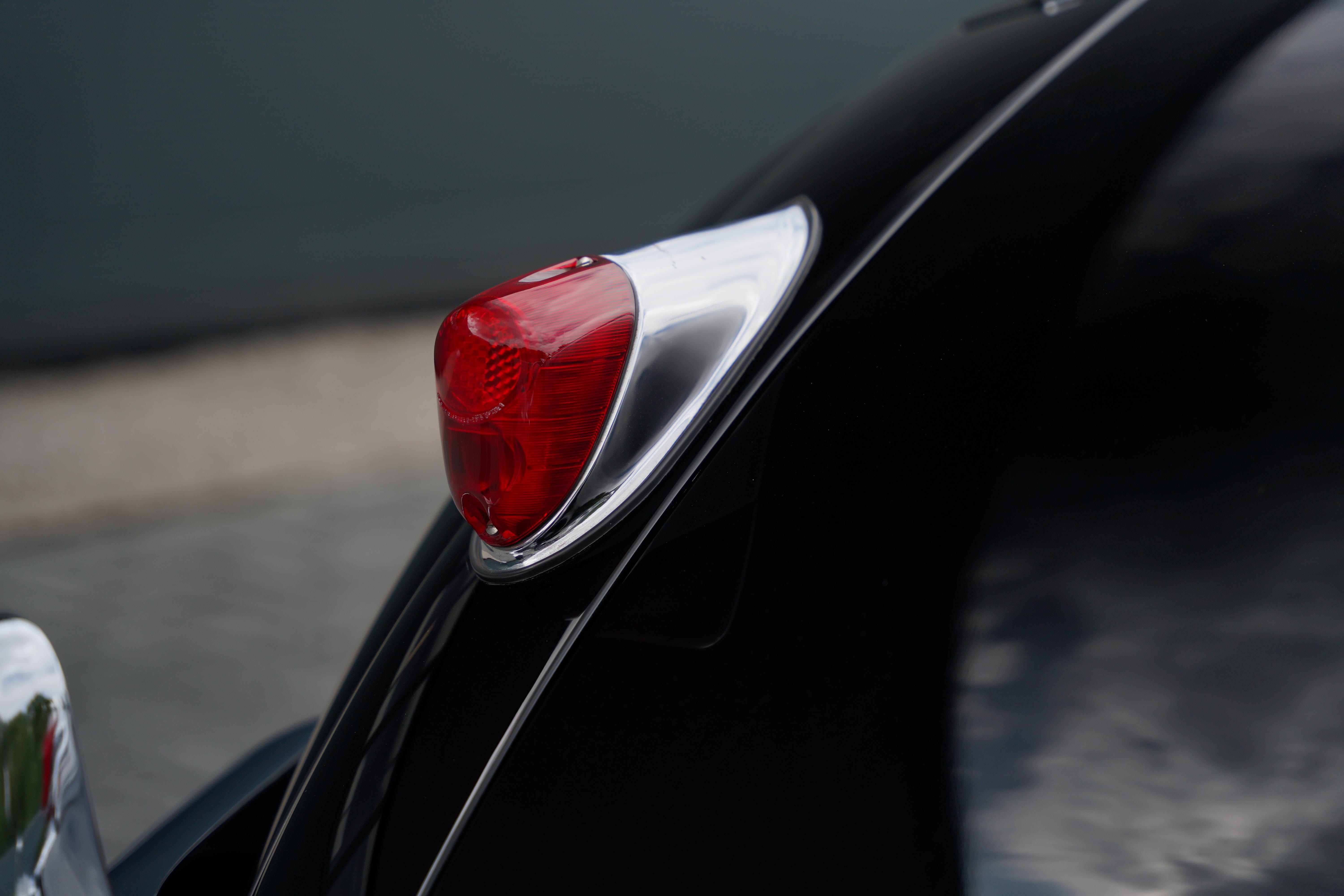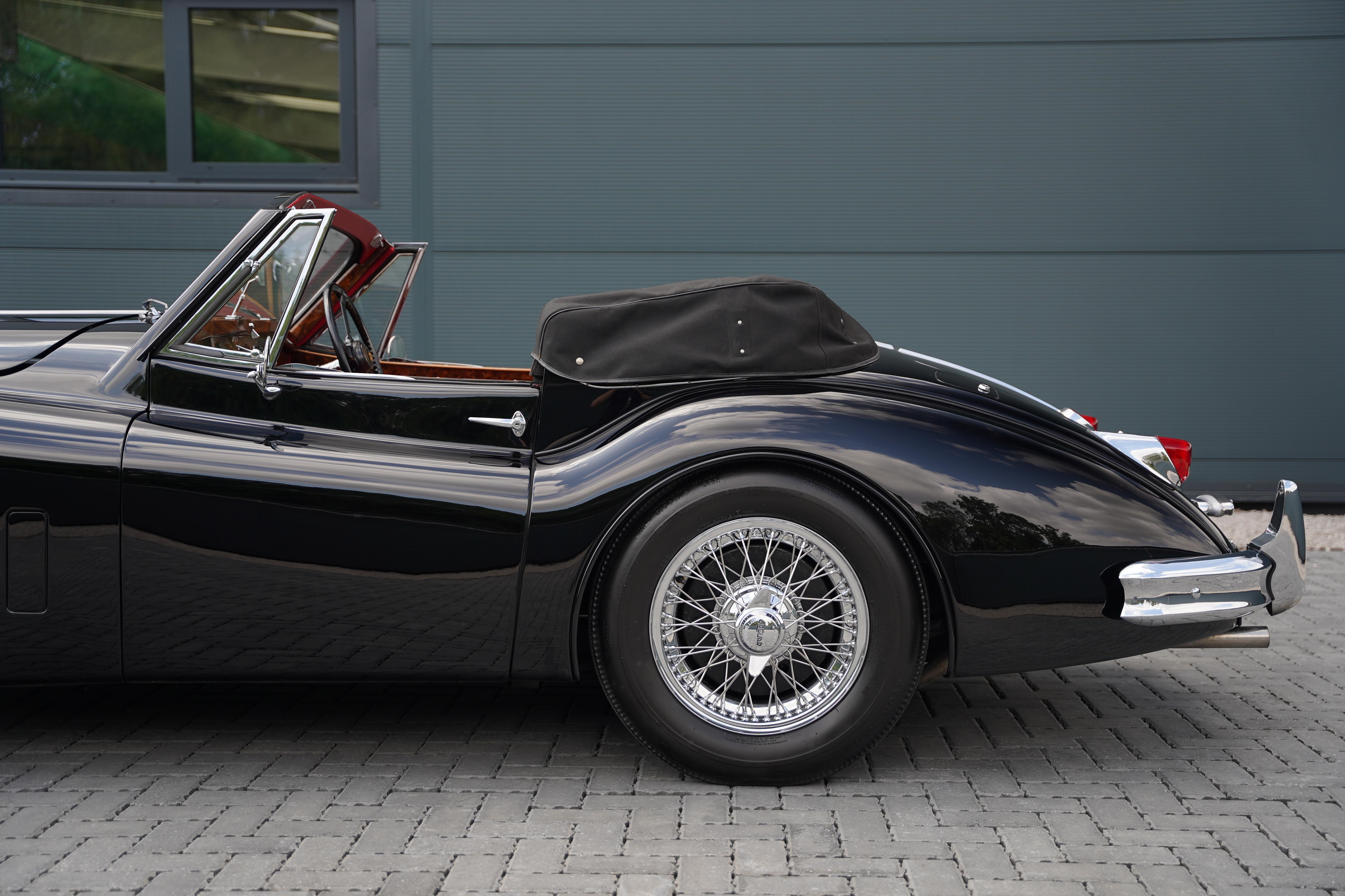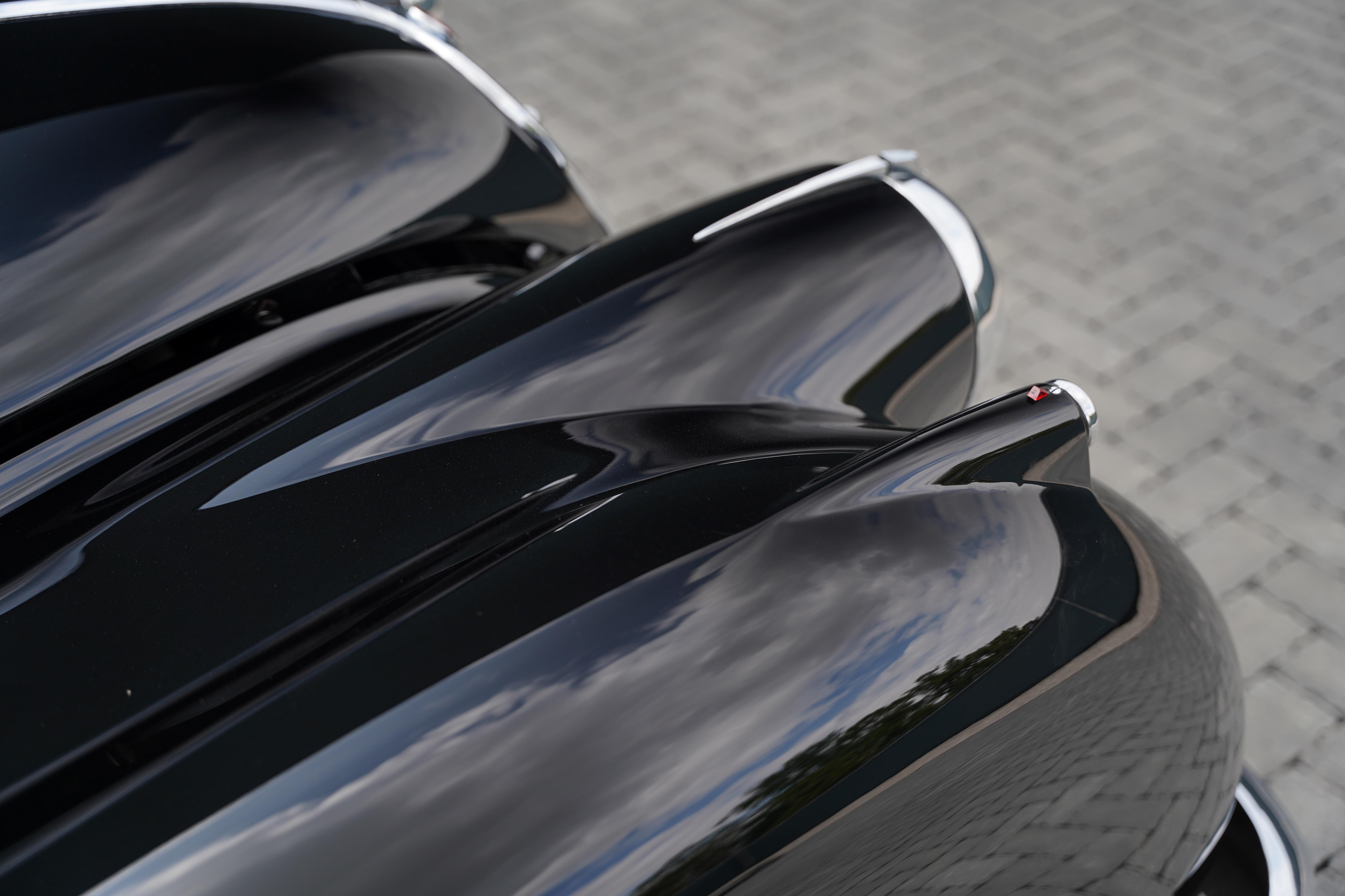 Even 33 years after its restoration, this XK140 remains in remarkable condition as a true testament to both the quality of the original vehicle and the calibre of its restoration. The solid black paint retains a rich, deep lustre; the bodywork is exceptionally straight with consistent panel gaps throughout. The hood fits tautly and remains in superb order, with a clear, fog-free rear window, a detail often lost over time. The chrome is equally impressive, showing only minimal signs of ageing, and is a clear indicator that the chrome was refinished to the highest standards.