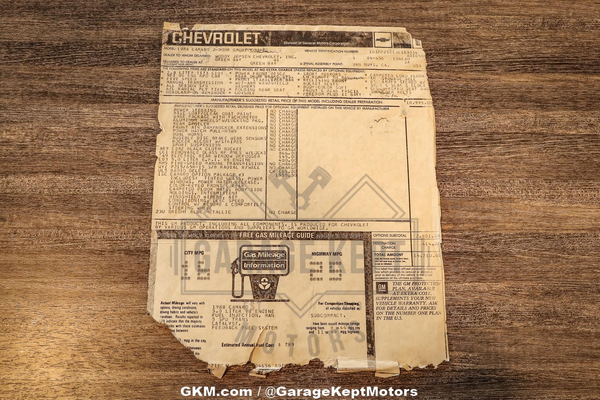 1988 Chevrolet Camaro in Bright Blue Metallic- 305ci V8 Engine- 5 Speed manual transmission- Power steering- Power front disc brakes- Power windows- Black and Grey cloth bucket seats- Electric rear defogger- Camaro option package 3- Window sticker and sales documents from new Turn heads and capture the spirit of classic American muscle with this stunning 1988 Chevrolet Camaro, finished in eye-catching Bright Blue Metallic. This third-generation Camaro exudes vintage appeal while packing the kind of performance that defined a generation. Under the hood lies a 305 cubic inch V8 engine, paired with a 5-speed manual transmission that puts full control in your hands. Whether you're cruising down the boulevard or carving through back roads, this Camaro delivers the raw, analog driving experience muscle car enthusiasts crave.This well-equipped example boasts power steering and power front disc brakes for confident handling and stopping power, while power windows and an electric rear defogger add convenience for everyday enjoyment. Slide into the supportive black and grey cloth bucket seats and you'll feel right at home the cockpit is all about the driver, combining comfort with a purposeful, no-nonsense layout that makes every drive an event.Equipped with the desirable Camaro Option Package 3, this car comes with key factory features that enhance both style and performance. Its condition and originality are further underscored by the inclusion of the original window sticker and sales documents from new ideal for collectors and purists looking for authenticity. Whether you're adding to a collection or seeking a weekend cruiser that brings back the glory days of late-'80s muscle, this Camaro delivers.Don't miss your chance to own a true American classic that's becoming harder to find in such well-preserved condition. With its distinctive color, strong V8, and manual gearbox, this Camaro is more than just a car it's a statement.