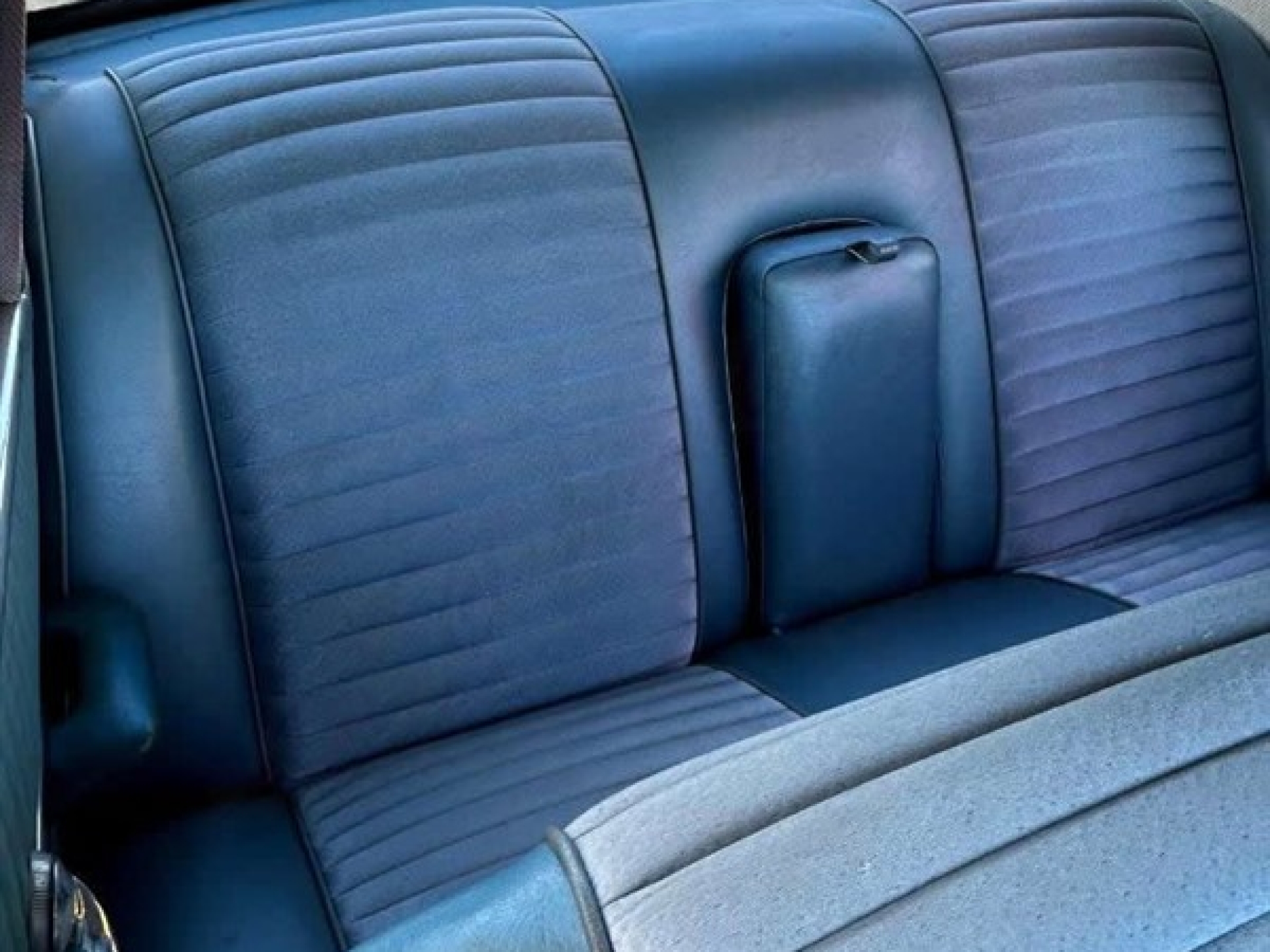 The interior upholstery is done in multiple shades of Blue and is in good shape. It has dual bucket seats with lap belts which sit to each side of the original console and an added aftermarket console which provides cupholders and storage. It has a nice bench seat in rear with a folding center arm rest. The dash is all done in Black and is topped off with a Black dash pad, original style trim including the wood grain trim and the stock knobs/switches/radio/gauges/etc.