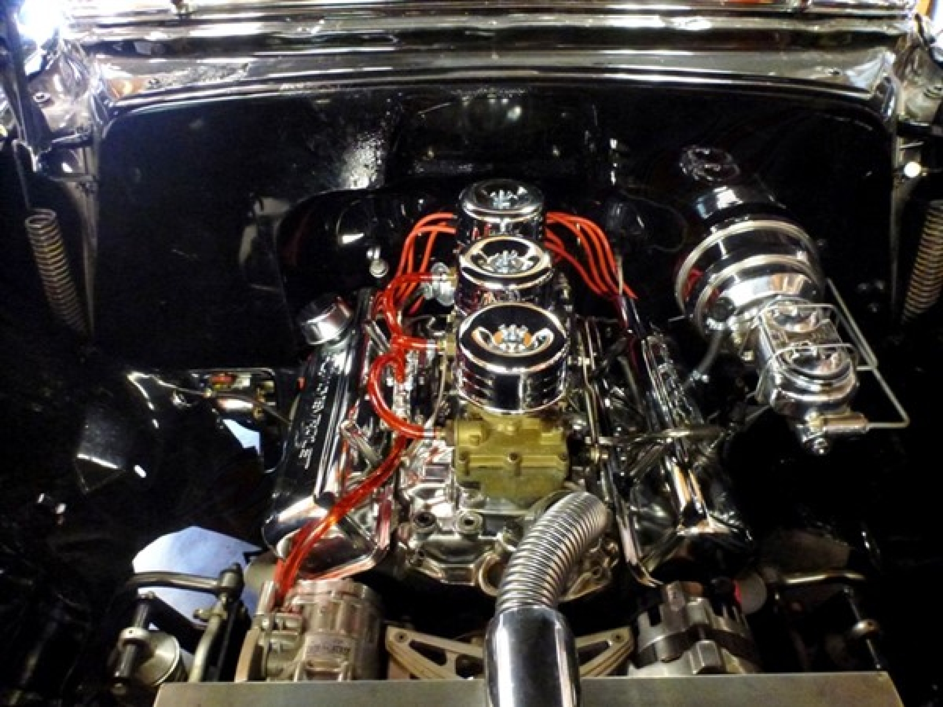 Under the hood is a crate 350 V8 that was brand new when installed. It was built up with a slight cam and performs very well. It has a look that is cross between new age custom and old school. Newer style billet and chrome is in place with features like cool flex hoses, Chevrolet valve covers, that all look great. The old school comes in with the 3, 2 barrel Rochester carburetors (which were just rebuilt) sitting on top with small chrome circle air cleaners. The fuel system has also just been totally gone through. Other nice components found under the hood include the chrome power brake booster, March serpentine belt system, and after market radiator with custom shroud. The car has an AWESOME sound especially with the added electronically operated cutouts giving you the option to route the exhaust through muffles or straight from the headers. Backing up the engine is a new 700R4 automatic transmission that shifts smoothly and sends power back to the rear wheels through the 4:11 rear end. The suspension system on the car was very nicely done with adjustable coil overs and a Fatman front suspension up front. The car is very comfortable to drive. To go with the power brake booster, Wilwood discs were added up front. This along with power steering and air conditioning makes this car very enjoyable.