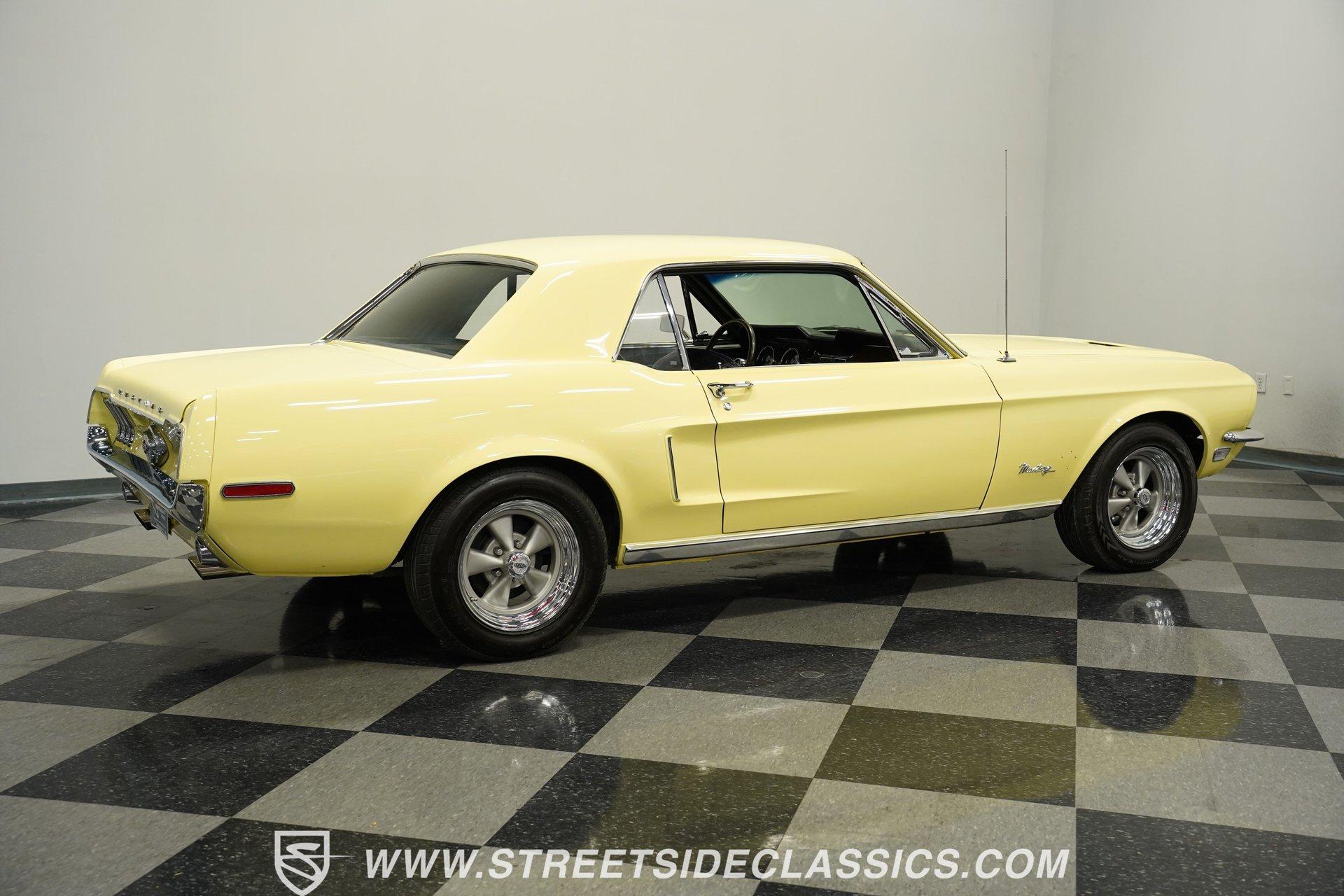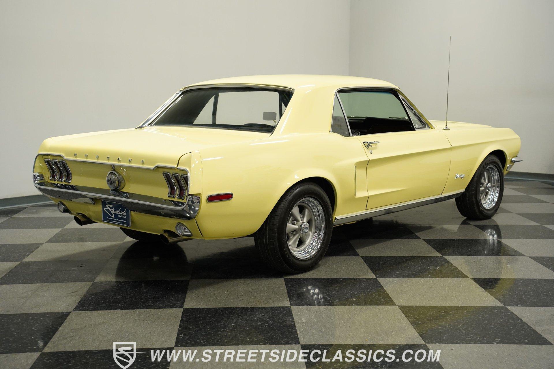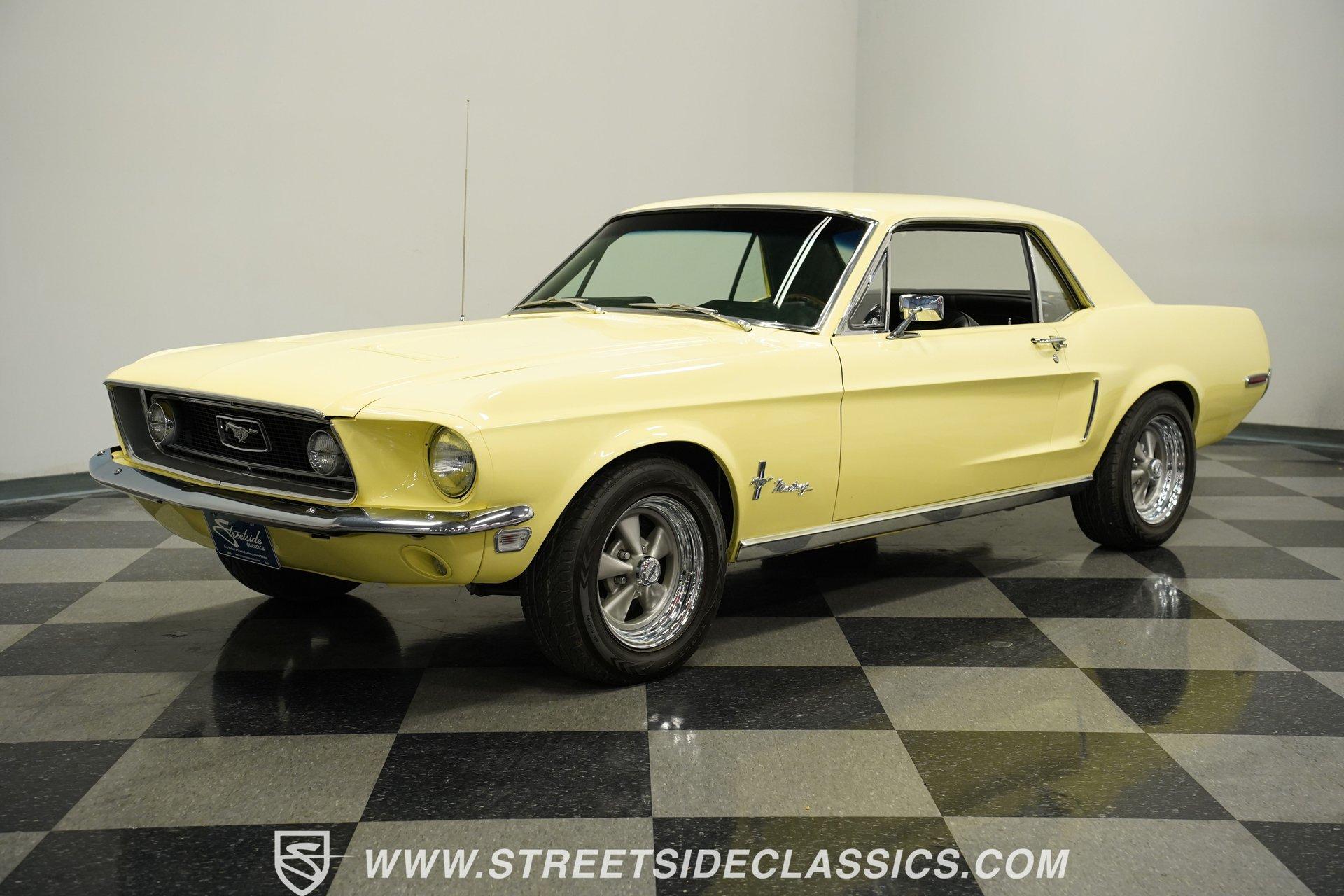 Freshly restored and gleaming in Meadowlark Yellow, this 1968 Ford Mustang coupe exudes classic American muscle appeal. The clean flanks look sharp with chrome rocker trim adding distinction to the profile. Good panel gaps and glass throughout speak to quality restoration work that elevates this pony car above typical driver-quality examples. Chrome brightwork remains in excellent condition, complementing the bright paint finish. The stance sits just right, with 15" Cragar wheels wrapped in 205/65R15 tires giving this Mustang a performance-oriented appearance on the street. Black vinyl dominates the interior, creating a perfect contrast against the bright exterior. Bucket seats grip your sides during spirited driving while staying true to the classic Mustang formula. The dash houses gauges that display with crystal clarity for quick info at a glance. The wood-rimmed steering wheel feels substantial in your hands while adding a touch of old-school cool. Newer carpet keeps things looking tight and clean throughout. The retro-style radio blends period looks with improved sound for cruising tunes. Functional A/C means you can drive hard without breaking a sweat. A 289 V8 engine anchors this Mustang in a clean engine bay, now mated to a 5-speed manual transmission that replaced the original C4 automatic. Painted valve covers add visual punch to the mechanical components. The full Mustang II front suspension conversion with tubular control arms and rack and pinion steering puts modern handling in this classic pony car. Shorty headers feed into a dual exhaust system for improved breathing and a muscular tone. Power steering and power disc brakes make driving a breeze while the R134a air conditioning system keeps the cabin cool during summer blasts down your favorite roads. HIGHLIGHTS: 289 V8 Engine 5-Speed Manual Transmission Power Steering Power Brakes Front Disc Brakes Mustang II Front Suspension Tubular Control Arms Rack And Pinion Steering Shorty Headers Dual Exhaust R134a Air Conditioning Meadowlark Yellow Paint 15" Cragar Wheels 205/65R15 Tires Chrome Brightwork Chrome Rocker Trim Good Glass Throughout Black Vinyl Interior Bucket Seats Wood Rim Steering Wheel Retro Style Radio Newer Carpet Clear Gauges From city streets to country roads, this 1968 Ford Mustang offers classic muscle car looks with upgraded driving dynamics. The 289 V8 provides ample power, while the five-speed manual transmission makes highway cruising a breeze. For an authentic slice of American muscle, get behind the wheel of this Meadowlark Yellow beauty. Call today!