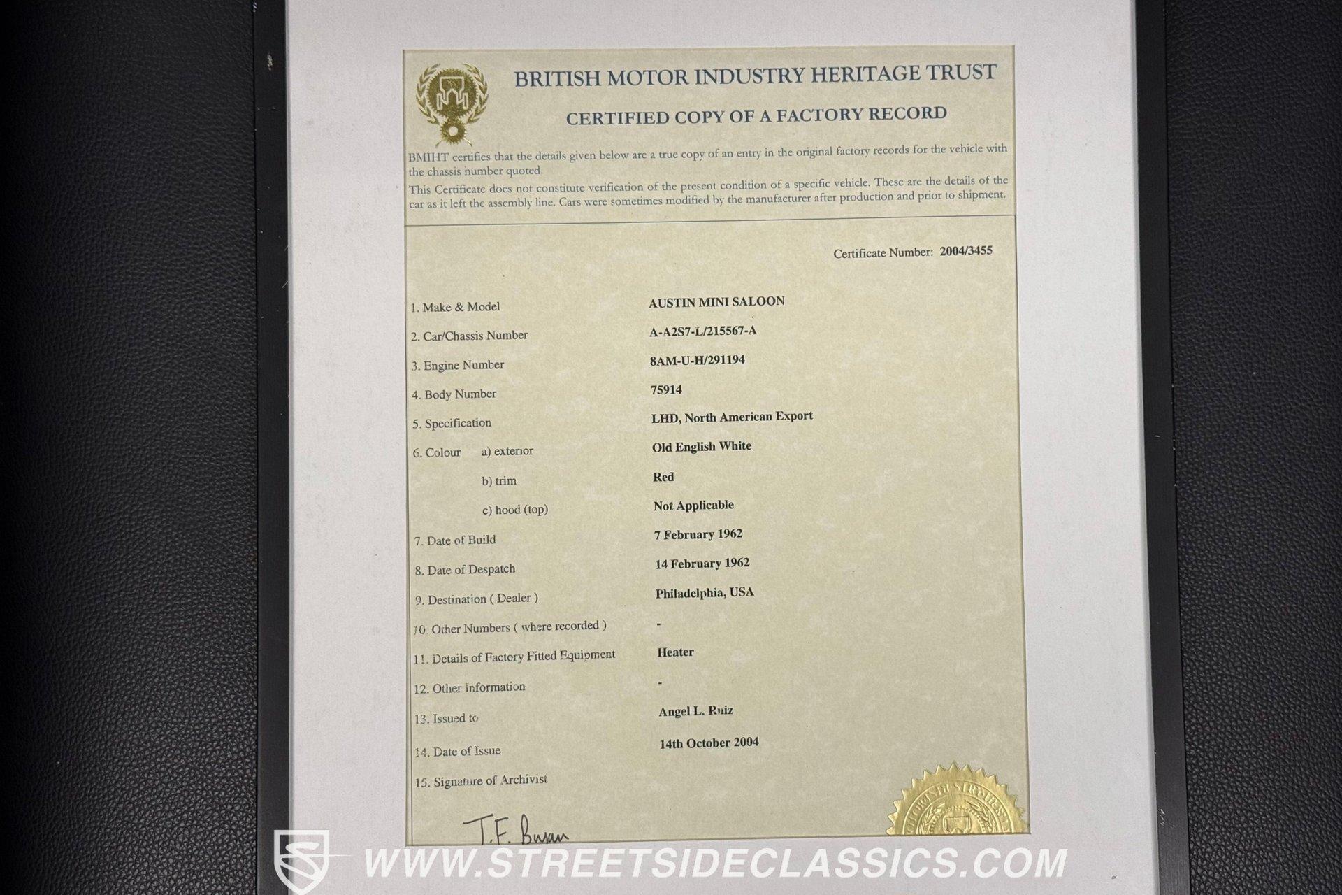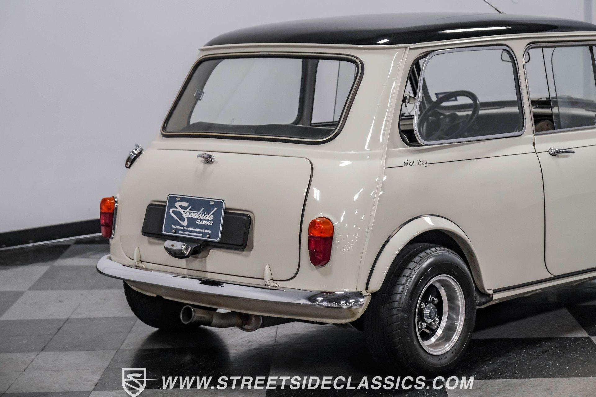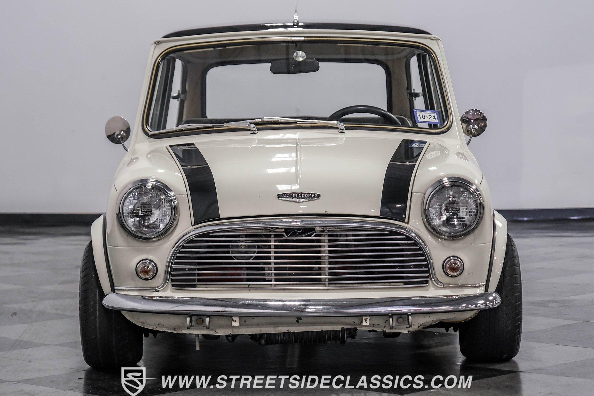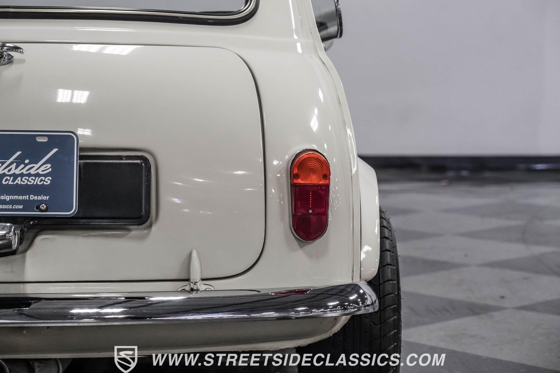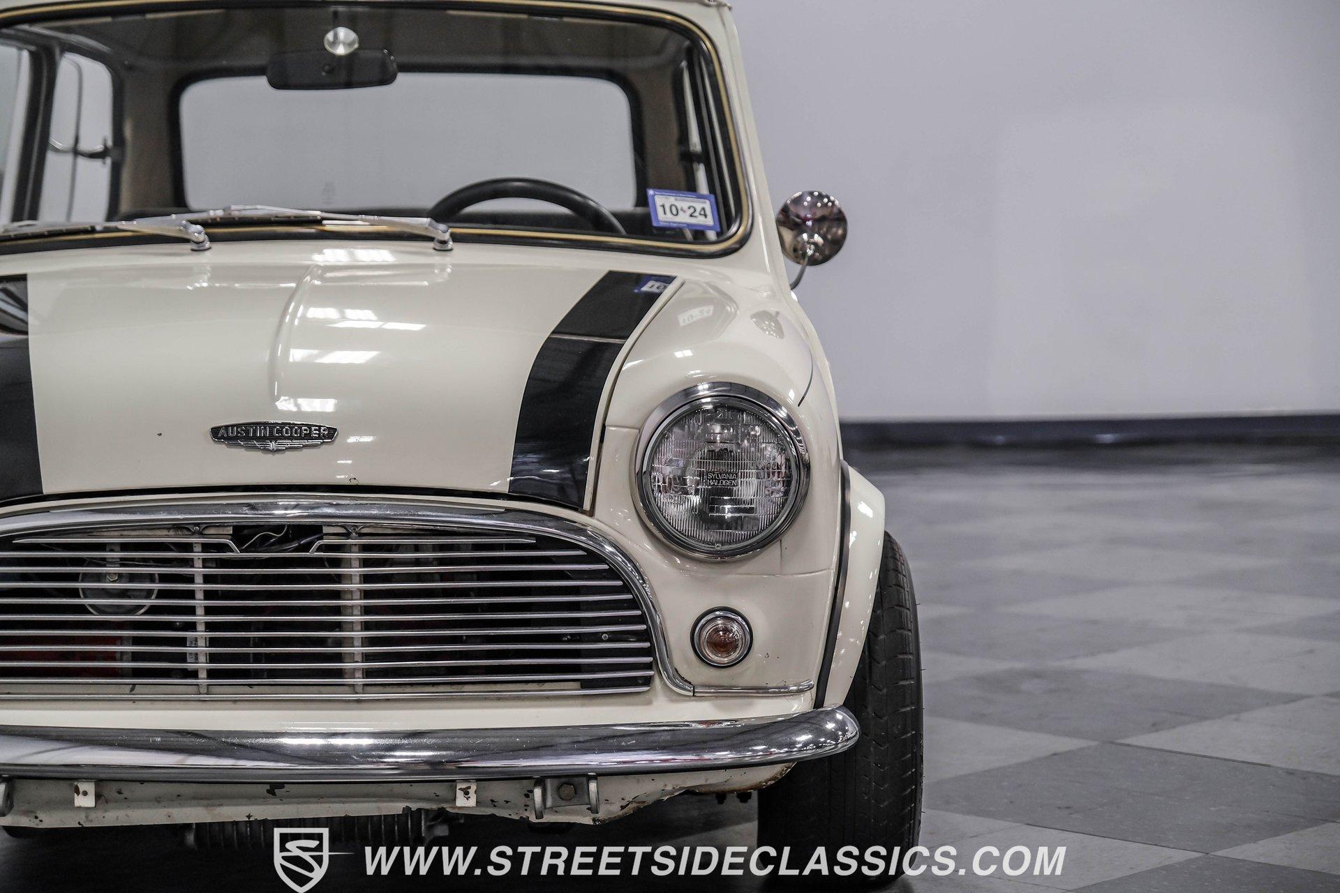 Compact yet mighty, this 1963 Austin Mini S Tribute is a British icon in Pepper White with bold black racing stripes and matching roof. The classic Mini silhouette remains unaltered while the 10" wheels fill out the fenders with purpose. Falken 165/70R10 tires grip the road with authority, while the front end sports the unmistakable Mini fascia. A passion project meticulously transformed by a dedicated enthusiast, this Mini showcases clean lines and the spirited aesthetic that made these cars legendary on both road and rally stages. Black vinyl bucket seats anchor the driver-focused cabin, complemented by red trim accents that add a splash of racing heritage. The Grant GT steering wheel feels substantial in your hands while providing excellent control of this lightweight machine. An XD Vision AM/FM/CD/USB head unit offers modern audio convenience without compromising the vintage dashboard layout. Front seatbelts add a measure of safety to this otherwise period-correct interior. Visibility remains excellent all around thanks to the Mini's expansive greenhouse. A punchy 1275 CC four-cylinder engine powers this diminutive machine, paired with a crisp-shifting 4-speed manual transmission. The powerplant was upgraded from the stock base engine, giving this Mini considerably more zip than factory specifications. SU dual carburetors feed the engine with precise fuel delivery. Front disc brakes provide strong stopping power, while the independent suspension at all four corners keeps this Mini planted through corners. The single exhaust with aftermarket muffler produces a suitably sporty note. HIGHLIGHTS: 1275 CC 4-Cylinder Engine 4-Speed Manual Transmission Dual SU Carburetors Front Disc Brakes Independent Front And Rear Suspension Single Exhaust With Aftermarket Muffler Pepper White Paint Black Painted Stripes And Roof 10" Wheels 165/70R10 Falken Tires Black Interior With Bucket Seats And Red Trim Grant GT Steering Wheel XD Vision AM/FM/CD/USB Head Unit Front Seatbelts British Motor Industry Heritage Trust Certificate Build Receipts This 1963 Austin Mini S Tribute has the looks, the upgrades, and the style to back it all up. With a 1275cc engine, 4-speed manual, and a lean setup that makes it an engaging driver, it's a blast with a serious punch in a small package. Call today!