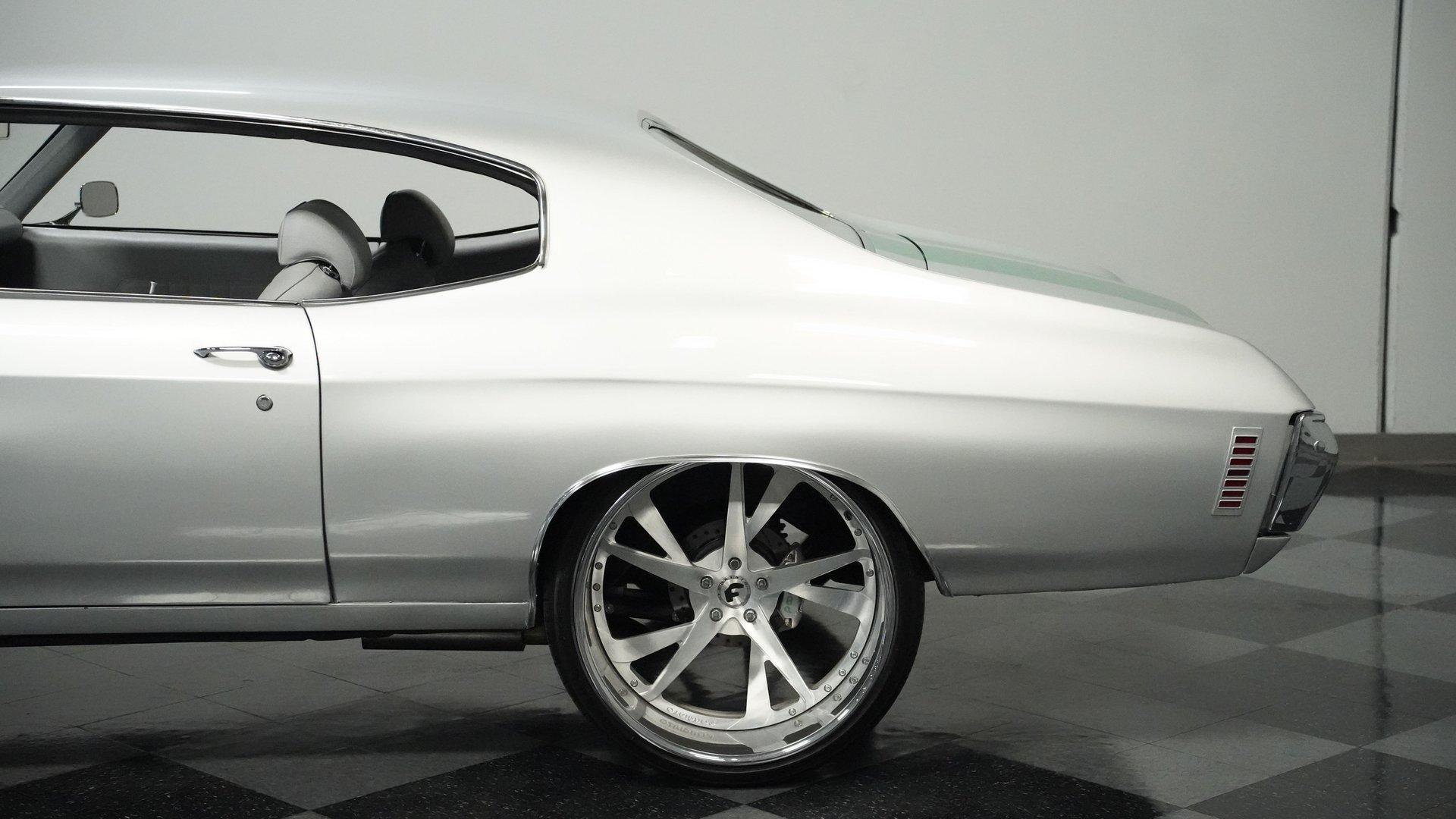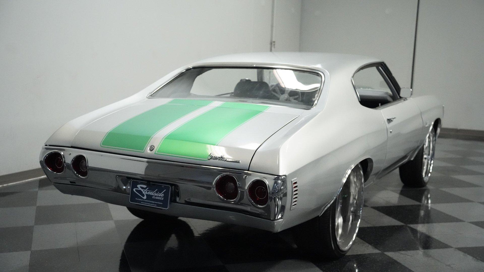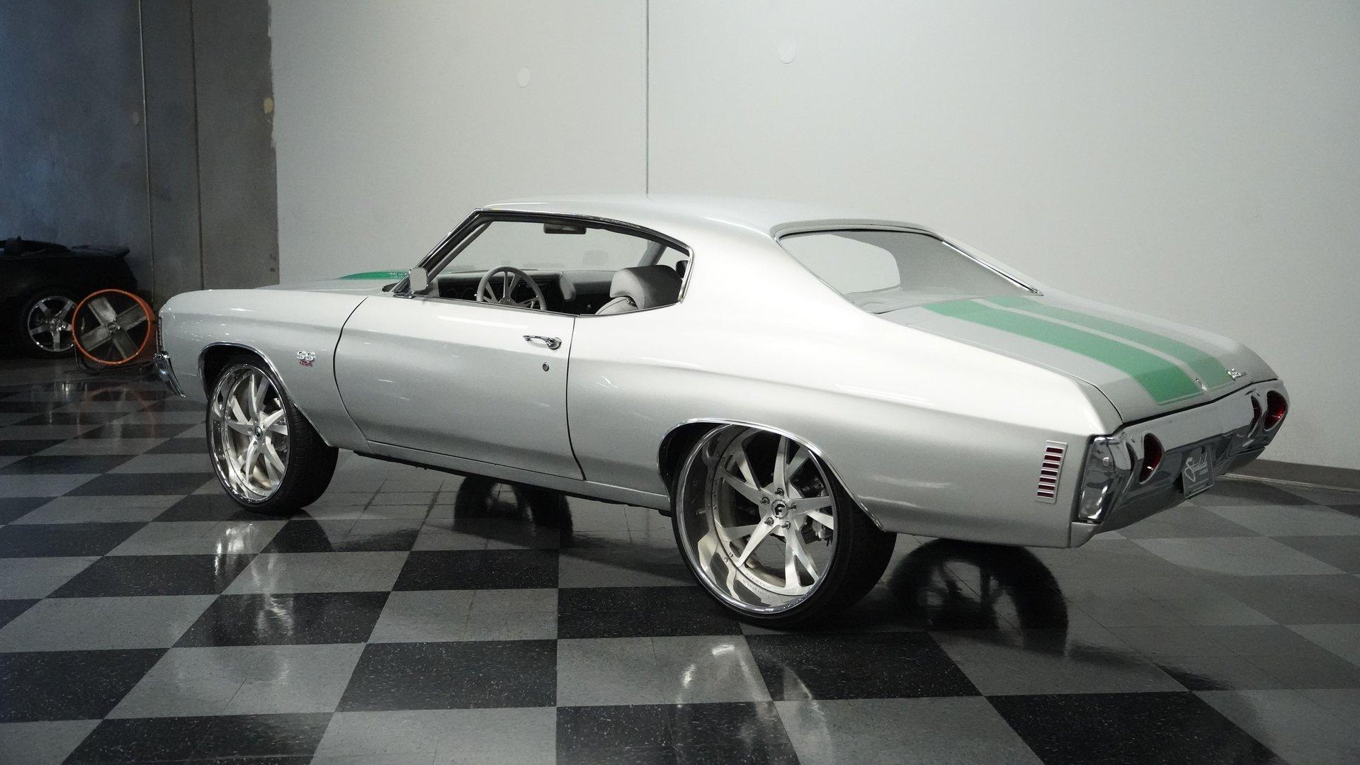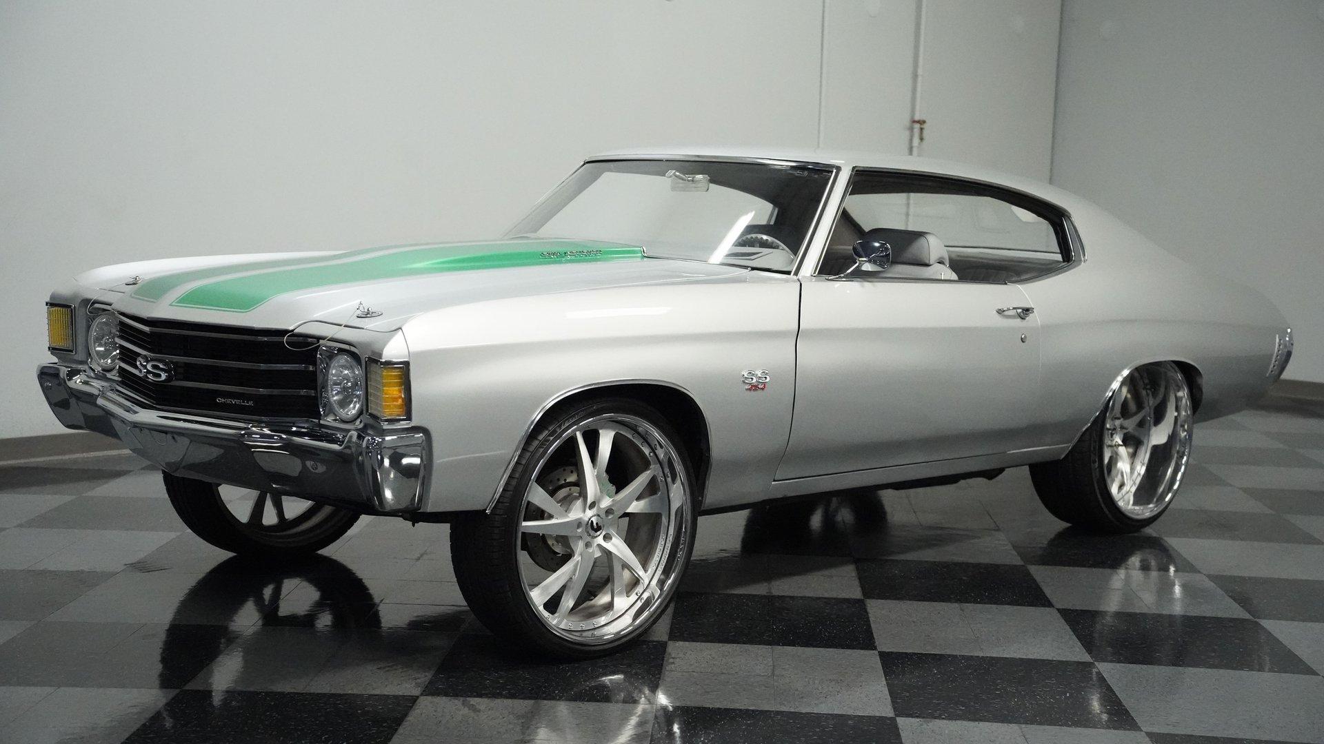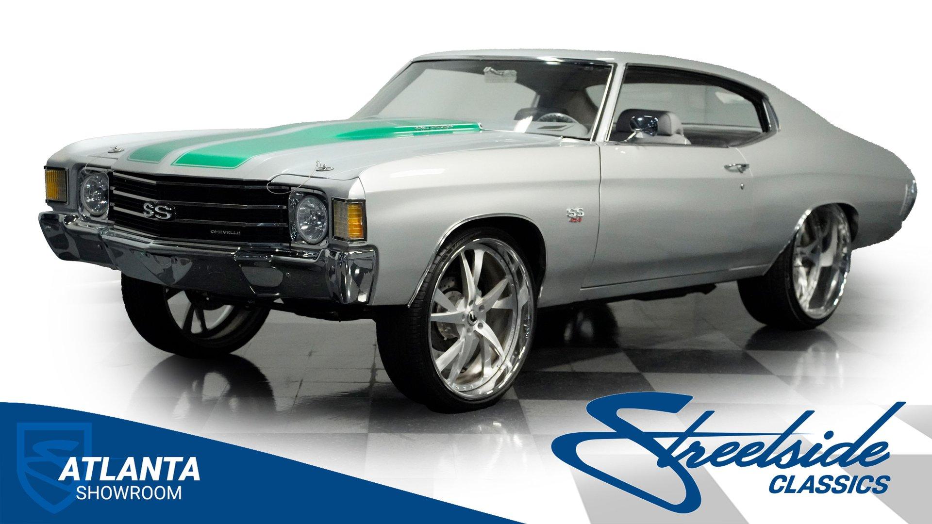 Muscular and aggressive with its powerful proportions, the 1972 Chevrolet Chevelle 454 Restomod wears an expertly applied Brushed Silver Metallic finish sliced by bold Spiral Green stripes. The imposing cowl hood secured with functional hood pins adds serious performance character. An SS grille anchors the front along with clear headlights featuring LED halos for modern night cruising. Massive 24" Forgiato wheels fill out the fenders perfectly, wrapped in 255/30ZR24 front and 295/30ZR24 rear tires that plant this muscle machine firmly to the asphalt. Space Gray surrounds you in an atmosphere of pure performance attitude. Dakota Digital gauges display vital info at a glance while the vinyl bucket seats hold you firmly during hard cornering. The custom console includes integrated cup holders for your road trip necessities. Green LED lighting adds nighttime character throughout the cabin. A Bluetooth tablet screen puts technology at your fingertips, while the Forgiato steering wheel matches the exterior wheels for a coordinated muscle car look from inside to out. Raw power comes from the 454 V8 engine sitting center stage in the upgraded engine bay. The big block features an Edelbrock intake manifold topped with Holley Sniper Electronic Fuel Injection for immediate throttle response. A 4-speed automatic transmission (4L60) handles the shifts while long tube headers connect to a dual exhaust system with Borla mufflers. QA1 tubular control arms with adjustable coilovers up front work with the 4-link rear suspension and QA1 adjustable coilovers out back. Wilwood disc brakes at all four corners provide substantial stopping power, and power steering gives you complete control. HIGHLIGHTS: 454 V8 Engine Holley Sniper Electronic Fuel Injection Edelbrock Intake Manifold March Pulley Kit 4-Speed Automatic Transmission (4L60) QA1 Tubular Control Arms With Adjustable Coilovers 4-Link Rear Suspension With QA1 Adjustable Coilovers Wilwood Power Disc Brakes 12-Bolt Rear Axle Long Tube Headers Dual Exhaust With Borla Mufflers Brushed Silver Metallic Paint With Spiral Green Stripes 24" Forgiato Wheels 255/30ZR24 Front, 295/30ZR24 Rear Tires Cowl Hood With Hood Pins SS Grille Clear Headlights With LED Halos Custom Space Gray Interior With Bucket Seats Dakota Digital Gauges Forgiato Steering Wheel Power Steering Green LED Interior Lighting Upgraded Dash Cover AM/FM Radio Bluetooth Bluetooth Tablet Screen Tilt Steering Column Anti-Theft System Only 451 Miles Since Built Classic style and modern performance makes this 1972 Chevelle 454 Restomod a complete package. From the attention-grabbing exterior to the comfortable interior and powerful drivetrain, this Chevrolet Chevelle 454 Restomod delivers an exceptional driving package with only 451 miles since its build. Call today!