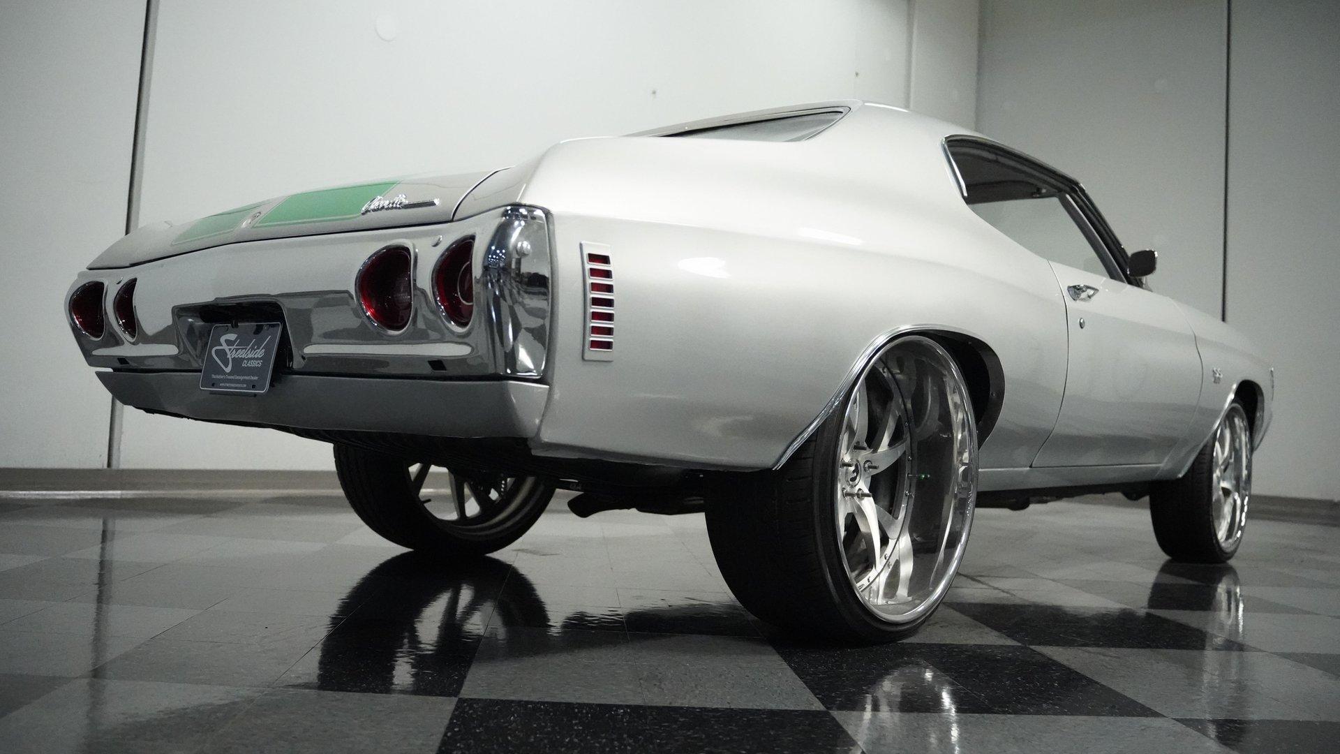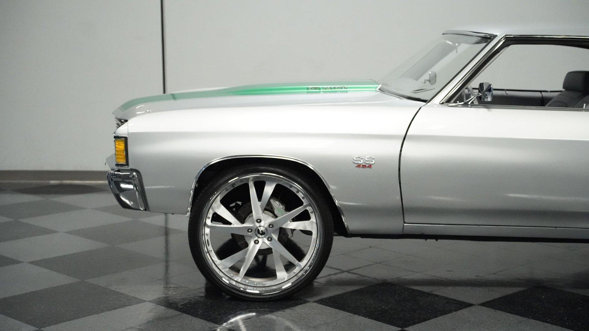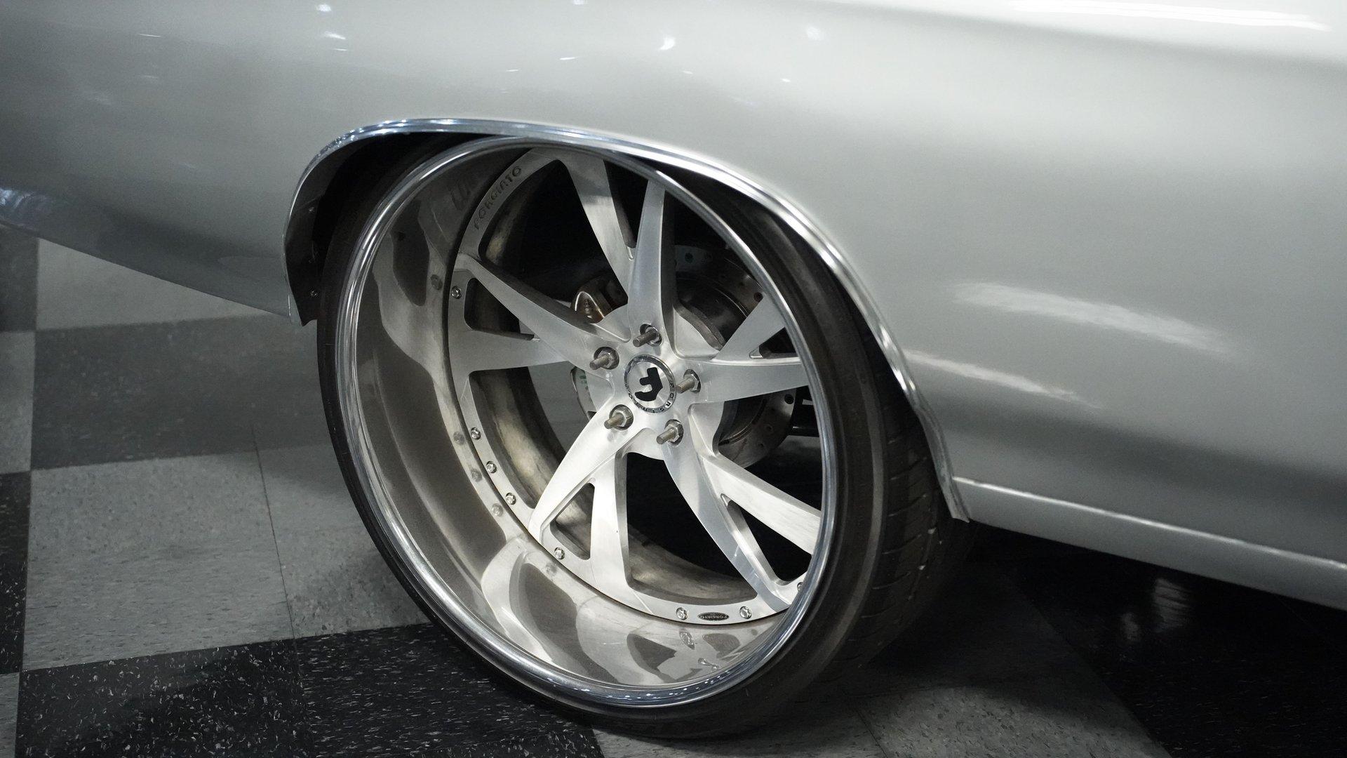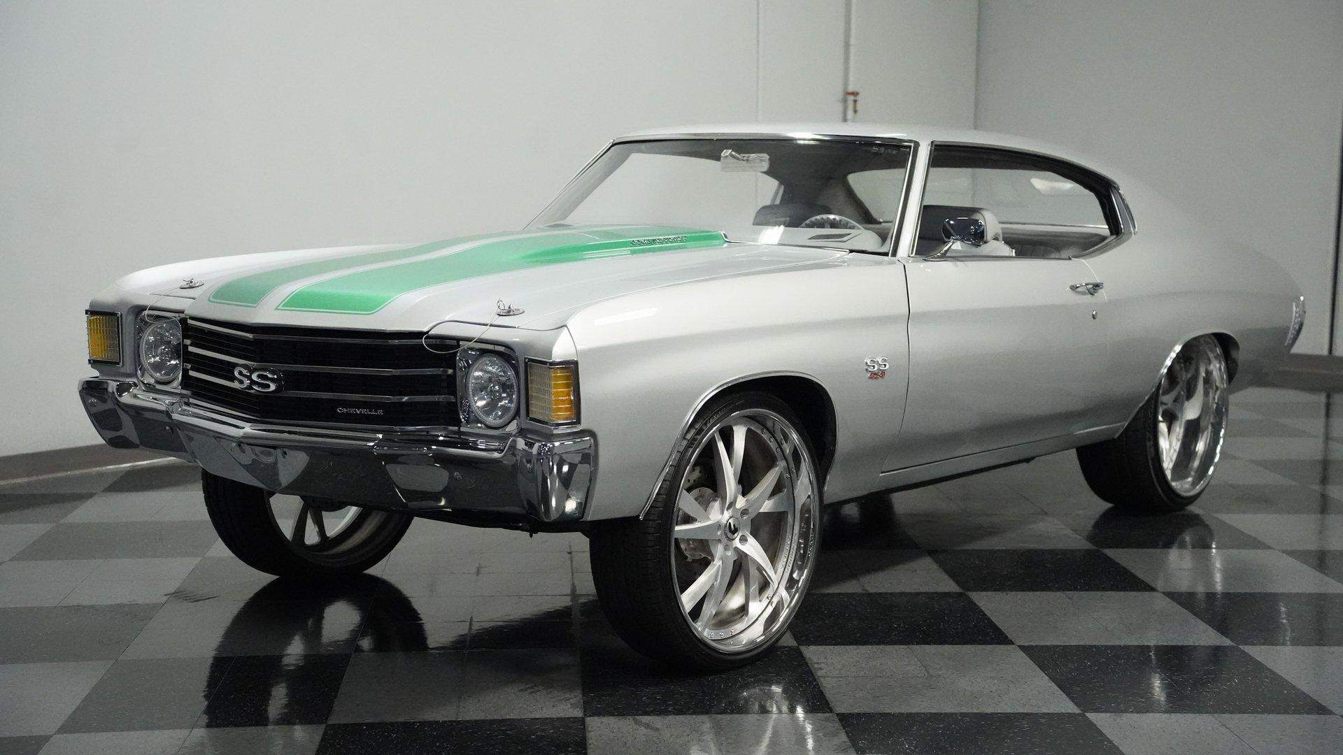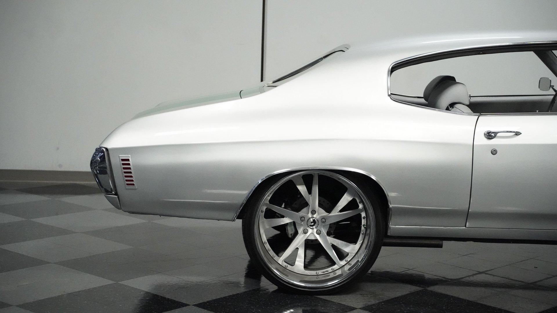 Muscular and aggressive with its powerful proportions, the 1972 Chevrolet Chevelle 454 Restomod wears an expertly applied Brushed Silver Metallic finish sliced by bold Spiral Green stripes. The imposing cowl hood secured with functional hood pins adds serious performance character. An SS grille anchors the front along with clear headlights featuring LED halos for modern night cruising. Massive 24" Forgiato wheels fill out the fenders perfectly, wrapped in 255/30ZR24 front and 295/30ZR24 rear tires that plant this muscle machine firmly to the asphalt. Space Gray surrounds you in an atmosphere of pure performance attitude. Dakota Digital gauges display vital info at a glance while the vinyl bucket seats hold you firmly during hard cornering. The custom console includes integrated cup holders for your road trip necessities. Green LED lighting adds nighttime character throughout the cabin. A Bluetooth tablet screen puts technology at your fingertips, while the Forgiato steering wheel matches the exterior wheels for a coordinated muscle car look from inside to out. Raw power comes from the 454 V8 engine sitting center stage in the upgraded engine bay. The big block features an Edelbrock intake manifold topped with Holley Sniper Electronic Fuel Injection for immediate throttle response. A 4-speed automatic transmission (4L60) handles the shifts while long tube headers connect to a dual exhaust system with Borla mufflers. QA1 tubular control arms with adjustable coilovers up front work with the 4-link rear suspension and QA1 adjustable coilovers out back. Wilwood disc brakes at all four corners provide substantial stopping power, and power steering gives you complete control. HIGHLIGHTS: 454 V8 Engine Holley Sniper Electronic Fuel Injection Edelbrock Intake Manifold March Pulley Kit 4-Speed Automatic Transmission (4L60) QA1 Tubular Control Arms With Adjustable Coilovers 4-Link Rear Suspension With QA1 Adjustable Coilovers Wilwood Power Disc Brakes 12-Bolt Rear Axle Long Tube Headers Dual Exhaust With Borla Mufflers Brushed Silver Metallic Paint With Spiral Green Stripes 24" Forgiato Wheels 255/30ZR24 Front, 295/30ZR24 Rear Tires Cowl Hood With Hood Pins SS Grille Clear Headlights With LED Halos Custom Space Gray Interior With Bucket Seats Dakota Digital Gauges Forgiato Steering Wheel Power Steering Green LED Interior Lighting Upgraded Dash Cover AM/FM Radio Bluetooth Bluetooth Tablet Screen Tilt Steering Column Anti-Theft System Only 451 Miles Since Built Classic style and modern performance makes this 1972 Chevelle 454 Restomod a complete package. From the attention-grabbing exterior to the comfortable interior and powerful drivetrain, this Chevrolet Chevelle 454 Restomod delivers an exceptional driving package with only 451 miles since its build. Call today!