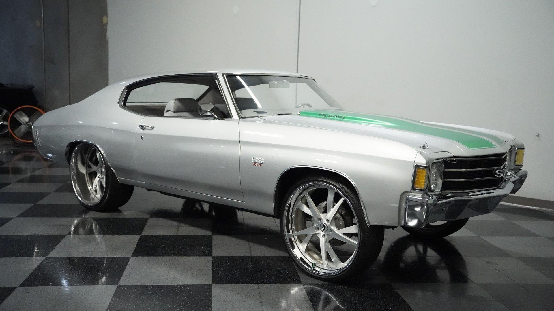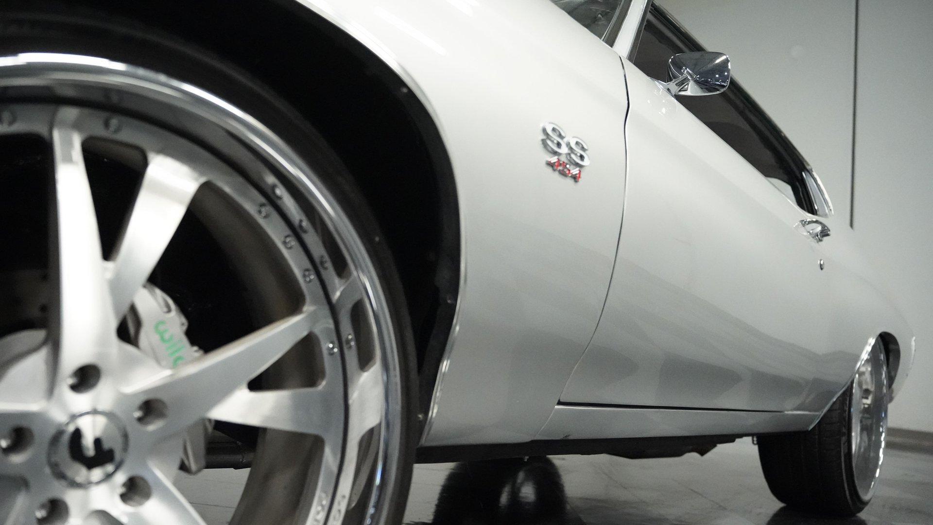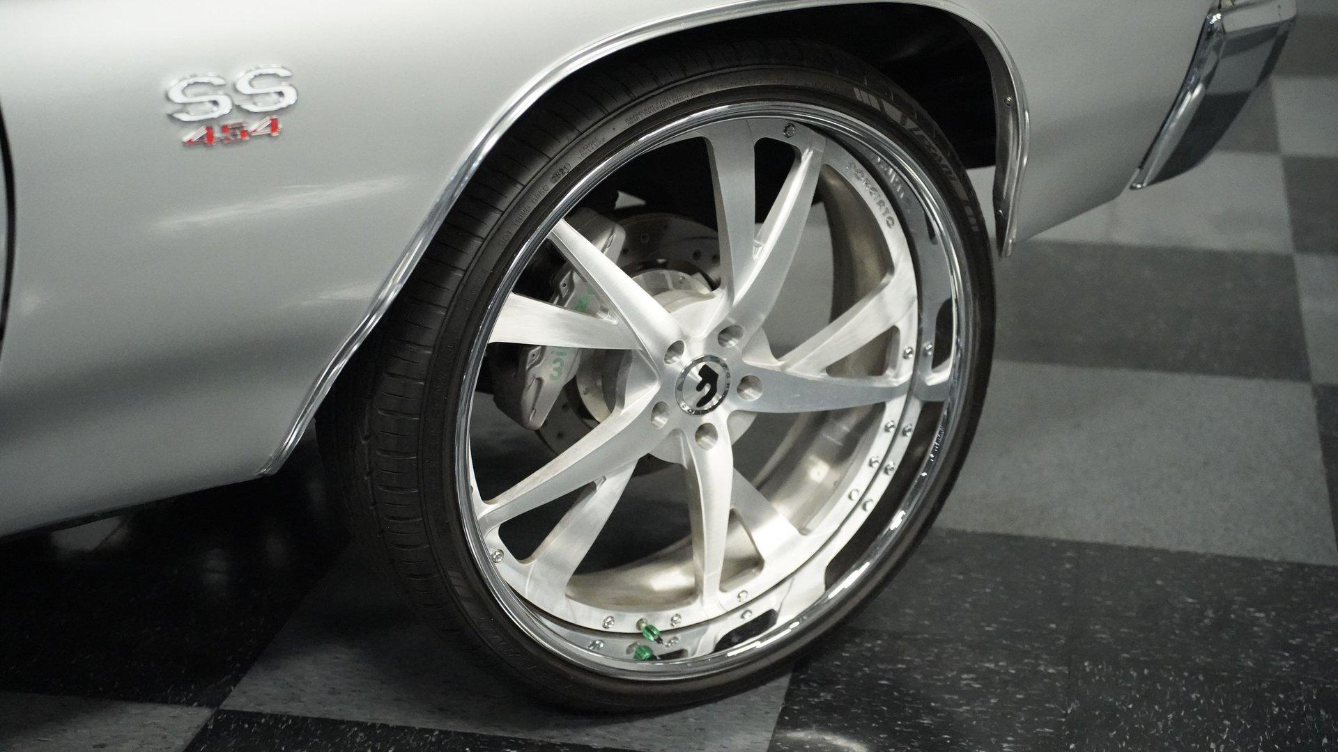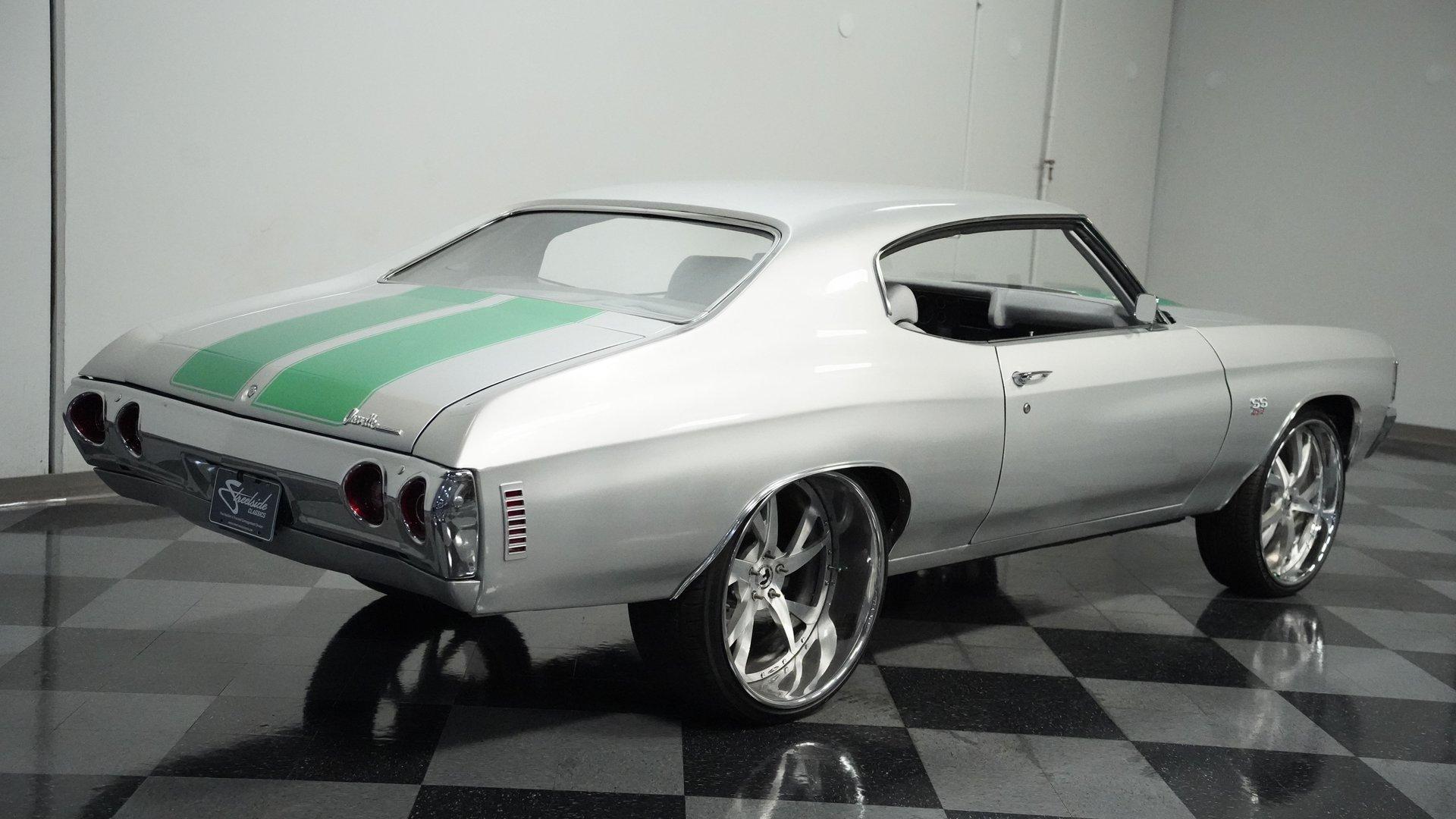 Muscular and aggressive with its powerful proportions, the 1972 Chevrolet Chevelle 454 Restomod wears an expertly applied Brushed Silver Metallic finish sliced by bold Spiral Green stripes. The imposing cowl hood secured with functional hood pins adds serious performance character. An SS grille anchors the front along with clear headlights featuring LED halos for modern night cruising. Massive 24" Forgiato wheels fill out the fenders perfectly, wrapped in 255/30ZR24 front and 295/30ZR24 rear tires that plant this muscle machine firmly to the asphalt. Space Gray surrounds you in an atmosphere of pure performance attitude. Dakota Digital gauges display vital info at a glance while the vinyl bucket seats hold you firmly during hard cornering. The custom console includes integrated cup holders for your road trip necessities. Green LED lighting adds nighttime character throughout the cabin. A Bluetooth tablet screen puts technology at your fingertips, while the Forgiato steering wheel matches the exterior wheels for a coordinated muscle car look from inside to out. Raw power comes from the 454 V8 engine sitting center stage in the upgraded engine bay. The big block features an Edelbrock intake manifold topped with Holley Sniper Electronic Fuel Injection for immediate throttle response. A 4-speed automatic transmission (4L60) handles the shifts while long tube headers connect to a dual exhaust system with Borla mufflers. QA1 tubular control arms with adjustable coilovers up front work with the 4-link rear suspension and QA1 adjustable coilovers out back. Wilwood disc brakes at all four corners provide substantial stopping power, and power steering gives you complete control. HIGHLIGHTS: 454 V8 Engine Holley Sniper Electronic Fuel Injection Edelbrock Intake Manifold March Pulley Kit 4-Speed Automatic Transmission (4L60) QA1 Tubular Control Arms With Adjustable Coilovers 4-Link Rear Suspension With QA1 Adjustable Coilovers Wilwood Power Disc Brakes 12-Bolt Rear Axle Long Tube Headers Dual Exhaust With Borla Mufflers Brushed Silver Metallic Paint With Spiral Green Stripes 24" Forgiato Wheels 255/30ZR24 Front, 295/30ZR24 Rear Tires Cowl Hood With Hood Pins SS Grille Clear Headlights With LED Halos Custom Space Gray Interior With Bucket Seats Dakota Digital Gauges Forgiato Steering Wheel Power Steering Green LED Interior Lighting Upgraded Dash Cover AM/FM Radio Bluetooth Bluetooth Tablet Screen Tilt Steering Column Anti-Theft System Only 451 Miles Since Built Classic style and modern performance makes this 1972 Chevelle 454 Restomod a complete package. From the attention-grabbing exterior to the comfortable interior and powerful drivetrain, this Chevrolet Chevelle 454 Restomod delivers an exceptional driving package with only 451 miles since its build. Call today!