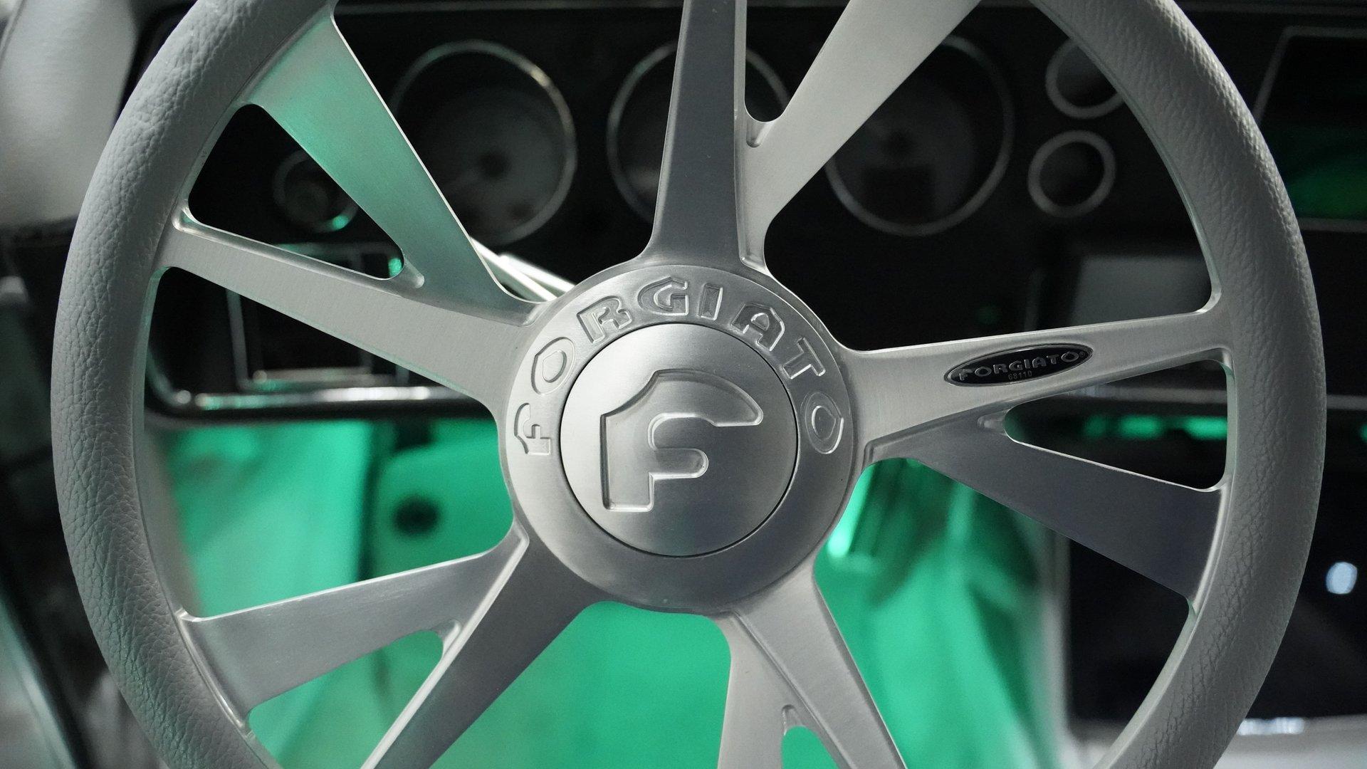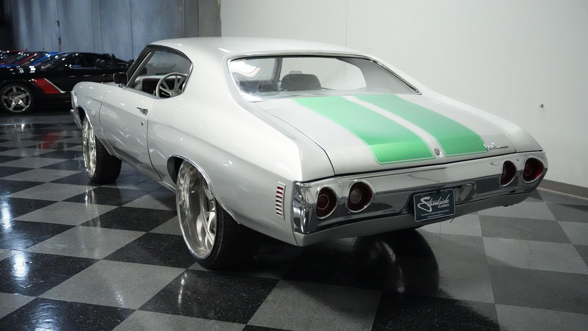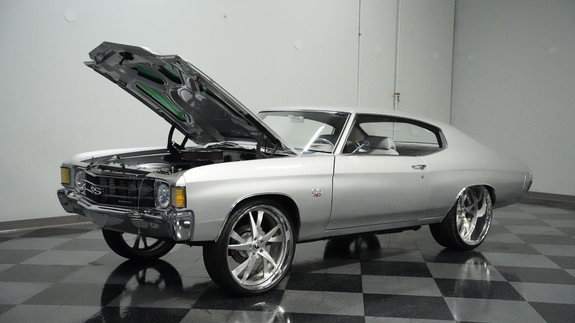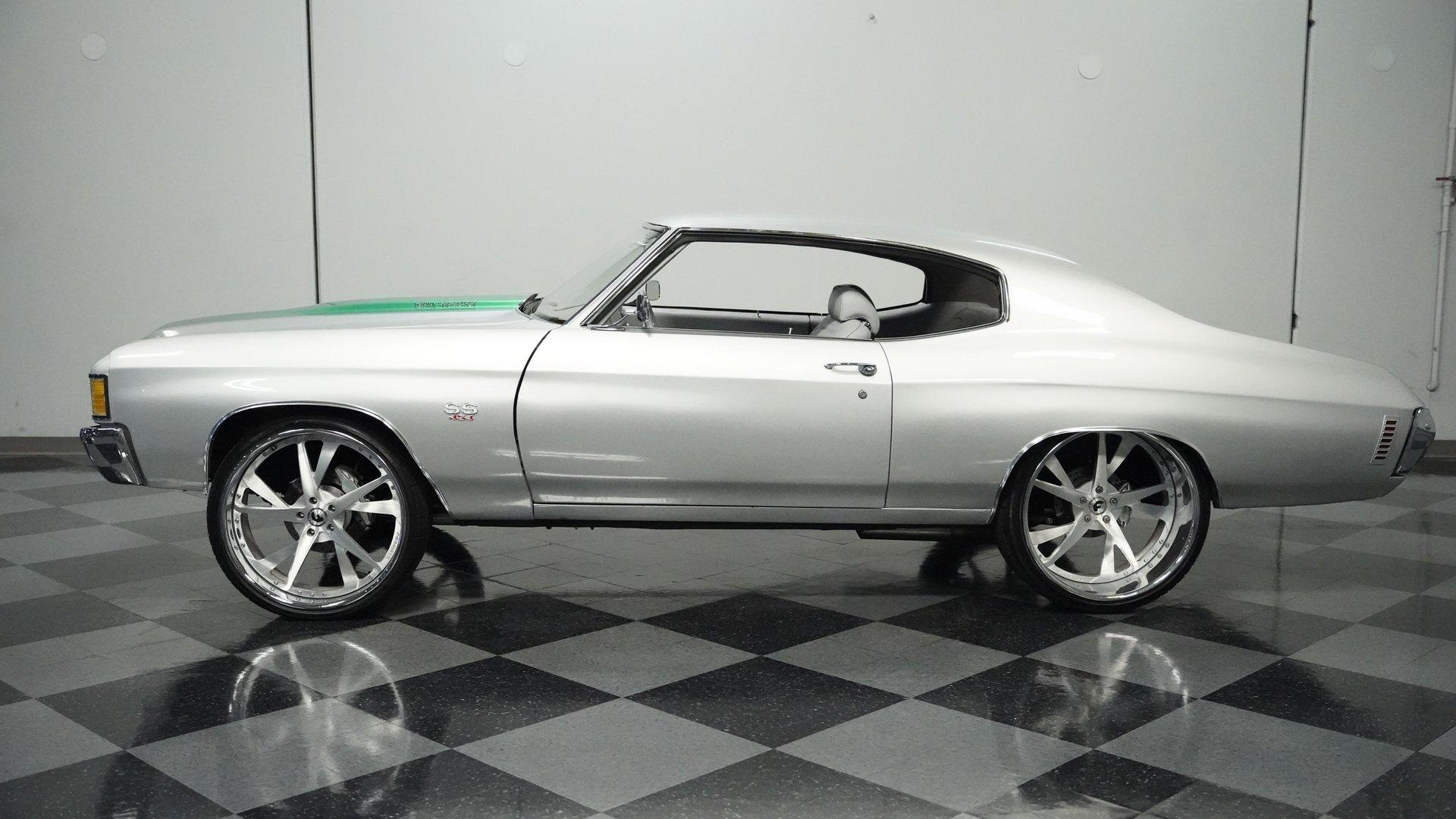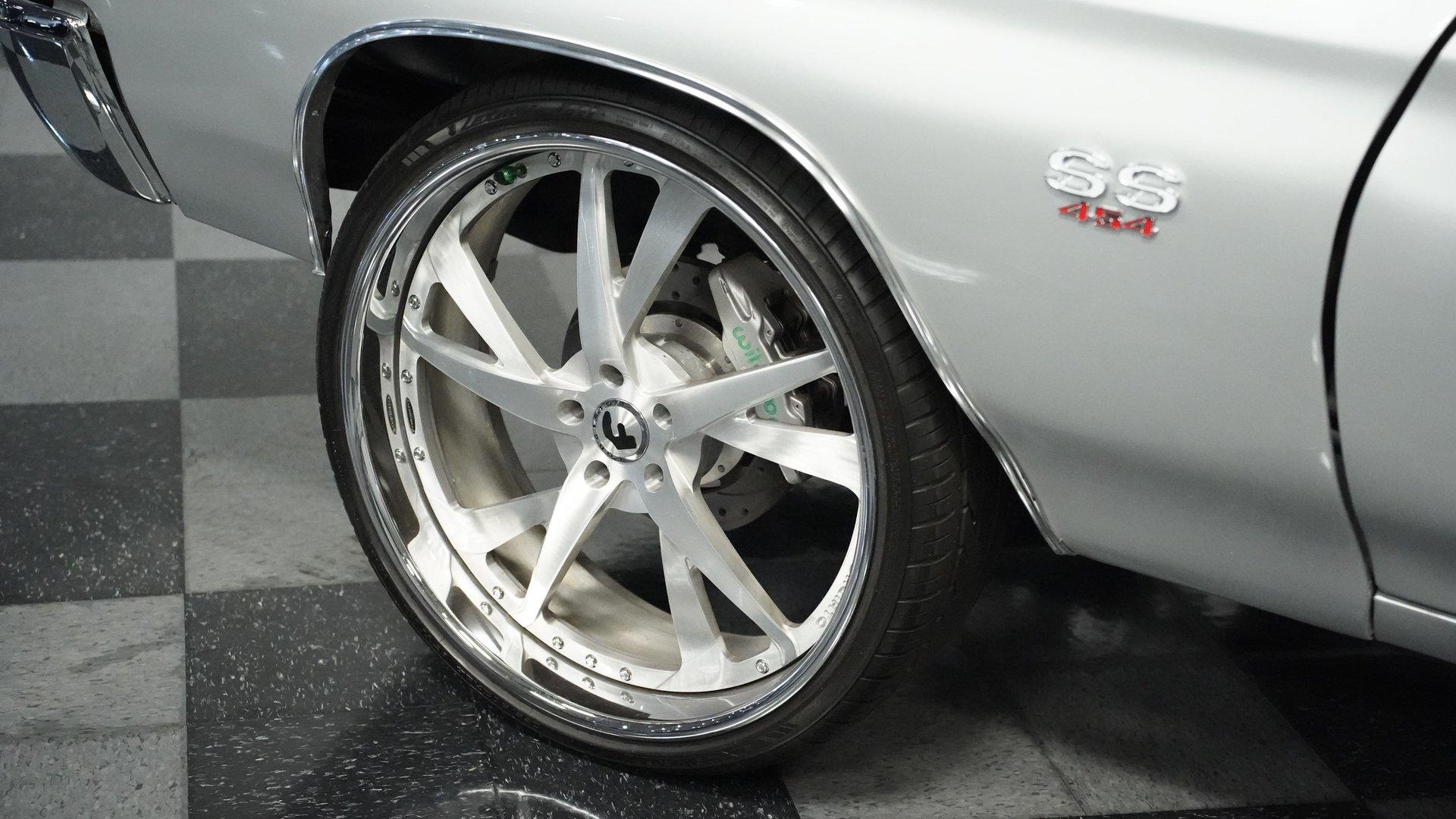 Muscular and aggressive with its powerful proportions, the 1972 Chevrolet Chevelle 454 Restomod wears an expertly applied Brushed Silver Metallic finish sliced by bold Spiral Green stripes. The imposing cowl hood secured with functional hood pins adds serious performance character. An SS grille anchors the front along with clear headlights featuring LED halos for modern night cruising. Massive 24" Forgiato wheels fill out the fenders perfectly, wrapped in 255/30ZR24 front and 295/30ZR24 rear tires that plant this muscle machine firmly to the asphalt. Space Gray surrounds you in an atmosphere of pure performance attitude. Dakota Digital gauges display vital info at a glance while the vinyl bucket seats hold you firmly during hard cornering. The custom console includes integrated cup holders for your road trip necessities. Green LED lighting adds nighttime character throughout the cabin. A Bluetooth tablet screen puts technology at your fingertips, while the Forgiato steering wheel matches the exterior wheels for a coordinated muscle car look from inside to out. Raw power comes from the 454 V8 engine sitting center stage in the upgraded engine bay. The big block features an Edelbrock intake manifold topped with Holley Sniper Electronic Fuel Injection for immediate throttle response. A 4-speed automatic transmission (4L60) handles the shifts while long tube headers connect to a dual exhaust system with Borla mufflers. QA1 tubular control arms with adjustable coilovers up front work with the 4-link rear suspension and QA1 adjustable coilovers out back. Wilwood disc brakes at all four corners provide substantial stopping power, and power steering gives you complete control. HIGHLIGHTS: 454 V8 Engine Holley Sniper Electronic Fuel Injection Edelbrock Intake Manifold March Pulley Kit 4-Speed Automatic Transmission (4L60) QA1 Tubular Control Arms With Adjustable Coilovers 4-Link Rear Suspension With QA1 Adjustable Coilovers Wilwood Power Disc Brakes 12-Bolt Rear Axle Long Tube Headers Dual Exhaust With Borla Mufflers Brushed Silver Metallic Paint With Spiral Green Stripes 24" Forgiato Wheels 255/30ZR24 Front, 295/30ZR24 Rear Tires Cowl Hood With Hood Pins SS Grille Clear Headlights With LED Halos Custom Space Gray Interior With Bucket Seats Dakota Digital Gauges Forgiato Steering Wheel Power Steering Green LED Interior Lighting Upgraded Dash Cover AM/FM Radio Bluetooth Bluetooth Tablet Screen Tilt Steering Column Anti-Theft System Only 451 Miles Since Built Classic style and modern performance makes this 1972 Chevelle 454 Restomod a complete package. From the attention-grabbing exterior to the comfortable interior and powerful drivetrain, this Chevrolet Chevelle 454 Restomod delivers an exceptional driving package with only 451 miles since its build. Call today!