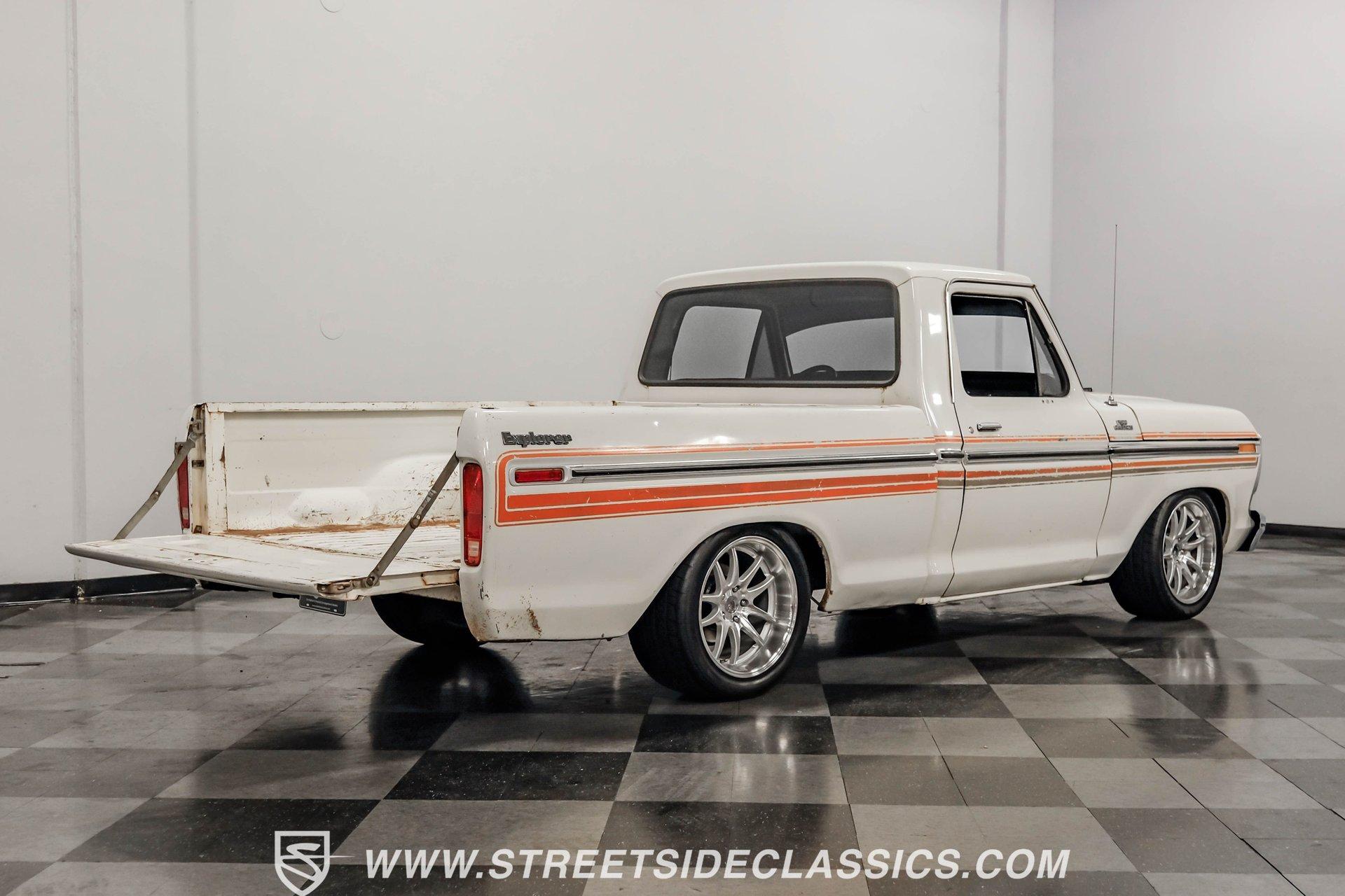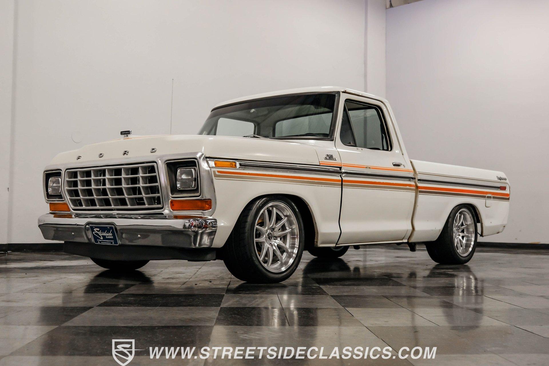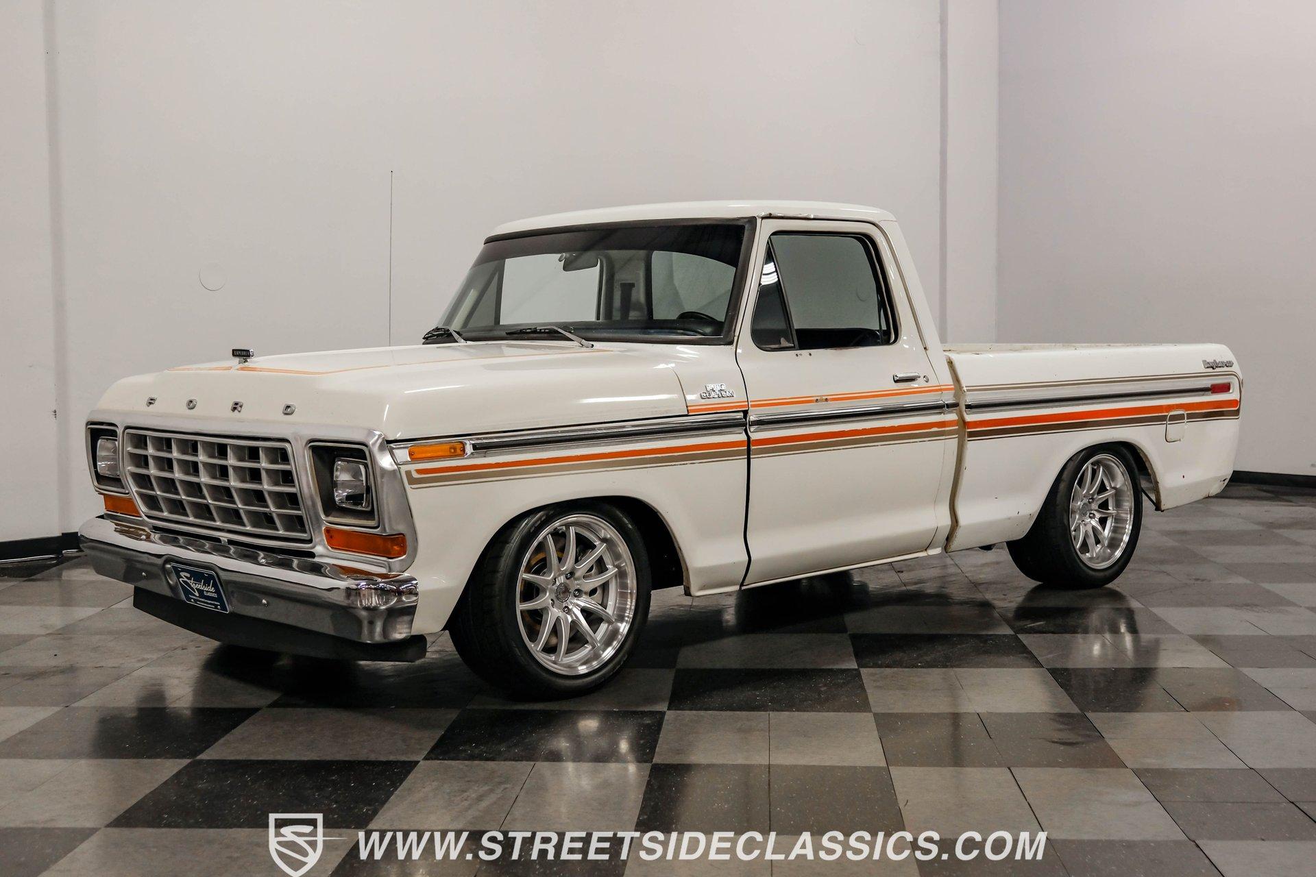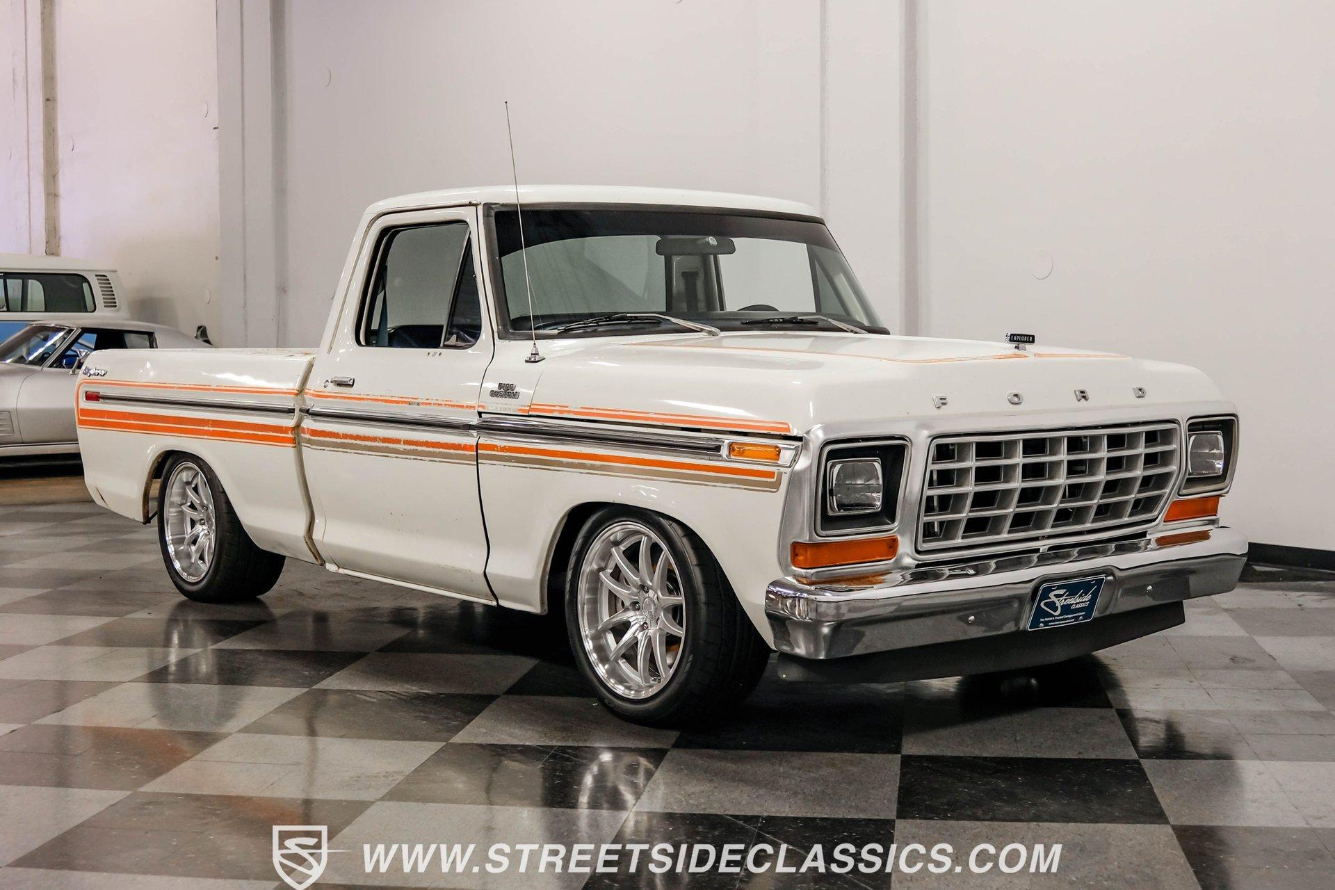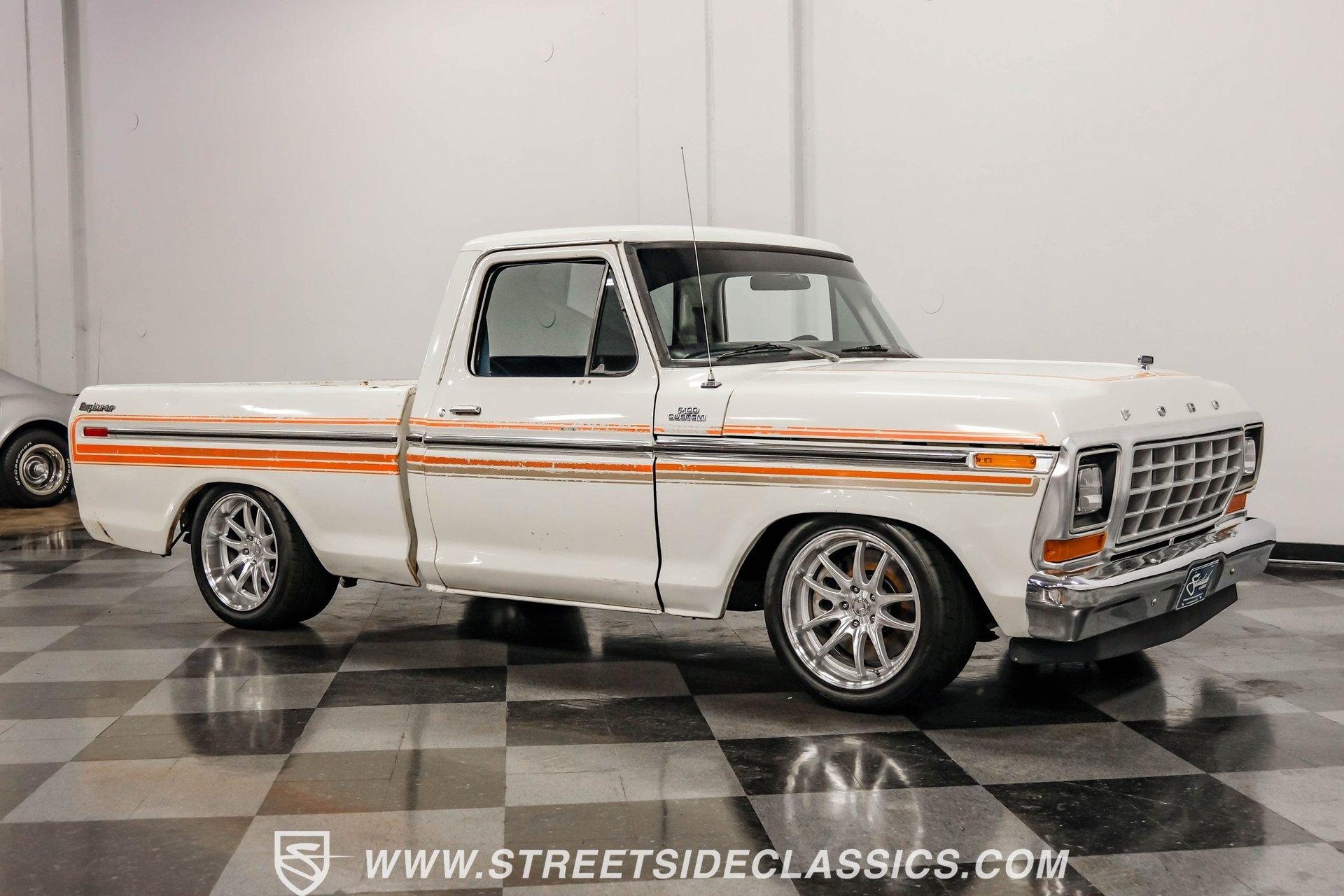 Street-tough and road-ready, this 1979 Ford F-100 Ranger Explorer Restomod is still covered in its original white exterior slashed with orange decal stripes that amp up its attitude. Dropped on a Final-Gen Crown Vic-style front end, this pickup sits low and mean on the pavement. Muscular 18" Aodhan wheels fill the wheel wells, wrapped in fat 275/40ZR18 Nitto rubber up front and even meatier 295/40ZR18 Nittos out back. The short bed layout keeps proportions tight while the patina finish tells stories of miles traveled. Slide across the blue vinyl and plaid bench seat and grip the aftermarket sport wheel mounted on a tilt column. The blue-on-black color scheme throughout the cabin creates a performance vibe with painted blue dash, door panels, and headliner contrasting against fresh black carpets. Custom black-faced gauges light up with blue illumination, giving off a street-machine glow after dark. The aftermarket A/C blows cold while the Hurst shifter stands ready for action between the gears. The fuel-injected 5.0L V8 is mated to a 5-speed manual transmission. The Trick Flow intake manifold gulps air while long tube headers dump exhaust through an H-pipe and MagnaFlow mufflers for a proper muscle truck soundtrack. An aluminum radiator with electric fans keeps things cool under pressure. The suspension setup includes a Crown Vic front end with coilovers and sway bar and rear solid axle with leaf springs and air shocks which plants this truck firmly on the asphalt during aggressive driving. 5.0L V8 Engine With Electronic Fuel Injection 5-Speed Manual Transmission With Hurst Shifter Trick Flow Intake Manifold Long Tube Headers MSD Box Aluminum Radiator With Electric Fans Dual Exhaust With H-Pipe And MagnaFlow Mufflers CPP Hydroboost Power Disc Brakes Crown Vic Front End w/ Coilovers With Sway Bar Solid Axle Rear w/ Leaf Springs and Air Shocks Strange Engineering Rear Shocks American Auto Wire Harness Original White Paint Exterior With Orange Decal Stripes Natural Patina Finish 18" Aodhan Wheels 275/40ZR18 Front, 295/40ZR18 Rear Nitto Tires Short Bed Configuration Blue And Plaid Bench Seat With Armrest Console Aftermarket Sport Steering Wheel On Tilt Column Aftermarket Black Face Gauges With Blue Illumination Blue Painted Dash, Door Panels, And Headliner Fresh Black Carpets Aftermarket Air Conditioning Muscle truck style with hot rod attitude, this 1979 Ford F-100 Ranger Explorer Restomod brings power and performance in equal measure. Call today!